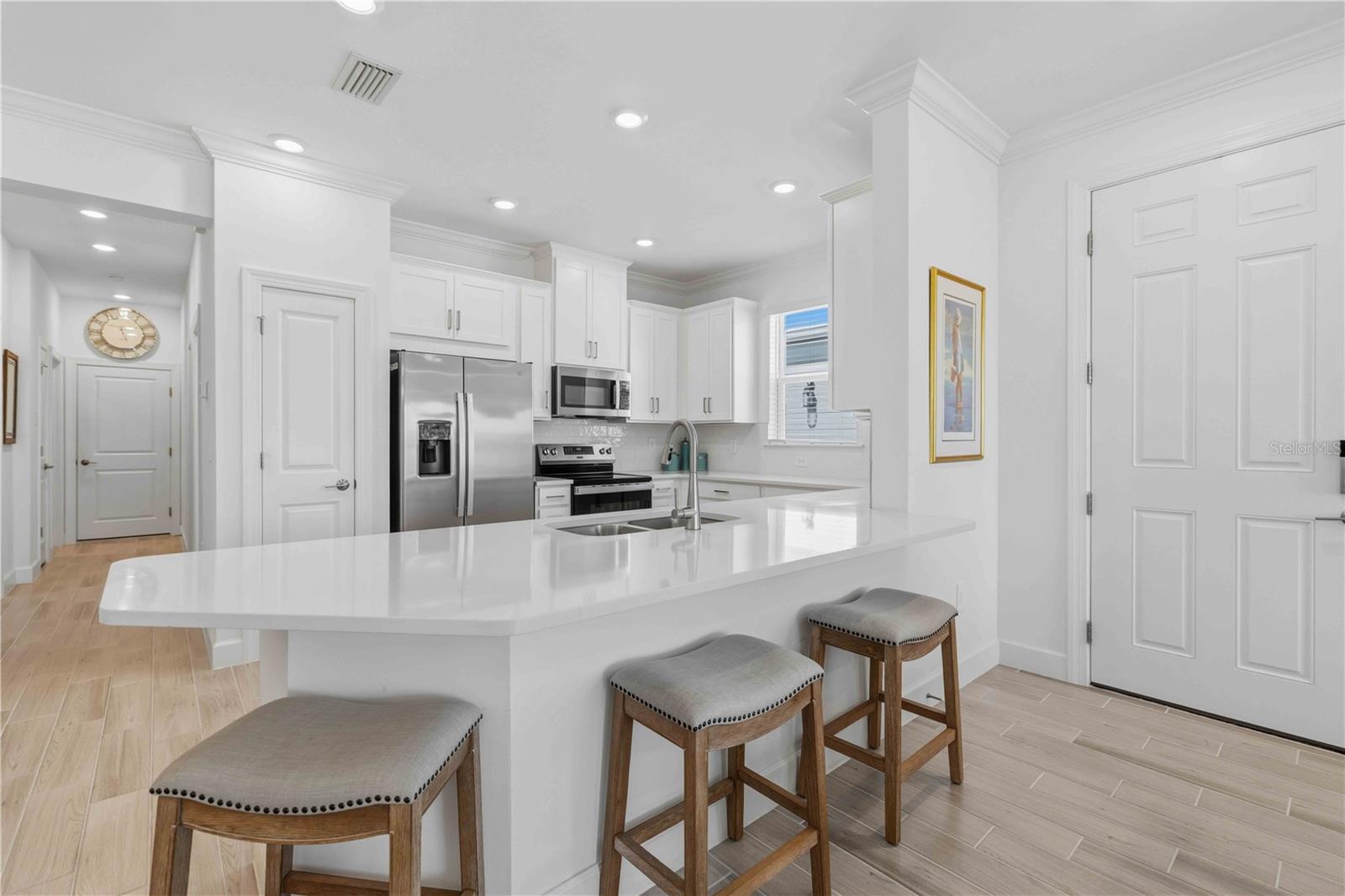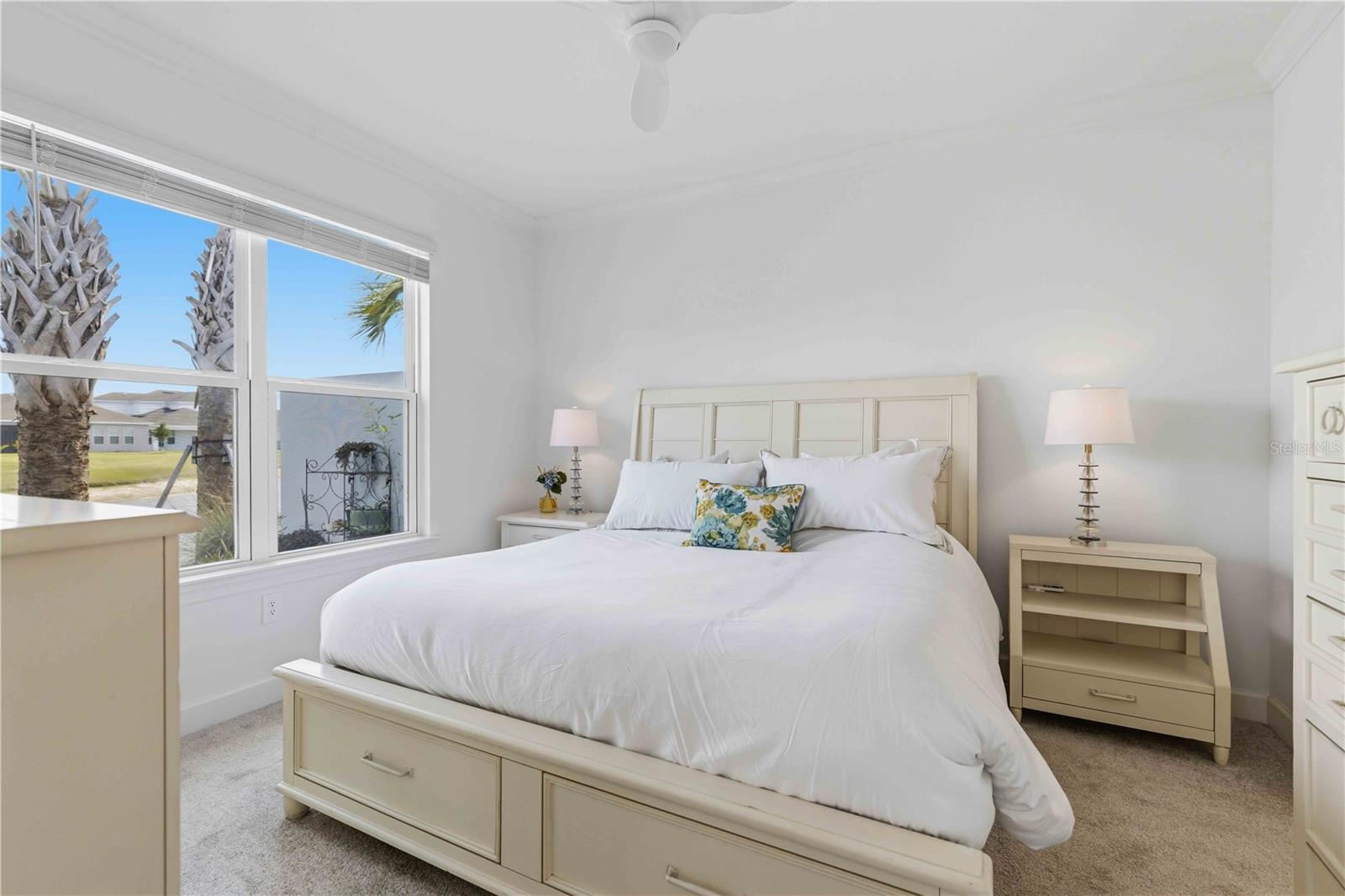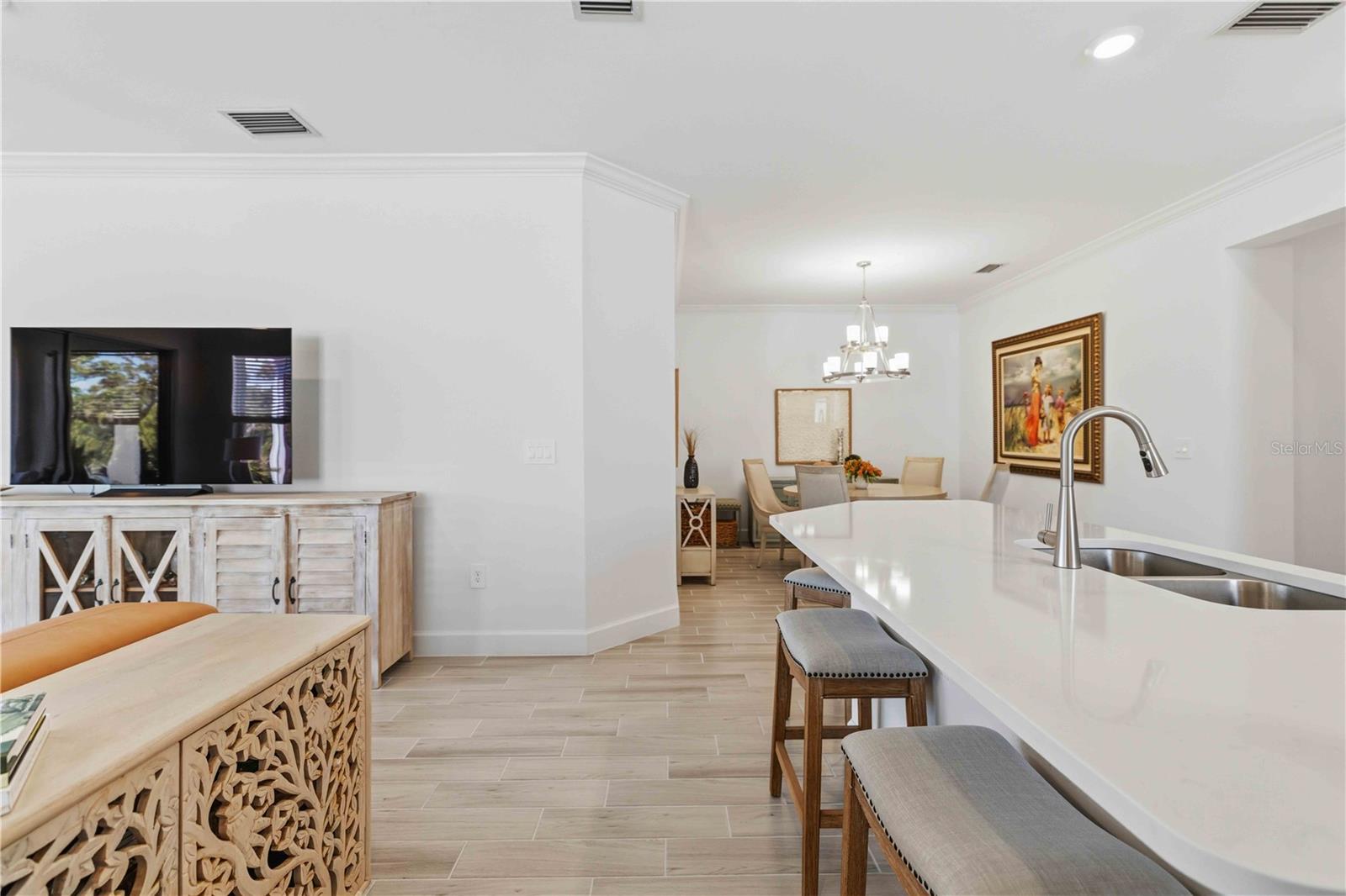 Built in 2024 by Taylor Morrison—recognized as one of America’s Most Trusted Homebuilders—this beautifully designed twin villa offers modern construction, thoughtful upgrades, and a highly desirable setting within The Cove. Inside, a bright open-concept layout seamlessly connects the spacious kitchen, dining area, and living room, creating an ideal space for both everyday living and entertaining. The kitchen is appointed with 48-inch cabinetry, quartz countertops, and natural finishes that complement the home’s clean, modern aesthetic, while sliding glass doors lead to an extended lanai for a seamless indoor-outdoor flow. Positioned on a cul-de-sac, this home is one of a limited number of similar models within the community—and one of the few offering a water view. The lanai’s privacy wall enhances the setting, creating a comfortable outdoor space to enjoy peaceful evenings, western sunsets, and quiet mornings with coffee. The split floor plan provides privacy, with the primary suite tucked at the rear of the home featuring a spacious walk-in closet and a well-appointed en-suite bath, while a secondary bedroom and full bath at the front offer flexibility for guests or a home office. Designed with comfort and style in mind, the home features 9’4” ceilings, 8-foot interior doors, ceramic plank tile throughout, crown molding, window treatments, and a spacious two-car garage with an epoxy-coated floor, along with a Ring doorbell system for added convenience. As a newer construction home, all major components—including the roof, A/C, water heater, appliances, electrical, and windows—are 2024. Located in The Cove, a gated, master-planned community in Charlotte County, residents enjoy a lifestyle centered around comfort and convenience with access to a welcoming clubhouse, heated resort-style pool, and pickleball courts, along with close proximity to dining, shopping, and the Gulf Coast’s beautiful beaches. The HOA further enhances ease of living by covering lawn maintenance, irrigation, and upkeep of the community amenities.