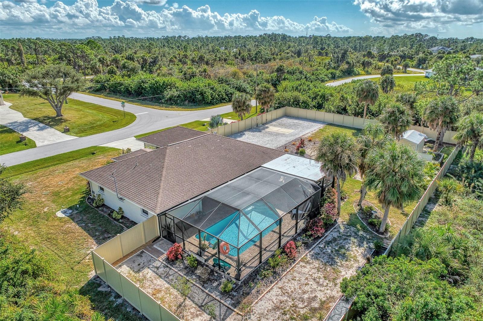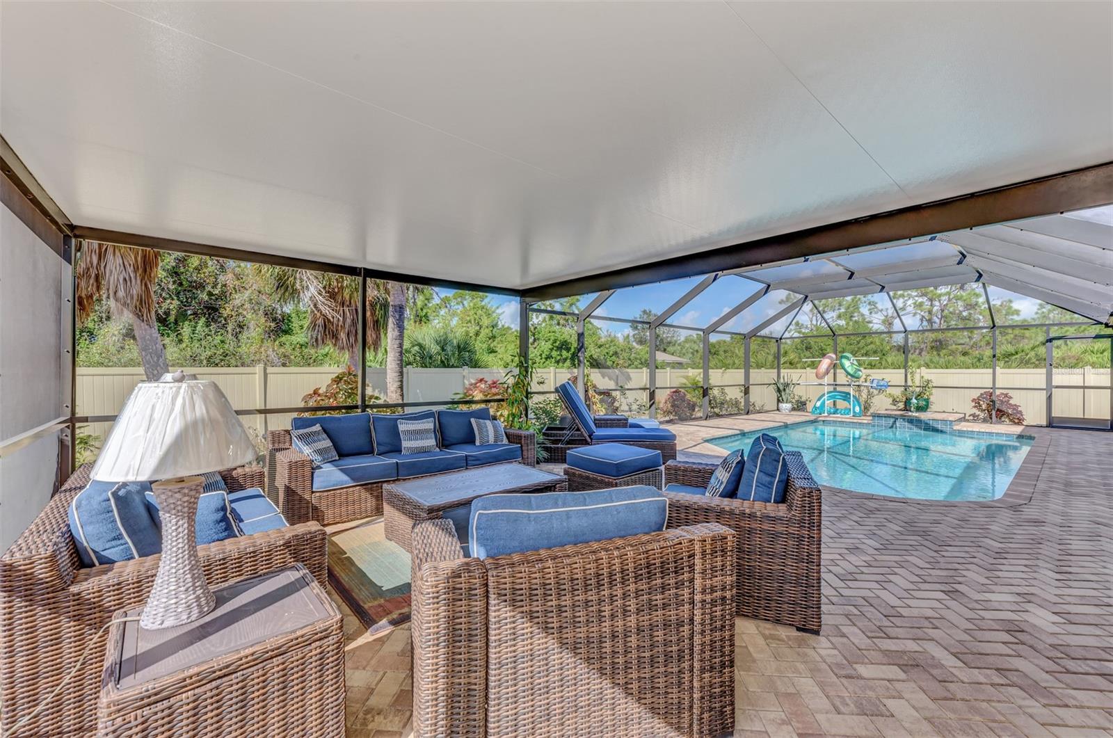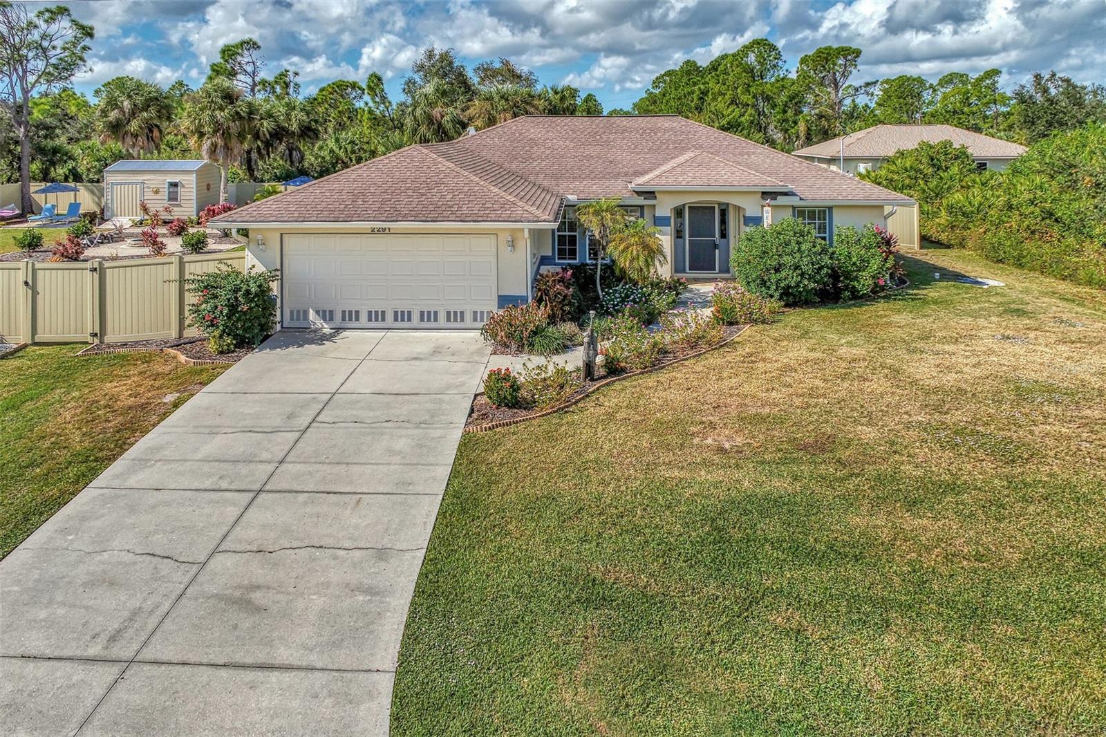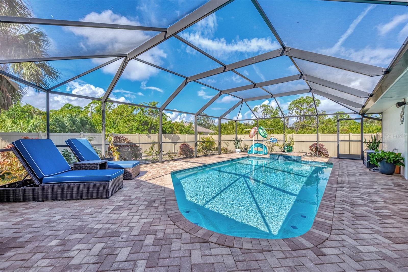 OUTSTANDING 3 bedroom, 2 bath, 2 car garage Heated POOL home situated on 2 OVERSIZED LOTS (half acre!) beautifully landscaped with loads of UPGRADES & EXTRAS including a separate 38X80 CONCRETE DRIVEWAY WITH RV HOOK UP (WATER & ELECTRIC) & Gate. 3 gates in total. PUBLIC WATER UTILITY-NO HOA FEES! Compete new fencing around both lots (transferable to the new buyer) perfect for young children and all your pets! You'll fall in love with the 15x21 SALTWATER HEATED IN-GROUND POOL with WATERFALL and changing light program! The EXPANDED POOL DECK has an ADDITIONAL side covered roof area in addition to the covered lanai. Great entertaining patio! The full cage measures 30x44! The pool has a PAVER DECK patio in a herringbone pattern that has been recently sealed! Home is hurricane protected. ! More features include a detached hurricane rated , FIREPIT, STORAGE SHED, HAMMOCK, and a barbecue area. Inside, discover a remodeled kitchen with GRANITE COUNTERTOPS, WOOD CABINETS, and STAINLESS APPLIANCES ($10,000 value!). The master bedroom boasts engineered plank wood flooring recently added in 2021 and sliding doors that will lead you out to the pool deck! The master bathroom comes with a tiled walk-in shower with a glass door! The second bedroom also has access to the pool deck and the guest bath comes with a tub & shower combination and glass sliding doors! The back of the entire lanai and the front door area have ACCORDION SHUTTERS with HURRICANE SHUTTERS for the rest of the home! The exterior of the home has been freshly painted and comes with a 5-year warranty transferable to the new buyer! All furniture, decorations, and potted plants in the lanai are INCLUDED along with a John Deere riding mower, home generator, and more. This home is located in a quiet peaceful neighborhood with the Town Center mall, Twisted Fork restaurant, Harley dealership, shopping, schools and more all close by. Just minutes away from our beautiful Gulf beaches and public boat ramps! This is your chance to own your piece of Paradise. True pride in ownership. Home warranty for the new buyer! Call today for your private tour!