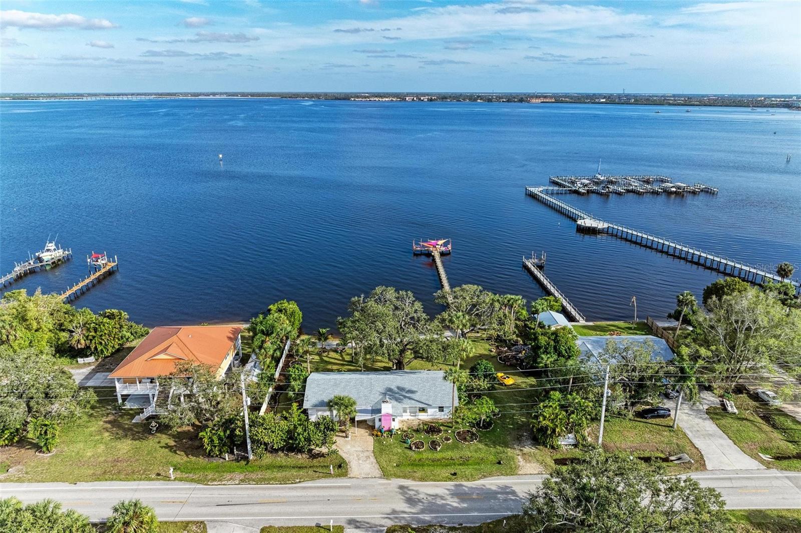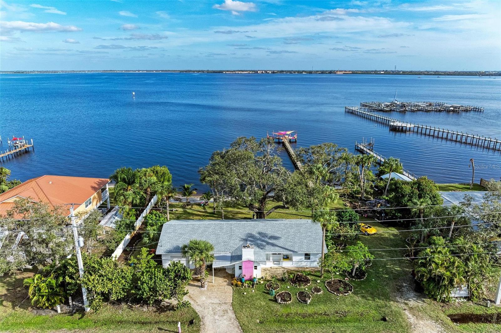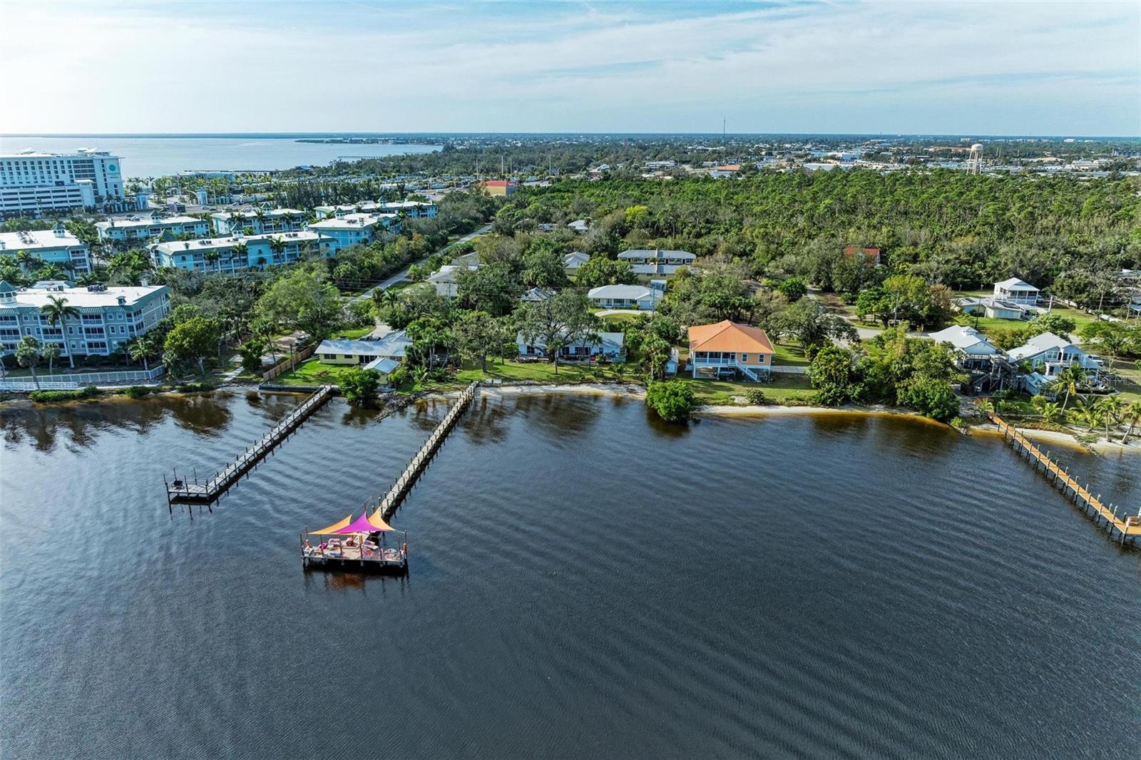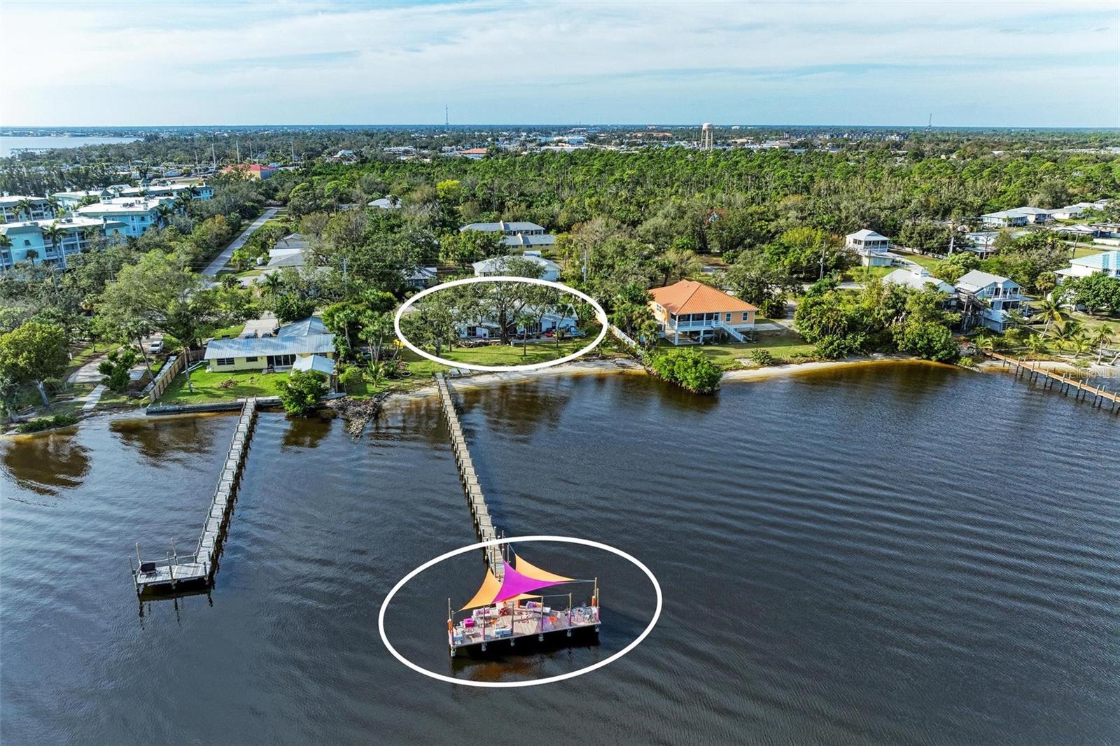 Home received flooding during both hurricanes. Fabulous opportunity to own this CHARLOTTE HARBORFRONT oversized property with nearly 180 feet of private beach, a large dock/pier in place with a beautiful unobstructed view and access for boating, and a desirable Southern Exposure and NO RENTAL or DEED RESTRICTIONS. DEVELOP INTO 2 HOMESITES, or OTHER POSSIBILITIES. The dock was updated and rebuilt in 2023. Prepare to be WOWED by the large oak trees that provide a beautiful canopy for the back deck that runs the full length of the house and is totally open to the private backyard, private beach, garden area, and the large pier/dock with sail cloths and great space to entertain. Find opportunities abound as this home is on 3.5 lots zoned CR3.5 nearby to the new Sunseeker Resort, upcoming new restaurant just down the road, and conveniently located with access to all things Punta Gorda and Port Charlotte. Schedule your showing today!