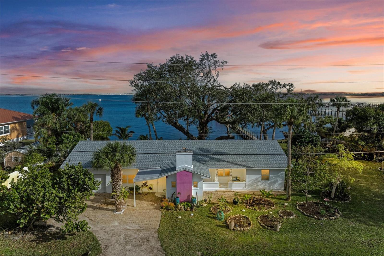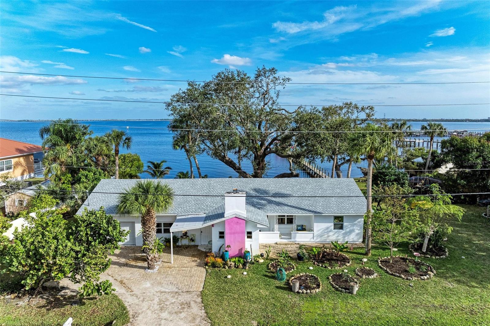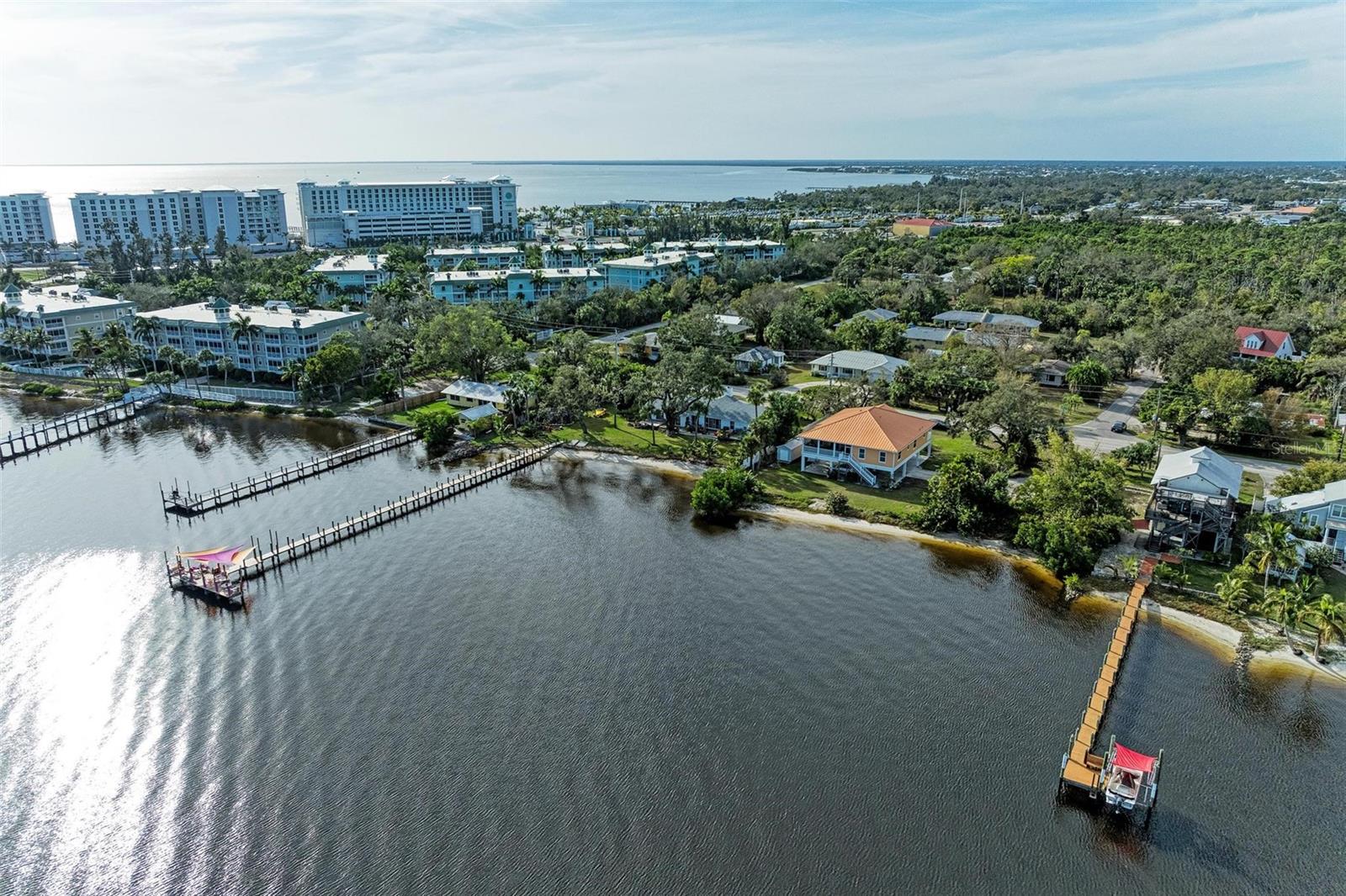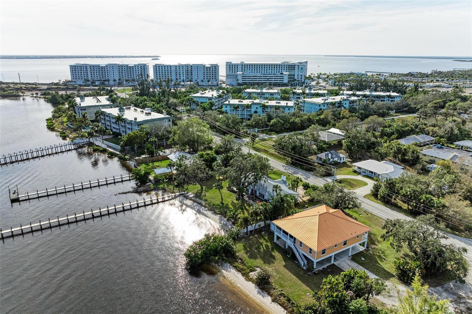 Home received flooding during both hurricanes. Fabulous opportunity to own this CHARLOTTE HARBORFRONT oversized property with nearly 180 feet of private beach, a large dock/pier in place with a beautiful unobstructed view and access for boating, and a desirable Southern Exposure and NO RENTAL or DEED RESTRICTIONS. DEVELOP INTO 2 HOMESITES, or OTHER POSSIBILITIES. The dock was updated and rebuilt in 2023. Prepare to be WOWED by the large oak trees that provide a beautiful canopy for the back deck that runs the full length of the house and is totally open to the private backyard, private beach, garden area, and the large pier/dock with sail cloths and great space to entertain. Find opportunities abound as this home is on 3.5 lots zoned CR3.5 nearby to the new Sunseeker Resort, upcoming new restaurant just down the road, and conveniently located with access to all things Punta Gorda and Port Charlotte. Schedule your showing today!