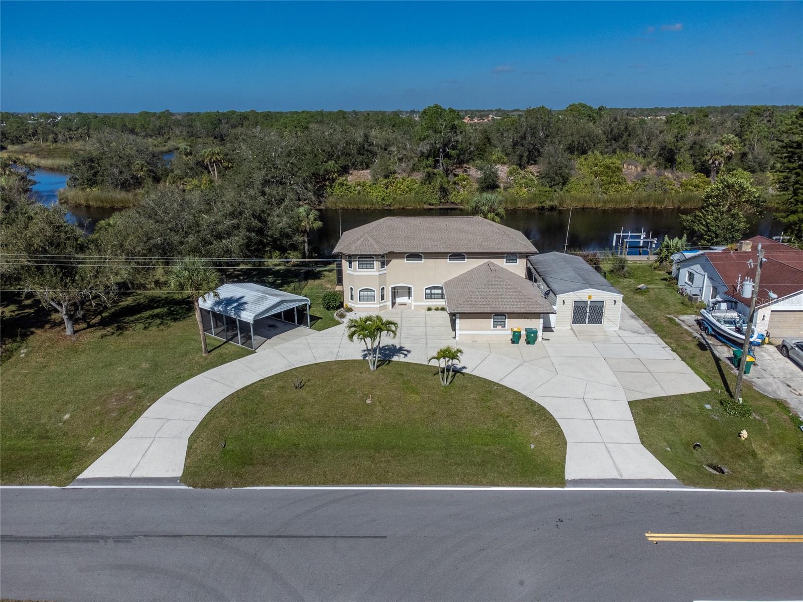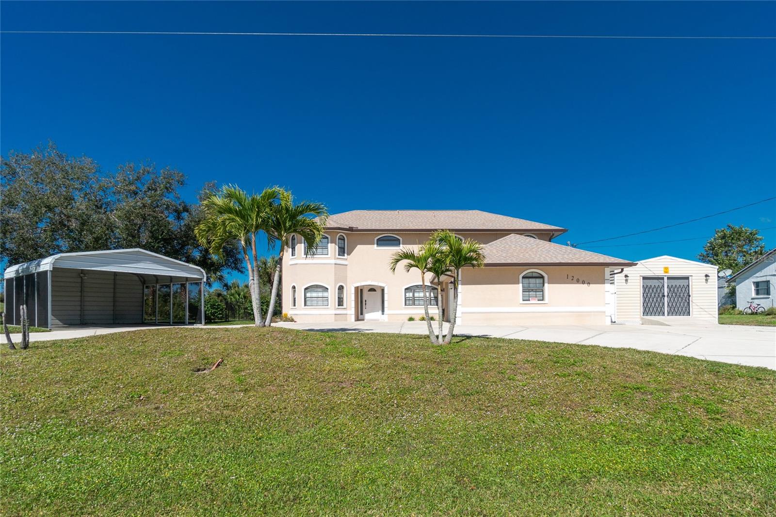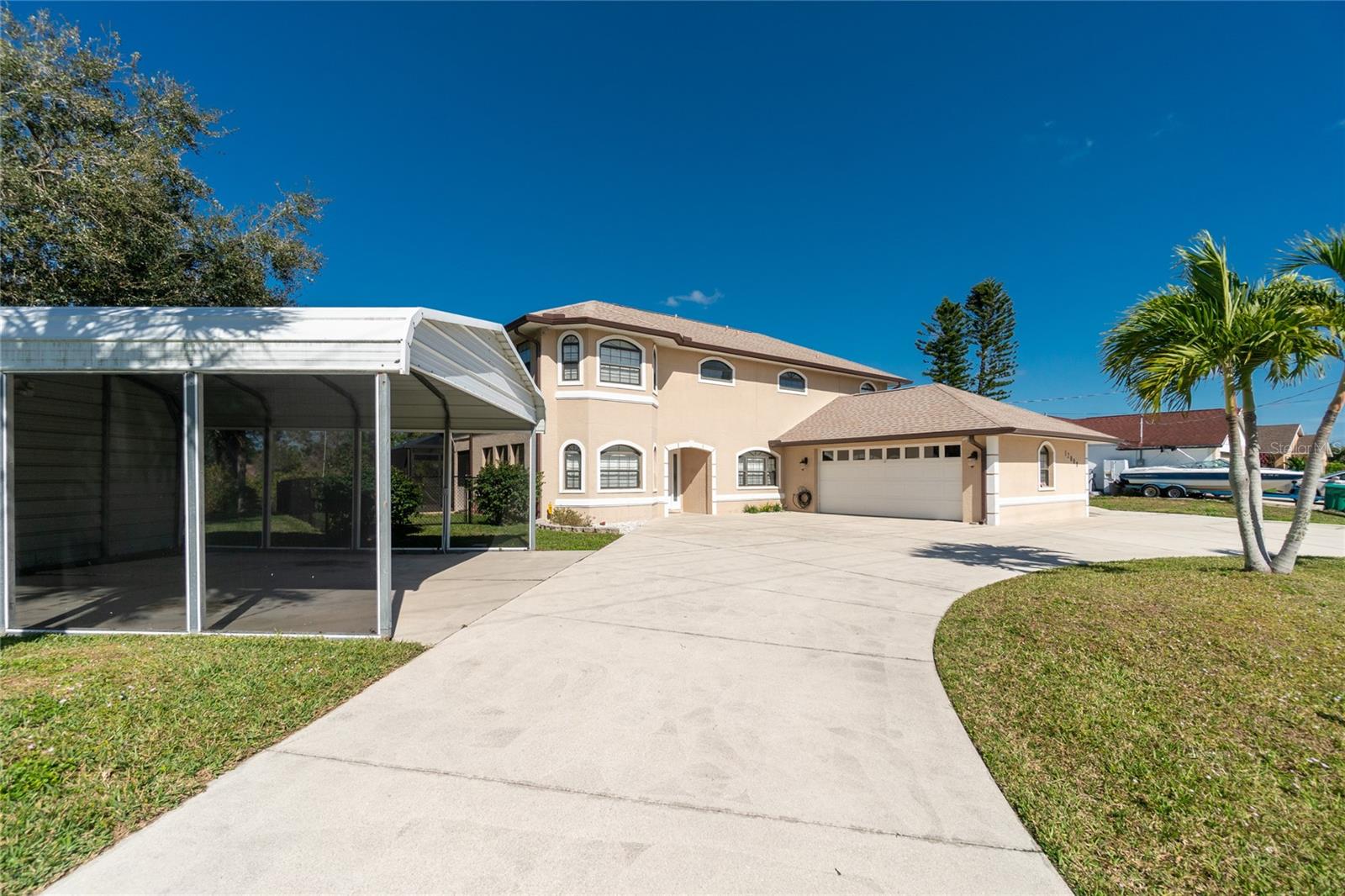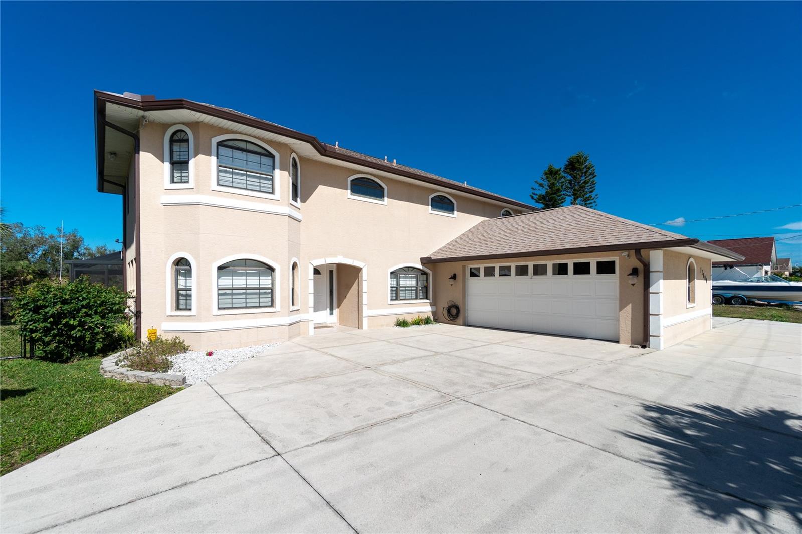 Impressive and spacious WATERFRONT two story home situated on an oversized lot (0.32 acres) on a quiet dead end street in Port Charlotte yet minutes from all amenities. This home offers 4 Bedrooms, 3 Bathrooms, attached 2 Car Garage and 22x18 two Car Carport with electricity. This light and bright home with numerous windows has a Great Room, Family Room with wood burning fireplace, separate Dining Room, well appointed Kitchen with Dining area, Inside Laundry and a separate 40x16 game room building with metal roof, insulation, electric overhead door and mini-split which provides both cool air and heat. The Kitchen features white cabinetry, beautiful granite counters, stainless appliances (refrigerator, oven/range, microwave, dishwasher), breakfast bar, dining area and opens to the Family Room with fireplace and vaulted ceiling. There is a guest Bedroom on the first floor with tile floor and a full bathroom with white wood vanity, granite counter and tub/shower combo. A wood staircase leads to the second floor with wood floors throughout, Master Bedroom, two additional guest bedrooms and full bathroom. The Master Bedroom features vaulted ceiling, custom walk in closet, additional built in closet and private bathroom with dual sinks, jetted tub and walk in shower. The Master also has private access via French doors to a screened porch overlooking the pool and canal. There are two generous sized guest bedrooms with walk in closets on the second floor and the guest bathroom has a walk in shower. Downstairs your living space extends to the screened lanai and pool area with 28x18 inground pool, covered lanai, half bath, outdoor shower with hot and cold water and open deck for sunbathing. Continue through the fenced yard to the waterfront with 90 foot concrete seawall and NEW 2021 66x12 wood dock. Boating access from the dock to Charlotte Harbor and on to the Gulf of Mexico. There is also a large concrete patio outside of the pool cage. Other features include: tile floors throughout the first floor and wood floors throughout the second floor, plantation shutters, shingle roof on the main house, circular driveway, two NEW A/C systems 2023, NEW ROOF 2018, NEW gutters 2022 NEW Pool Cage 2023. NO HOA. County water and septic. Per the seller, the land adjacent to this property on the west is a preserve and cannot be built on. This home is only 5 minutes from shopping, dining, entertainment. 10 minutes from the Charlotte Sports Park (spring training home of the Tampa Bay Rays). Easy drive to world class fishing on Boca Grande and gorgeous Gulf beaches in Englewood, Manasota Key and Venice. This unique home is perfect for entertaining, perfect for a family and for those expecting lots of winter visitors!