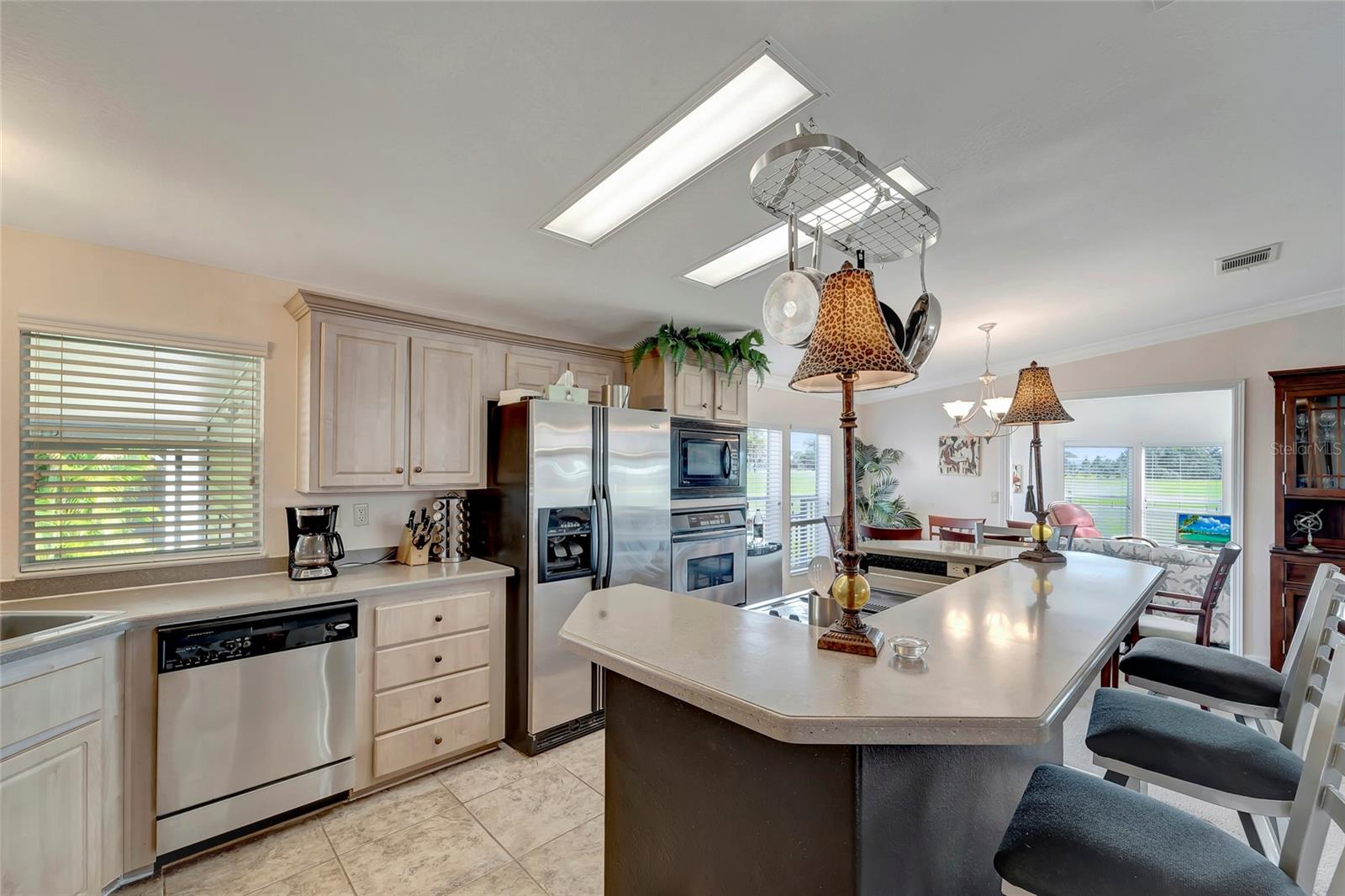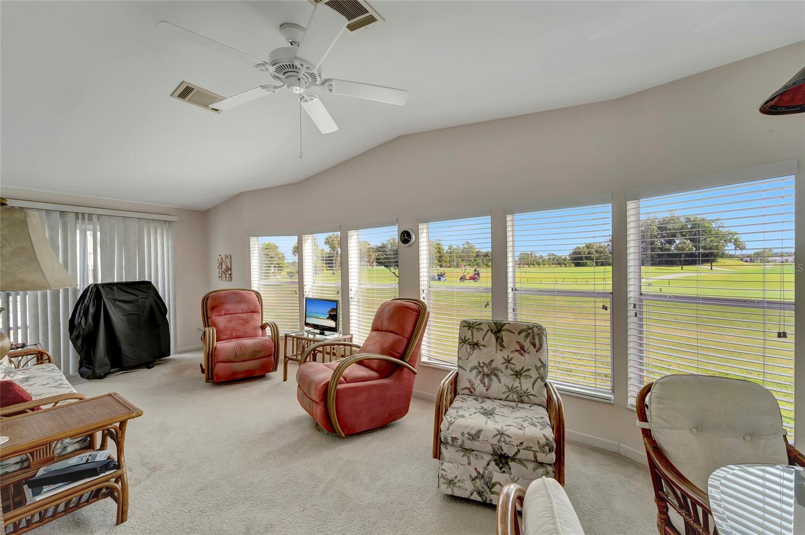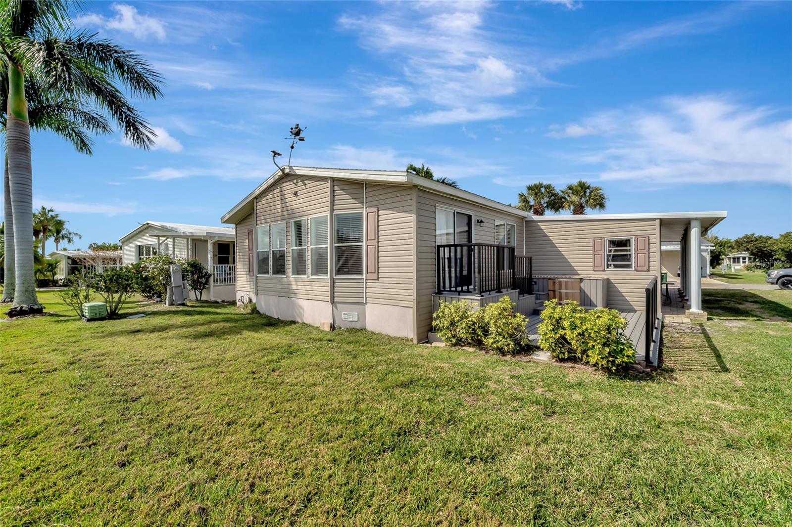 This spacious home offers it all! Welcome to your dream home! Nestled in the heart of panoramic golf course views, this 2005 Jacobsen-built masterpiece is a sanctuary of comfort and luxury. Boasting 1836 sq. ft.+ of meticulously designed living space, this home offers an open floor plan that's sure to impress. Step inside to discover an inviting atmosphere flooded with natural light, where every corner exudes warmth and elegance. Indulge in breathtaking sunrises and sunsets from your private oasis overlooking the 12th and 13th holes. Imagine sipping your morning coffee or unwinding after a long day in your custom wood barrel hot tub, set on a stunning Trex deck/patio. This move-in-ready gem features 2 bedrooms, including a spacious primary bedroom with an en-suite bath, perfect for unwinding after a long day. The gourmet eat-in kitchen is a chef's delight, equipped with Corian countertops, SS appliances, and custom built-ins. Need space to entertain? Look no further! The expansive living and dining areas provide the perfect backdrop for hosting gatherings with loved ones. And with a large den, there's ample room for overnight guests, a media room, craft space, or your home office. Relax and enjoy the serene views from your enclosed lanai, or step out onto the private deck to soak in the tranquility of your surroundings. With endless potential and quality craftsmanship throughout, this home is truly a rare find. Don't miss out on the opportunity to make this your forever home. Schedule a showing today and experience the luxury and comfort that awaits you. According to the owner, updates include a newer roof (5-7 yrs), newer AC and water heater, custom kitchen, and a custom barrel hot tub with Trex decking. Don't let this true gem slip away – it's a must-see! ? Home price includes certificate. Maple Leaf is a popular resident owned 55+ gated golf course community with an active resort lifestyle. Features an award winning 18 hole, par 62 golf course, 5 tennis courts, bocce ball, lawn bowling, 2 shuffleboard courts, 4 heated swimming pools, 2 hot tubs, fitness facility, woodworking facility, 75+ clubs/activities, 4 pickleball courts, restaurants, tiki hut/bar and much more. SCHEDULE A SHOWING TODAY !