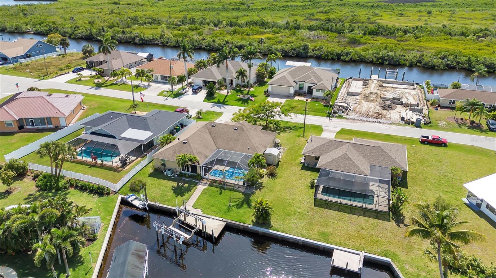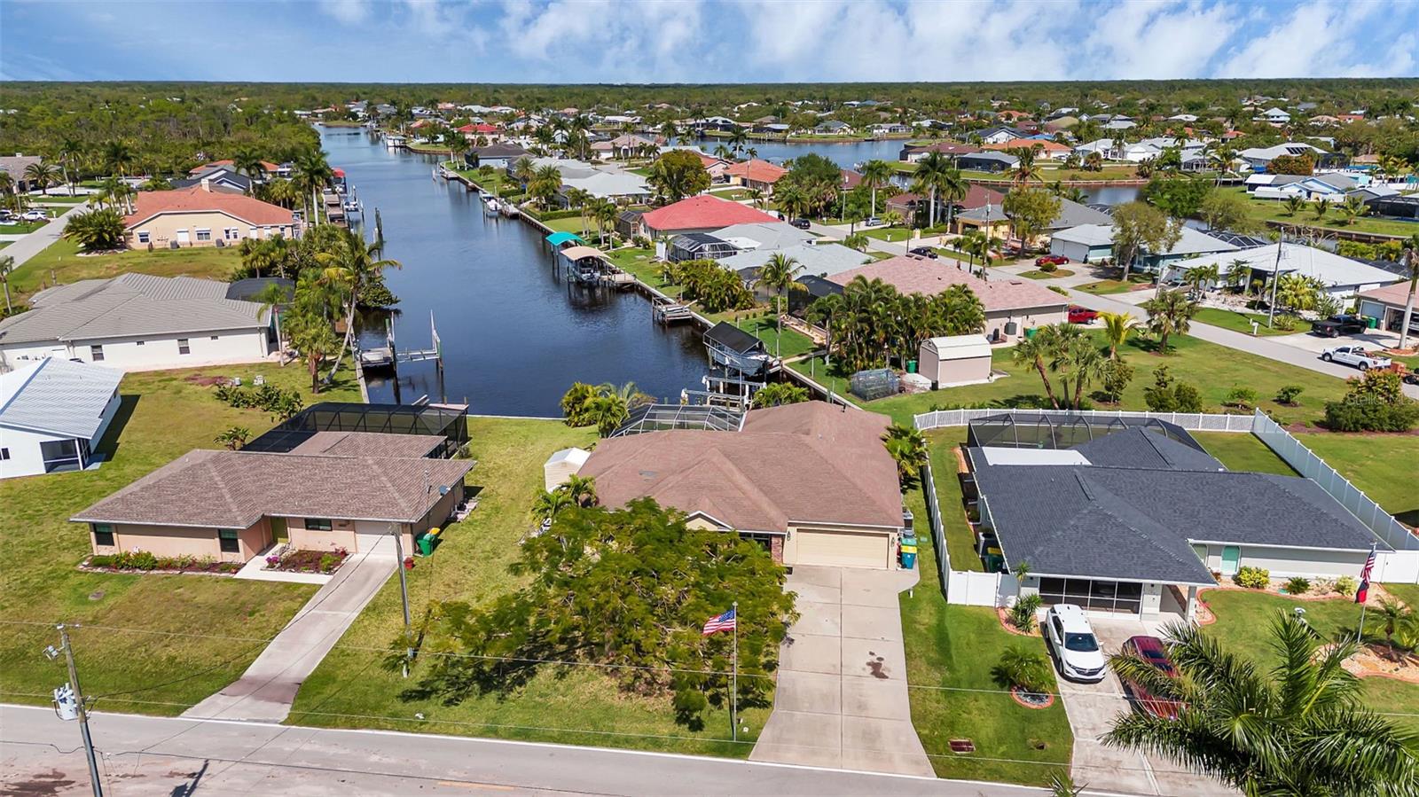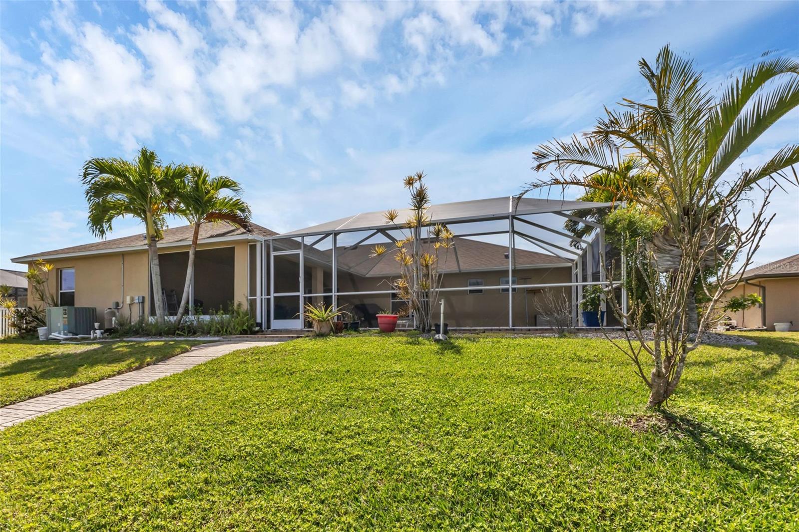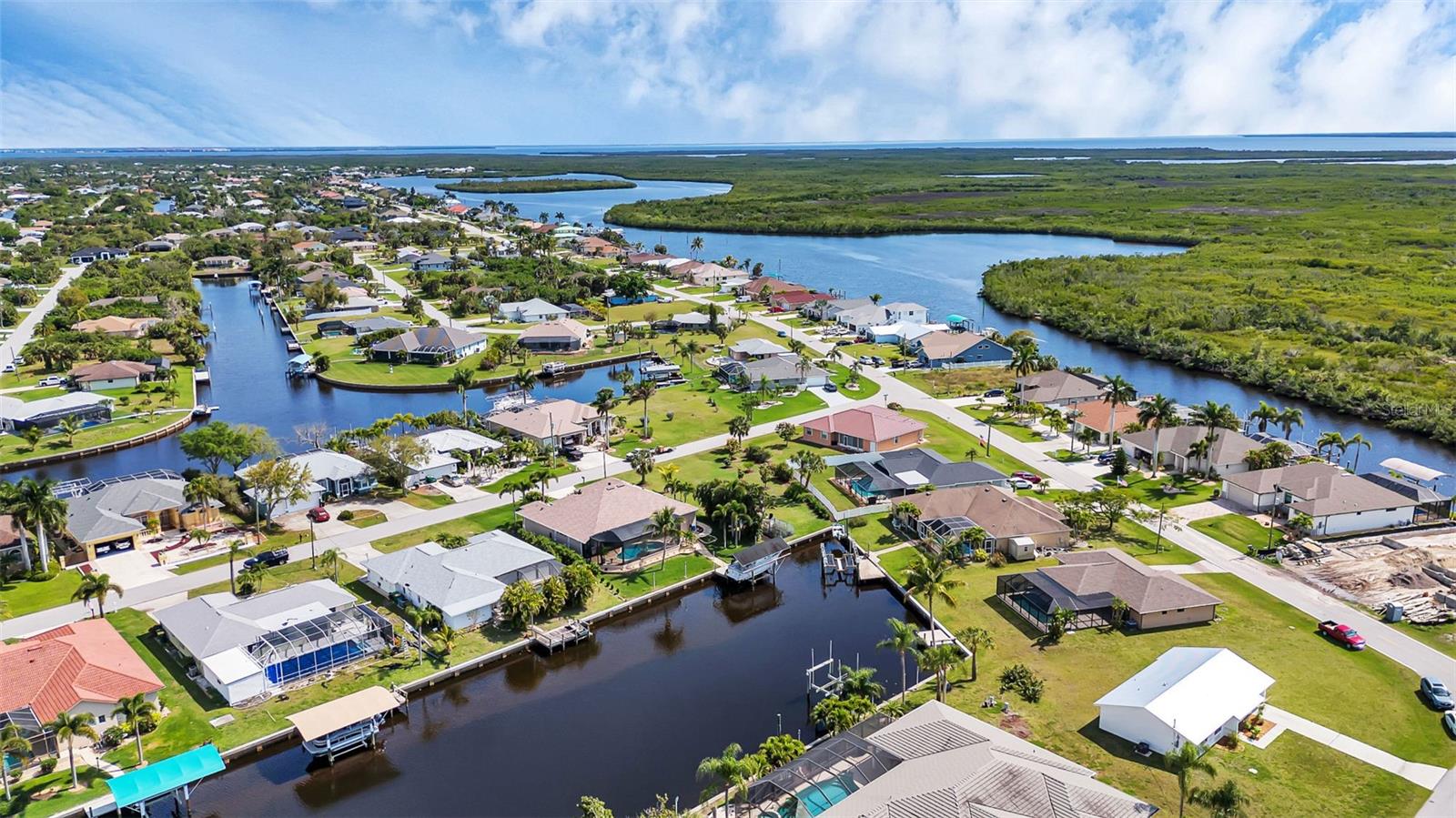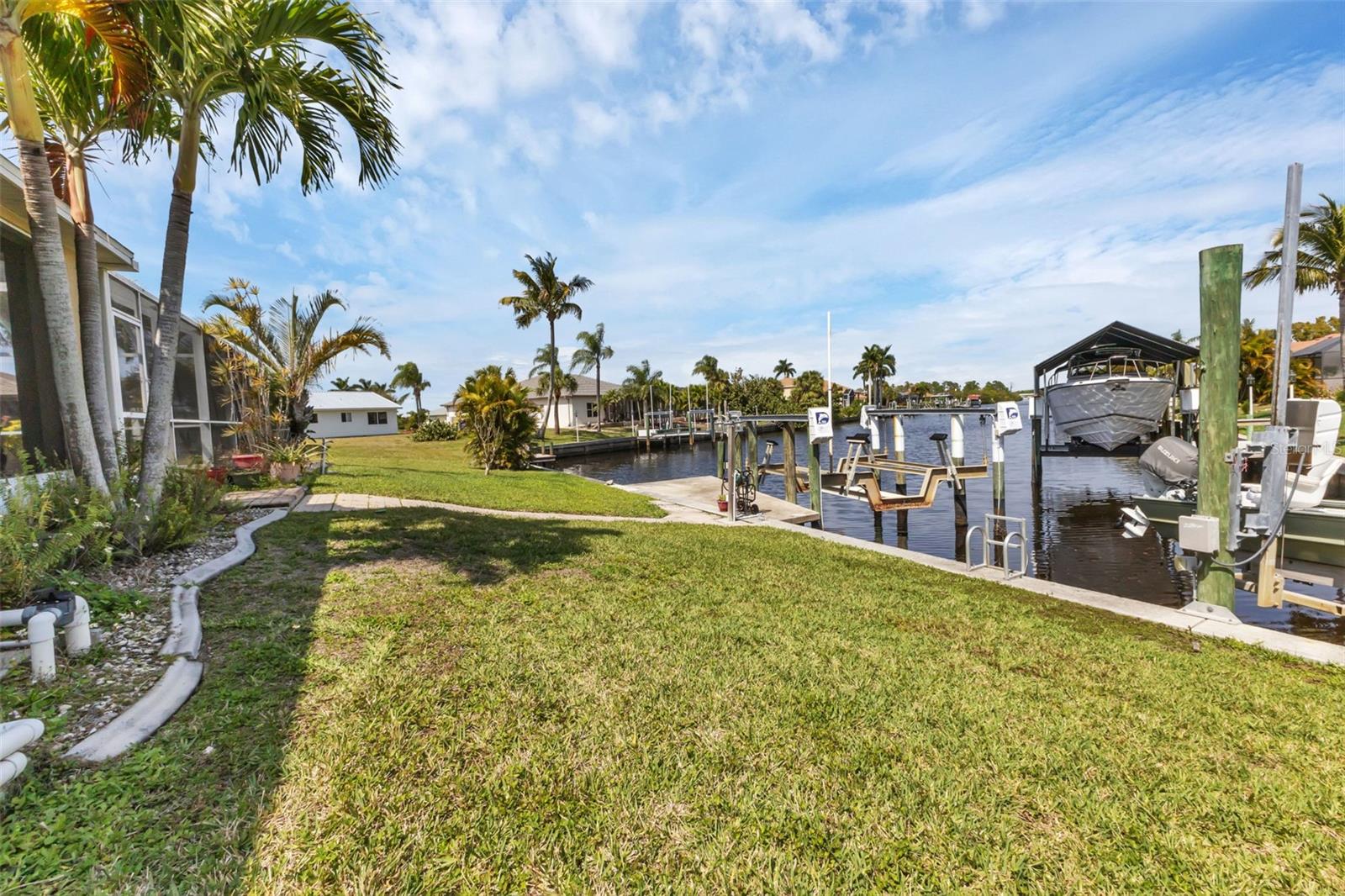 SAILBOAT WATER and STUNNING SUNSETS AWAIT YOU! Welcome to your waterfront oasis in the Manchester Waterway neighborhood! NO HOA! COUNTY WATER & SEWER! Assumable Flood Policy Available! This stunning Sailboat Waterfront home on desirable Ohara Drive, invites you to experience the best of coastal living with its array of enticing features. With NO BRIDGES, your maritime adventures are unrestricted from this location. Boating enthusiasts will rejoice with not just one, but 2 boat lifts available that include a 35,000lb SAILBOAT LIFT and a smaller 4,500lb lift, making it a breeze to set sail and explore the serene waters of Boca Grande, Captiva, Pine Island and the Gulf of Mexico. Think about the convenience and safety of having your sailboat on a lift versus setting in the water! Enjoy picturesque views of the long canal from your backyard, offering a sense of tranquility and relaxation. Step outside to your paver-covered lanai facing northward, providing the perfect respite from the summer heat. Take a dip in the heated pool or simply unwind while admiring the breathtaking sunsets from your covered front porch with stone finish. Nature lovers will appreciate the shallows and mangroves surrounding the property, offering plenty of action for fishermen. Whether you're sailing your yacht, cruising with your power-boat, or drifting with your kayak, the possibilities for adventure are endless. Built in 2011, this 2256 sqft abode exudes modern charm with plank tile flooring, quartz countertops, and craftsman-style stonework on the front of the home. The kitchen is a chef's delight, featuring two pantries, a kitchen island, and plenty of counter space for entertaining. The office/den has a closet can easily transition into a 4th bedroom, complete with a convenient Murphy bed system. Additional highlights include a 4-zone Orbit irrigation system controllable from your mobile device, hurricane shutters for home and a reinforced garage door for storm safety and features a 2021 myQ garage system. With spacious interiors flooded with natural light and thoughtful touches throughout, this waterfront retreat epitomizes the Florida boating lifestyle. Don't miss out on the opportunity to make it yours!