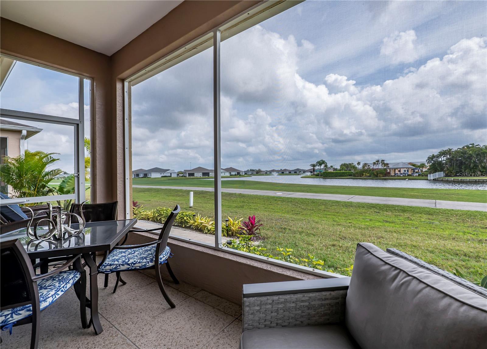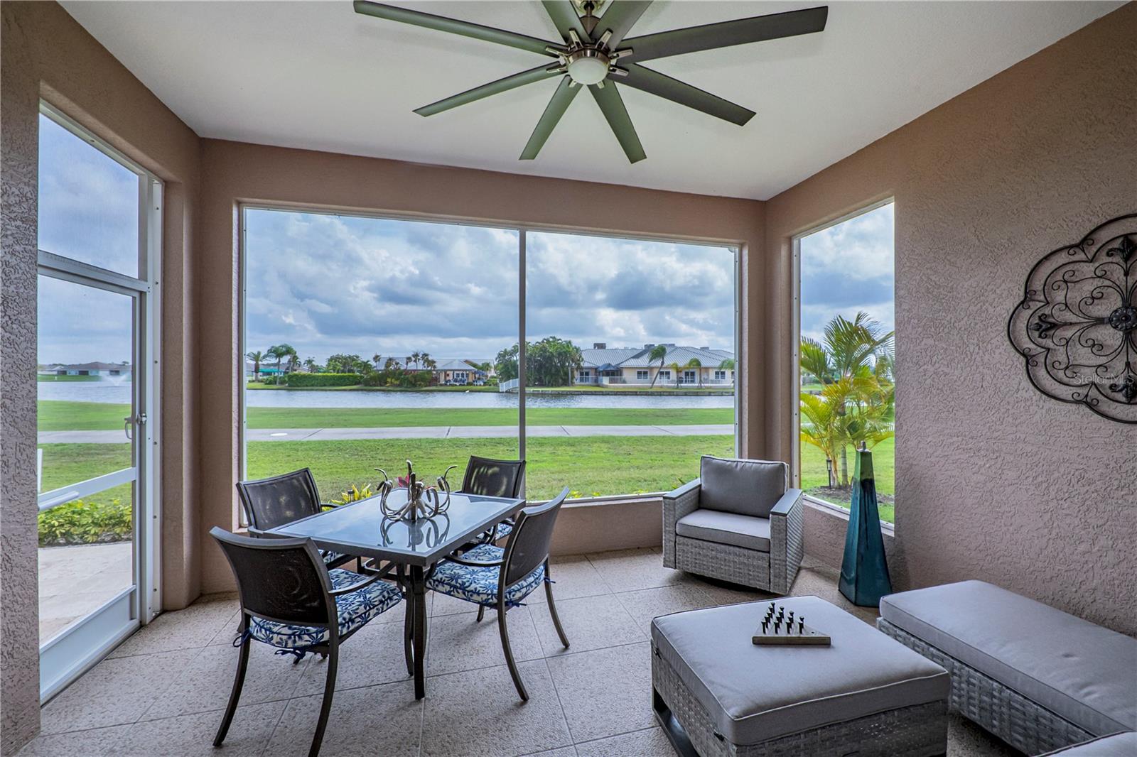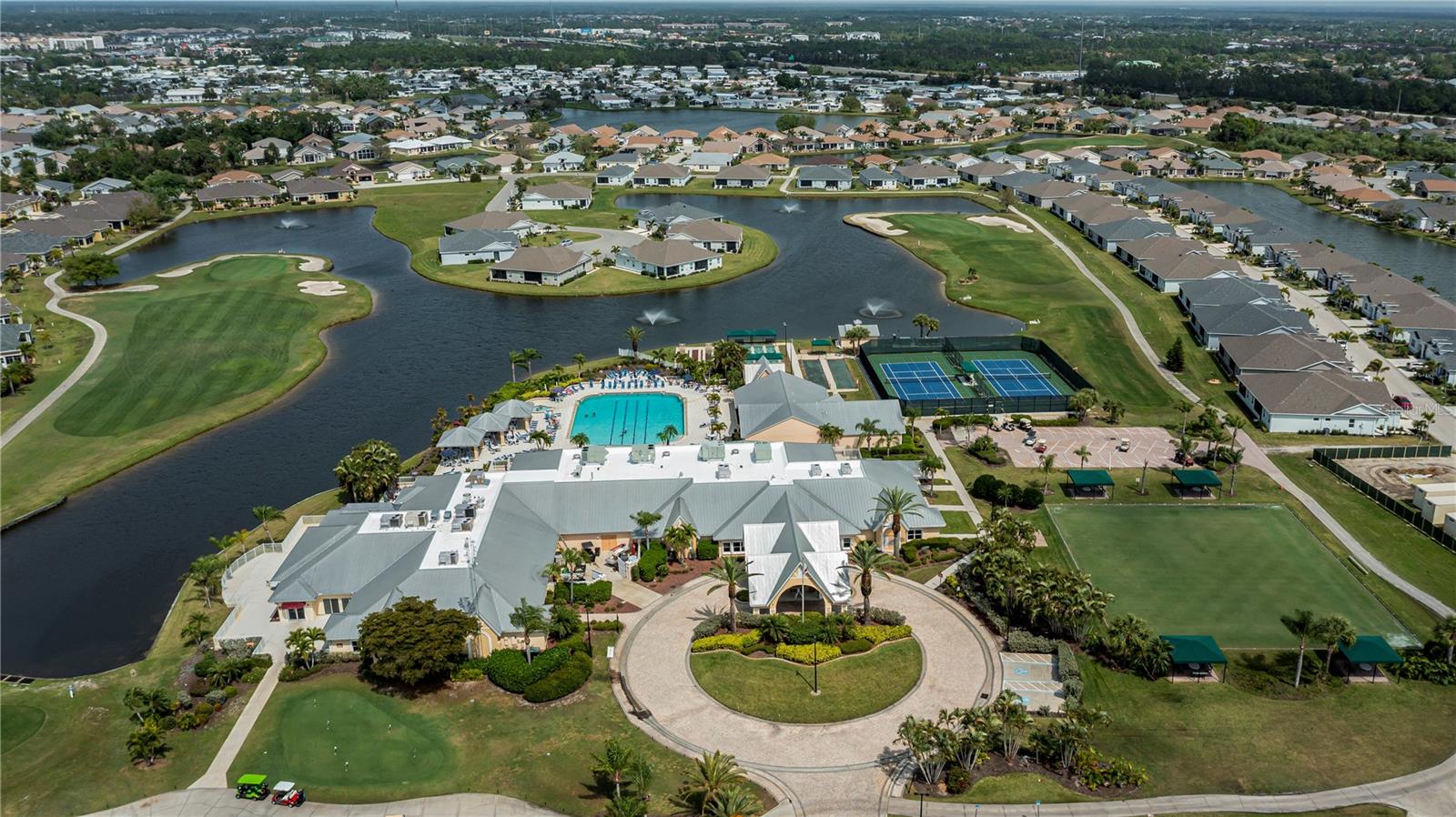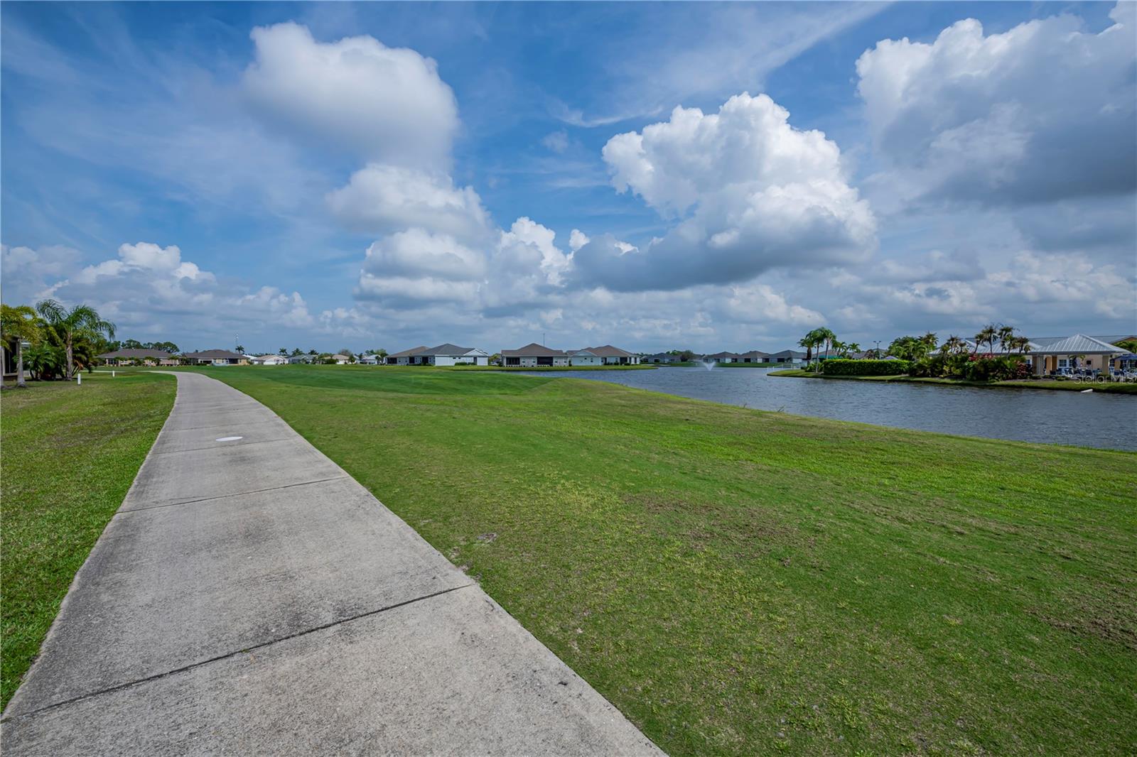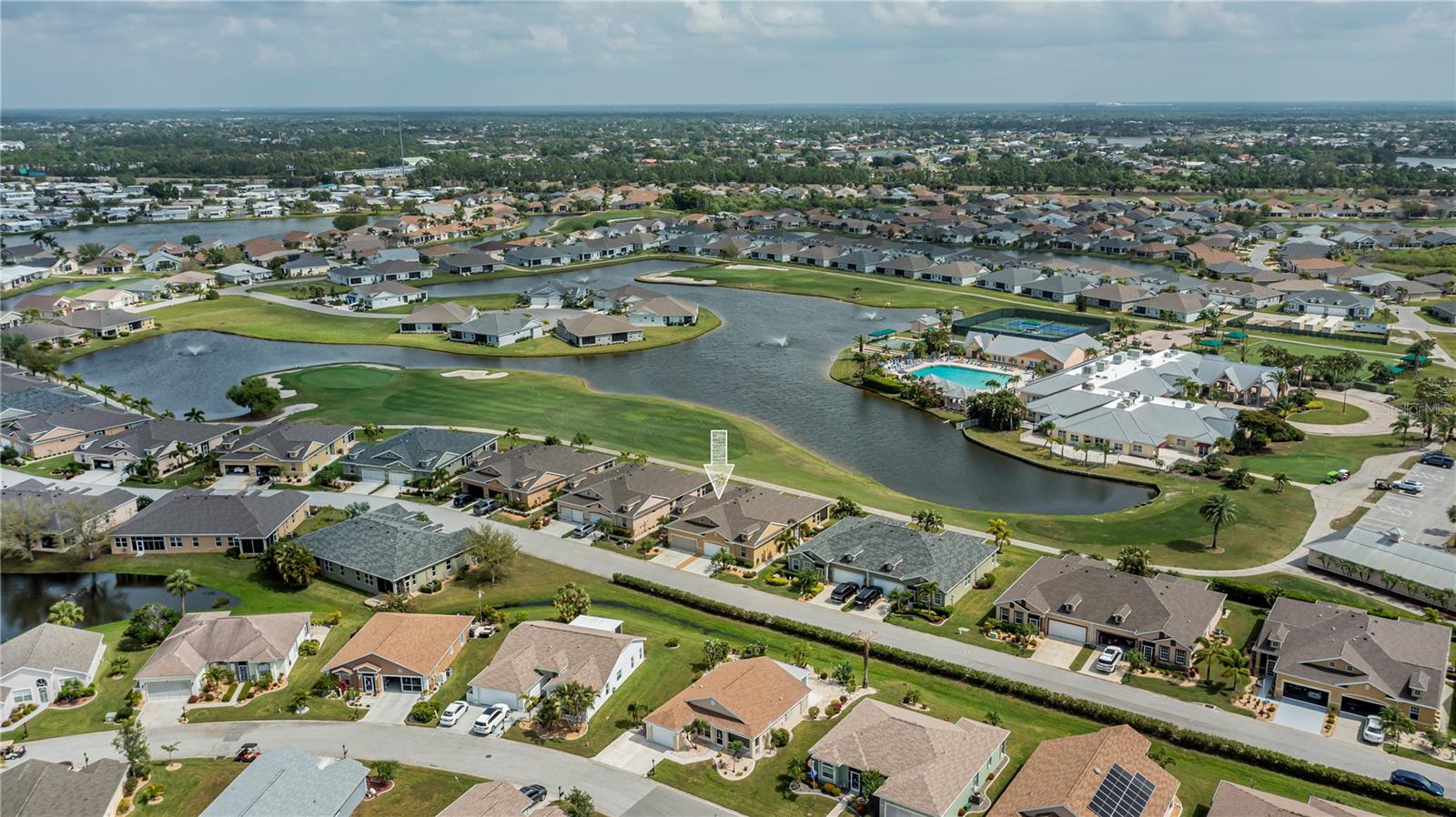 AWESOME LAKEFRONT 2/2/2 Villa overlooking the 1st Tee and fairway, plus PANORAMIC VIEWS across to pool area Cabanas and Clubhouse. Facilities are all simply walking distance. Located in the GATED golf course/active resort of Kings Gate, a 55+ community. This popular Augusta floor plan features a great OPEN CONCEPT design with 10 FOOT CEILINGS throughout. Incredible upgrades that affords SPECTACULAR VIEWS of the golf course/water from the EXPANDED LANAI and travertine patio, living room, dining room and kitchen. Welcoming foyer is impressive the moment you enter the front screened porch. Stunning Chef worthy kitchen with its STONE COUNTERS, rich wood cabinets, top of the line STAINLESS appliances, luxurious glass tile decorator backsplash, full breakfast bar and striking specialty lighting will make entertaining delightful. All new LED pot lights. bathroom fans and updated fixtures throughout. No carpet or tile, Brand new 2023 ENGINEERED FLOORING THROUGHOUT THE HOME. Home is newly painted in 2023 in neutral colors to make this home look lovely and modern. Master bedroom is a retreat with waterfront view, luxurious updated ensuite bath and full closets. Guests will enjoy serenity in the spacious second bedroom, with shared access to main bath that is lavishly upgraded. Laundry room has lots of storage cabinets and a FULL PANTRY for you extra storage needs. Full 2 car garage has a nice automatic PRIVACY SHADE to make it easy to enjoy working with a nice cross breeze. Driveway is long enough to accommodate a full size pickup truck or large SUV. The large scenic, back lanai/patio is the icing on the cake, zen stone laded tiles beckon you day or night to relax sunrise or sunset watching wildlife on the lake, golfers in a distance with your favorite beverage of choice, so relaxing! And there are NO cable boxes, utility, water or electrical boxes on the front lawns, impact glass & hurricane garage door, NEW ROOF DEC 2022. Amidst this picturesque waterfront community, residents enjoy a range of amenities, from lawn maintenance and low cost HOA-covered amenities such as irrigation water, cable, roof maintenance, exterior paint, termite, & pressure washing. This active 55+ community provides a myriad of exciting activities with a full-time Activities Director, an Olympic-sized heated swimming pool and spa, exercise and fitness centers, lighted clay surfaced tennis courts, a theater, billiards and computer room and so much more. Other planned activities and outings for your pleasure are not limited but include pickleball, bocce, lawn bowling, shuffleboard, horseshoes, mahjongg, cards & crafts. Enjoy onsite full service Lions Den Restaurant/ bar with Tuesday night Karaoke and monthly trivia contests, ballroom, plus a 18-hole golf course. A golf cart ride takes you to the nearby Winn Dixie shopping plaza, offering access to groceries, a drug store, banking, restaurants, and more. Boat or RV storage is available for a separate fee, adding a layer of convenience to the already desirable lifestyle this community embodies.Discover the extraordinary lakeside living experience waiting for you ,with unparalleled views, luxurious amenities, and an active community lifestyle, THIS IS AN OPPORTUNITY NOT TO BE MISSED. Schedule your showing today and make this exceptional residence your lakeside .