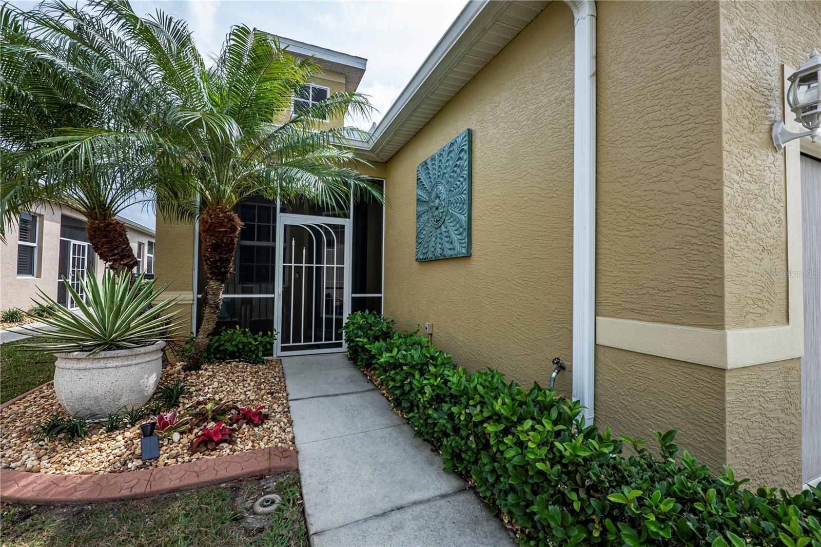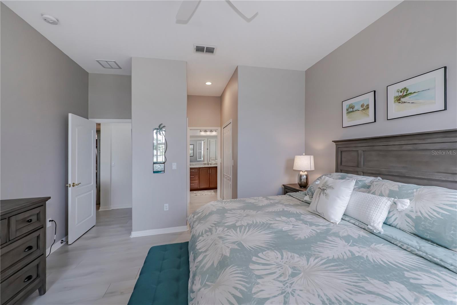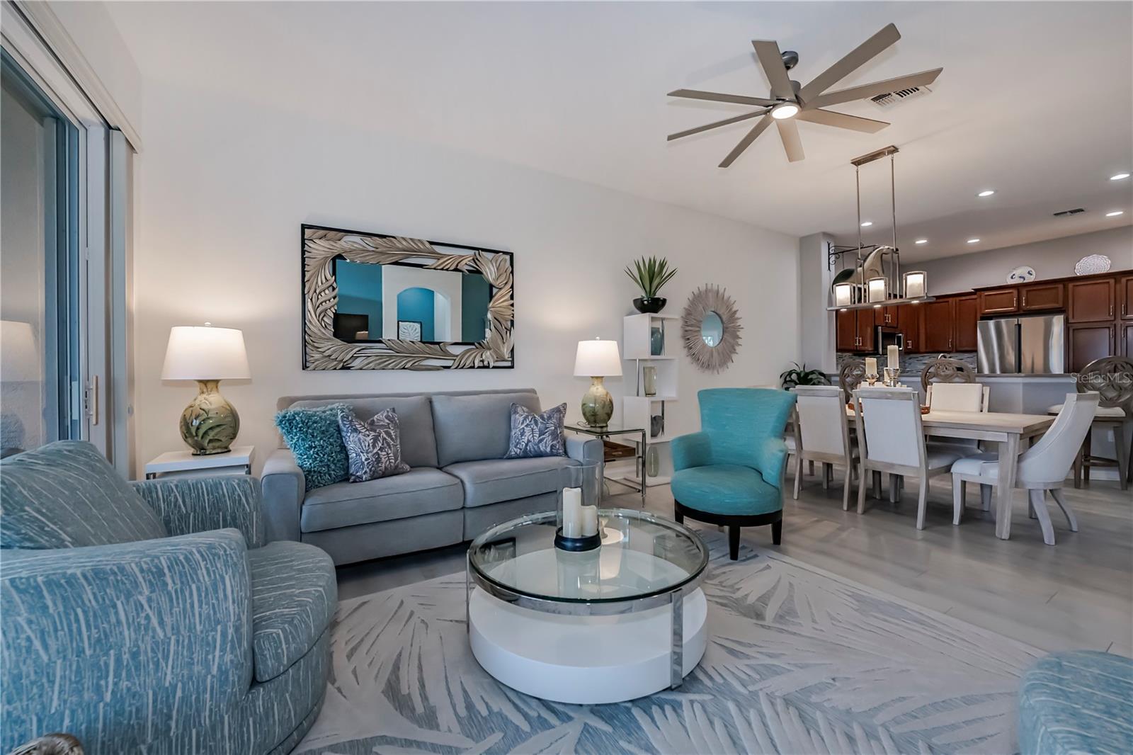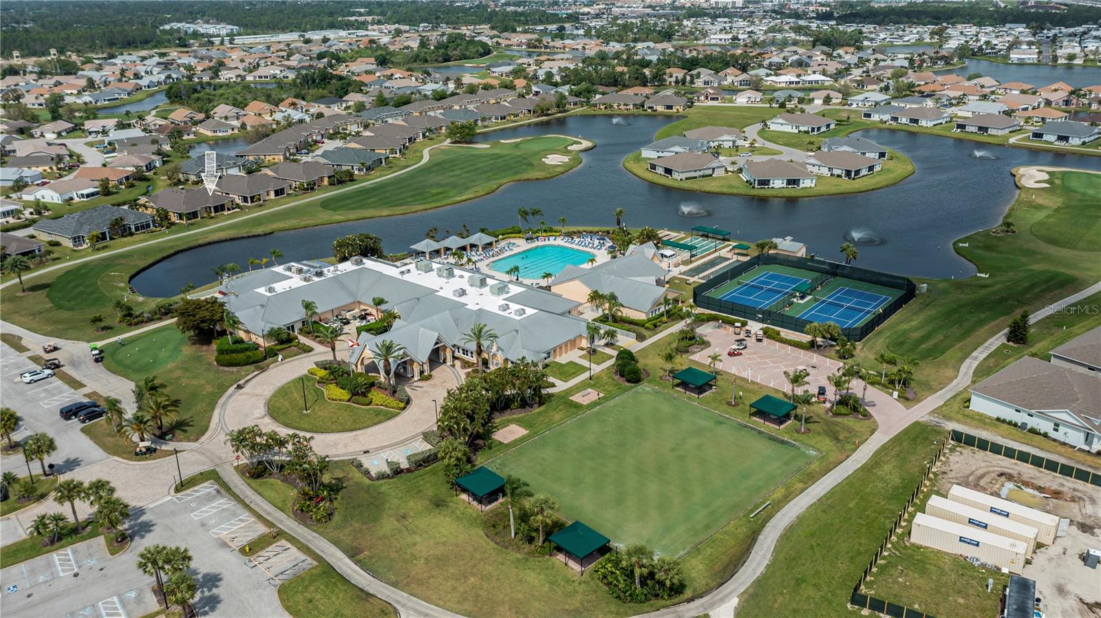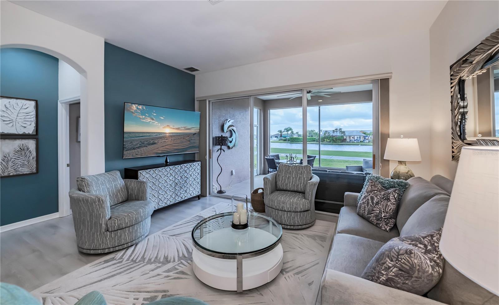 AWESOME LAKEFRONT 2/2/2 Villa overlooking the 1st Tee and fairway, plus PANORAMIC VIEWS across to pool area Cabanas and Clubhouse. Facilities are all simply walking distance. Located in the GATED golf course/active resort of Kings Gate, a 55+ community. This popular Augusta floor plan features a great OPEN CONCEPT design with 10 FOOT CEILINGS throughout. Incredible upgrades that affords SPECTACULAR VIEWS of the golf course/water from the EXPANDED LANAI and travertine patio, living room, dining room and kitchen. Welcoming foyer is impressive the moment you enter the front screened porch. Stunning Chef worthy kitchen with its STONE COUNTERS, rich wood cabinets, top of the line STAINLESS appliances, luxurious glass tile decorator backsplash, full breakfast bar and striking specialty lighting will make entertaining delightful. All new LED pot lights. bathroom fans and updated fixtures throughout. No carpet or tile, Brand new 2023 ENGINEERED FLOORING THROUGHOUT THE HOME. Home is newly painted in 2023 in neutral colors to make this home look lovely and modern. Master bedroom is a retreat with waterfront view, luxurious updated ensuite bath and full closets. Guests will enjoy serenity in the spacious second bedroom, with shared access to main bath that is lavishly upgraded. Laundry room has lots of storage cabinets and a FULL PANTRY for you extra storage needs. Full 2 car garage has a nice automatic PRIVACY SHADE to make it easy to enjoy working with a nice cross breeze. Driveway is long enough to accommodate a full size pickup truck or large SUV. The large scenic, back lanai/patio is the icing on the cake, zen stone laded tiles beckon you day or night to relax sunrise or sunset watching wildlife on the lake, golfers in a distance with your favorite beverage of choice, so relaxing! And there are NO cable boxes, utility, water or electrical boxes on the front lawns, impact glass & hurricane garage door, NEW ROOF DEC 2022. Amidst this picturesque waterfront community, residents enjoy a range of amenities, from lawn maintenance and low cost HOA-covered amenities such as irrigation water, cable, roof maintenance, exterior paint, termite, & pressure washing. This active 55+ community provides a myriad of exciting activities with a full-time Activities Director, an Olympic-sized heated swimming pool and spa, exercise and fitness centers, lighted clay surfaced tennis courts, a theater, billiards and computer room and so much more. Other planned activities and outings for your pleasure are not limited but include pickleball, bocce, lawn bowling, shuffleboard, horseshoes, mahjongg, cards & crafts. Enjoy onsite full service Lions Den Restaurant/ bar with Tuesday night Karaoke and monthly trivia contests, ballroom, plus a 18-hole golf course. A golf cart ride takes you to the nearby Winn Dixie shopping plaza, offering access to groceries, a drug store, banking, restaurants, and more. Boat or RV storage is available for a separate fee, adding a layer of convenience to the already desirable lifestyle this community embodies.Discover the extraordinary lakeside living experience waiting for you ,with unparalleled views, luxurious amenities, and an active community lifestyle, THIS IS AN OPPORTUNITY NOT TO BE MISSED. Schedule your showing today and make this exceptional residence your lakeside .