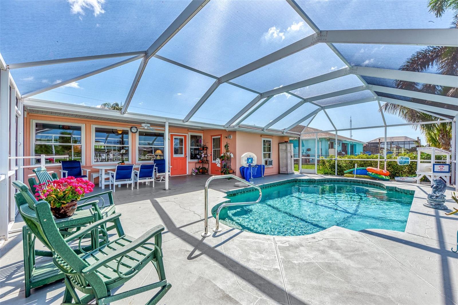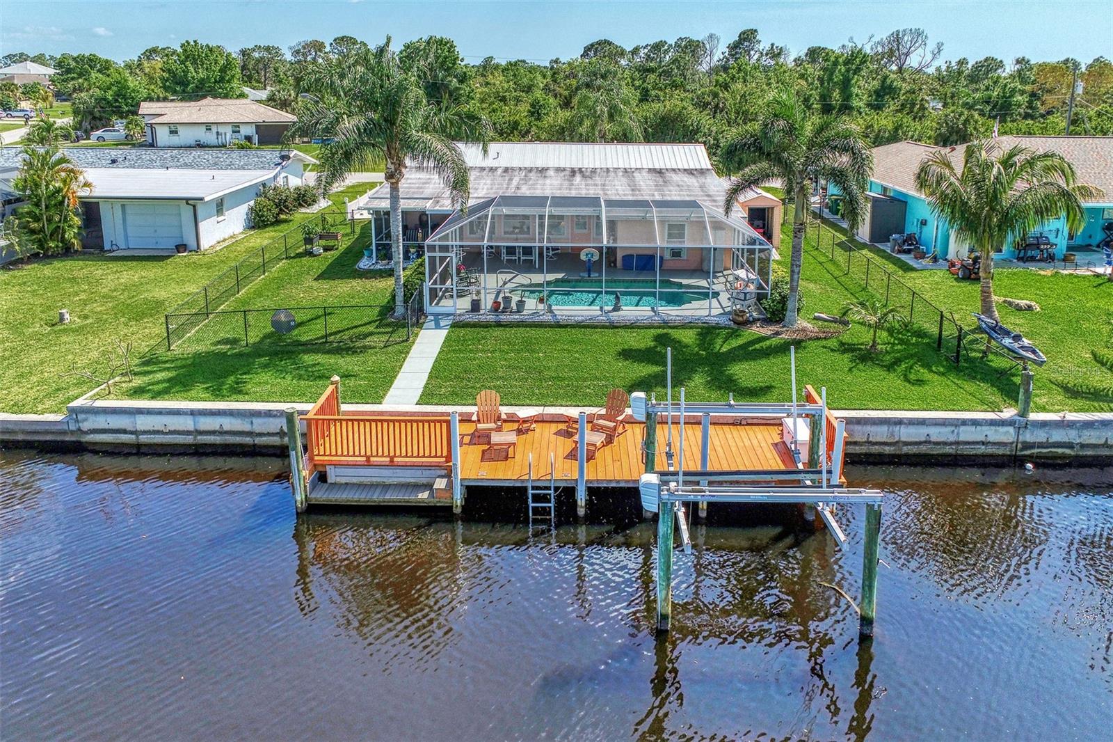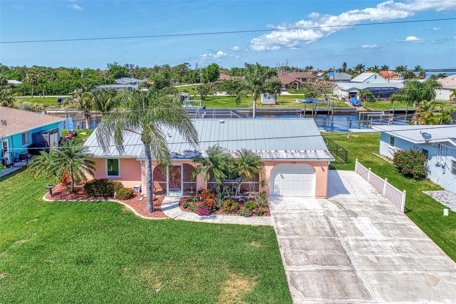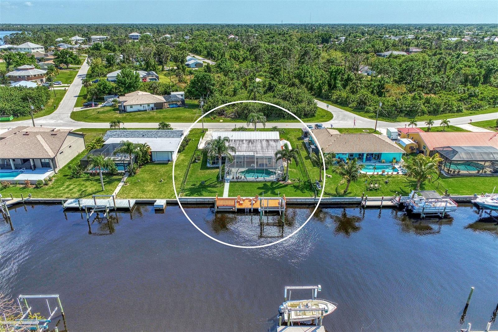 INCREDIBLE VALUE AND PRICE IMPROVEMENT IN A NEIGHBORHOOD WITH MULTI MILLION DOLLAR WATERFRONT PROPERTIES! Spectacular 3 bedroom, 2 bath pool home with private 6,000 lb boat lift, wood dock with electricity and 80' concrete seawall! This waterfront home leads out to the El-Jobean bridge with QUICK ACCESS to Charlotte Harbor and the GULF! Many wonderful updates include a newer metal roof & A/C (2019), BRAND NEW septic & drain field (2024), hot water heater (2021), refrigerator (2021), updated lanai area, boat lift & electric panel (2003), NEW garage door, side door & opener! Double wide driveway with R/V or Boat parking on side! With almost 1900 sq. ft of living, there is an array of amenities and updates included along with a blend of comfort, luxury, and convenience. As you step inside, you're greeted by an eye-catching waterfront view and a spacious living room, perfect for hosting gatherings or simply lounging with loved ones. The kitchen is a chef's delight, featuring ample counter space and a cozy dinette area where you can savor your morning coffee while admiring tranquil blue water views. Entertain in style in the formal dining room, or unwind in the welcoming family room, ideal for movie nights or lazy Sunday afternoons. Need extra space for guests or a home office? Look no further than the versatile bonus room, complete with its own access door to the inviting pool area. The fenced-in side yard offers a safe haven for children and pets to play freely. Whether you're a fishing enthusiast or love water sports, or simply love soaking up the sun, this waterfront paradise has something for everyone. And let's not forget about the practical updates that enhance both comfort and peace of mind. This home also has 2 storage sheds! The location is minutes to Englewood Beach, Twisted Fork restaurant, Town Center Mall, and a short drive to Boca Grande, the Tarpon fishing capital of the world. Call today! Rare find in this wonderful neighborhood!