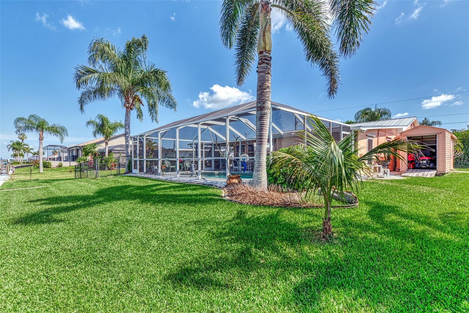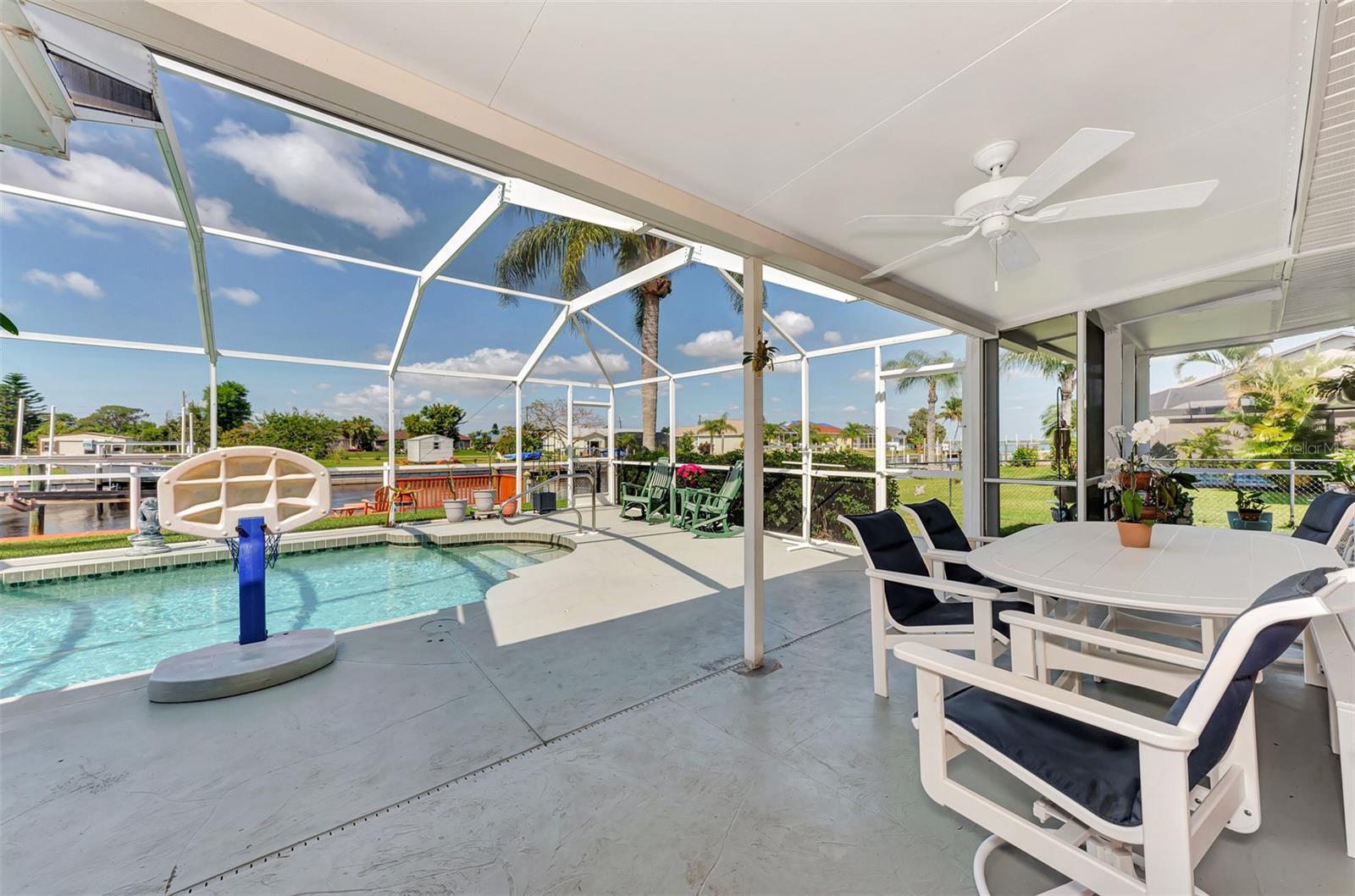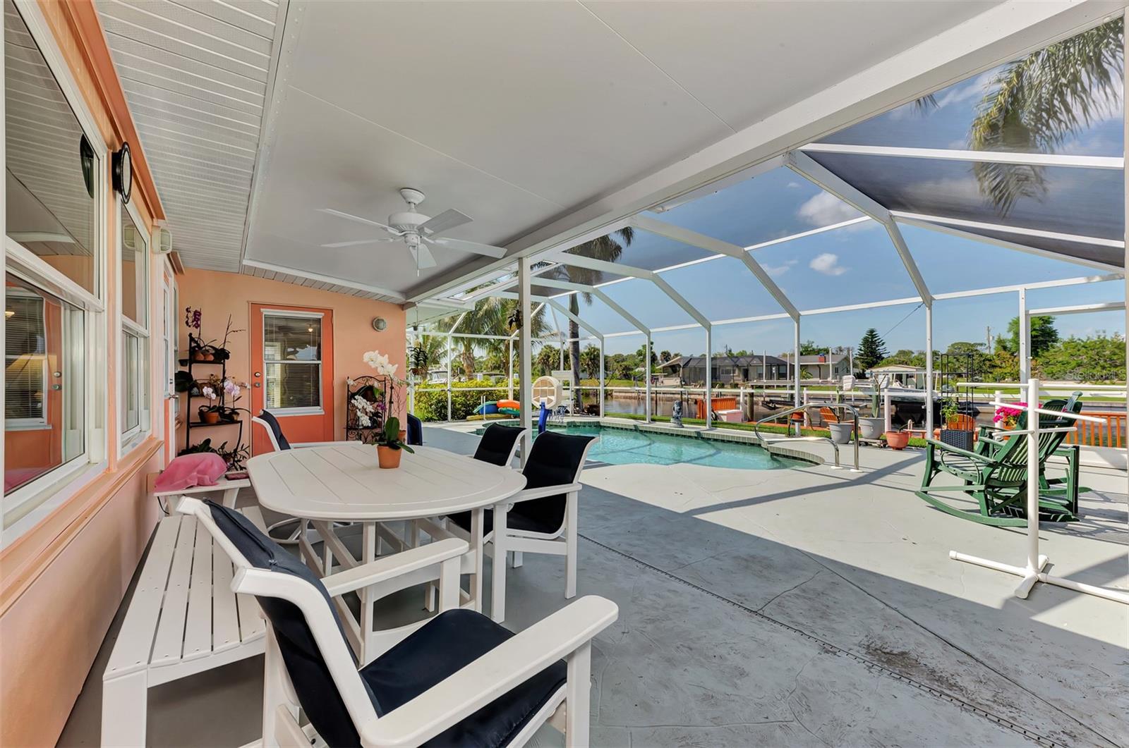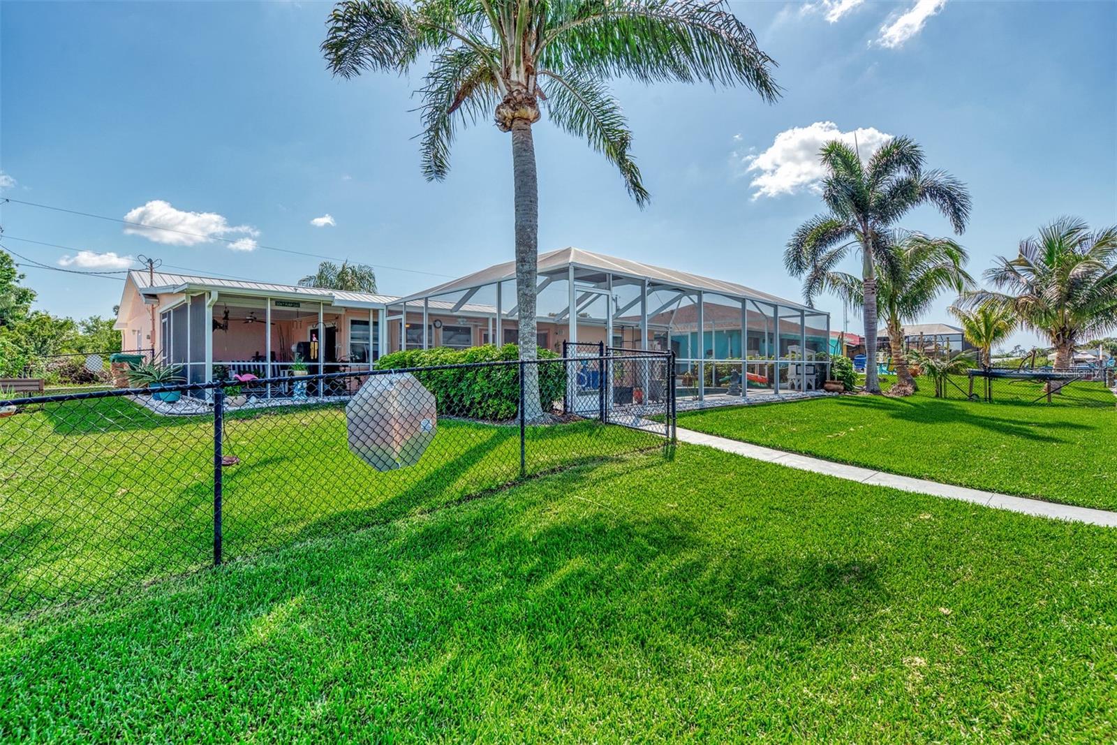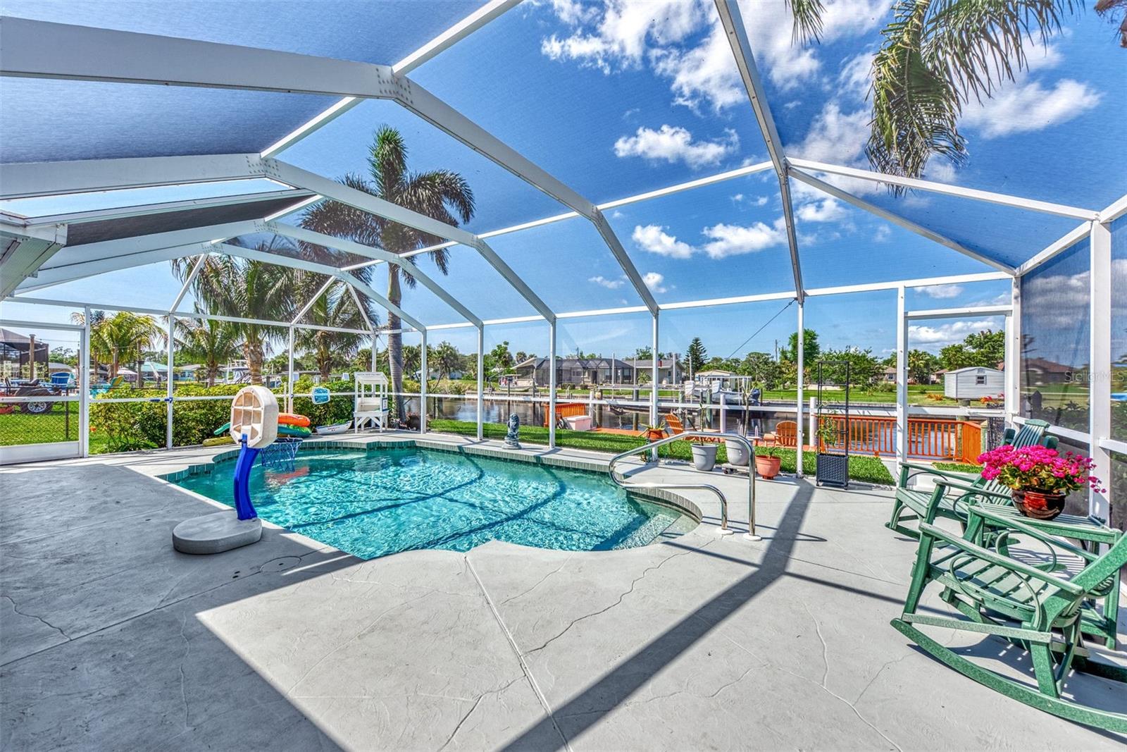 INCREDIBLE VALUE AND PRICE IMPROVEMENT IN A NEIGHBORHOOD WITH MULTI MILLION DOLLAR WATERFRONT PROPERTIES! Spectacular 3 bedroom, 2 bath pool home with private 6,000 lb boat lift, wood dock with electricity and 80' concrete seawall! This waterfront home leads out to the El-Jobean bridge with QUICK ACCESS to Charlotte Harbor and the GULF! Many wonderful updates include a newer metal roof & A/C (2019), BRAND NEW septic & drain field (2024), hot water heater (2021), refrigerator (2021), updated lanai area, boat lift & electric panel (2003), NEW garage door, side door & opener! Double wide driveway with R/V or Boat parking on side! With almost 1900 sq. ft of living, there is an array of amenities and updates included along with a blend of comfort, luxury, and convenience. As you step inside, you're greeted by an eye-catching waterfront view and a spacious living room, perfect for hosting gatherings or simply lounging with loved ones. The kitchen is a chef's delight, featuring ample counter space and a cozy dinette area where you can savor your morning coffee while admiring tranquil blue water views. Entertain in style in the formal dining room, or unwind in the welcoming family room, ideal for movie nights or lazy Sunday afternoons. Need extra space for guests or a home office? Look no further than the versatile bonus room, complete with its own access door to the inviting pool area. The fenced-in side yard offers a safe haven for children and pets to play freely. Whether you're a fishing enthusiast or love water sports, or simply love soaking up the sun, this waterfront paradise has something for everyone. And let's not forget about the practical updates that enhance both comfort and peace of mind. This home also has 2 storage sheds! The location is minutes to Englewood Beach, Twisted Fork restaurant, Town Center Mall, and a short drive to Boca Grande, the Tarpon fishing capital of the world. Call today! Rare find in this wonderful neighborhood!