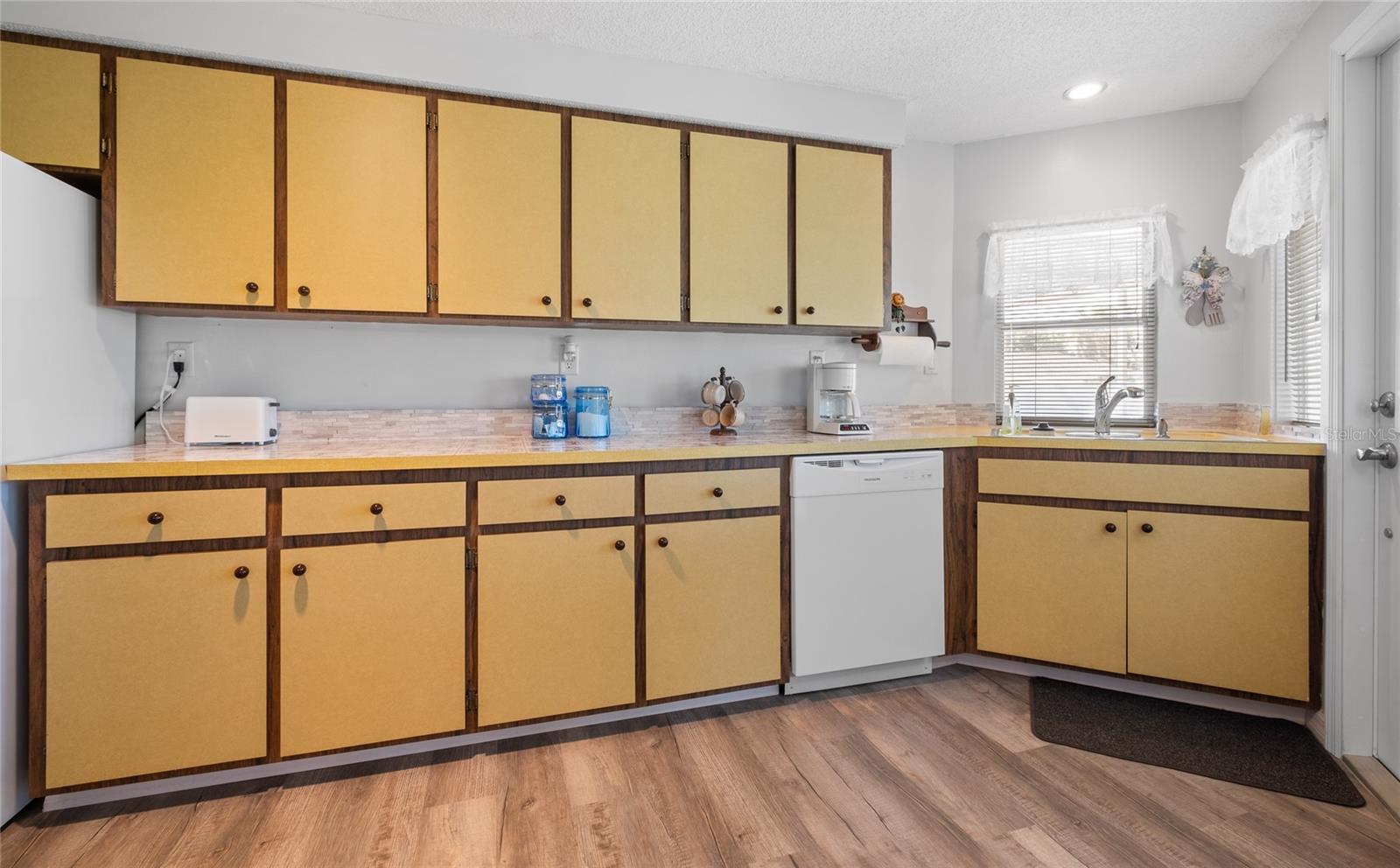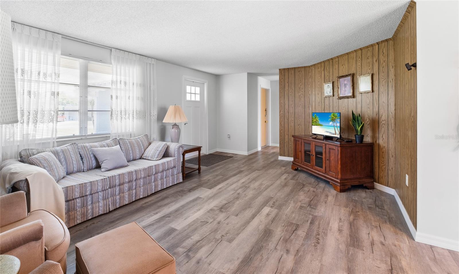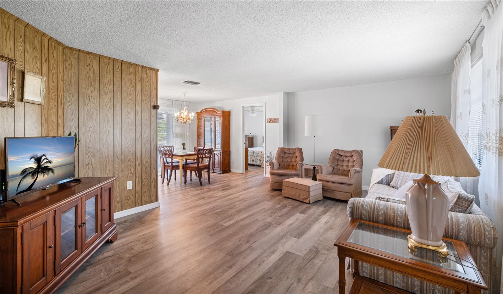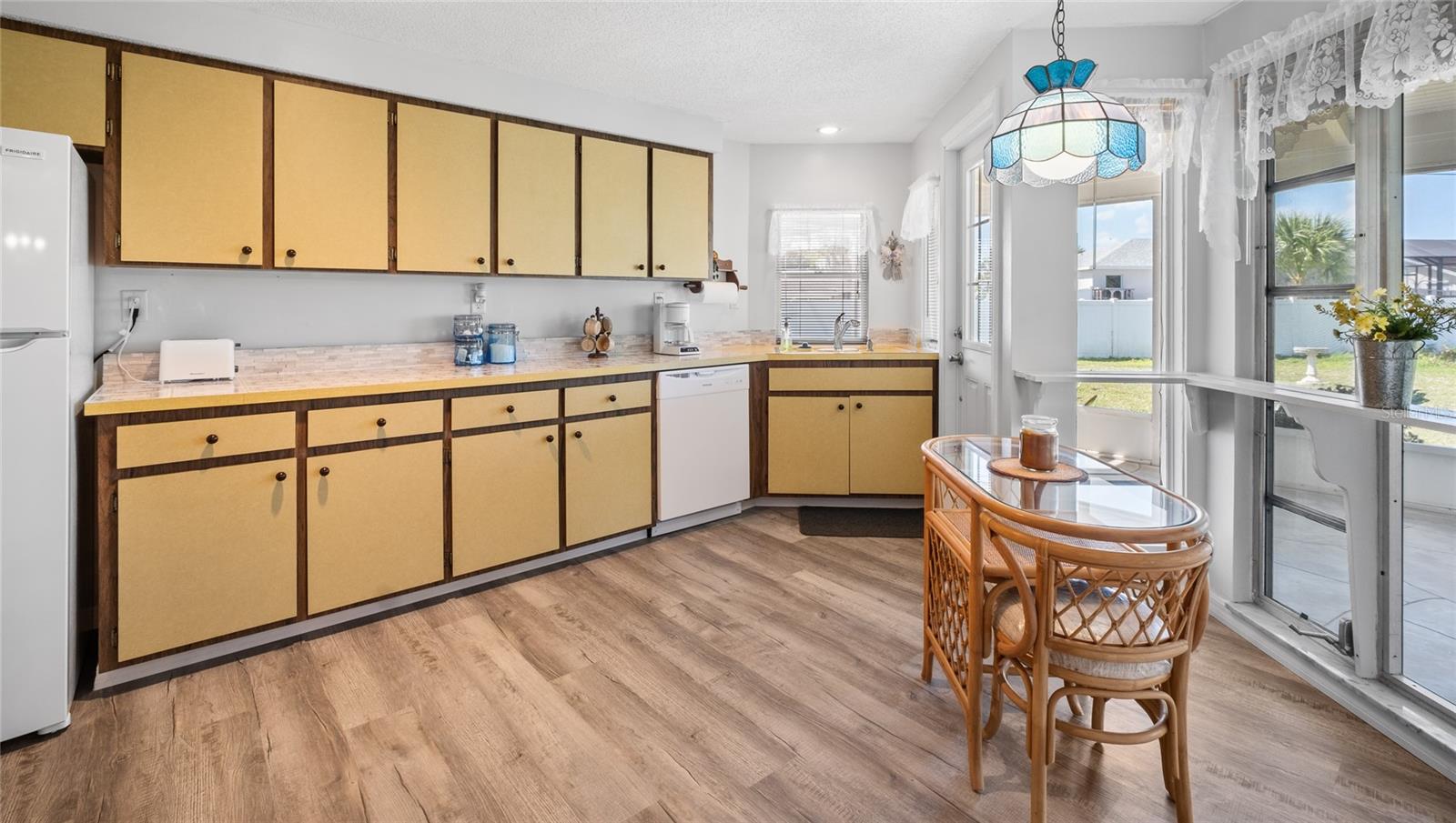 TURN Key ready to move in home. This lovely 2 bed, 2 bath home has it all. No need to lift a finger. The home sits on an oversized corner lot 0.37 of an acre. This home has been maintained to the highest degree and updated from everything from re-pipping, NEW AC, New Electric Panel for entire house, NEW faucets, NEW hot water heater, NEW toilets, NEW Electric BOX for AC, NEW exterior lights, 2 NEW high impact front door and kitchen door. Pocket doors throughout home. NEW laminate flooring throughout entire home and NEW baseboards. 2022 NEW Paint- exterior and interior, including closets. NEW GFI outlets installed in kitchen and bathrooms. 2022 garage floor painted, 2023 NEW dishwasher and NEW refrigerator installed. 2023 New high impact garage door installed. Furniture is included with exception to a few sentimental items. NO HOA. NO Deed Restrictions.
