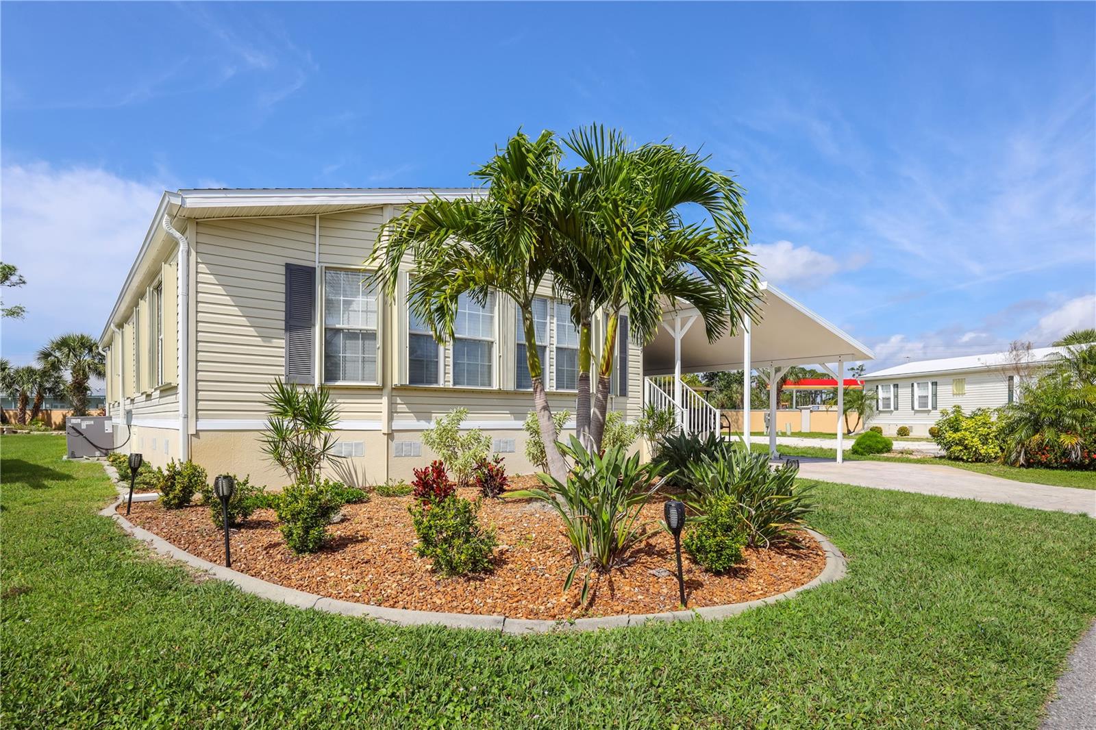 This fully furnished 2005 Jacobsen built home features numerous upgrades including complete kitchen remodel, perfect for culinary enthusiasts and entertaining guests with new appliance package, sleek stone countertops and ample cabinet space. New walk-in shower in guest bathroom. On the exterior, new roof and gutters June 2023, AC replaced July 2023, upgraded accordion storm shutters installed 2023, Washer/Dryer replaced in 2020. The new landscaping adds to the curb appeal and creates a welcoming atmosphere. Wide driveway for additional vehicles and guests visiting with their golf carts. As an added bonus, 228sq ft of the carport has been screened, ideal for outdoor entertaining and an extension to your living space. Wait until you see the the spacious 240 sq ft shed for your workshop, craft room or storage. Shed can also double as a golf cart garage during the summer months. Exit out of the back shed doors and you can enjoy the afternoon sun while lounging on the open air patio. Sold furnished as shown, no golf cart. ***Be sure to check out the 3D virtual tour and walk-through video links*** Home price includes certificate. Maple Leaf is a popular resident owned 55+ gated golf course community with an active resort lifestyle. Features an award winning 18 hole, par 62 golf course, 5 tennis courts, bocce ball, lawn bowling, 2 shuffleboard courts, 4 heated swimming pools, 2 hot tubs, fitness facility, woodworking facility, 75+ clubs/activities, 4 pickleball courts, restaurants, tiki hut/bar and much more. It is true what they say, it's all about the lifestyle in Maple Leaf!