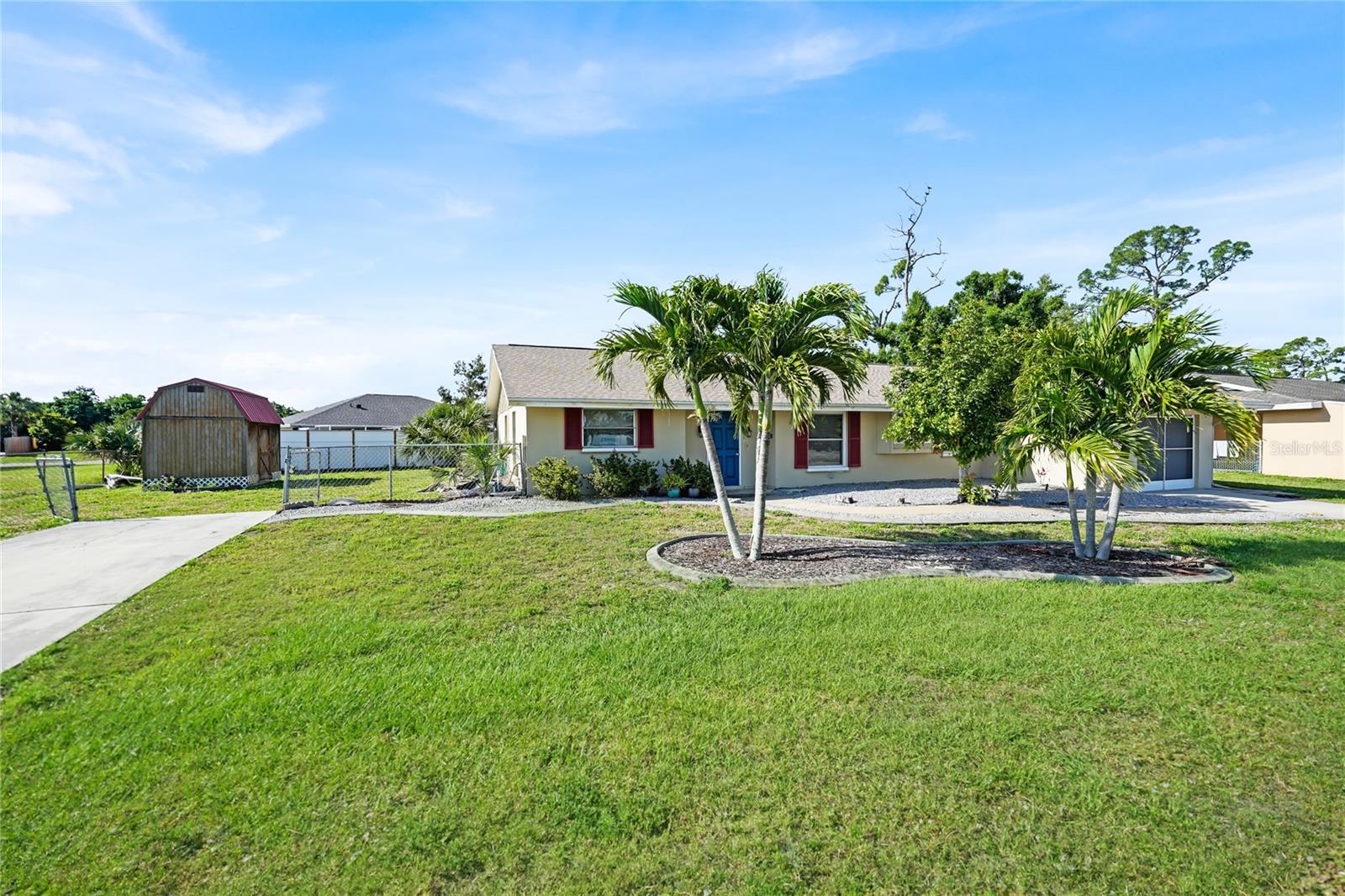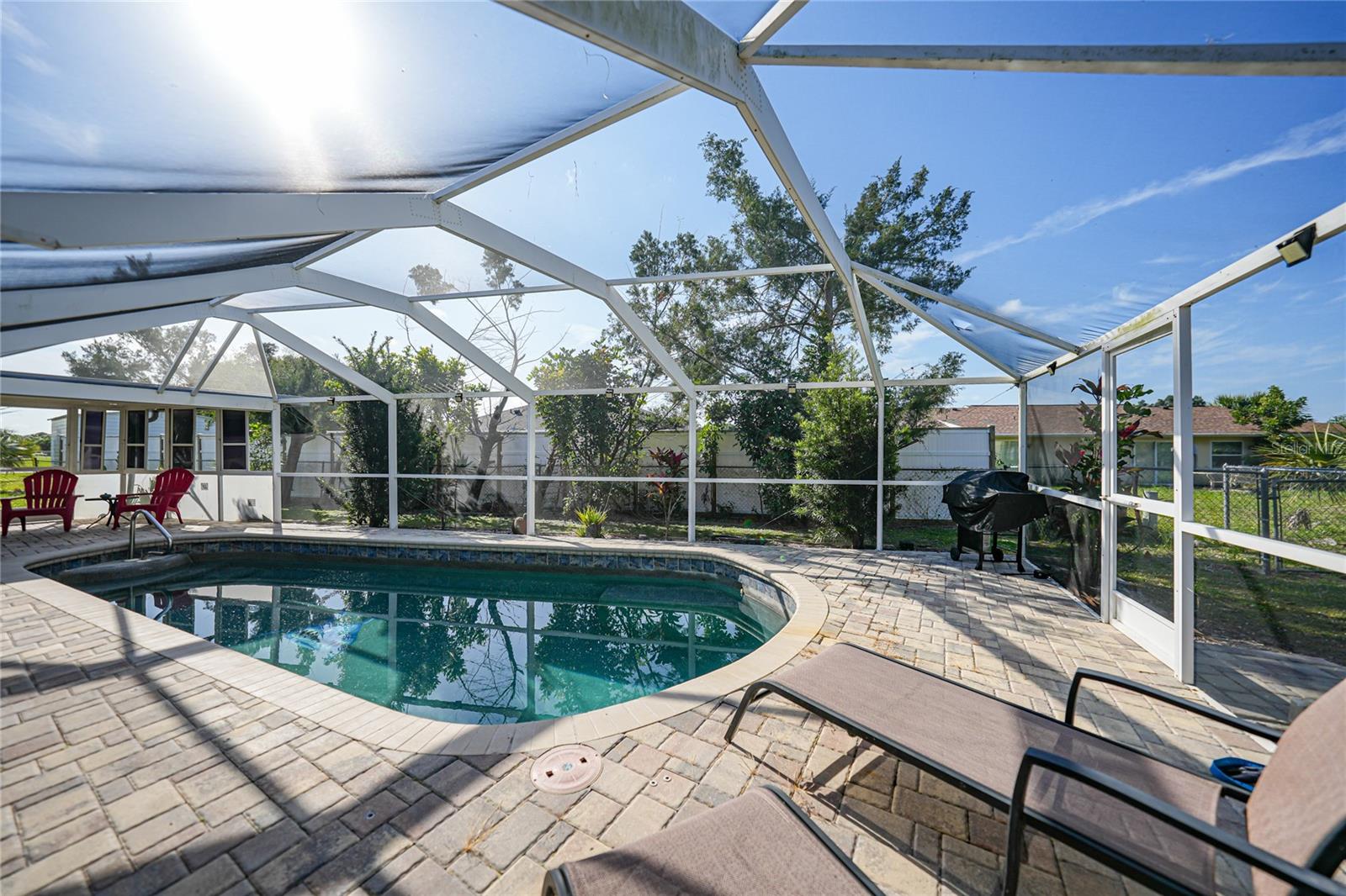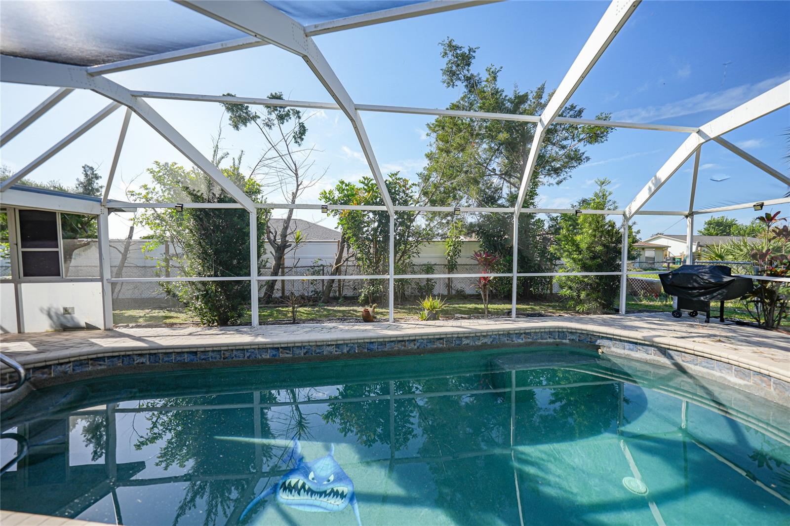 Perfect opportunity to own this nicely updated 3-bedroom, 2-bathroom, heated pool home located in the heart of Port Charlotte. This charming single-family home has 1,888 square feet of living space with an attached garage and oversized fenced-in yard. As you enter, you'll immediately notice the meticulous updates throughout. The open floorplan enhances the home's spacious feel, with a bright main living area with built-in shelving and luxury vinyl flooring. The living room seamlessly flows into a large sunroom with four sets of sliders that open offering panoramic views of the pool lanai. This versatile space is perfect for hosting gatherings or simply enjoying the Florida sunshine year-round. The kitchen has been tastefully renovated with shaker cabinets, sleek granite countertops, and top-of-the-line stainless steel appliances, creating a modern and inviting space to prepare meals and gather with loved ones. The master suite offers a serene oasis, complete with a spacious walk-in closet plush carpeting and a private bath, ensuring a tranquil retreat from the hustle and bustle of daily life. Positioned separately from the primary suite are two guest bedrooms that share a full bath and provide privacy and comfort. Step outside to discover your own private paradise. The pool area is an entertainer's delight, featuring a fully screened enclosure, elegant paver surroundings, pool is heated/saltwater and a charming, covered area for outdoor dining or relaxation. Whether you're hosting a barbecue with friends or lounging by the pool with a good book, this space is sure to impress. The fenced, oversized side yard provides additional versatility and convenience, with an extra driveway and a convenient storage shed for all your outdoor equipment and toys. With no deed restrictions or HOA fees, you have the freedom to customize the property to suit your lifestyle and preferences. Updates including the A/C and water heater in 2016, along with a new roof and pool heater in 2021, offer peace of mind and ensure years of comfort and enjoyment. Schedule your showing today and make this your forever home! PLEASE ENJOY THE ATTACHED INTERACTIVE 3D TOUR!