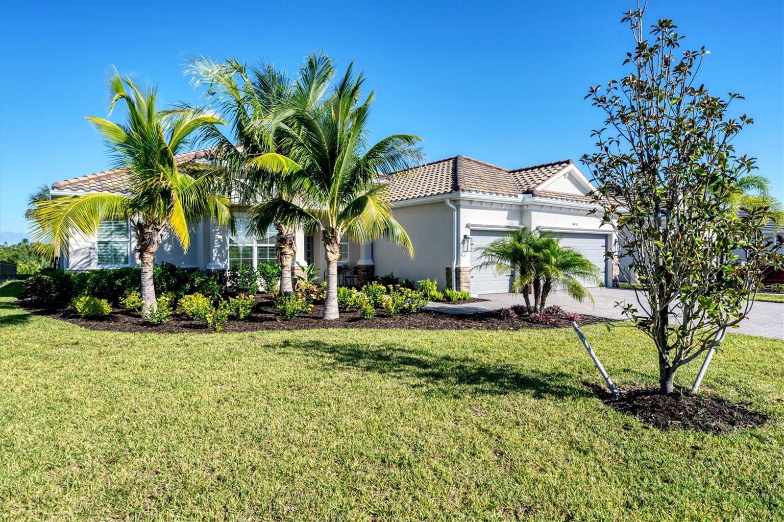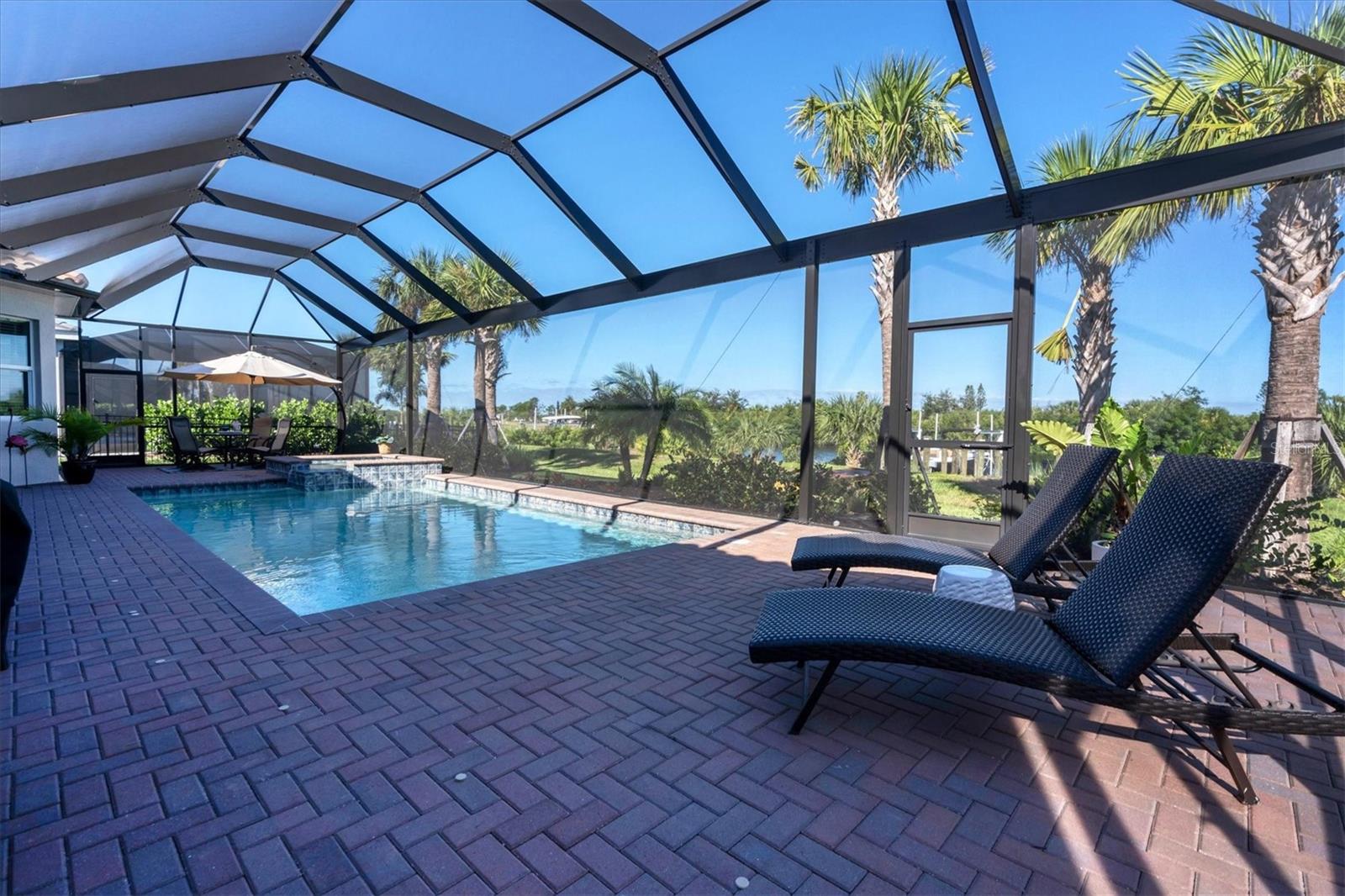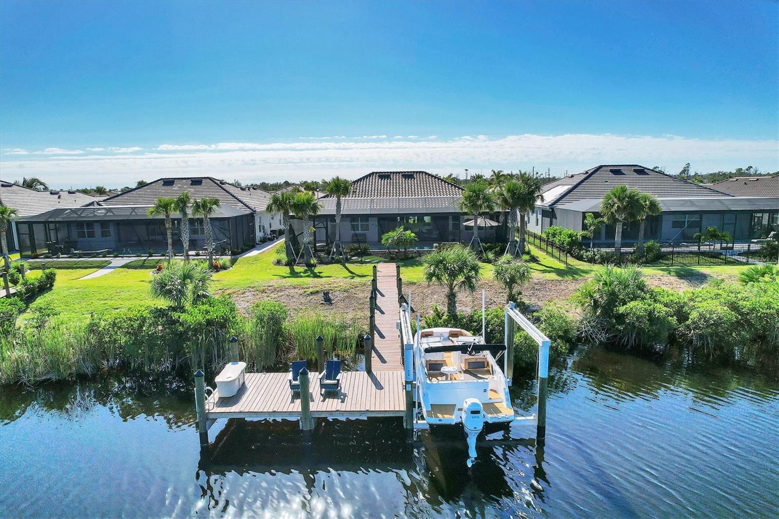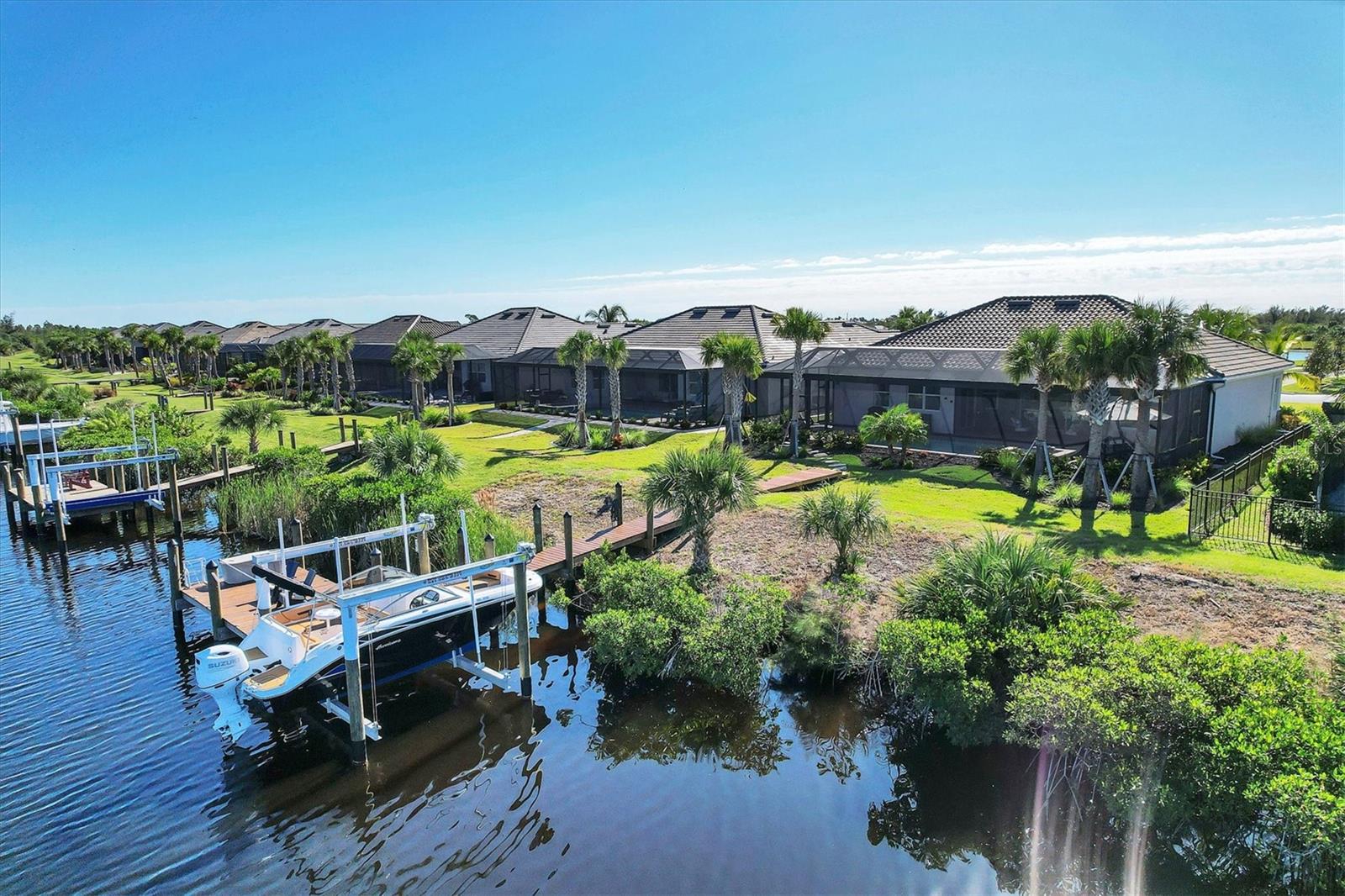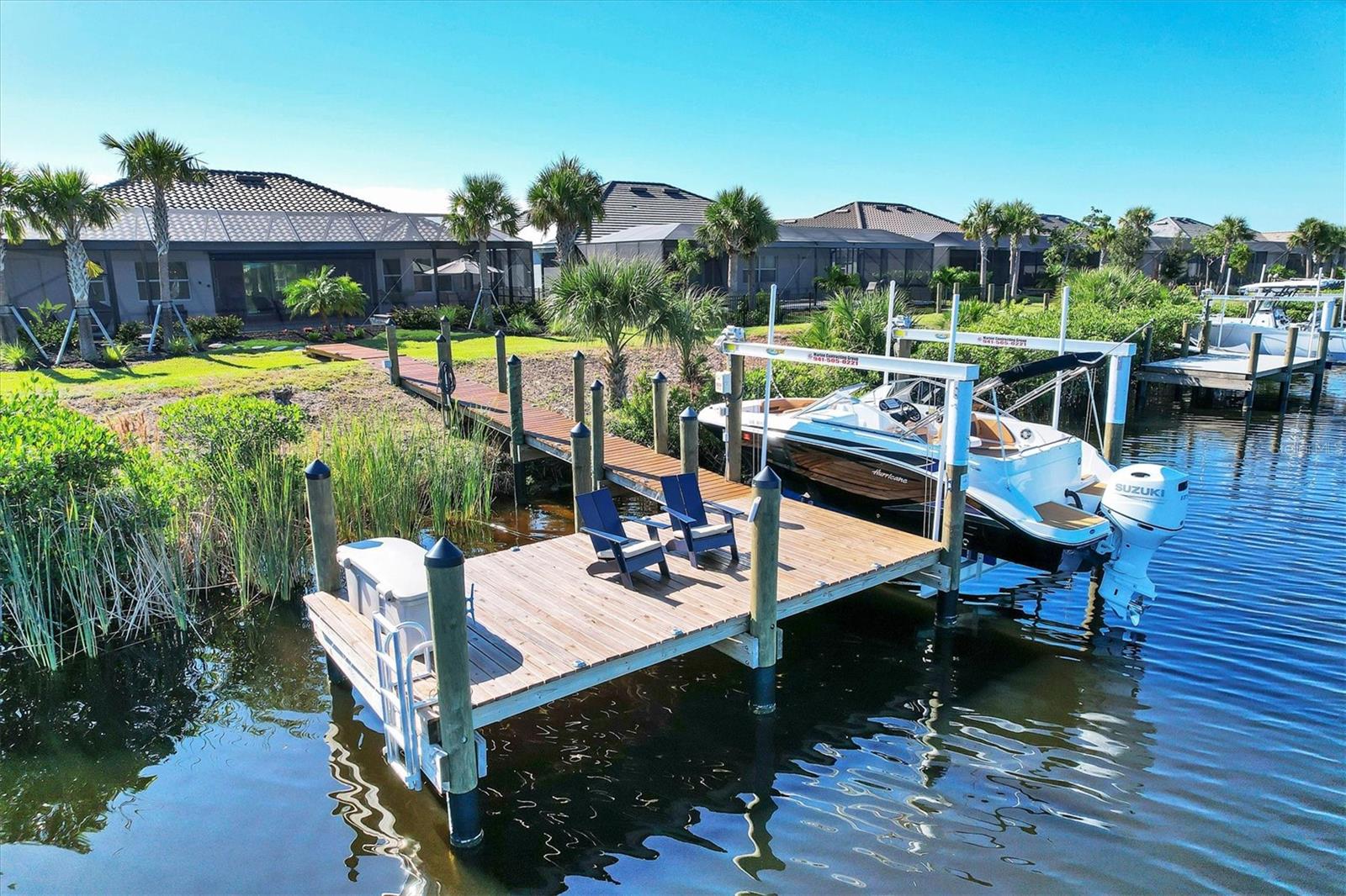 Dreaming of escaping to the Sunshine State? This is your chance to live the ultimate Florida lifestyle. This stunning three-bedroom, two-and-a-half bath, three-car garage, WATERFRONT home is nestled in the exclusive, deed-restricted, and gated community of Harbor West. Enjoy maintenance-free living in a community just minutes from the pristine waters of Southwest Florida, perfect for boating, fishing, and soaking up endless sunshine. For your peace of mind, this Oakmont II model boasts HURRICANE-RATED IMPACT WINDOWS. Entertain effortlessly in the spacious open-concept, split floor plan, featuring an oversized kitchen island, cozy breakfast nook, and an elegant dining room. Step outside to your brick-paved, enclosed oasis with a heated, saltwater pool and spa, perfectly positioned to provide stunning waterfront views. A HURRICANE-RATED SHUTTER on the lanai offers extra protection and convenience, making it effortless to secure outdoor furnishings. Boat straight from your private dock to the open waters—no bridges to slow you down, offering boaters the ultimate convenience. The panoramic lanai not only provides easy access to a pool bath but also leads directly to your private boat lift and dock—perfect for fishing right at home. This home is packed with high-end upgrades, including elegant board and batten trim in the breakfast nook and on the oversized kitchen island. Wake up to breathtaking water views in the expansive owner's suite, a peaceful retreat that showcases the surrounding natural beauty. This 'Smart Home' is truly a must-see. Call today to schedule your private tour and experience all the natural beauty and luxury this waterfront property has to give.
