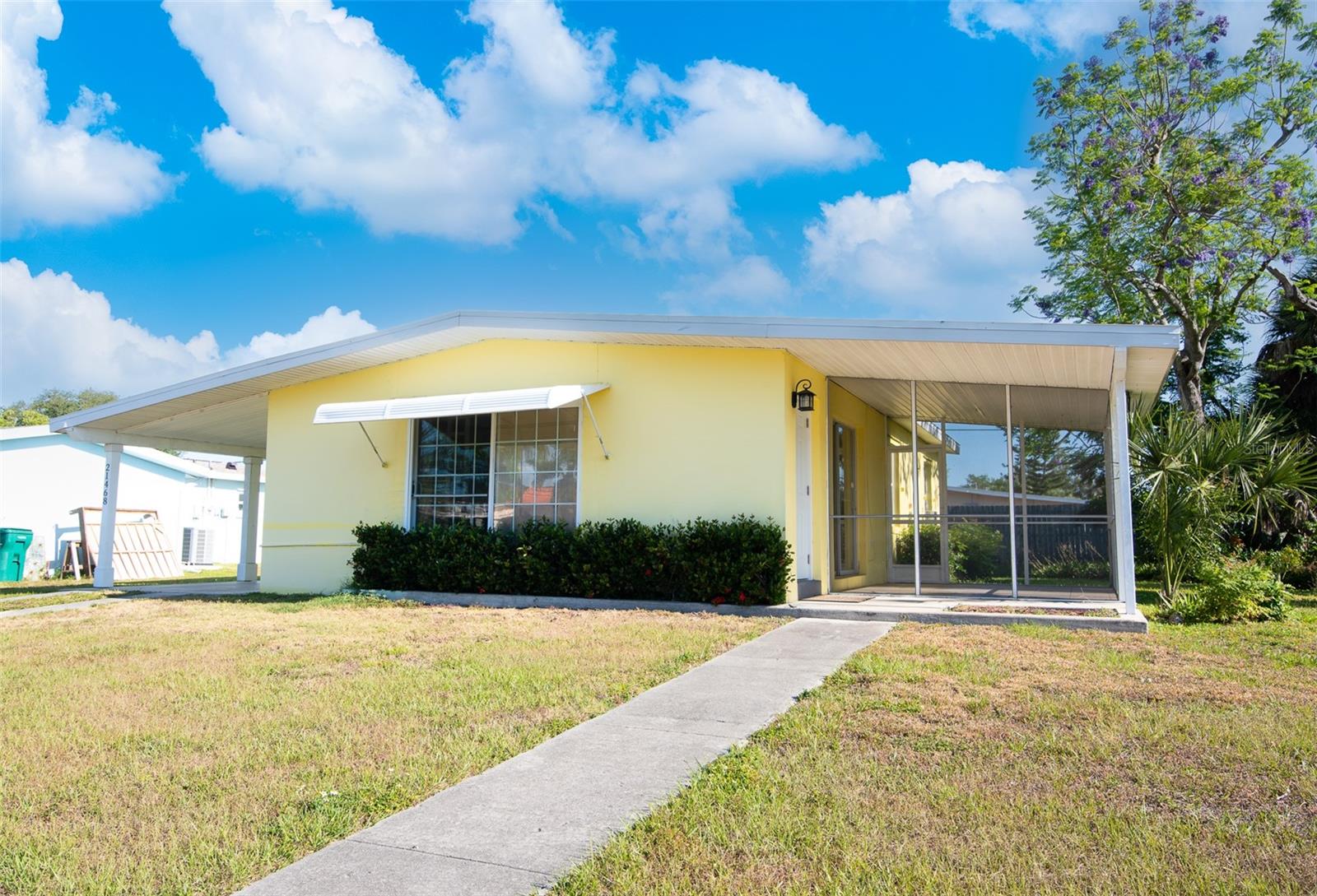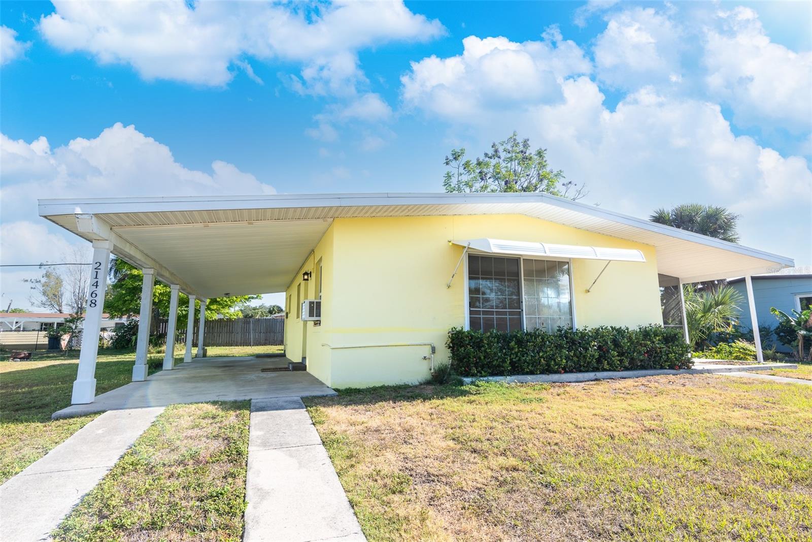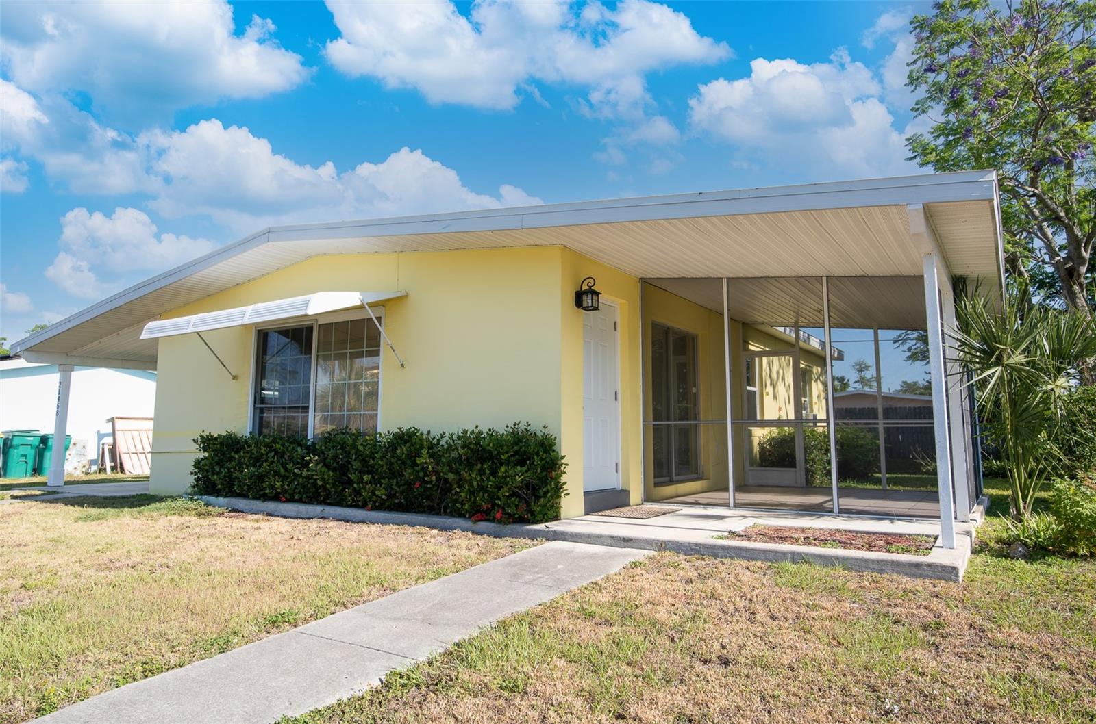 AFFORDABLE LIVING IN PORT CHARLOTTE, FL WITH NEW METAL ROOF INSTALLED (completed August, 2024). This is a perfect starter home or investment opportunity, as it’s move in ready and fully functional. This home has neutral paint and consistent tile throughout. All rooms are light and bright with plenty of windows. Located near the hospital, you will notice that as you drive up, this is a quiet, friendly neighborhood. Stay dry by parking in the extra-long carport (2 tandem cars or space for an extra outdoor seating area) and enter the home through the side door at the kitchen. Notice the stainless-steel modern refrigerator and over the range microwave. In addition to cabinetry for storage, there are extra pantry shelves. The kitchen is adjacent to the dining area / family room combo. The bright living area accesses the front door and screened lanai on the side of the home. Via the central hallway, you’ll find both bedrooms and a bathroom with natural light and tub/shower combo. The primary bedroom in the rear of the home offers two closets. In addition, there are shelves in the hallway for linen storage. Watch the little one play or have a backyard BBQ, as the neighboring property in the rear is fenced, offering you extra privacy. Featuring CITY WATER AND SEWER, plus NO HOA FEES. This conveniently located home is just a few minutes from hospitals, golf courses, stores, & restaurants; 10 minutes from beautiful downtown Punta Gorda; and 45 minutes to multiple Gulf Coast beaches. Southwest Florida features world-class fishing, boating, and water sports. The Port Charlotte area is easily accessible from the interstate and nearby regional airports in Punta Gorda, Sarasota, and Fort Myers. Schedule your private showing quickly, as this clean, move-in-ready home will not be on the market long.