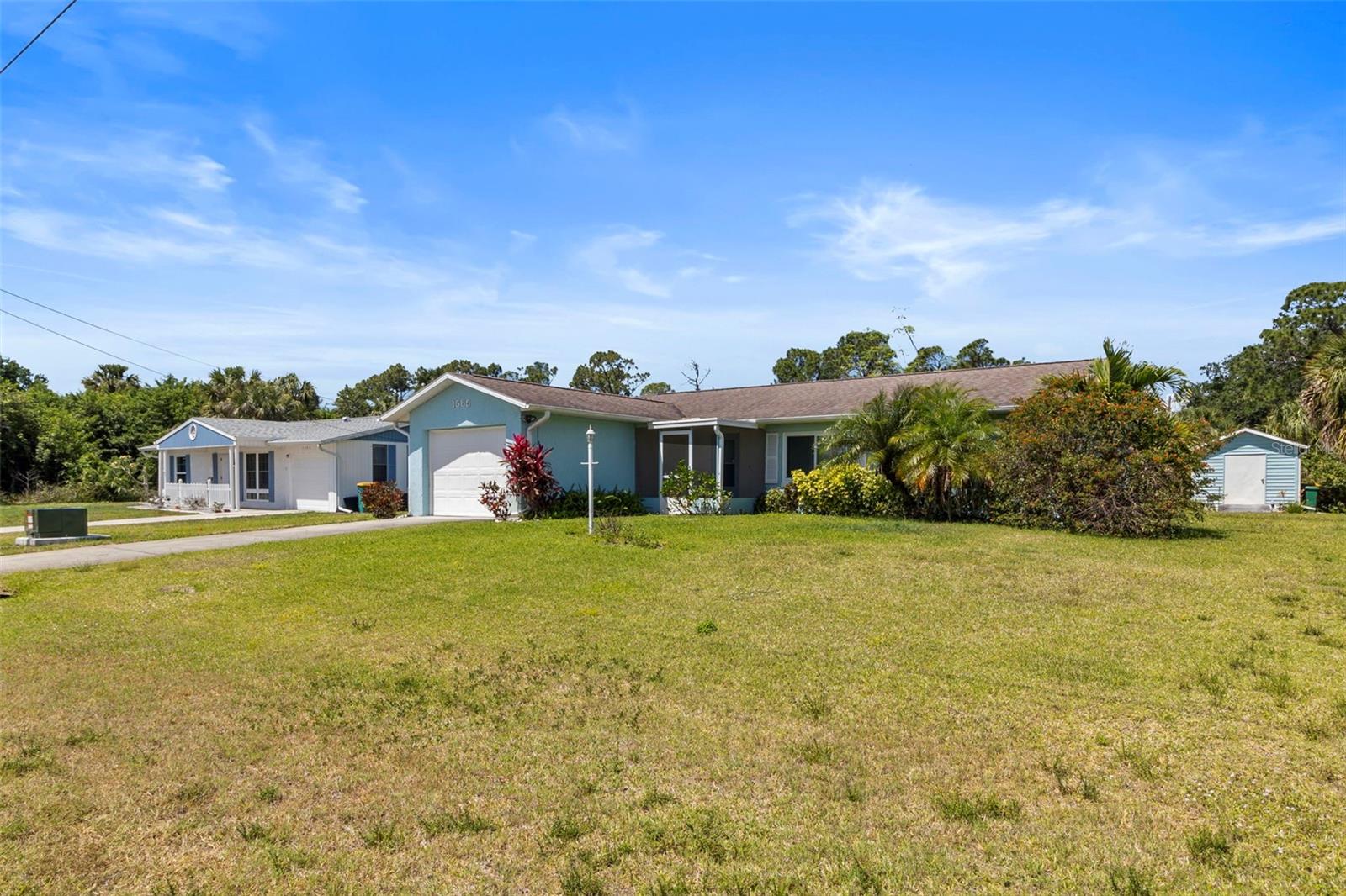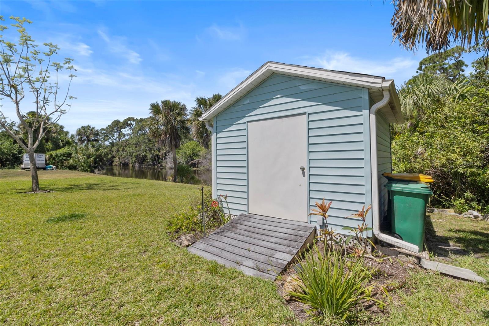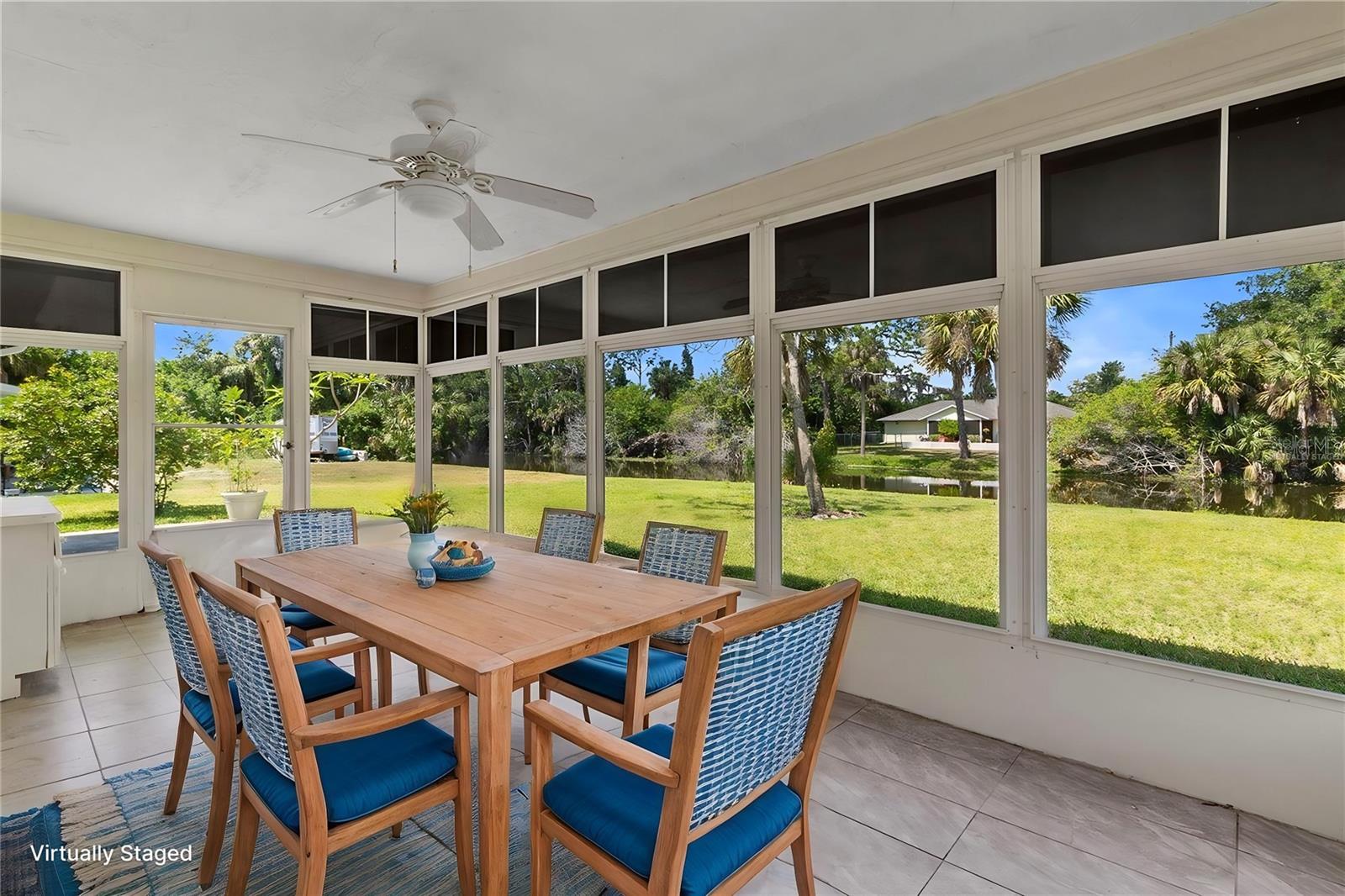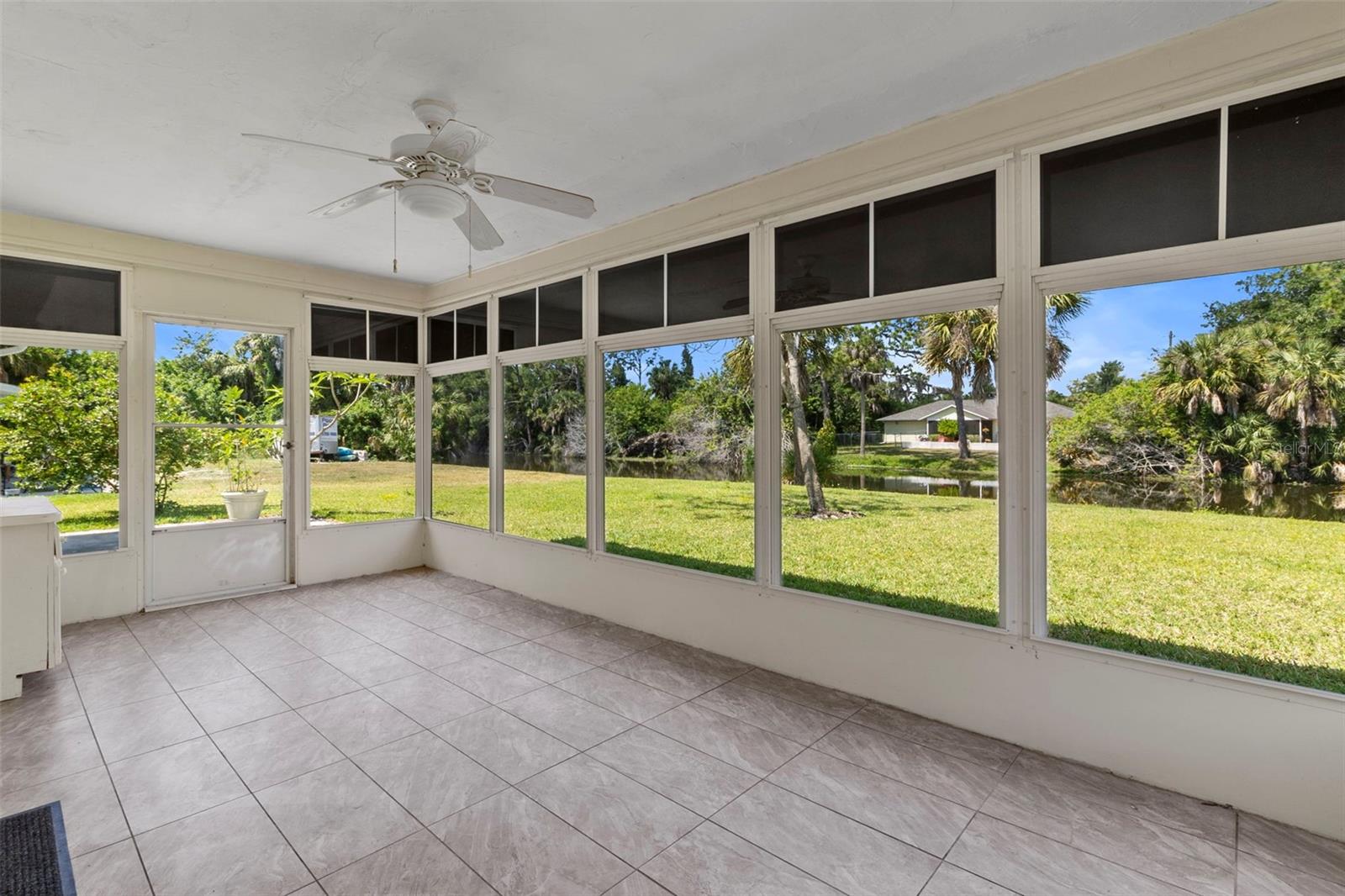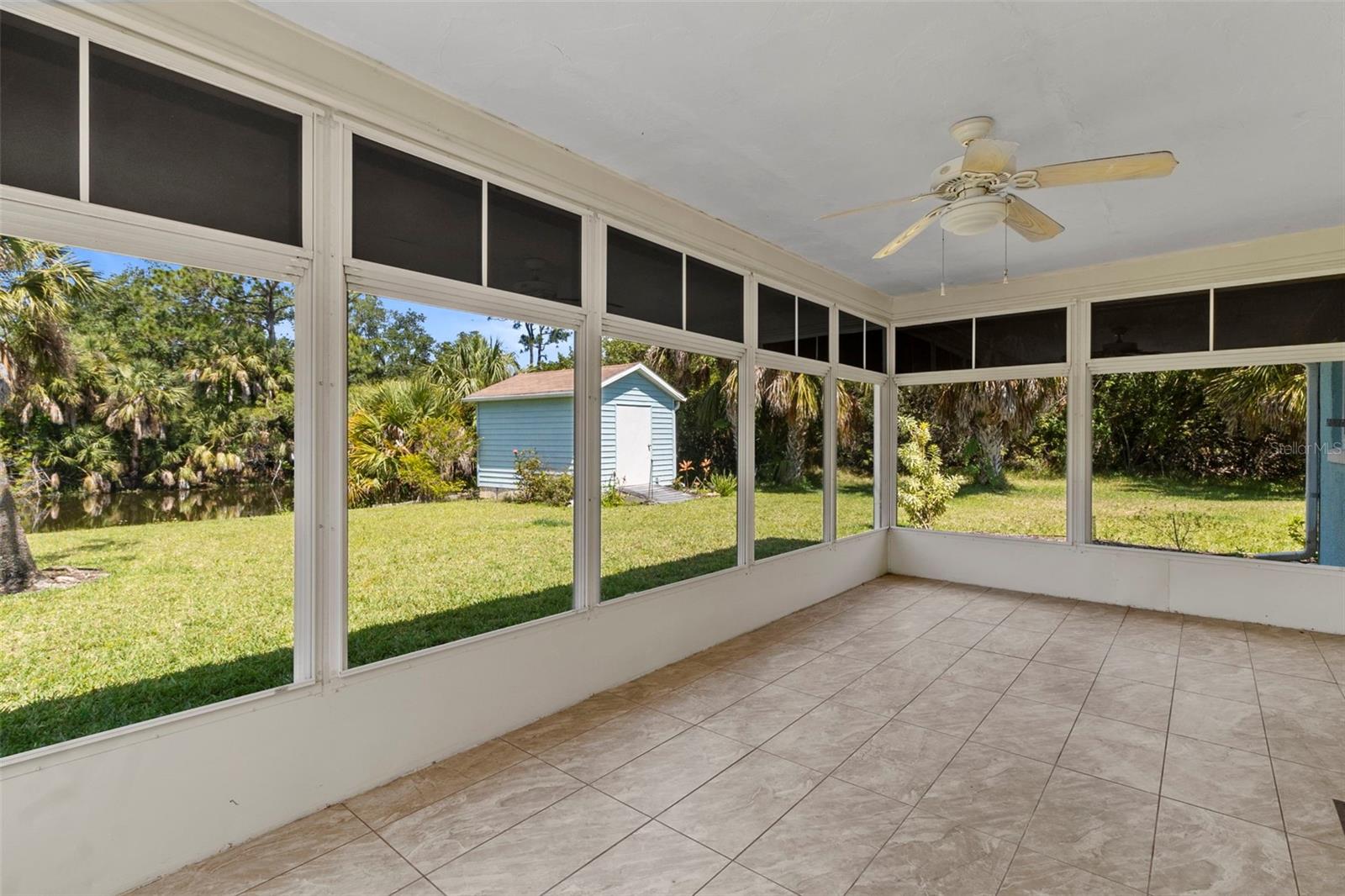 One or more photo(s) has been virtually staged. NO FLODD INSURANCE REQUIRED- X flood zone. Welcome to your waterfront retreat on the Elkham Waterway! This 2-bedroom, 2-bathroom home offers 1,039 square feet of thoughtfully designed living space. Inside, you'll find ceramic tile and wood-look vinyl flooring throughout, combining style with practicality. The kitchen is well-appointed with plenty of counter and cabinet space, along with essential appliances, including a microwave, range, refrigerator, and dishwasher. Ceiling fans in every room help keep the home cool and comfortable. Recent updates include IMPACT WINDOWS for added security and energy efficiency, a NEWER ROOF (2017), and an HVAC SYSTEM (2019). MOTORIZED SHADES and blinds on every window allow for easy control of light and privacy. Step outside to the expansive screened-in patio, where you can unwind and savor the peaceful canal views. Whether you're enjoying your morning coffee or relaxing after a long day, this outdoor space offers the perfect setting to take in the serene surroundings. A RENOVATED SHED provides extra storage space for your outdoor gear. The lawn SPRINKLER SYSTEM uses canal water to keep your yard lush and green while saving on water bills—an added bonus for this waterfront home. Situated in a quiet Port Charlotte neighborhood, this home is close to Neil Armstrong Elementary, local restaurants, medical facilities, shopping, and downtown Punta Gorda. The Punta Gorda Airport is also just a short drive away for added convenience. Don’t miss your chance to see this waterfront home—schedule your showing today! For a full video tour, check out Facebook at Findingtreasurerealtor.