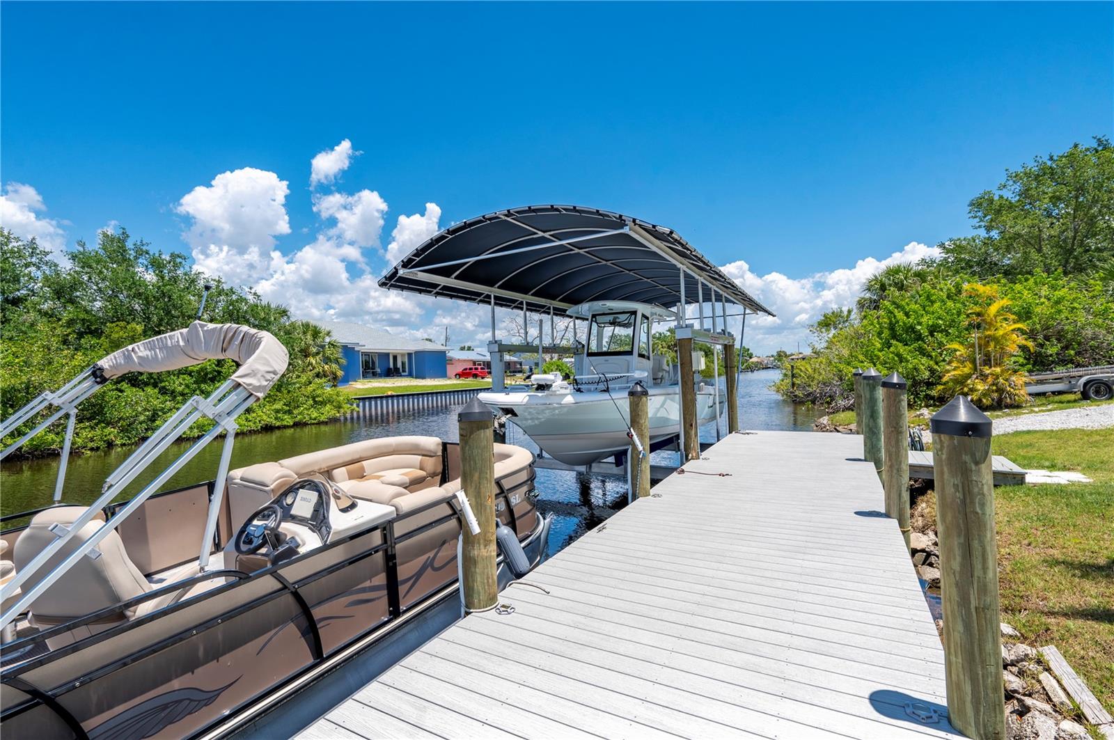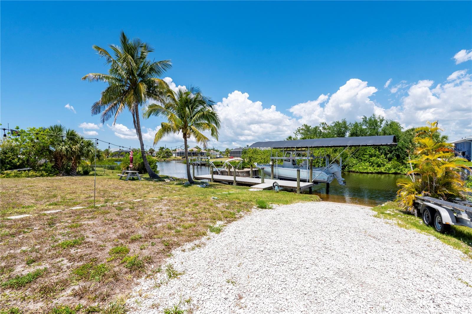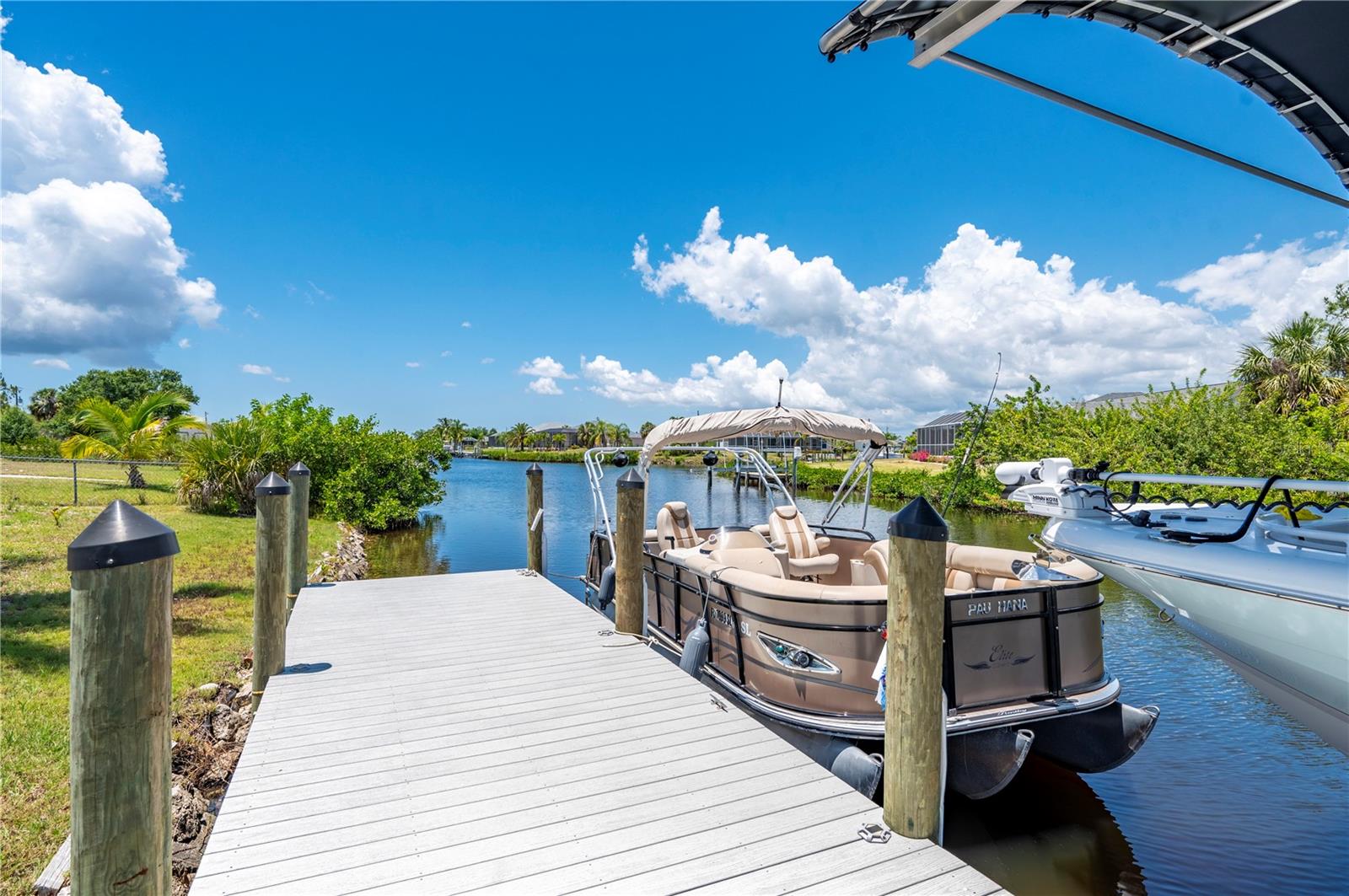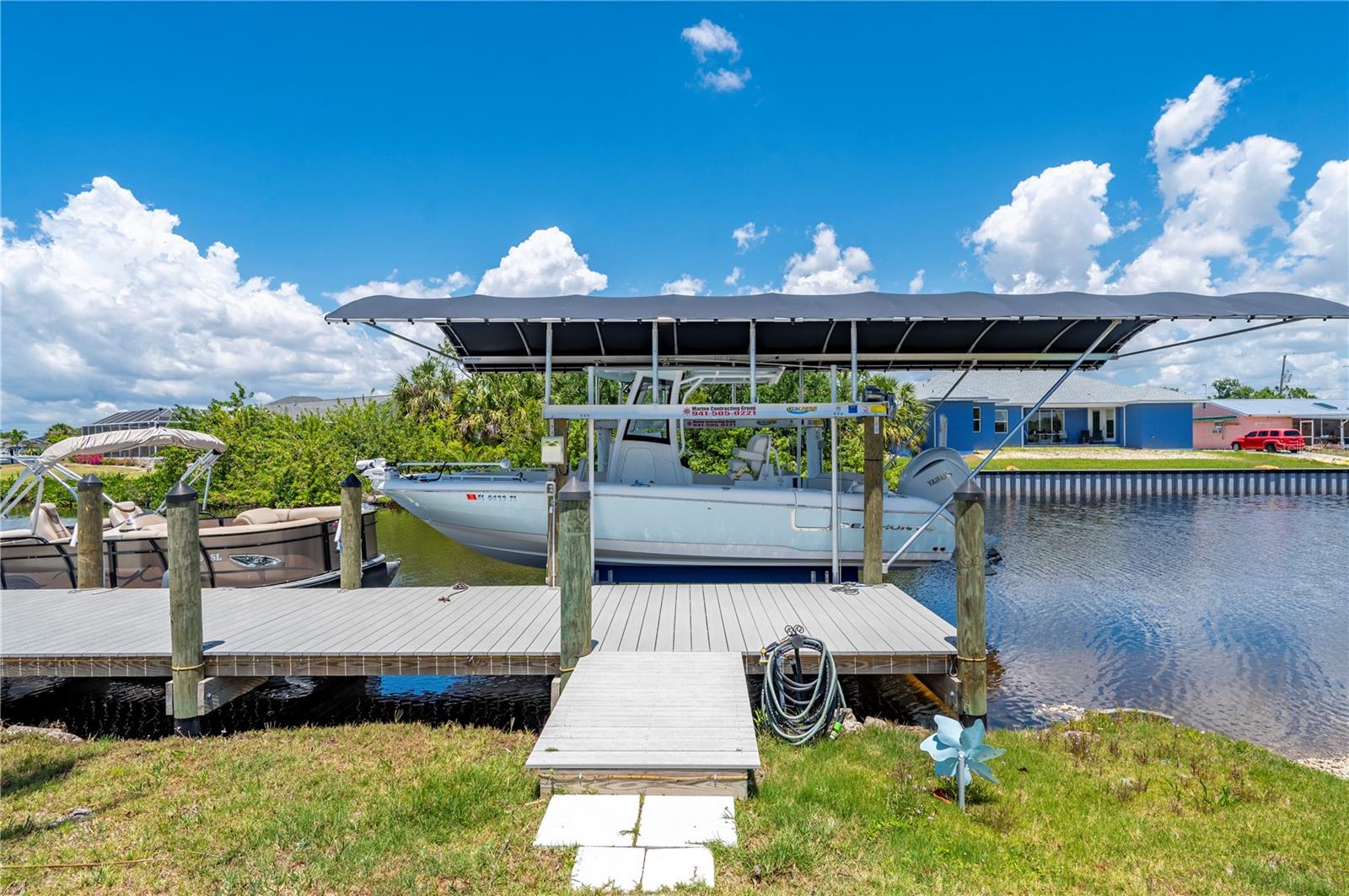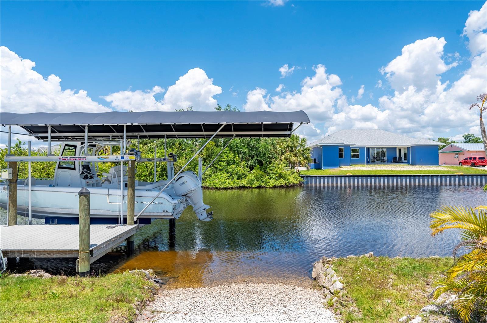 Welcome to your slice of waterfront paradise in Port Charlotte! This charming home boasts 118 feet of waterfront bliss, complete with a 40-foot composite dock and an 10,000-pound boat lift, making it a boater's dream come true. Say goodbye to those fixed bridges as you enjoy easy access to open waters via the saltwater canal right from your backyard. You'll love the peace of mind provided by the new roof installed in 2022. Step inside to discover a spacious interior featuring a delightful mix of tile and laminate flooring throughout. Need a space to work or unwind? The bonus room is perfect for a den or home office set up. The kitchen is a chef's delight with tile countertops, custom wood cabinets, and crown molding adding a touch of elegance. The primary bathroom boasts a walk-in shower for a touch of convenience. Outside, enjoy your own private boat ramp and riprap along with an oversized lot offering plenty of room for outdoor activities. This home comes furnished Turn key, so you can start off right away. Located just minutes from local amenities and downtown Punta Gorda, this property offers the best of both worlds – a serene retreat with easy access to the vibrant coastal lifestyle. Whether you're into fishing, boating, or simply soaking up the sun, this is the ultimate haven for your waterfront dreams.