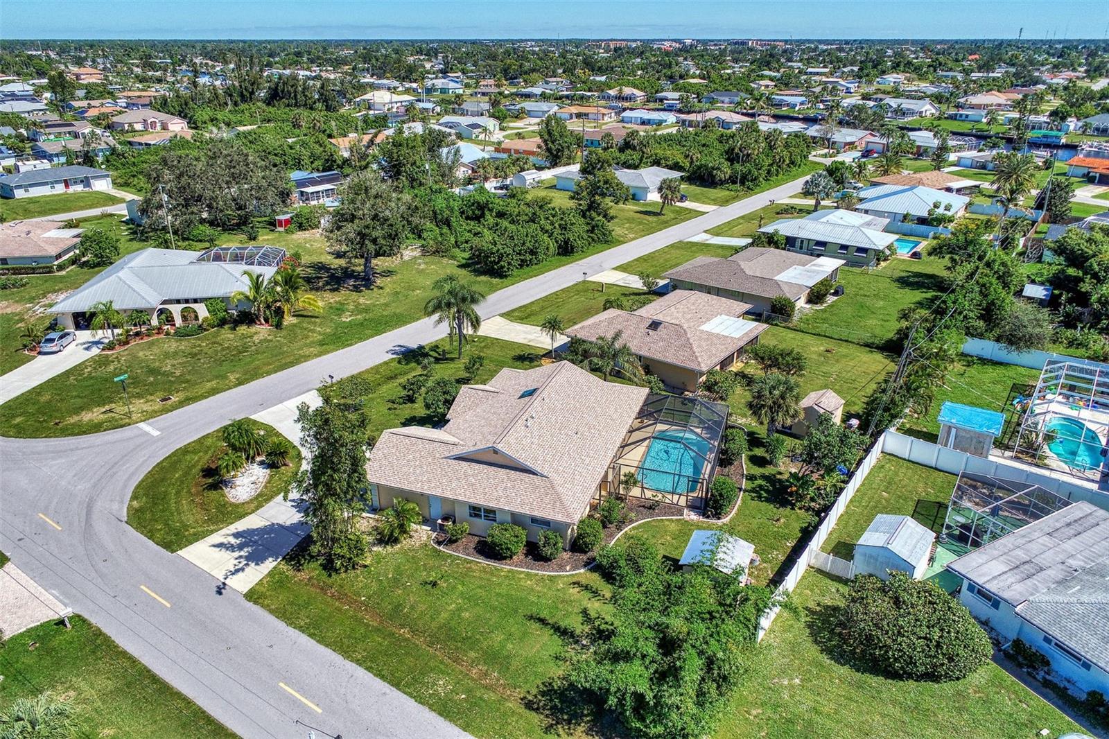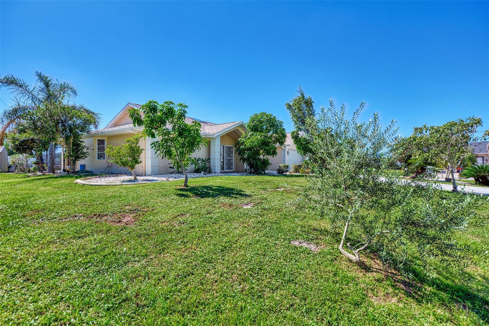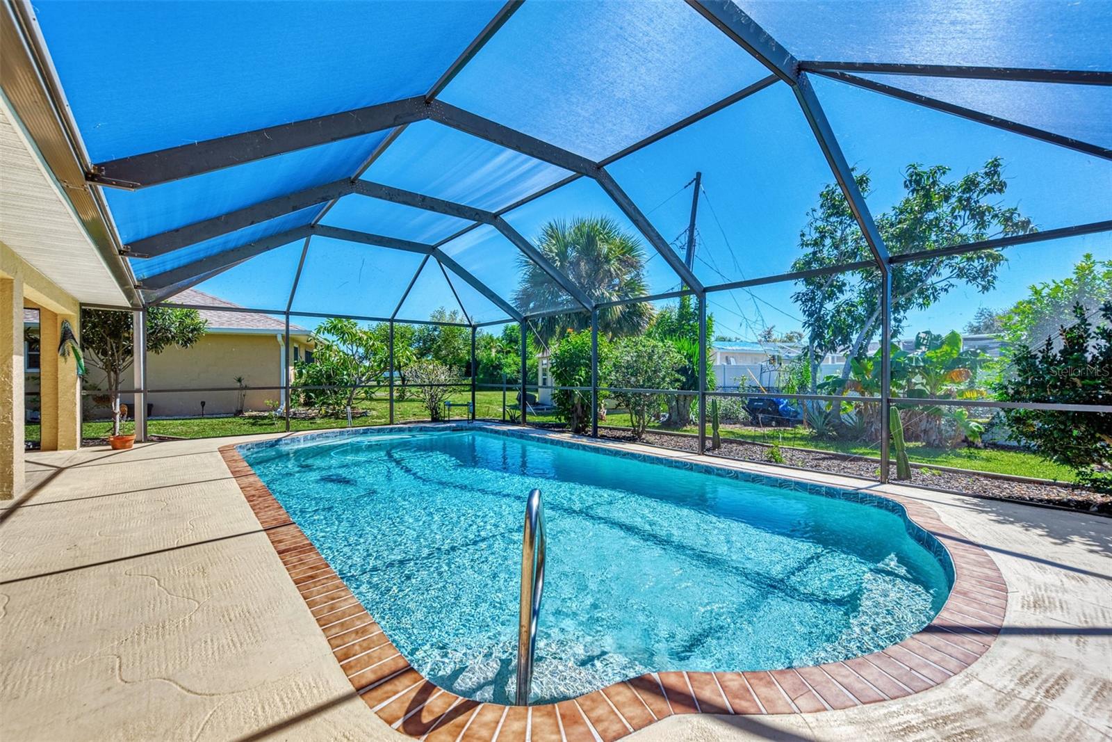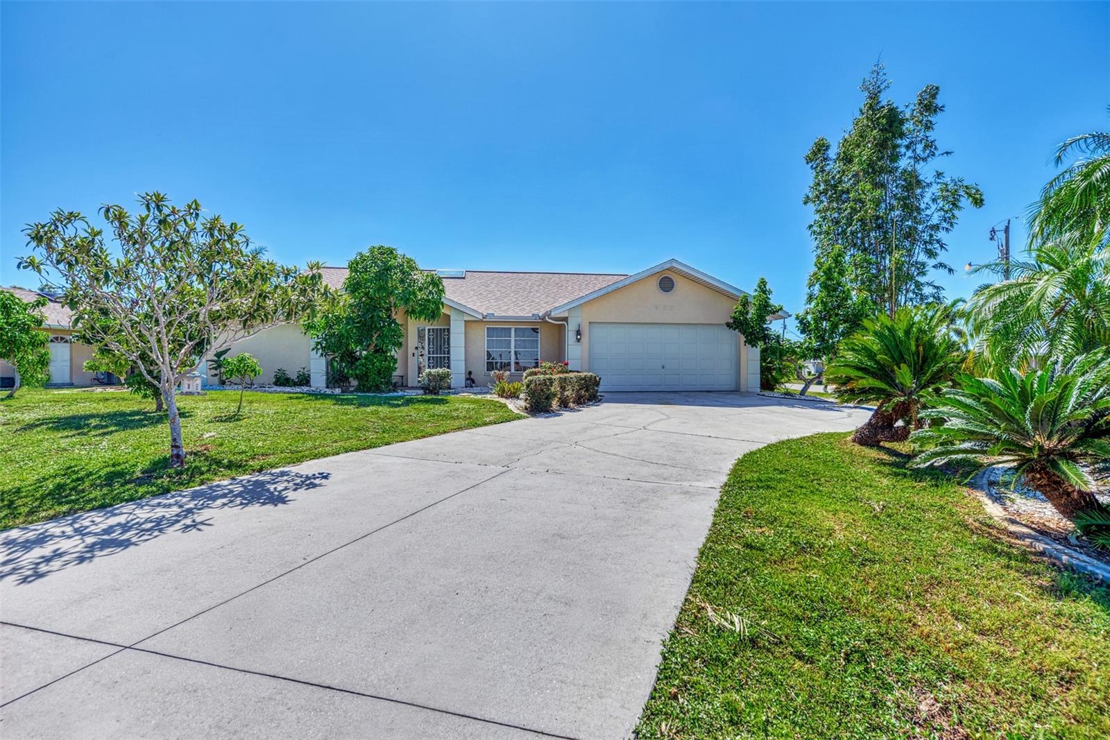 Convenient, yet very quiet Port Charlotte location! How about a 3-bedroom, 2-bathroom home with a new roof on a spacious corner lot to consider for your perfect Florida oasis! A circular driveway adds convenience, while the open floor plan with vaulted ceilings and skylights creates a bright and inviting atmosphere for everyday life, or relaxing with family and friends. The kitchen is open to the dining room and pool area, and features quartz countertops, ample cabinetry, and space for preparing delicious meals. The bedrooms are separated, with the secondary bedrooms having partial views of Spring Lake. The primary bedroom comes complete with a spacious bathroom, dual closets, a large vanity, and access to the lanai. The large lanai area offers a sparkling 15’x30’ pool, which was recently refinished. The landscaping features fruit trees and shade trees to provide comfort and some nice fruit snacks while enjoying the Florida weather! The nearby beaches are just a short drive away, and for boating enthusiasts, the community boat ramp is just minutes from your doorstep. Fruit trees: 4 Mango, 4 Banana, 2 Loquat, 2 Surinam Cherry, and 1 of each of the following: Olive, Avocado, Lychee, Korean Bamboo, Chinese Bamboo, Sugar Apple and Pineapple.