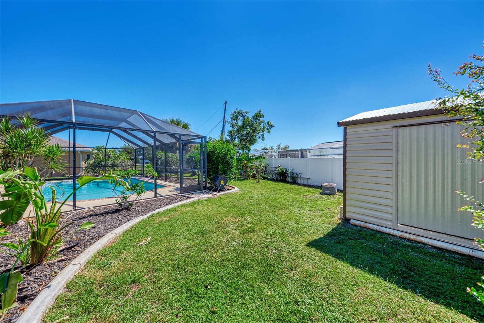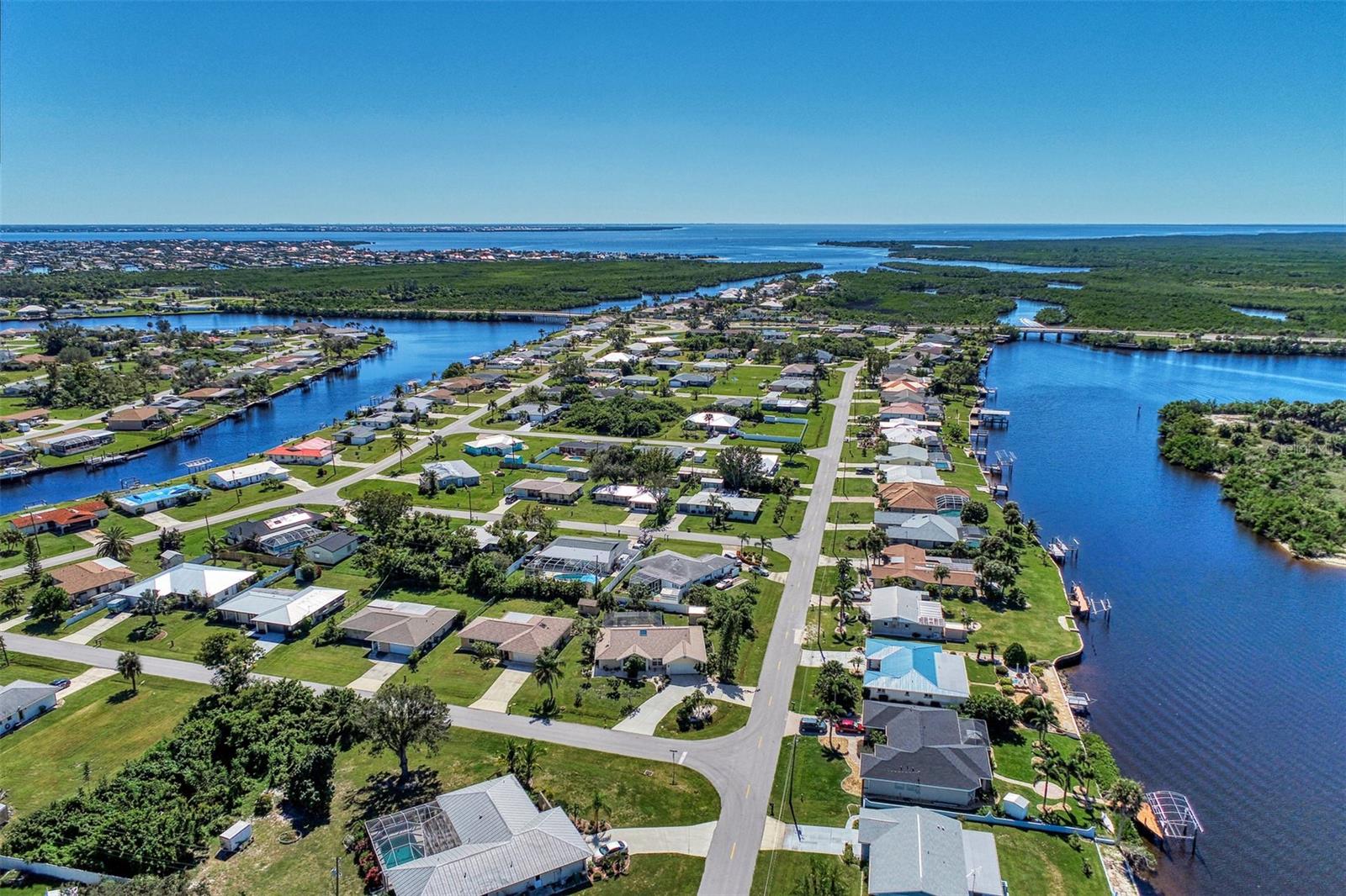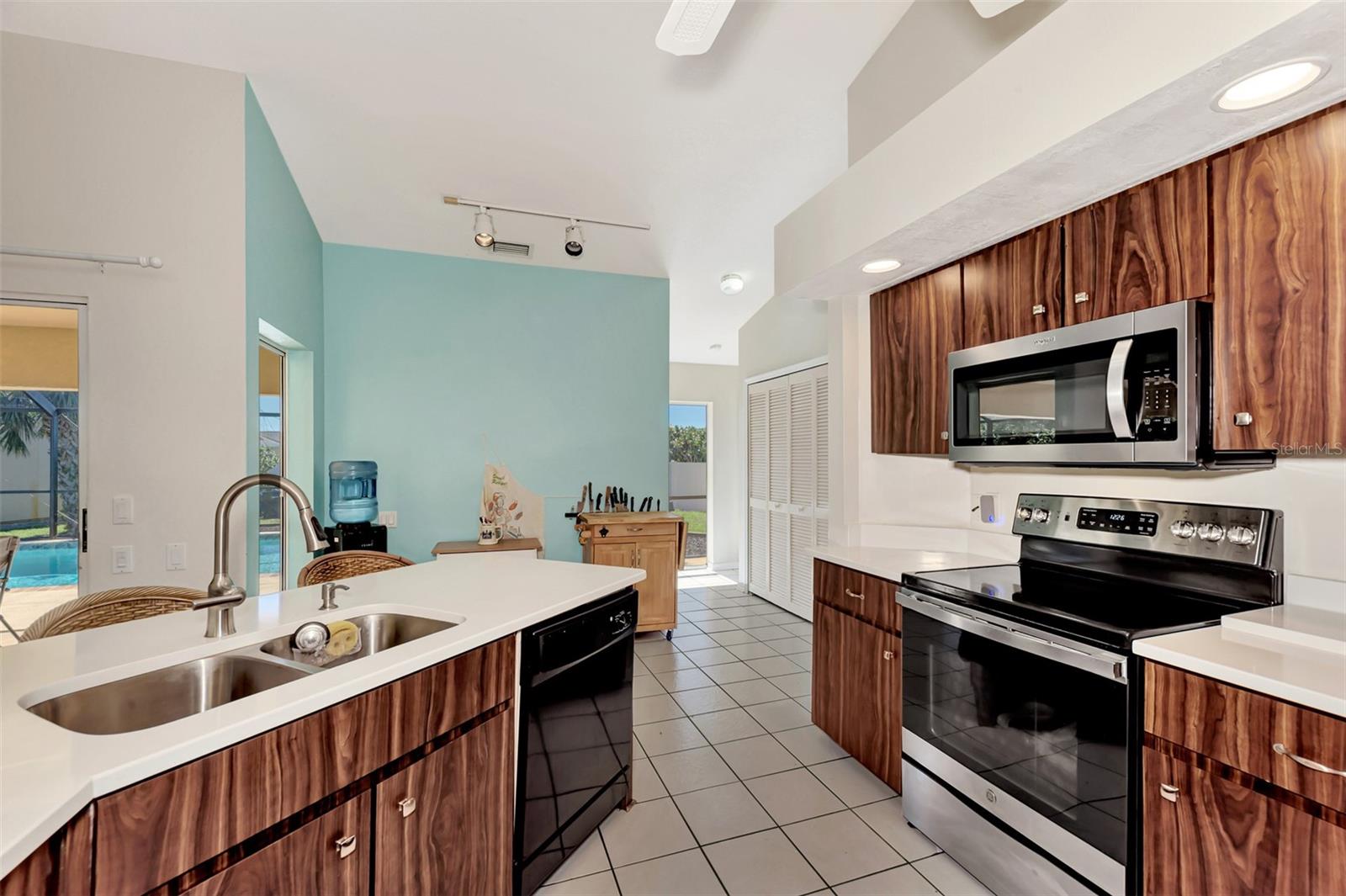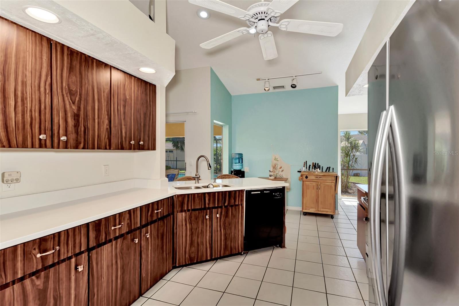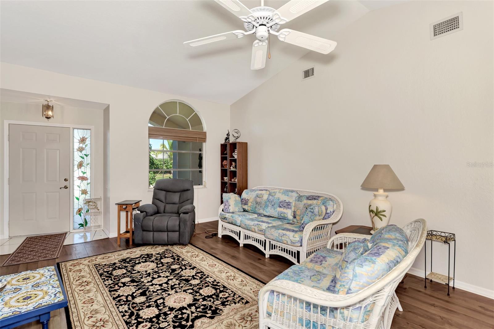 Convenient, yet very quiet Port Charlotte location! How about a 3-bedroom, 2-bathroom home with a new roof on a spacious corner lot to consider for your perfect Florida oasis! A circular driveway adds convenience, while the open floor plan with vaulted ceilings and skylights creates a bright and inviting atmosphere for everyday life, or relaxing with family and friends. The kitchen is open to the dining room and pool area, and features quartz countertops, ample cabinetry, and space for preparing delicious meals. The bedrooms are separated, with the secondary bedrooms having partial views of Spring Lake. The primary bedroom comes complete with a spacious bathroom, dual closets, a large vanity, and access to the lanai. The large lanai area offers a sparkling 15’x30’ pool, which was recently refinished. The landscaping features fruit trees and shade trees to provide comfort and some nice fruit snacks while enjoying the Florida weather! The nearby beaches are just a short drive away, and for boating enthusiasts, the community boat ramp is just minutes from your doorstep. Fruit trees: 4 Mango, 4 Banana, 2 Loquat, 2 Surinam Cherry, and 1 of each of the following: Olive, Avocado, Lychee, Korean Bamboo, Chinese Bamboo, Sugar Apple and Pineapple.