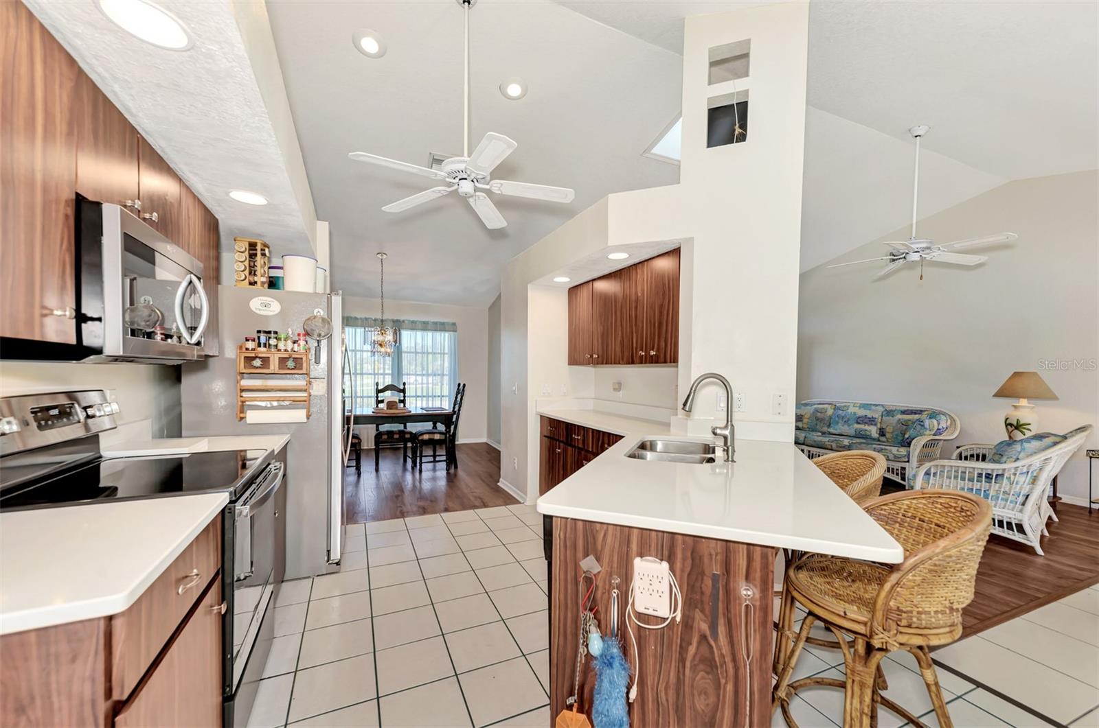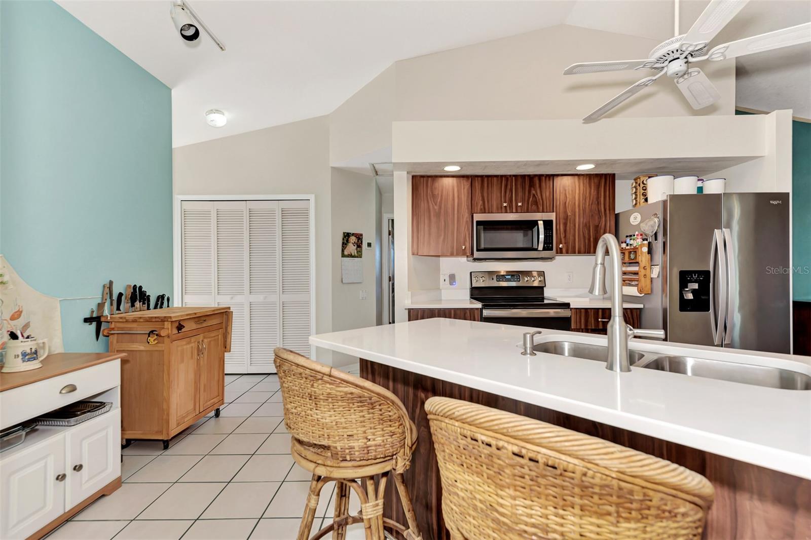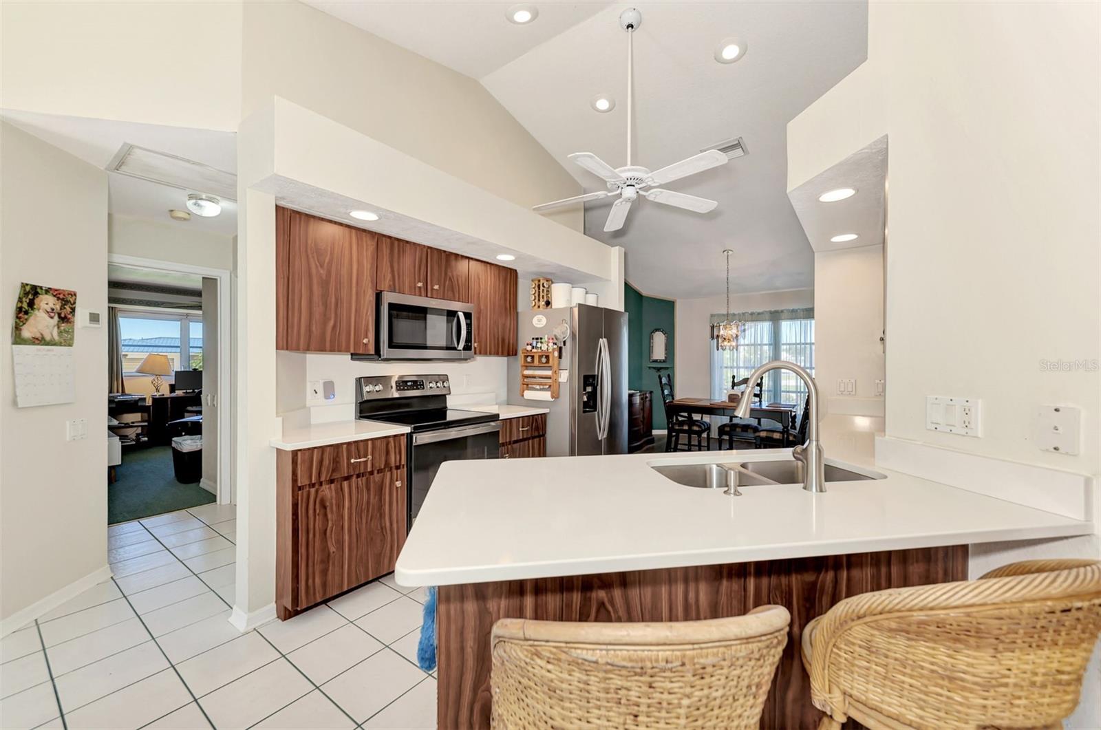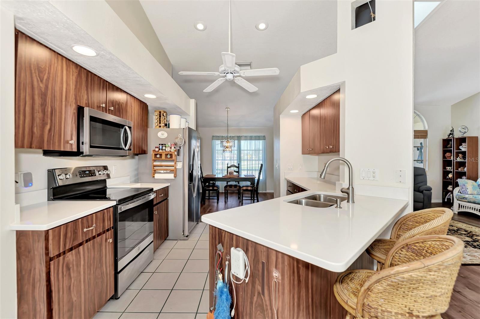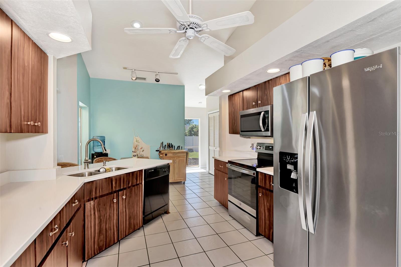 Convenient, yet very quiet Port Charlotte location! How about a 3-bedroom, 2-bathroom home with a new roof on a spacious corner lot to consider for your perfect Florida oasis! A circular driveway adds convenience, while the open floor plan with vaulted ceilings and skylights creates a bright and inviting atmosphere for everyday life, or relaxing with family and friends. The kitchen is open to the dining room and pool area, and features quartz countertops, ample cabinetry, and space for preparing delicious meals. The bedrooms are separated, with the secondary bedrooms having partial views of Spring Lake. The primary bedroom comes complete with a spacious bathroom, dual closets, a large vanity, and access to the lanai. The large lanai area offers a sparkling 15’x30’ pool, which was recently refinished. The landscaping features fruit trees and shade trees to provide comfort and some nice fruit snacks while enjoying the Florida weather! The nearby beaches are just a short drive away, and for boating enthusiasts, the community boat ramp is just minutes from your doorstep. Fruit trees: 4 Mango, 4 Banana, 2 Loquat, 2 Surinam Cherry, and 1 of each of the following: Olive, Avocado, Lychee, Korean Bamboo, Chinese Bamboo, Sugar Apple and Pineapple.
