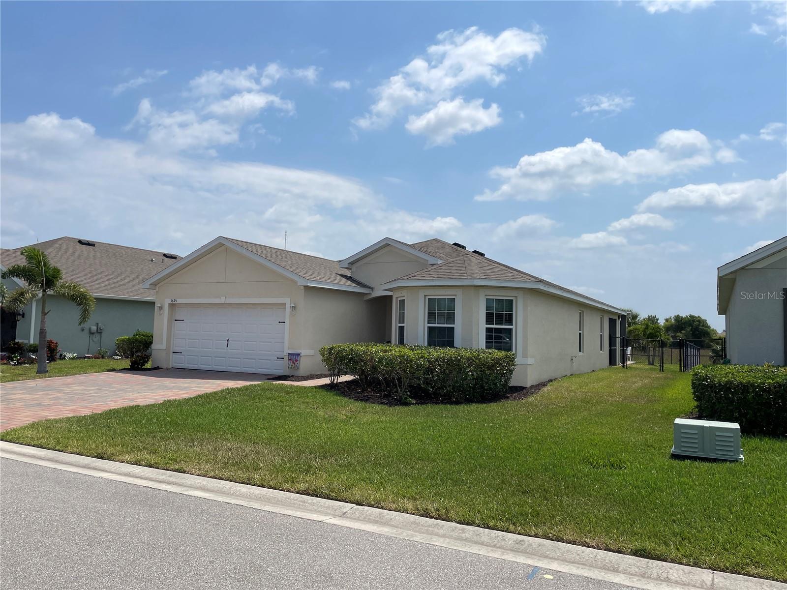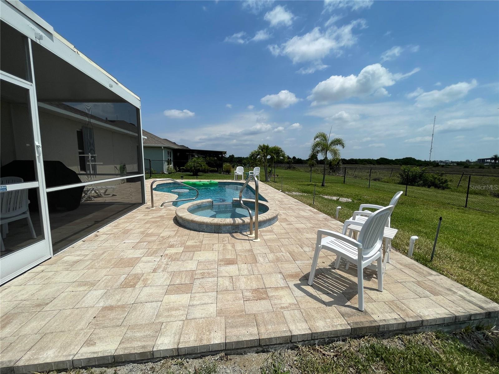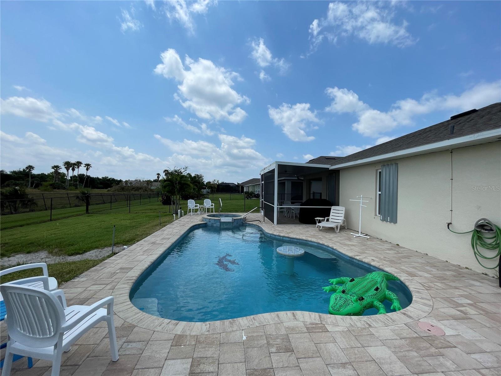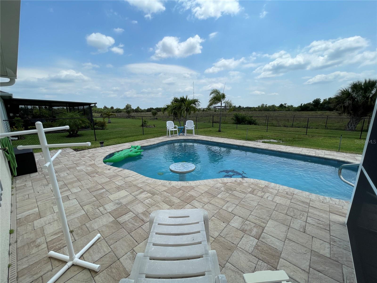 Unique Pool home in a GATED COMMUNITY! This beautiful 2019 built, 1758sf, 3/2/2 home with a private salt water pool and spa is ready for you! Come see this lovely home nestled in the friendly gated community of River Club. Many of the homes in the community have reassigned to an X flood zone (no flood insurance is needed for this home). There is a paver walkway and extra wide. This light bright home offers an open/split floor plan. The large kitchen has white cabinets and appliances, a large cabinet was added for additional storage along with a pantry. The Dinette has a bay window that looks out to the front yard making this space light and bright with natural light. The Great room has space for casual dining near the pass through window from the kitchen. The pass through window creates great flow from one room to the next. The french doors take you to the outdoor living area. The pool is 16x24. The lanai/pool paver deck is 20x40. The covered lanai is screened and the yard is fenced. The backyard view is an open field facing east. What a lovely way to start your day...Sitting on your lanai enjoying a beverage watching the sun rise. The spacious master bedroom is located in the back of the home and has a walk-in closet. The master bathroom has a walk-in shower and a double bowl vanity with a medicine cabinet. The 2nd, 3rd bedroom and guest bathroom are located near the front of the home. The guest bathroom has a tub/shower, medicine cabinet and a linen closet. There is an additional closet in the hall just outside of the bathroom. You access the garage through the inside laundry room. The flooring in the home is tile with the exception of the bedrooms; they have carpet. The twin beds in the guest bedroom convey with the home. The community offers a pool, fitness room, and children's playground. Along with cable TV and internet, the HOA fee's include maintaining the lawns, bushes, and mulch beds throughout the community. You can travel and not worry about the working being done. Centrally located to shopping, restaurants', local activities, I75, main roads taking you neighboring areas that offer everything from antiquing, equestrian, small town life, boating, fishing, beaches, pickleball, golfing, state parks, the list goes on.... Come see this lovely home and see what this community has to offer!