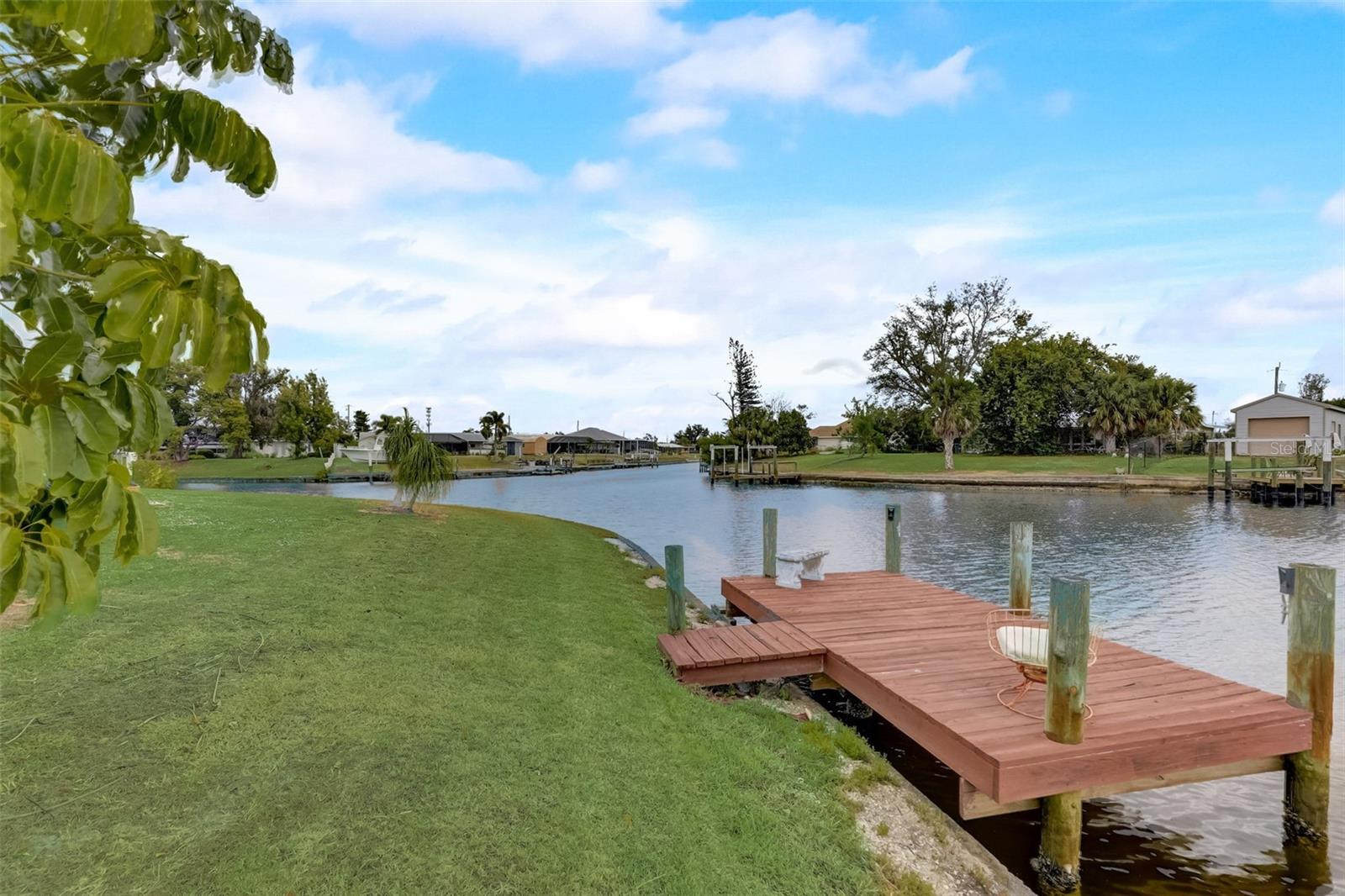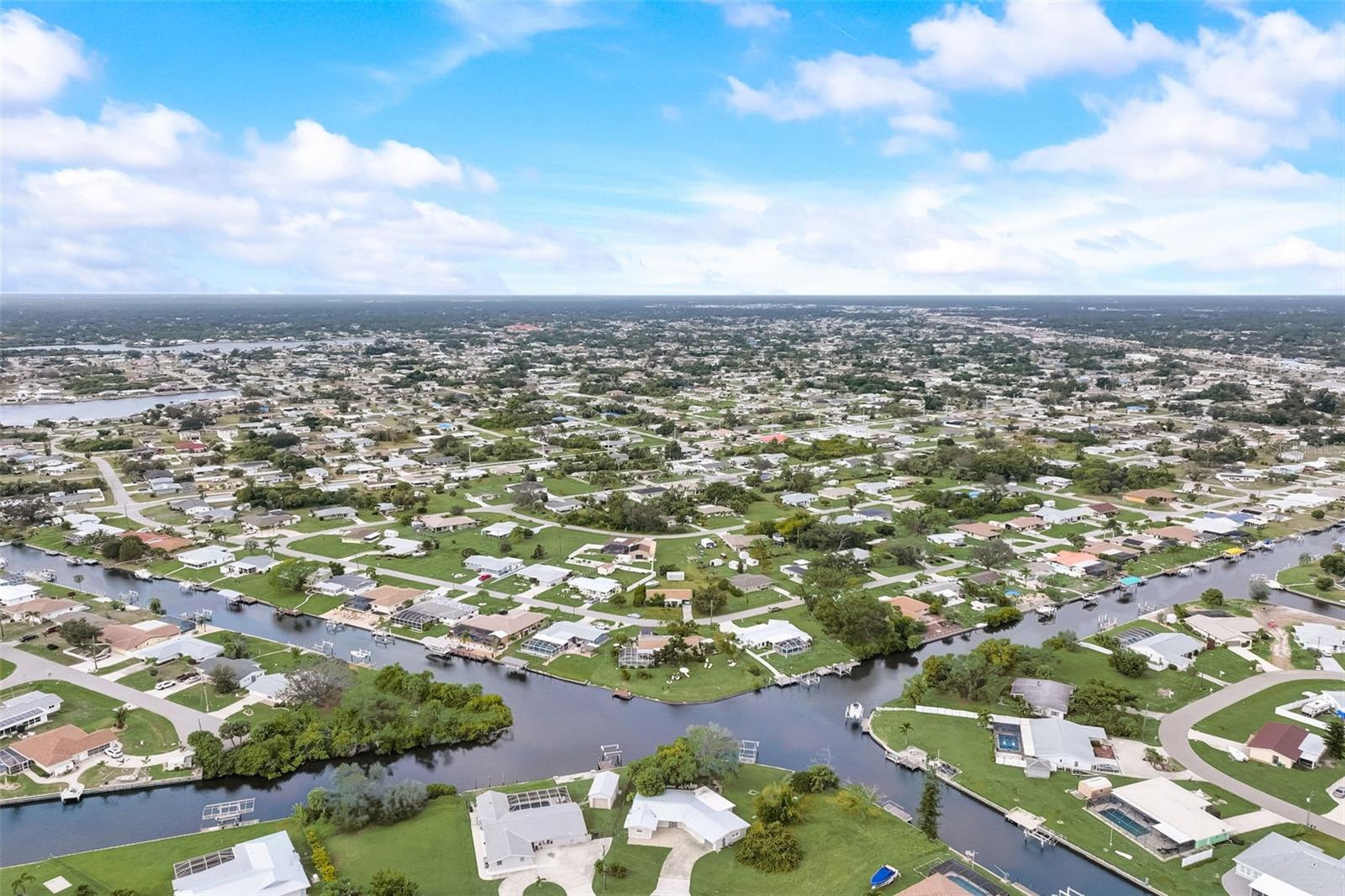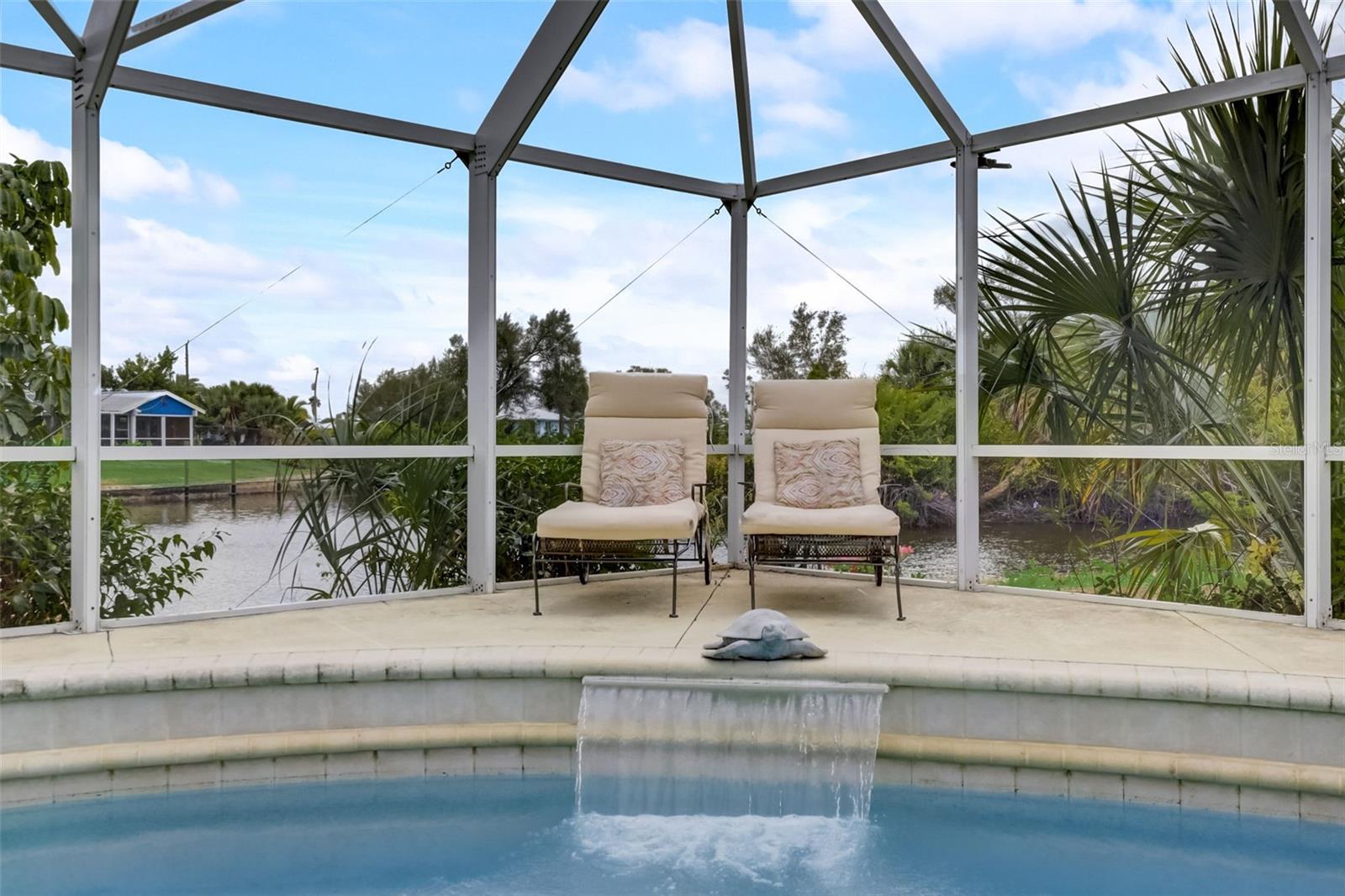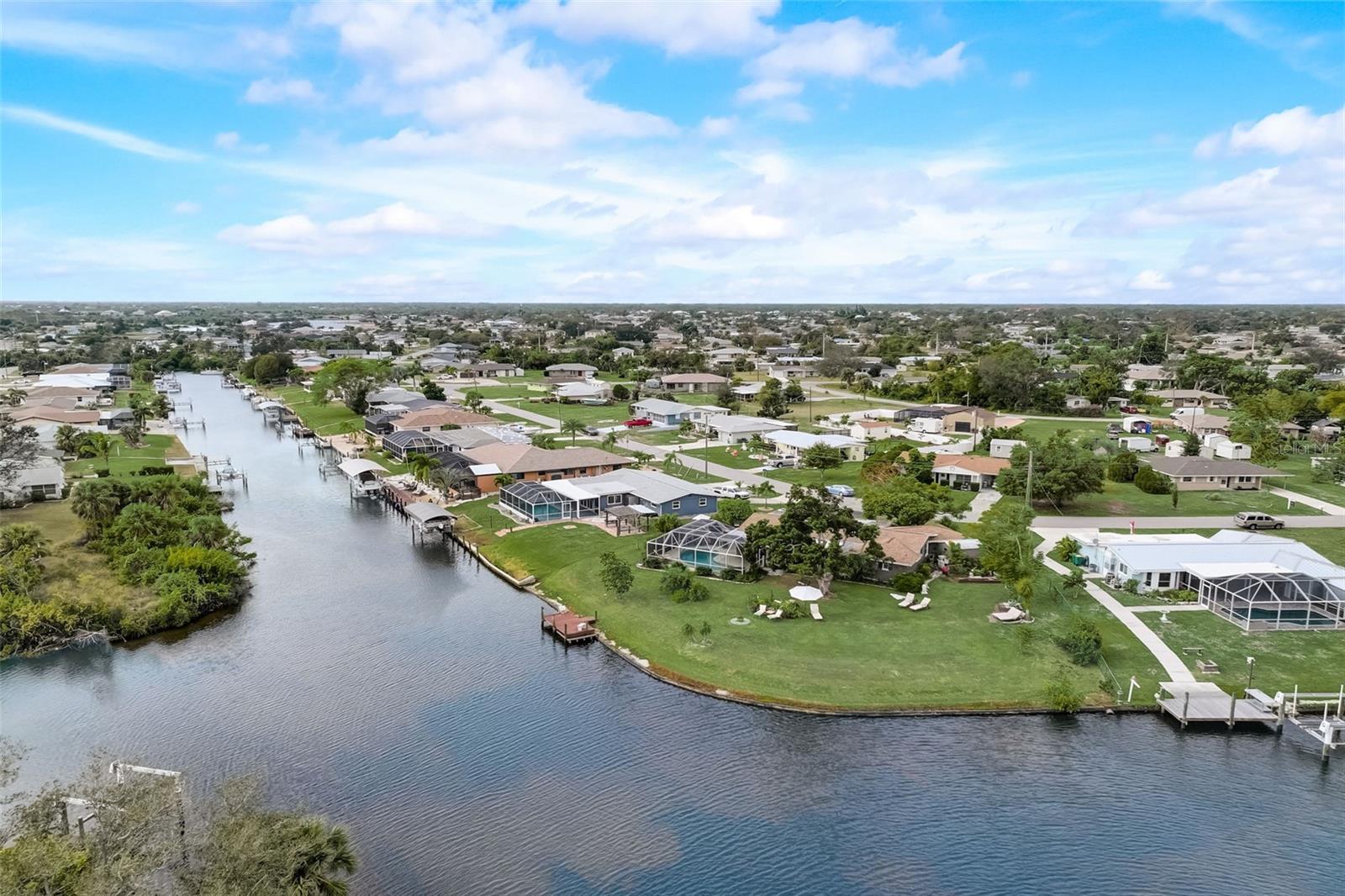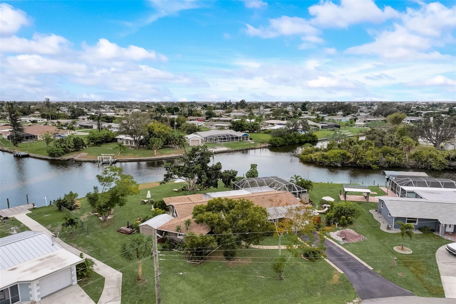 Direct Gulf Access! Experience waterfront living at its finest with this exceptional tip lot property, boasting 185 feet of prime waterfrontage facing the Sunrise over four canal points. fully Renovated/Remodeled to perfection , the home features two master suites with luxurious bathrooms, a custom Hickory Wood accent ceiling, Miami-Dade hurricane-rated windows, hickory wood flooring, and solid core doors throughout. The gourmet kitchen is a chef’s dream with Level 4 quartz countertops throughout the home, high-end appliances, and soft-close wood cabinetry. Outdoor amenities include lush tropical landscaping, a concrete seawall, wood dock, custom pool area with a grilling space, and charming porch swings. Set on nearly half an acre—the largest sought after lot in the neighborhood—this property offers additional expansion potential and includes ample storage and an insulated shed. Located just 1/2 mile by boat to Charlotte Harbor and minutes from I-75, Punta Gorda, and Sunseeker Resort, this property seamlessly combines luxury, comfort, and convenience. A must-see to fully appreciate the craftsmanship and style.