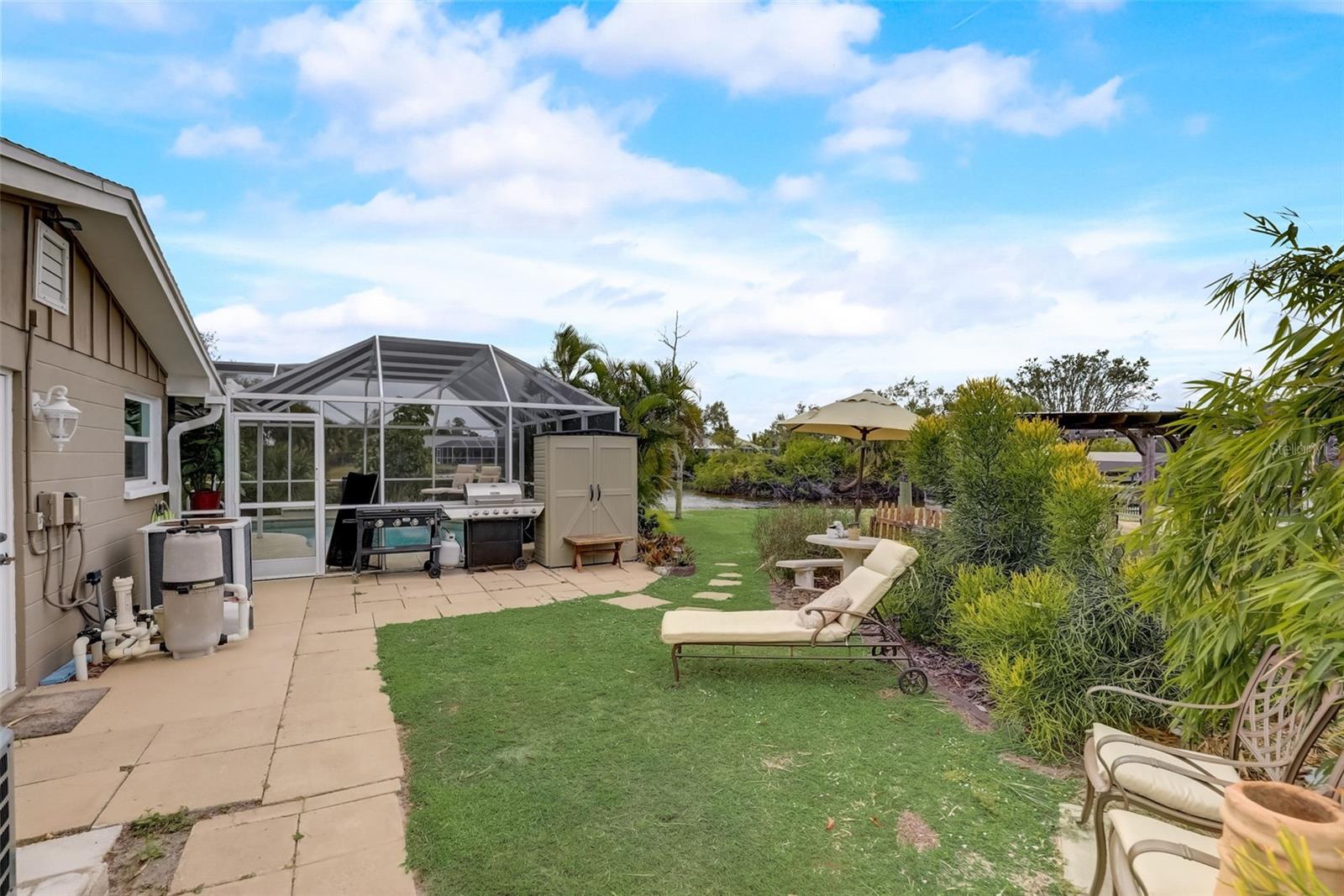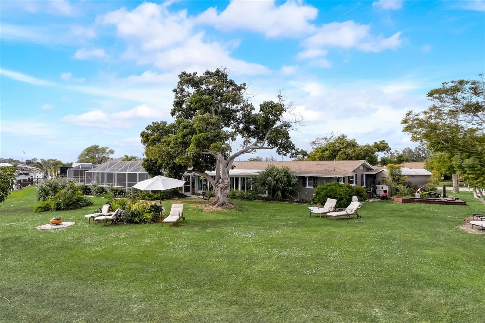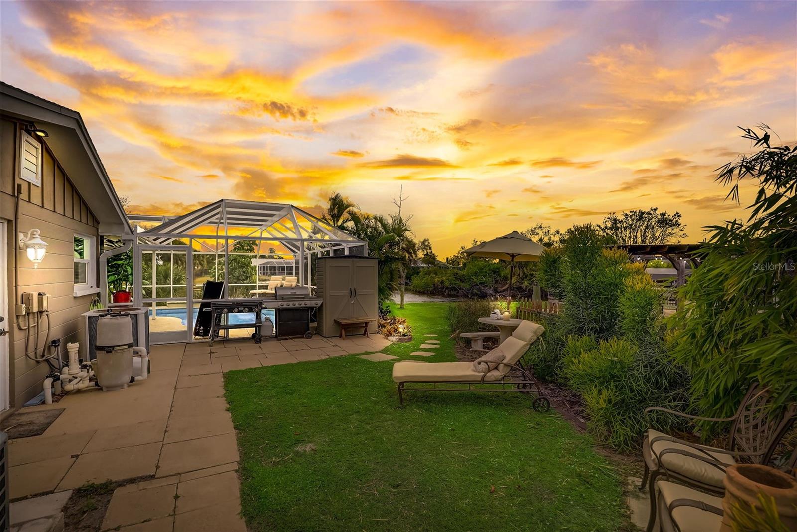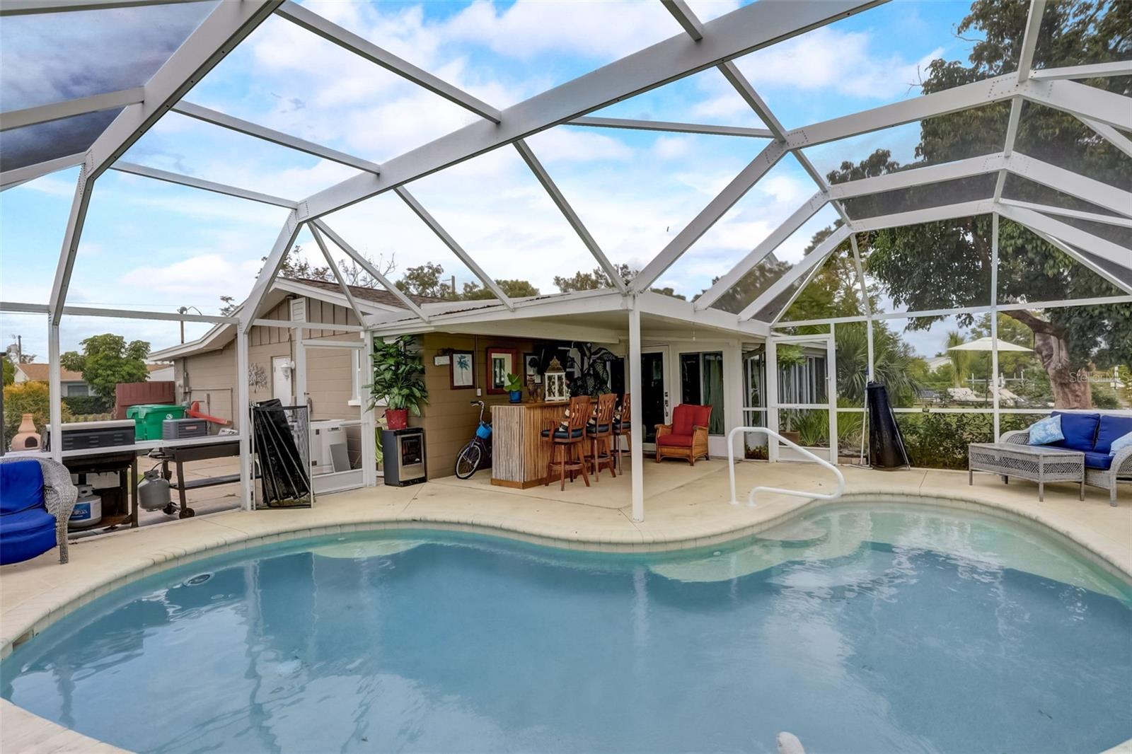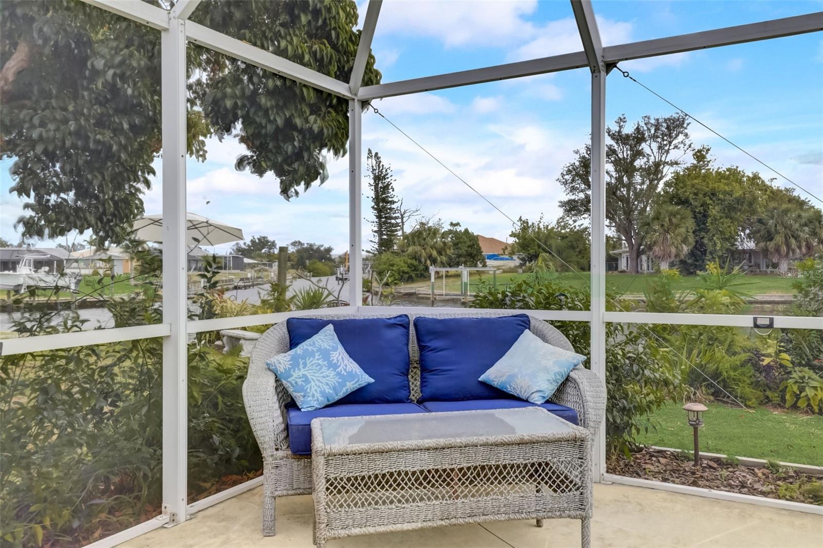 Direct Gulf Access! Experience waterfront living at its finest with this exceptional tip lot property, boasting 185 feet of prime waterfrontage facing the Sunrise over four canal points. fully Renovated/Remodeled to perfection , the home features two master suites with luxurious bathrooms, a custom Hickory Wood accent ceiling, Miami-Dade hurricane-rated windows, hickory wood flooring, and solid core doors throughout. The gourmet kitchen is a chef’s dream with Level 4 quartz countertops throughout the home, high-end appliances, and soft-close wood cabinetry. Outdoor amenities include lush tropical landscaping, a concrete seawall, wood dock, custom pool area with a grilling space, and charming porch swings. Set on nearly half an acre—the largest sought after lot in the neighborhood—this property offers additional expansion potential and includes ample storage and an insulated shed. Located just 1/2 mile by boat to Charlotte Harbor and minutes from I-75, Punta Gorda, and Sunseeker Resort, this property seamlessly combines luxury, comfort, and convenience. A must-see to fully appreciate the craftsmanship and style.