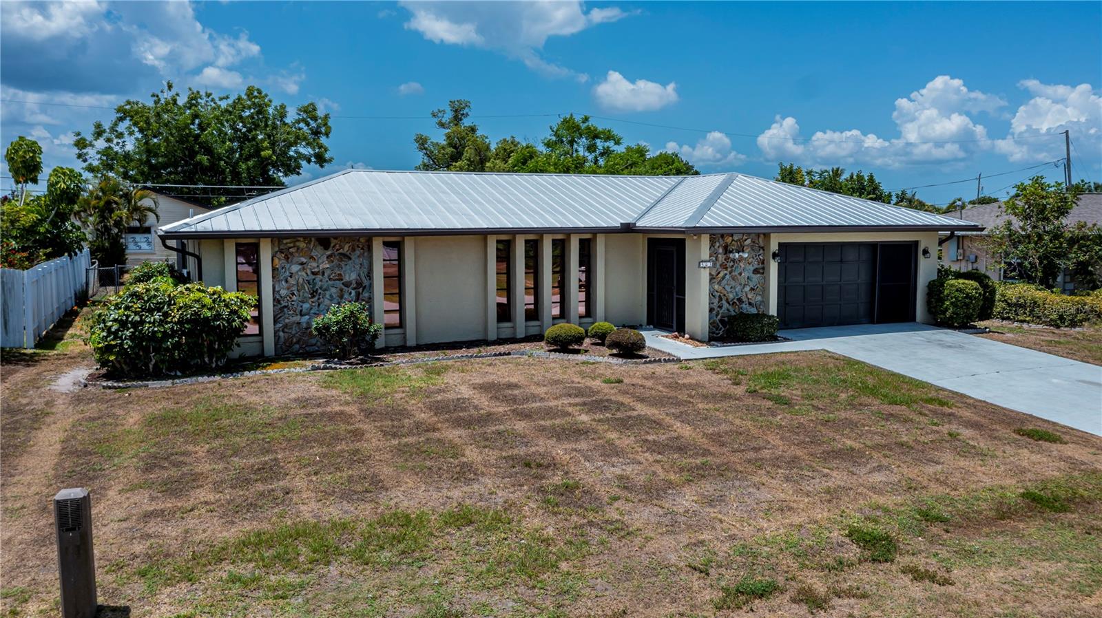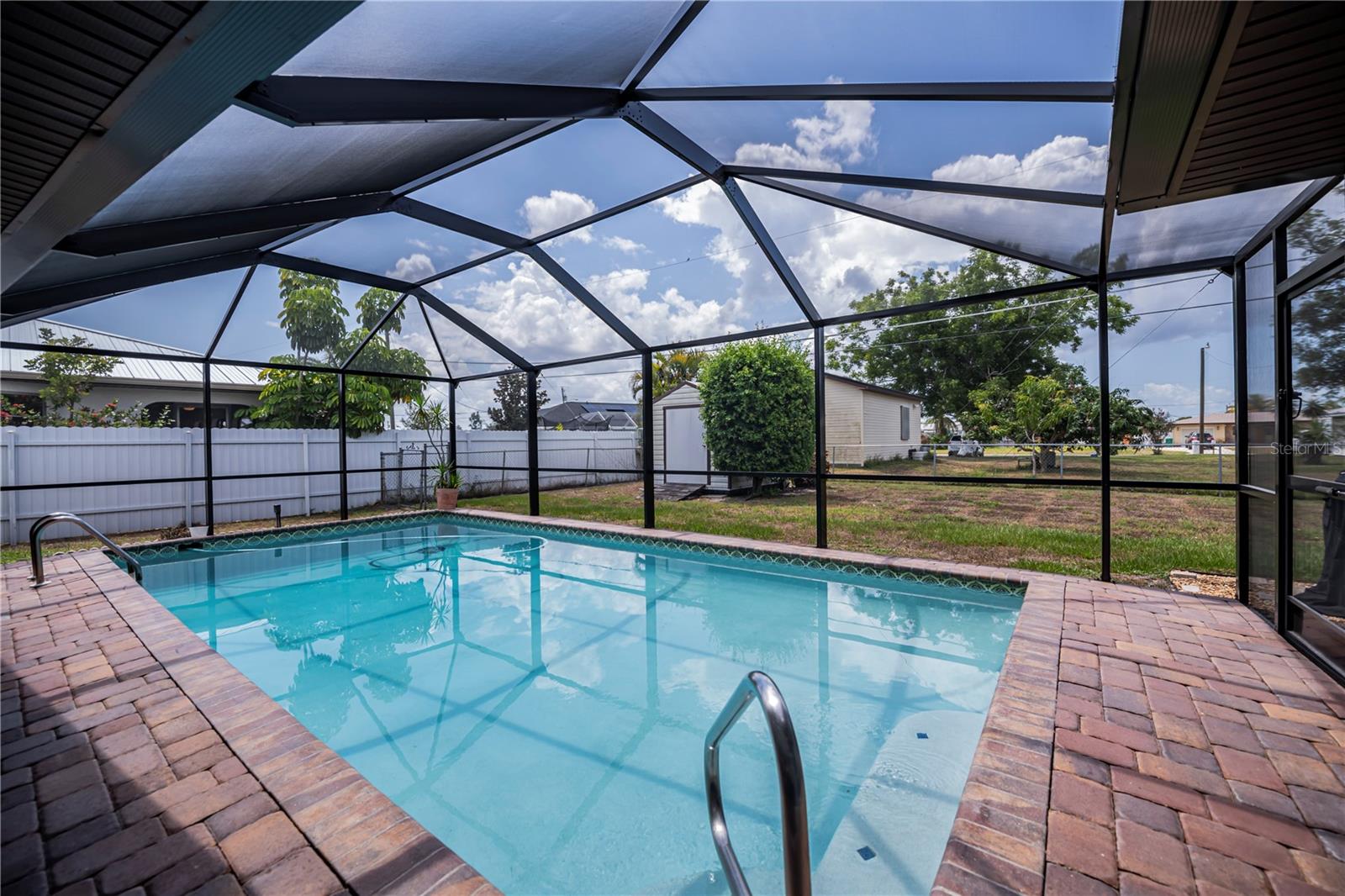 DONT MISS THIS MOVE IN READY FURNISHED 3 bedroom 2.5 bathroom home. This is a MUST SEE! Brand new pool cage, AC 8 months old, pool pump 2023, pool heater 2022, up graded electrical box, new gutters and soffits, tile throughout the house except bedrooms, metal roof, house painted outside 2021, new garage door opener. Pool was resurfaced 2020. This home is close to shopping and the new Sunseeker resort. This split plan home is spacious with an L shaped living room and dining plus a kitchenette area with additional family room. Kitchen has lots of cabinets, entertainment pass thru and bar seating. The yard is fenced, and has a shed. THIS ONE HAS IT ALL! DONT PASS THIS UP!