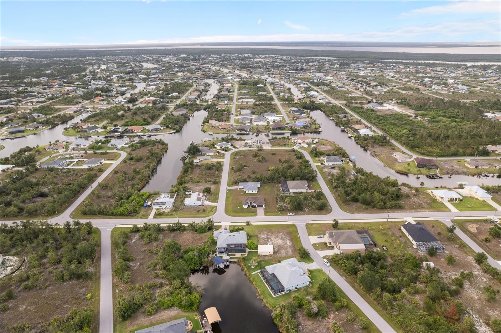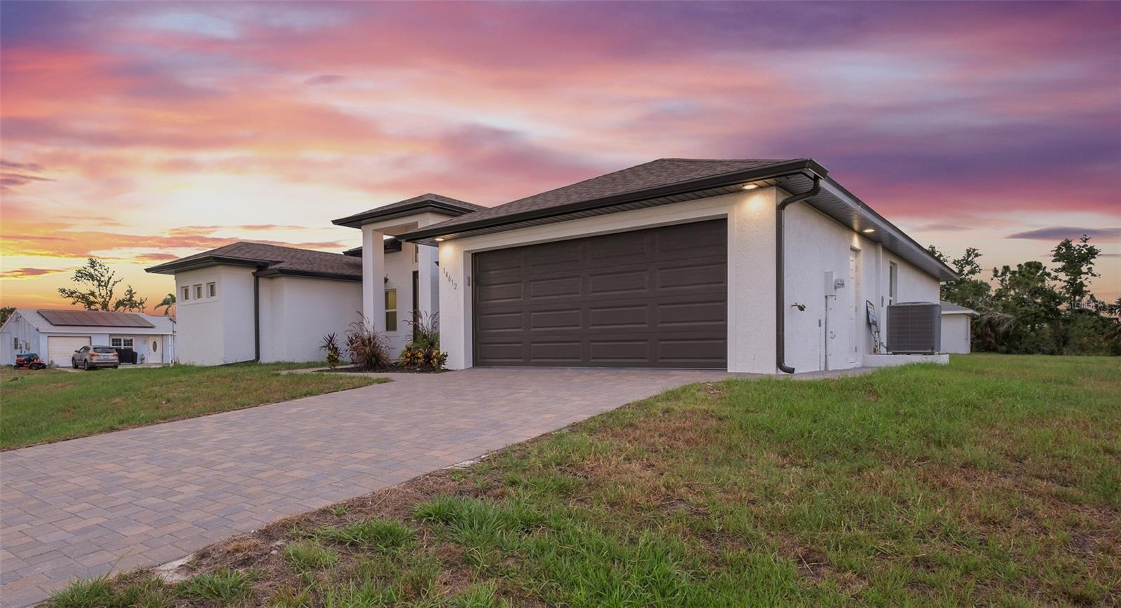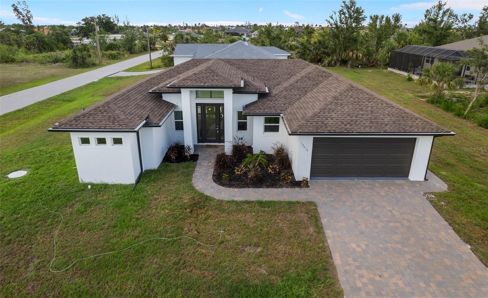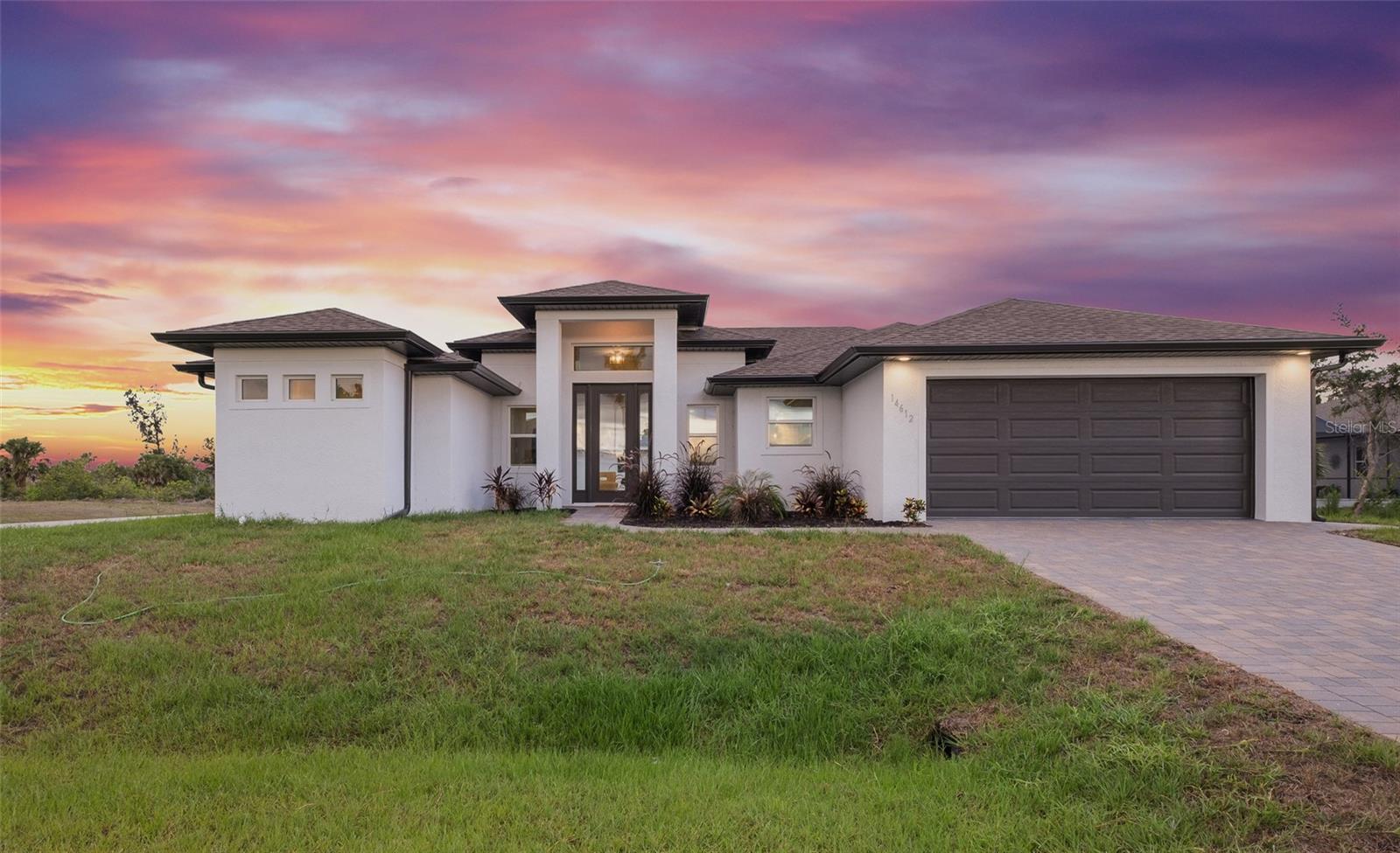 BRAND NEW, COMPLETED, MOVE-IN READY, NO WAITING. PLEASE SEE THE VIDEO TOUR!! . This is the Turnberry model from Harbor Home Builders. Three-bedroom, two-bathroom, two car garage home on a corner lot in South Gulf Cove. 12-foot Entry opens to living room with art niche, coffered ceilings, 20" porcelain tile and glass sliding doors opening to Lanai. Impact windows throughout. The Kitchen features a 9-foot granite island with double stainless sink, designer drop lighting, granite countertops and solid wood cabinetry with soft close doors and drawers. Master bedroom features trayed ceiling with can lighting and designer fan, transom window, walk-in closet plus second closet. Master bathroom with walk-in tiled shower with waterfall glass backsplash, twin vanities with solid wood soft close cabinets and granite counters, water closet and linen closet. 27' x 9' lanai features entertainment wall with rough-in plumbing for future outdoor kitchen, electrical outlets and cable outlet. Brick Pavered driveway with pavered walk to front door.