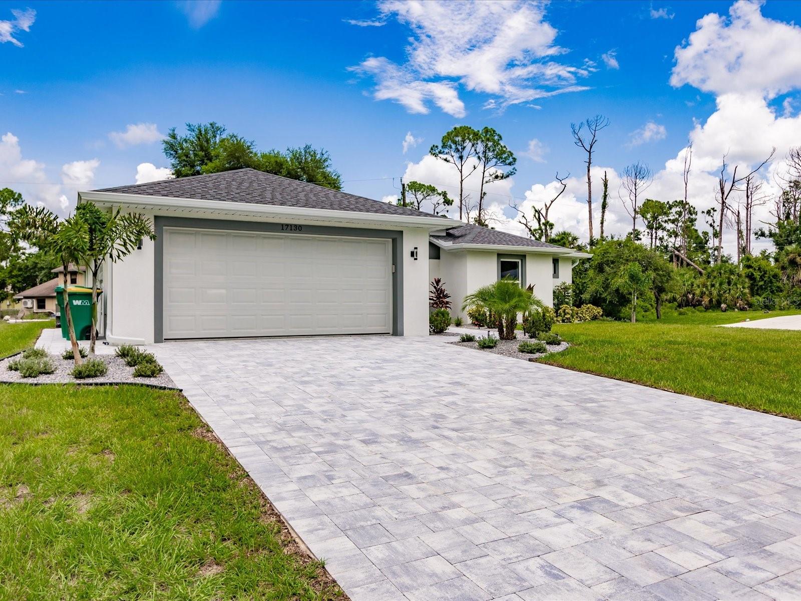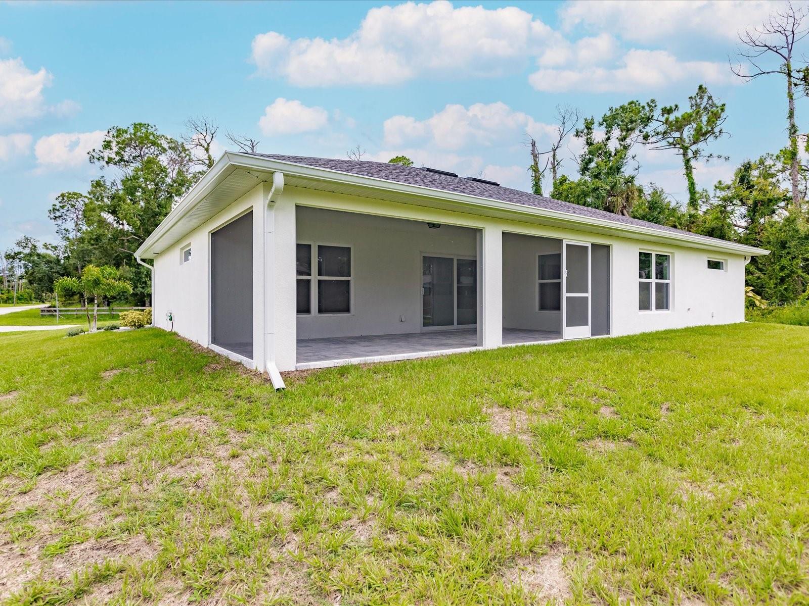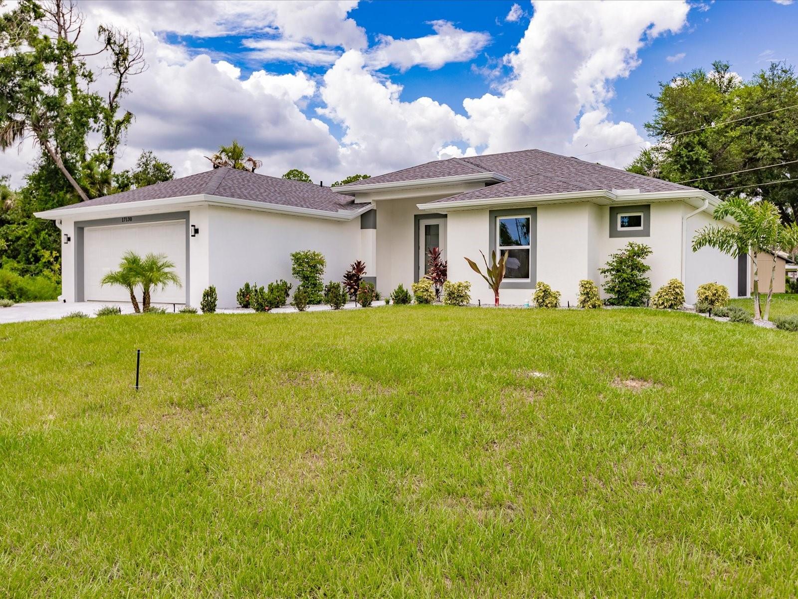 BRAND NEW HOME! On an Oversized Corner Lot with Public Water. Not in a Flood Zone. BEAUTIFUL BRIGHT OPEN FLOOR PLAN So many WONDERFUL features starting with 3 bedrooms, 2 bathrooms along with an office/den. The oversized 2 car garage with a paver driveway is just the beginning. Step through the glassed double front doors. Upon entering, you will find beautiful plank tile throughout the ENTIRE home including the bedrooms. The split plan offers an en suite off the master bedroom with dual sinks and a walk-in closet. The SPECTACULAR kitchen features custom cabinets with soft close drawers, GORGEOUS quartz countertops, a kitchen island with sink and stainless steel appliances. The spacious living room showcases french doors leading out to your large screened-in lanai with pavers. A dedicated home office/den is also located off the living room area. To make it even better, you will enjoy the inside laundry room that's adjacent to the kitchen along with a nice size dining room that's just perfect for those family gatherings. There is plenty of space for entertaining in this home! For your landscaping convenience, an irrigation system has also been installed for the plant area only. In addition, 12 foot Areca Palm Trees have been installed in the backyard giving you that added privacy. Convenient location that's close to major restaurants, grocery stores, retail and medical facilities. You are 18.5 miles to Englewood Beach and only 5.4 miles to North Port. This Cozy Modern Home could be yours. Schedule a showing today! LEASE PURCHASE OPTION AVAILABLE FOR THIS PROPERTY