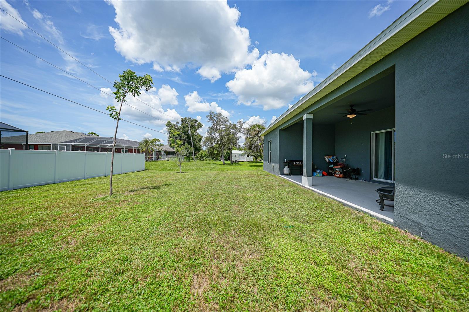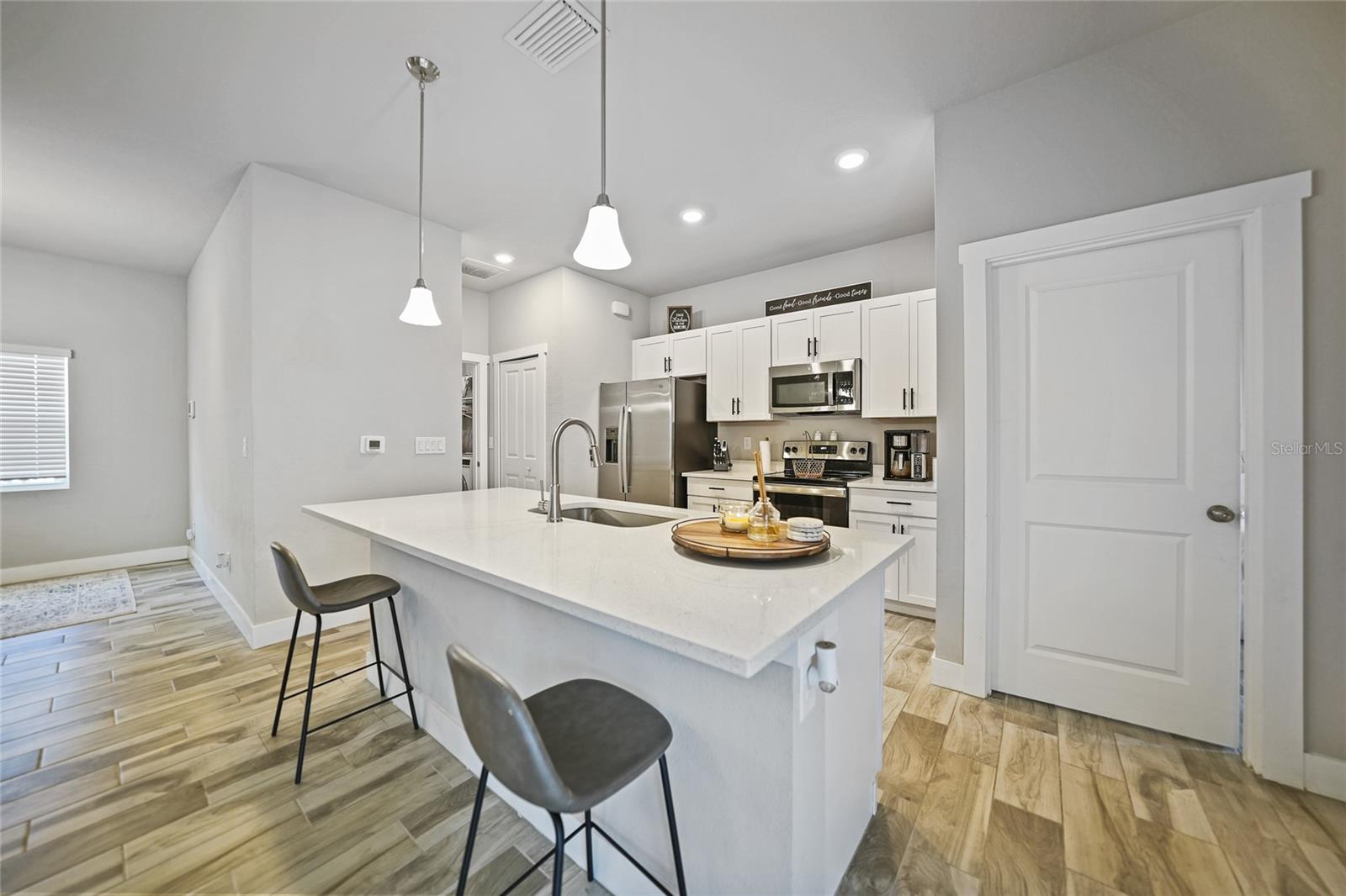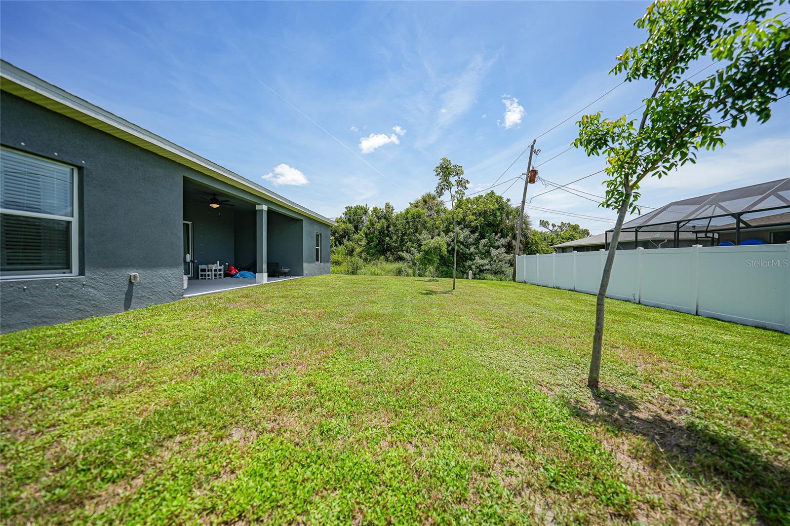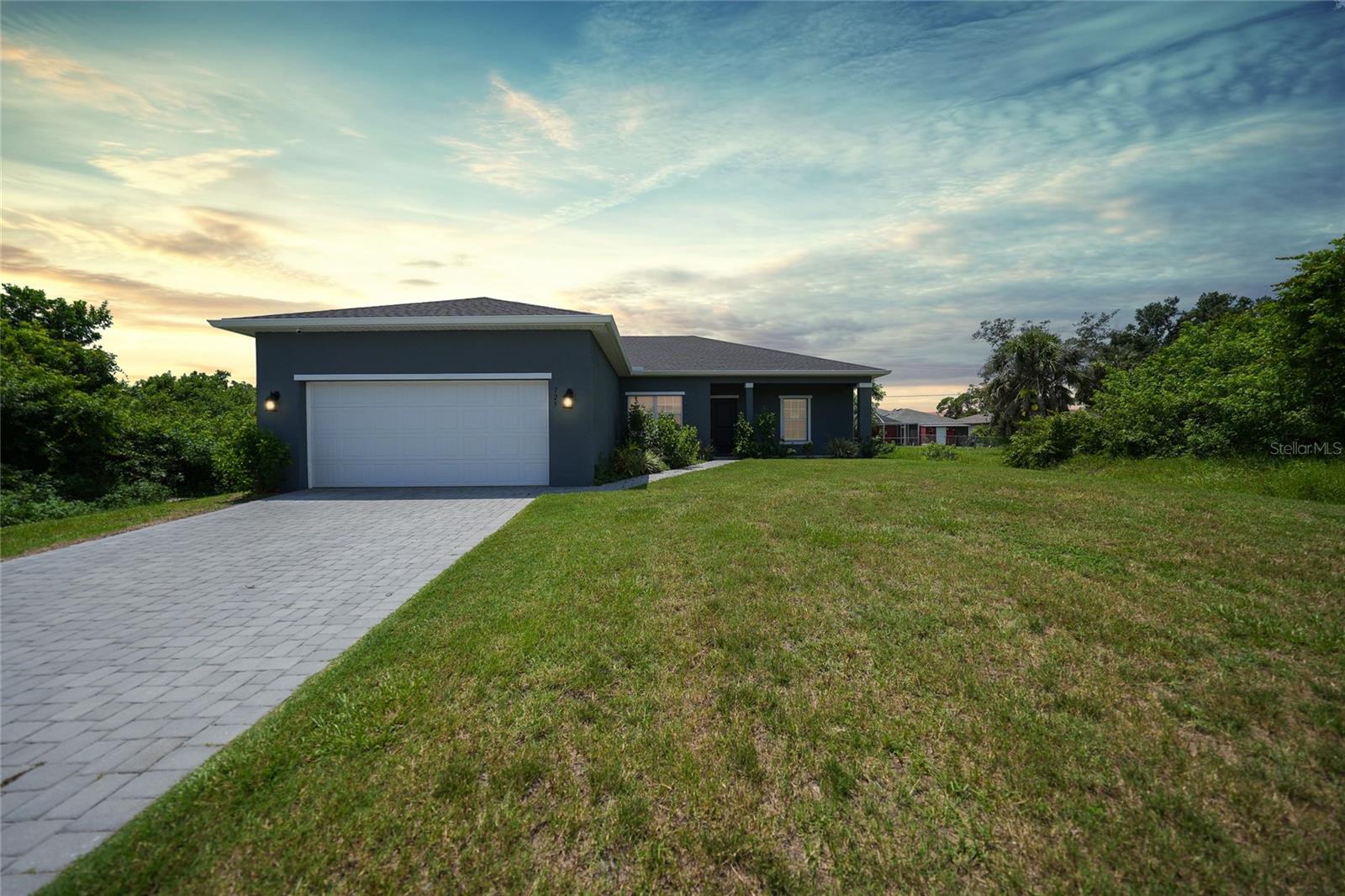 Step into modern elegance with this meticulously designed MarDon-built residence, boasting 1,574 square feet of sophisticated living space. This newly constructed energy efficient concrete block home features 3 spacious bedrooms and 2 stylish bathrooms, complemented by a 2-car garage for convenience and additional storage. As you enter, you are greeted by an inviting living and dining area with sleek wood tile flooring that flows seamlessly throughout the home. The open and split floor plan is ideal for both entertaining and everyday living, enhanced by sliding glass doors that lead to a covered patio area – perfect for enjoying Florida’s beautiful weather. The heart of the home is the well-appointed kitchen, which showcases stunning Quartz countertops, high-end stainless steel appliances, and a center island with seating and pendant lighting. Shaker-style cabinets with modern black hardware, a spacious pantry closet, and thoughtful design ensure both functionality and style. The kitchen overlooks the living and dining spaces, making it easy to stay connected with family and guests. Retreat to the luxurious primary bedroom, where you'll find elegant flooring and a serene ambiance. The en-suite bath offers a spa-like experience with a Roman shower, an extended Quartz vanity with dual sinks, and not one but two generous walk-in closets – providing ample storage and comfort. Two additional guest bedrooms, each with built-in closets, share a beautifully designed full bath, making this home ideal for accommodating family or visitors. Additional features include a laundry room that flows into the 2 car garage. Large backyard offers room to add your swimming pool. The home also features a separate dedicated 50-amp breaker in the electric panel, prewired to specifically handle a 8,500 - 15,000 watt generator that could potentially run the whole house. This residence embodies comfort and style, making it the perfect place to call home. Don’t miss your chance to experience the Florida lifestyle in this exceptional property – schedule your showing today!