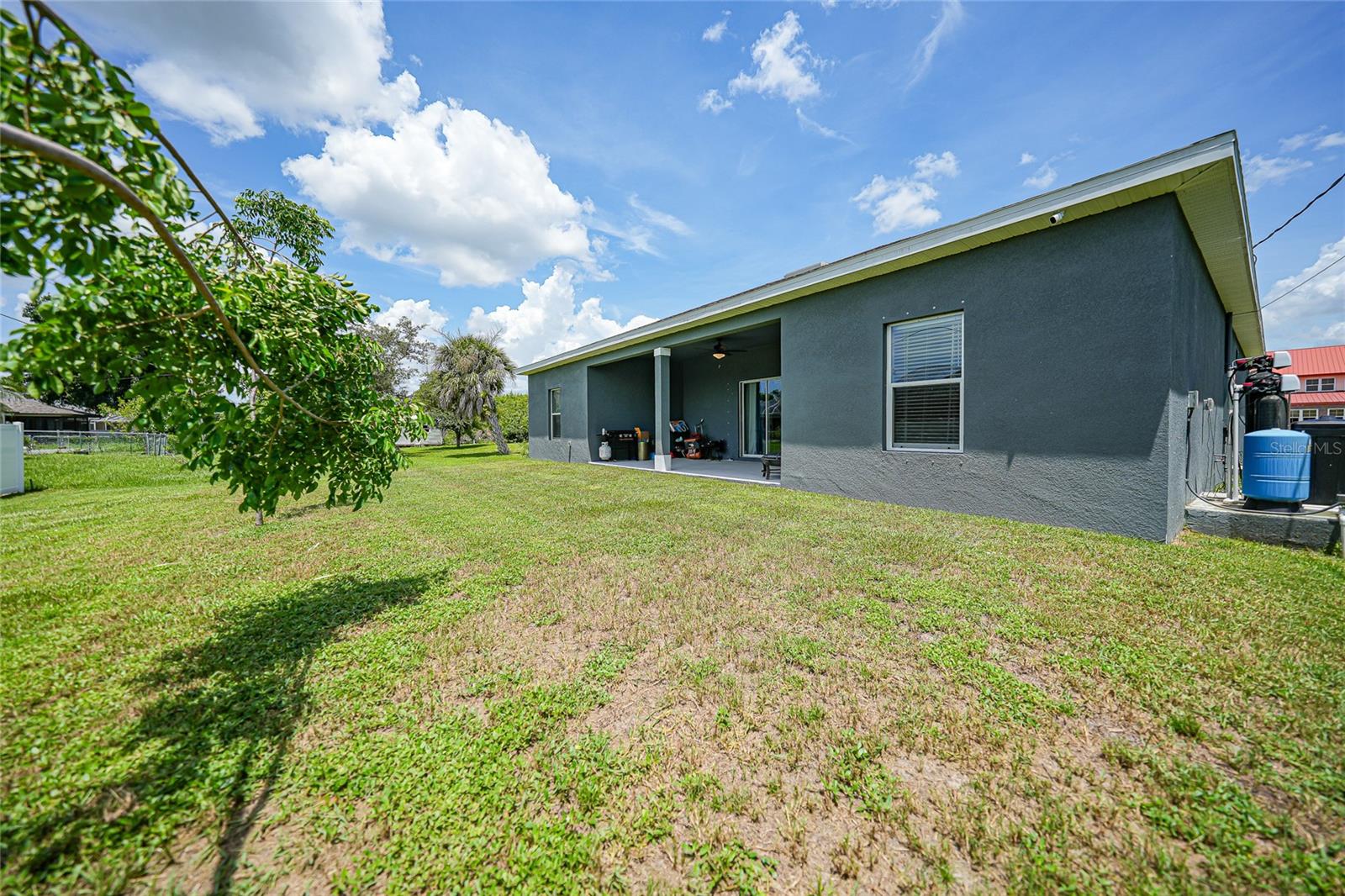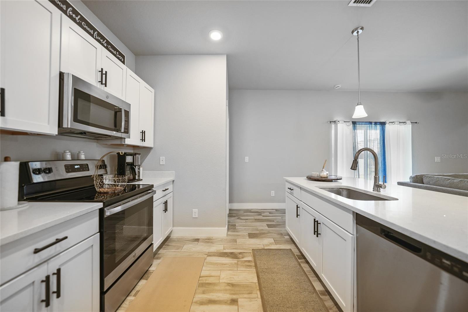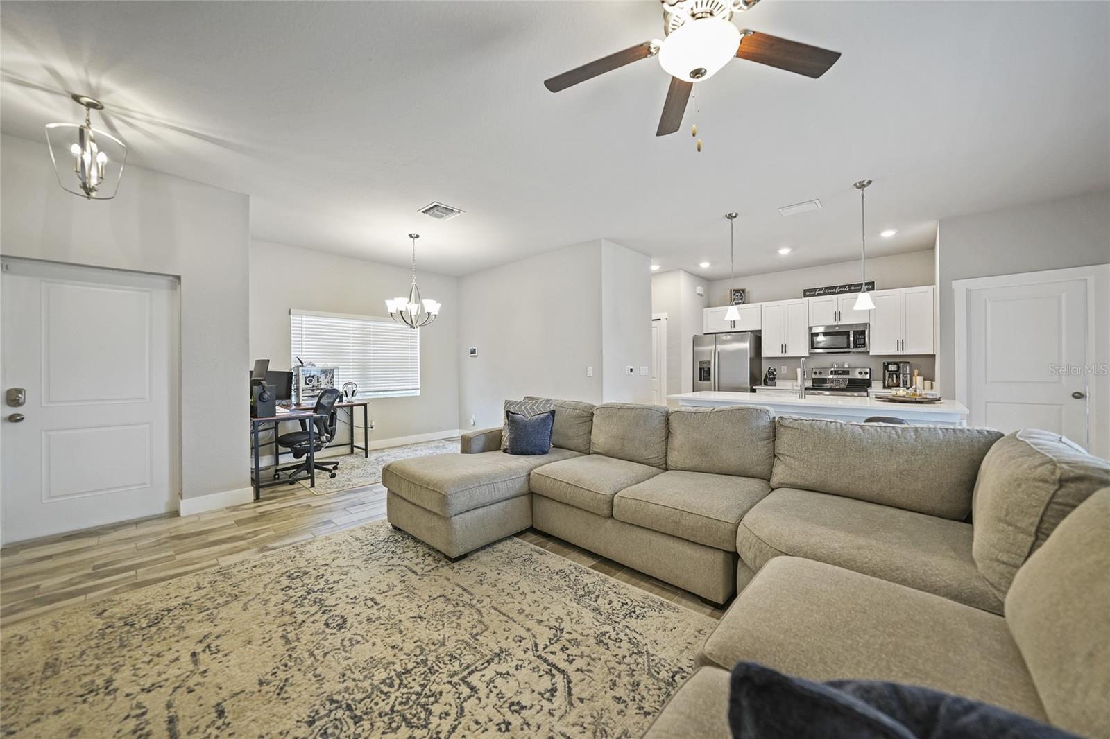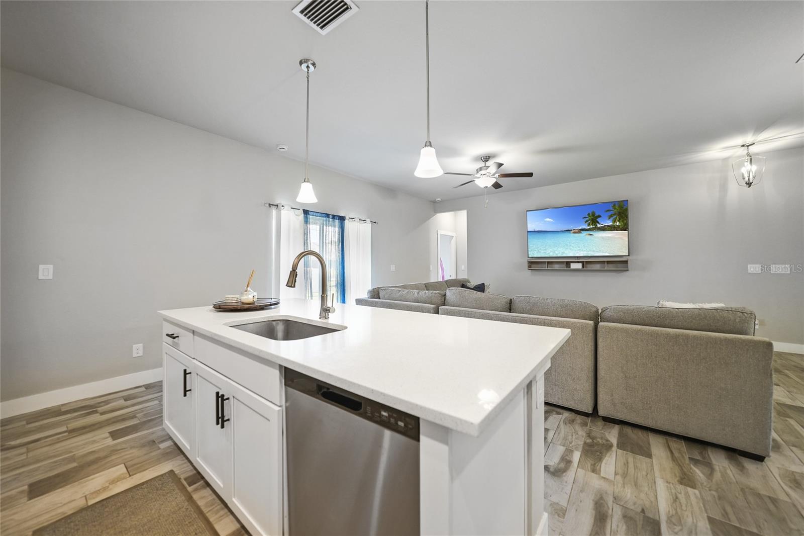 Step into modern elegance with this meticulously designed MarDon-built residence, boasting 1,574 square feet of sophisticated living space. This newly constructed energy efficient concrete block home features 3 spacious bedrooms and 2 stylish bathrooms, complemented by a 2-car garage for convenience and additional storage. As you enter, you are greeted by an inviting living and dining area with sleek wood tile flooring that flows seamlessly throughout the home. The open and split floor plan is ideal for both entertaining and everyday living, enhanced by sliding glass doors that lead to a covered patio area – perfect for enjoying Florida’s beautiful weather. The heart of the home is the well-appointed kitchen, which showcases stunning Quartz countertops, high-end stainless steel appliances, and a center island with seating and pendant lighting. Shaker-style cabinets with modern black hardware, a spacious pantry closet, and thoughtful design ensure both functionality and style. The kitchen overlooks the living and dining spaces, making it easy to stay connected with family and guests. Retreat to the luxurious primary bedroom, where you'll find elegant flooring and a serene ambiance. The en-suite bath offers a spa-like experience with a Roman shower, an extended Quartz vanity with dual sinks, and not one but two generous walk-in closets – providing ample storage and comfort. Two additional guest bedrooms, each with built-in closets, share a beautifully designed full bath, making this home ideal for accommodating family or visitors. Additional features include a laundry room that flows into the 2 car garage. Large backyard offers room to add your swimming pool. The home also features a separate dedicated 50-amp breaker in the electric panel, prewired to specifically handle a 8,500 - 15,000 watt generator that could potentially run the whole house. This residence embodies comfort and style, making it the perfect place to call home. Don’t miss your chance to experience the Florida lifestyle in this exceptional property – schedule your showing today!