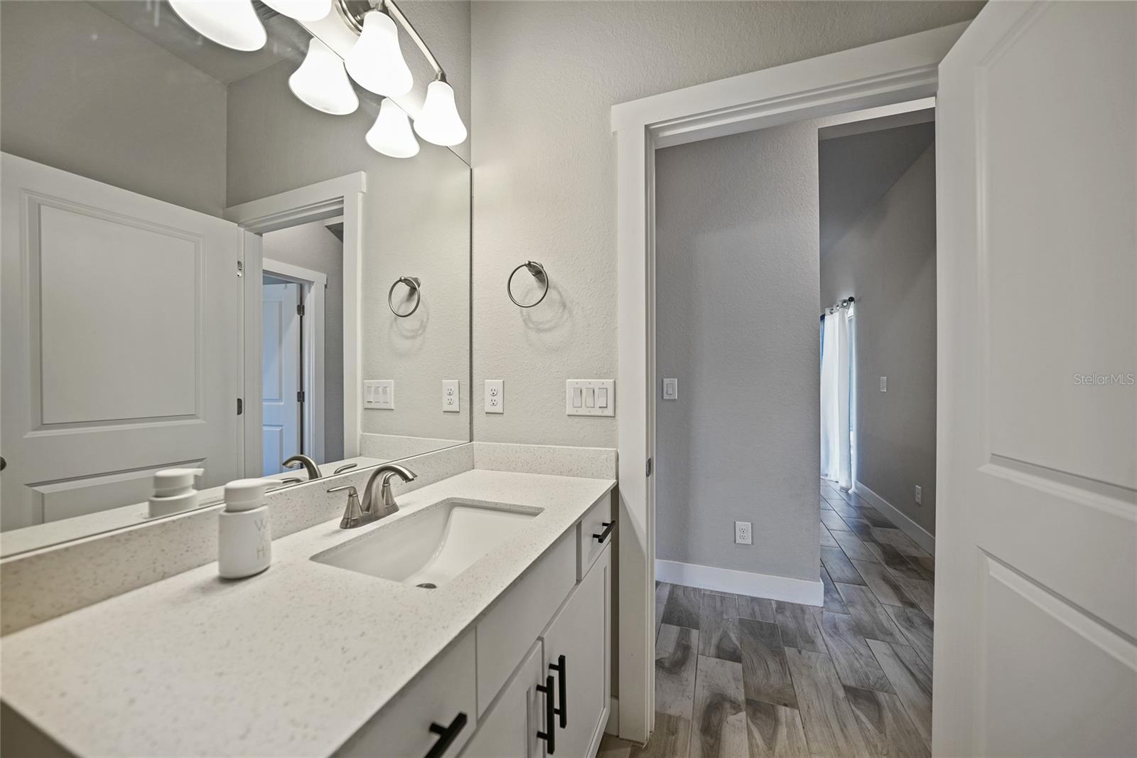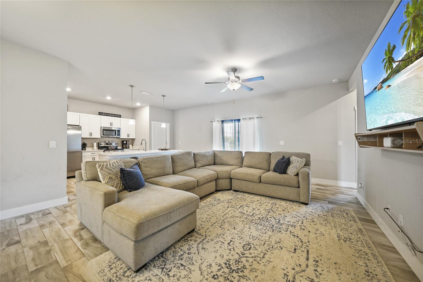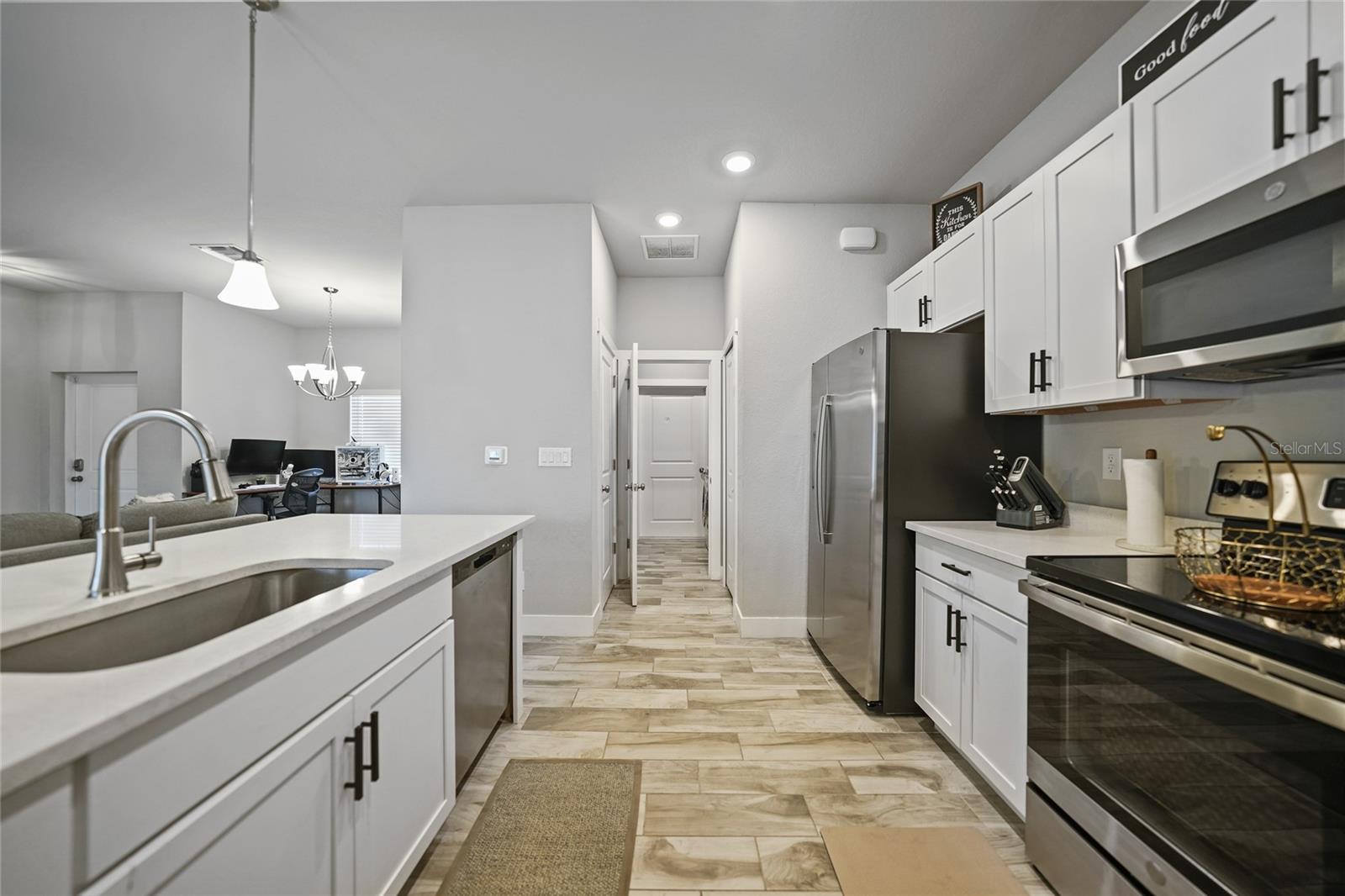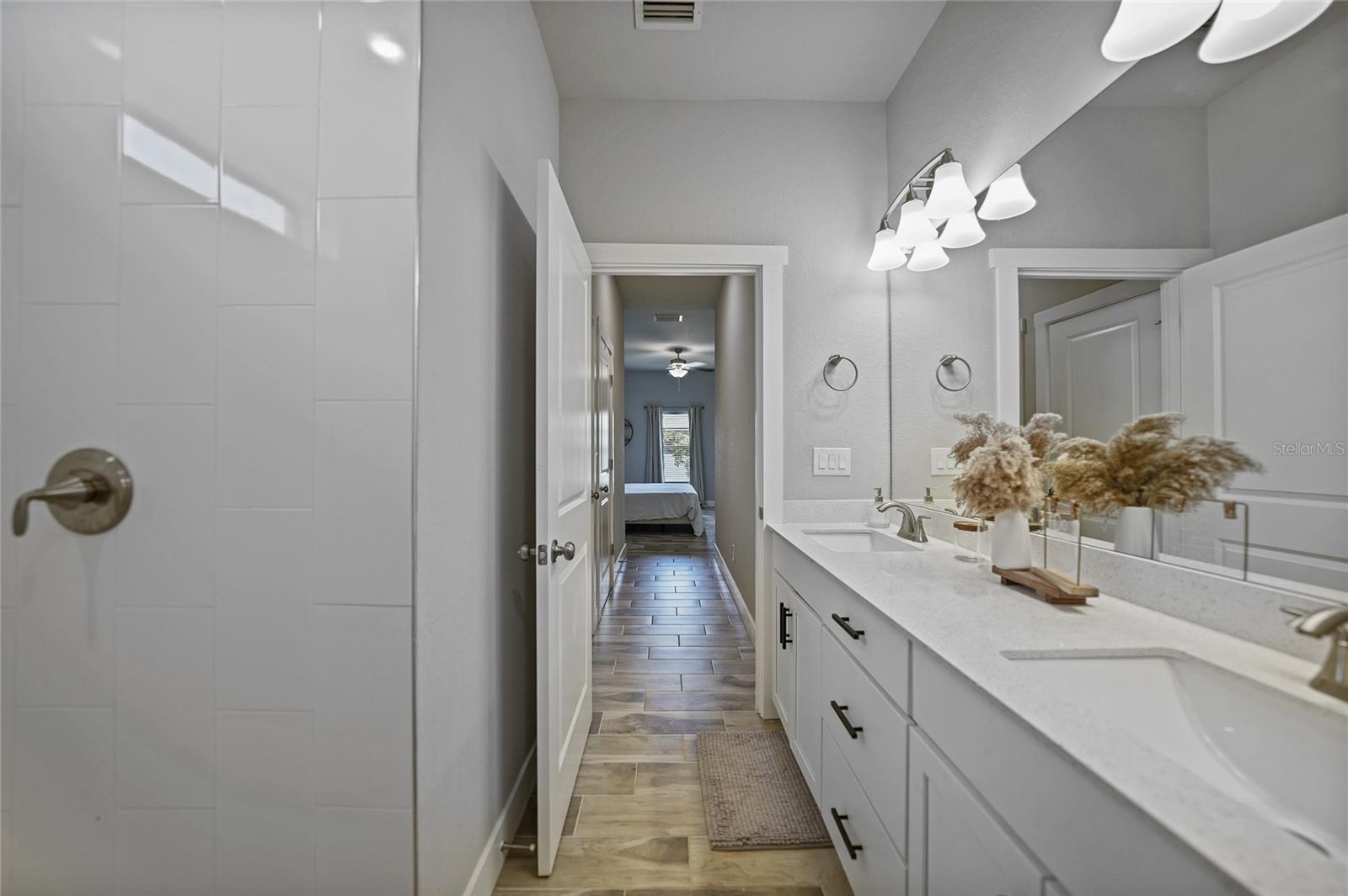 Step into modern elegance with this meticulously designed MarDon-built residence, boasting 1,574 square feet of sophisticated living space. This newly constructed energy efficient concrete block home features 3 spacious bedrooms and 2 stylish bathrooms, complemented by a 2-car garage for convenience and additional storage. As you enter, you are greeted by an inviting living and dining area with sleek wood tile flooring that flows seamlessly throughout the home. The open and split floor plan is ideal for both entertaining and everyday living, enhanced by sliding glass doors that lead to a covered patio area – perfect for enjoying Florida’s beautiful weather. The heart of the home is the well-appointed kitchen, which showcases stunning Quartz countertops, high-end stainless steel appliances, and a center island with seating and pendant lighting. Shaker-style cabinets with modern black hardware, a spacious pantry closet, and thoughtful design ensure both functionality and style. The kitchen overlooks the living and dining spaces, making it easy to stay connected with family and guests. Retreat to the luxurious primary bedroom, where you'll find elegant flooring and a serene ambiance. The en-suite bath offers a spa-like experience with a Roman shower, an extended Quartz vanity with dual sinks, and not one but two generous walk-in closets – providing ample storage and comfort. Two additional guest bedrooms, each with built-in closets, share a beautifully designed full bath, making this home ideal for accommodating family or visitors. Additional features include a laundry room that flows into the 2 car garage. Large backyard offers room to add your swimming pool. The home also features a separate dedicated 50-amp breaker in the electric panel, prewired to specifically handle a 8,500 - 15,000 watt generator that could potentially run the whole house. This residence embodies comfort and style, making it the perfect place to call home. Don’t miss your chance to experience the Florida lifestyle in this exceptional property – schedule your showing today!