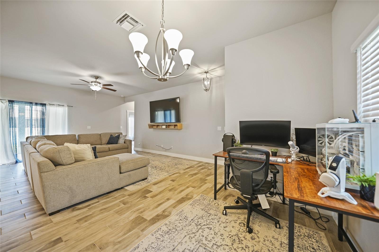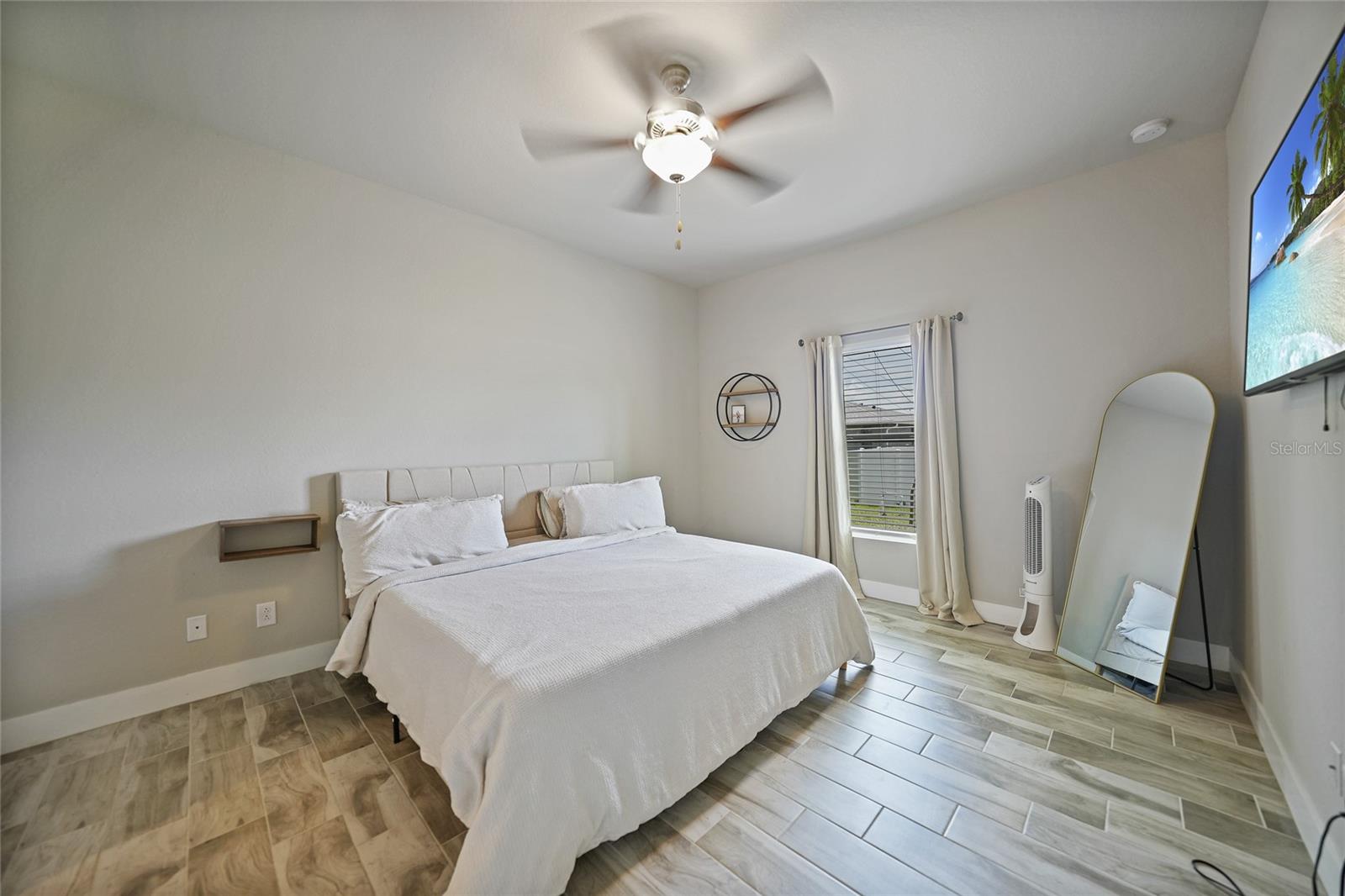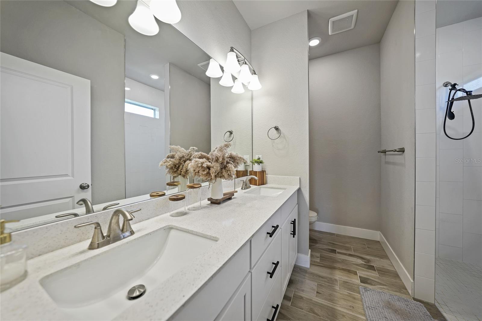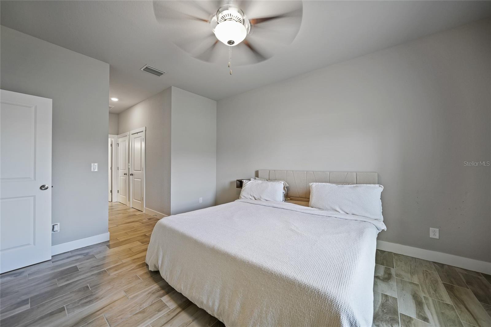 Step into modern elegance with this meticulously designed MarDon-built residence, boasting 1,574 square feet of sophisticated living space. This newly constructed energy efficient concrete block home features 3 spacious bedrooms and 2 stylish bathrooms, complemented by a 2-car garage for convenience and additional storage. As you enter, you are greeted by an inviting living and dining area with sleek wood tile flooring that flows seamlessly throughout the home. The open and split floor plan is ideal for both entertaining and everyday living, enhanced by sliding glass doors that lead to a covered patio area – perfect for enjoying Florida’s beautiful weather. The heart of the home is the well-appointed kitchen, which showcases stunning Quartz countertops, high-end stainless steel appliances, and a center island with seating and pendant lighting. Shaker-style cabinets with modern black hardware, a spacious pantry closet, and thoughtful design ensure both functionality and style. The kitchen overlooks the living and dining spaces, making it easy to stay connected with family and guests. Retreat to the luxurious primary bedroom, where you'll find elegant flooring and a serene ambiance. The en-suite bath offers a spa-like experience with a Roman shower, an extended Quartz vanity with dual sinks, and not one but two generous walk-in closets – providing ample storage and comfort. Two additional guest bedrooms, each with built-in closets, share a beautifully designed full bath, making this home ideal for accommodating family or visitors. Additional features include a laundry room that flows into the 2 car garage. Large backyard offers room to add your swimming pool. The home also features a separate dedicated 50-amp breaker in the electric panel, prewired to specifically handle a 8,500 - 15,000 watt generator that could potentially run the whole house. This residence embodies comfort and style, making it the perfect place to call home. Don’t miss your chance to experience the Florida lifestyle in this exceptional property – schedule your showing today!