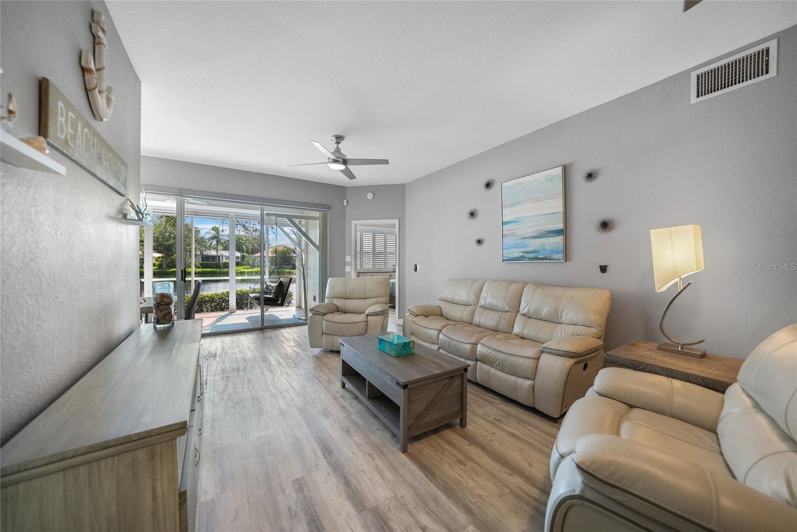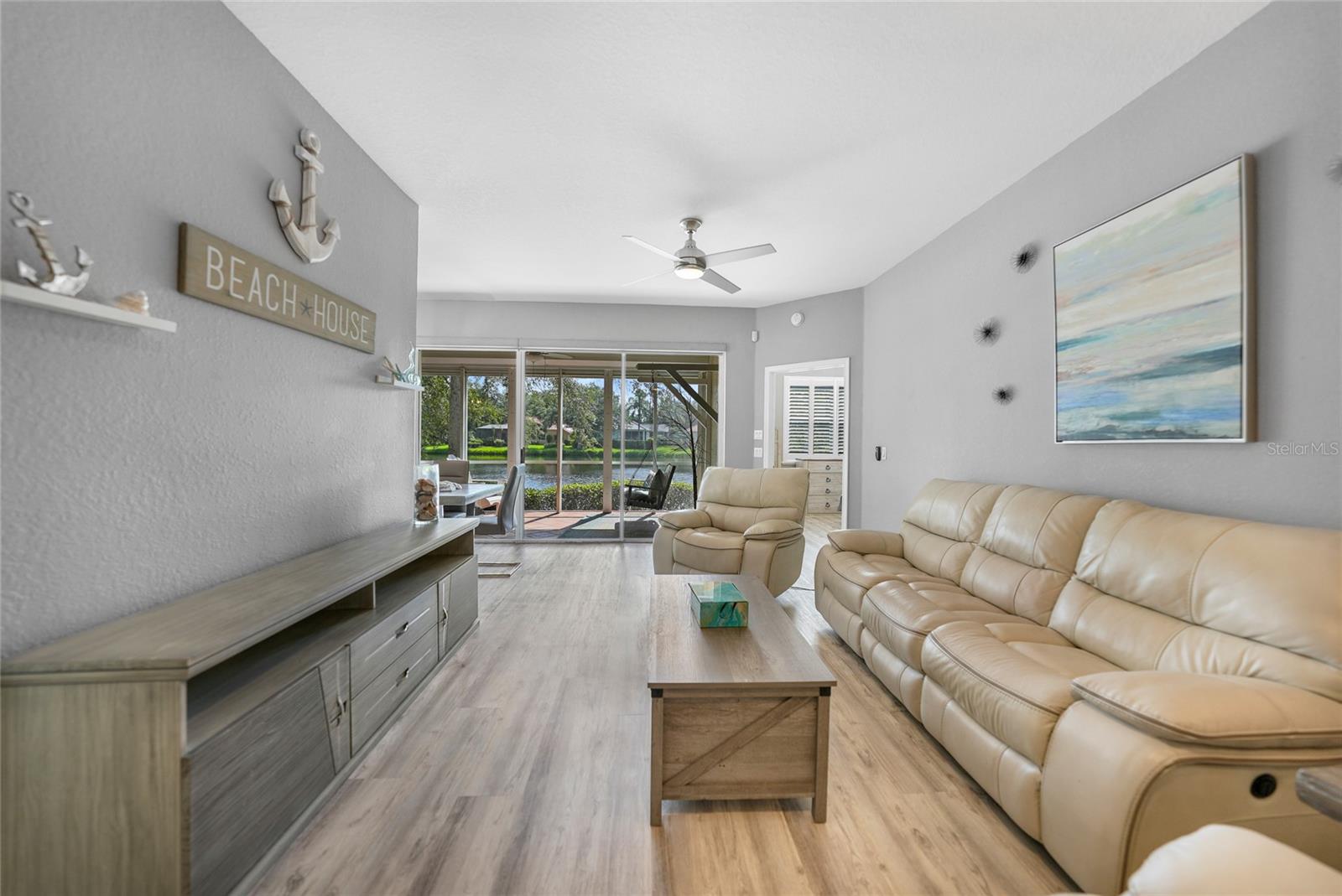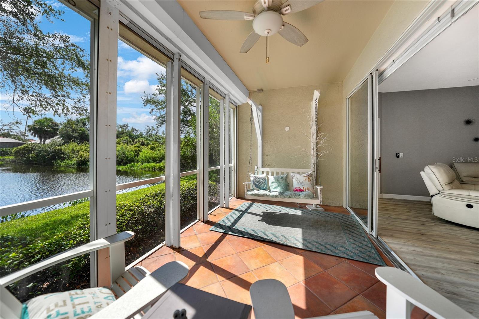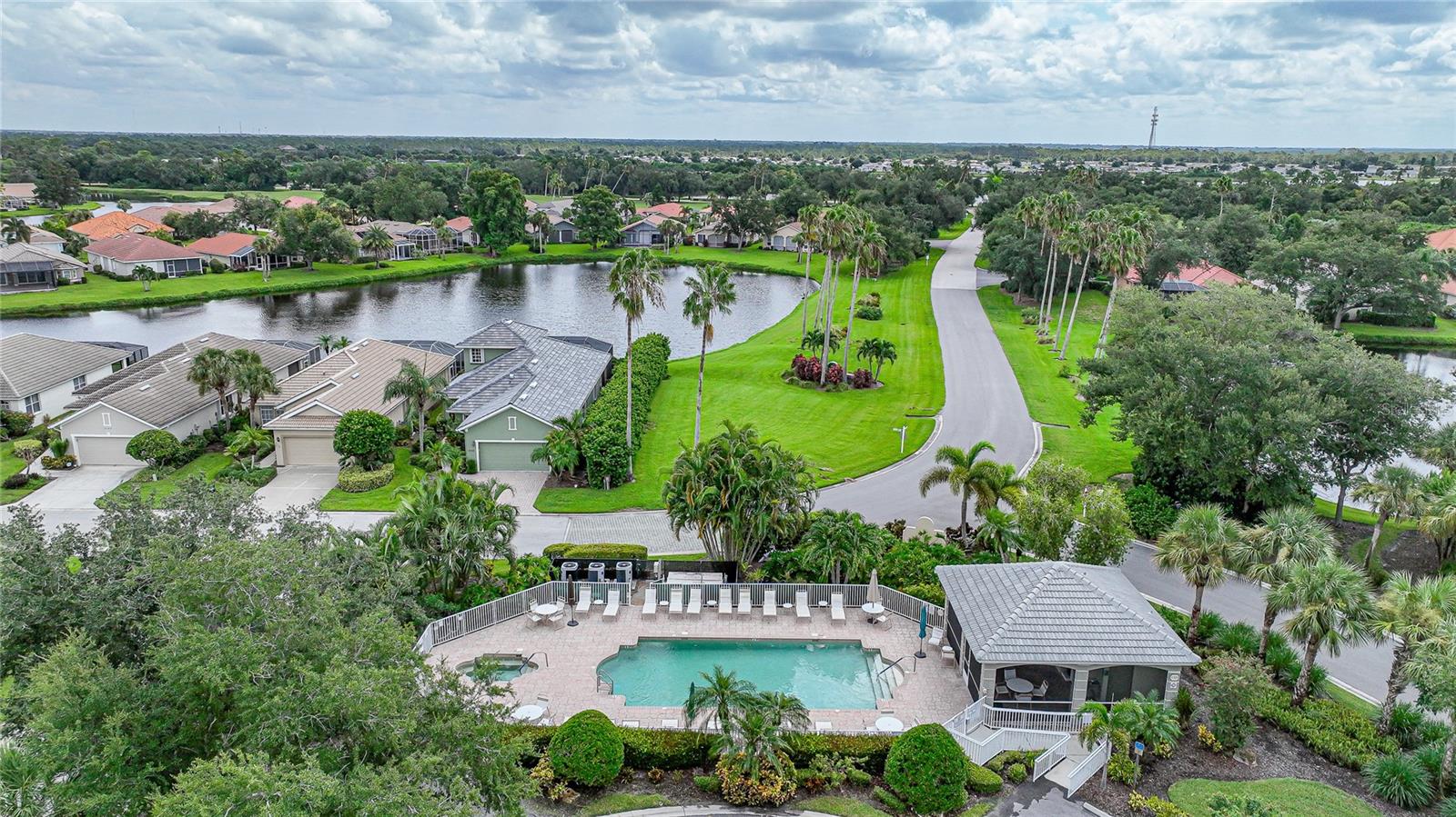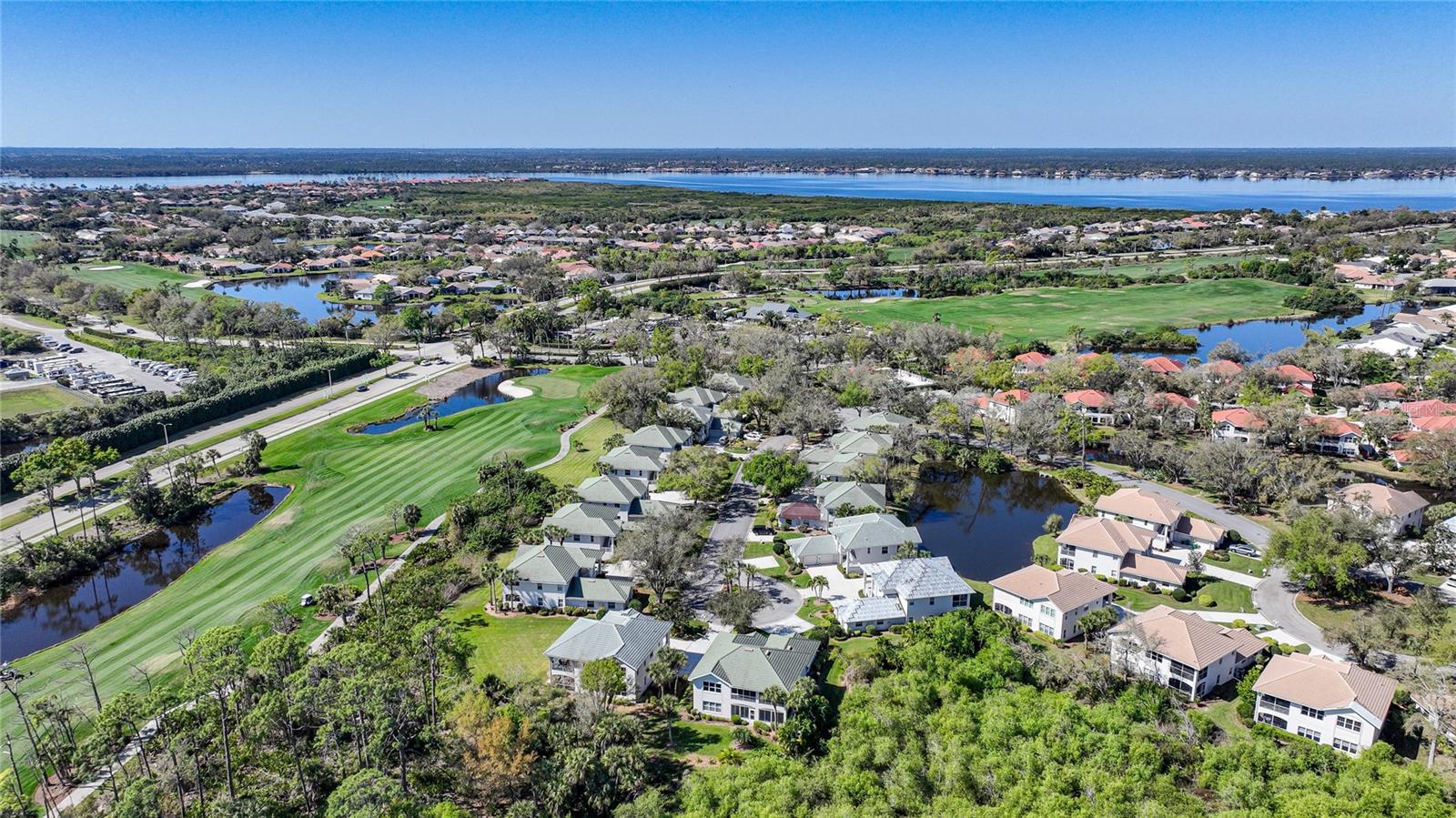 AMENITIES GALORE! SOLD FURNISHED! Welcome to the highly sought after community of Grand Vista at Riverwood. This quaint 2-bedroom 2-bathroom END UNIT boasts a breath-taking SUNRISE LAKE-VIEW right from your back porch and plenty of natural light and has an extra bonus room that could be used as a 3rd BEDROOM, DEN or OFFICE. FIRST FLOOR UNIT WITH A SPACIOUS 2 CAR GARAGE and a MASTER CLOSET THAT WILL BE SURE TO MAKE YOU SAY WOW! The property has been FULLY UPDATED from top to bottom in 2020 with not a penny spared and is MOVE IN READY. The kitchen has been updated with HIGH-QUALITY MARBLE COUNTERTOPS with a MATCHING TILE BACKSPLASH, NEW STAINLESS-STEEL APPLIANCES and SOFT CLOSE CABINETS. The home has been outfitted with 2020 VINYL FLOORING, 2020 FANS, 2020 LIGHT FIXTURES AND 2020 PLANTATION SHUTTERS. NEW 2024 ROOF HAS RECENTLY BEEN INSTALLED WHICH WAS COVERED BY THE ASSOCIATION ASSESSMENT FREE FOR THIS UNIT. NEW 2023 GARAGE DOOR. The Primary Bedroom features plenty of space for a king size bed. The primary bathroom features an updated GRANITE double-sink vanity, walk-in shower AND tub and an ABSOLOUTLY ENORMOUS CLOSET. The property features a split floorplan with a 2nd bedroom on the other side of the home beside the bonus room/den/office that could easily be converted into a 3rd bedroom as well as an interior laundry room with extra cabinet space off of the 2 CAR GARAGE. The back porch features a very cute swing to enjoy the LAKE VIEW and has ELECTRIC HURRICANE SHUTTERS installed for extra protection. TOTAL MONTHLY FEE INCLUDES MAINTENANCE OF THE BUILDING'S EXTERIOR AND REPAIRS, INSURANCE THAT INCLUDES LIABLITY AND FLOOD COVERAGE, LAWN CARE & LANDSCAPING, PEST CONTROL, IRRIGATION, WATER, TRASH, SEWER, GATED SECURITY, COMMUNITY POOL AND MORE. GRAND VISTA at Riverwood features a clubhouse, TWO community pools, tennis & pickleball courts, bocce ball, a croquet field as well as a fitness center, library, arts and crafts room and all types of scheduled EVENTS and activities. Riverwood itself features 48 lakes and 71 natural preserves. ASK ABOUT BECOMING A MEMBER OF RIVERWOOD GOLF CLUB & RIVERWOOD BEACH CLUB. Riverwood is just a short drive to Boca Grande & Manasota Key Beach and is right up the road from grocery stores, shopping, medical offices, and MUCH MORE. Schedule a showing today to see how RESORT STYLE LIVING feels.