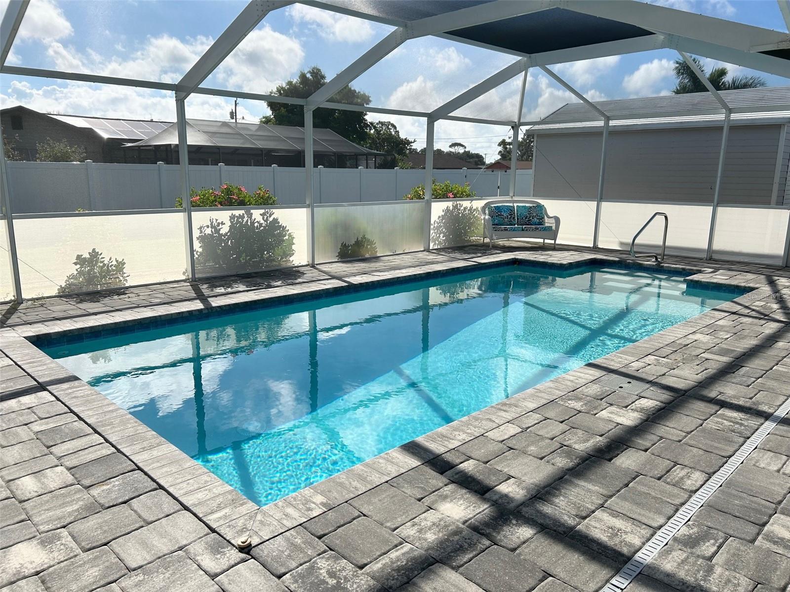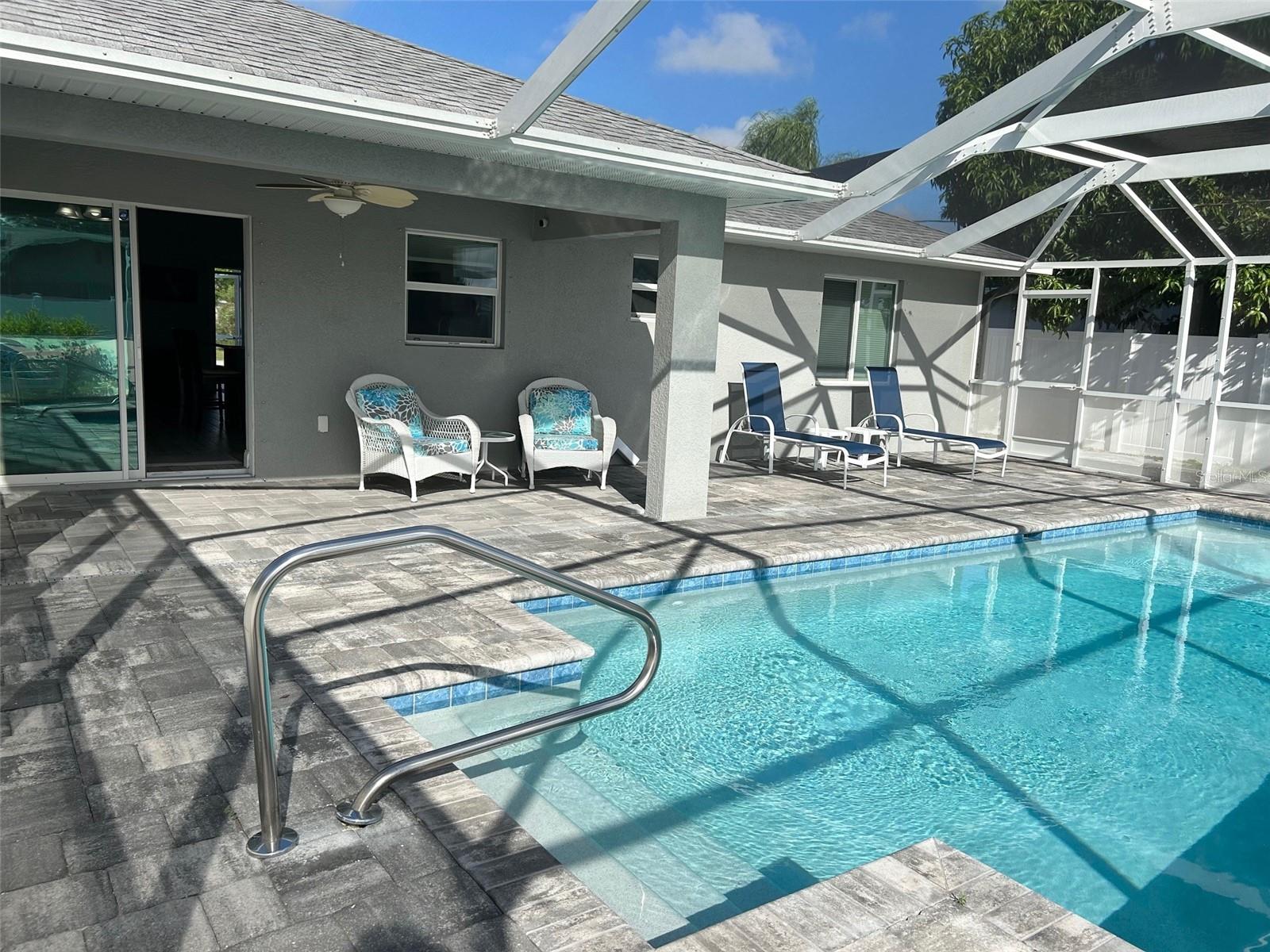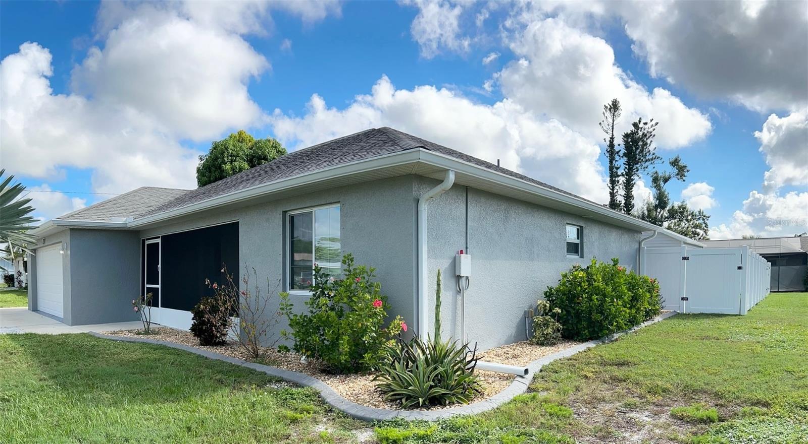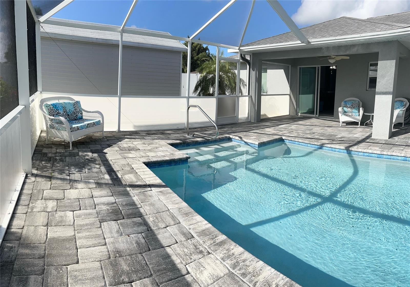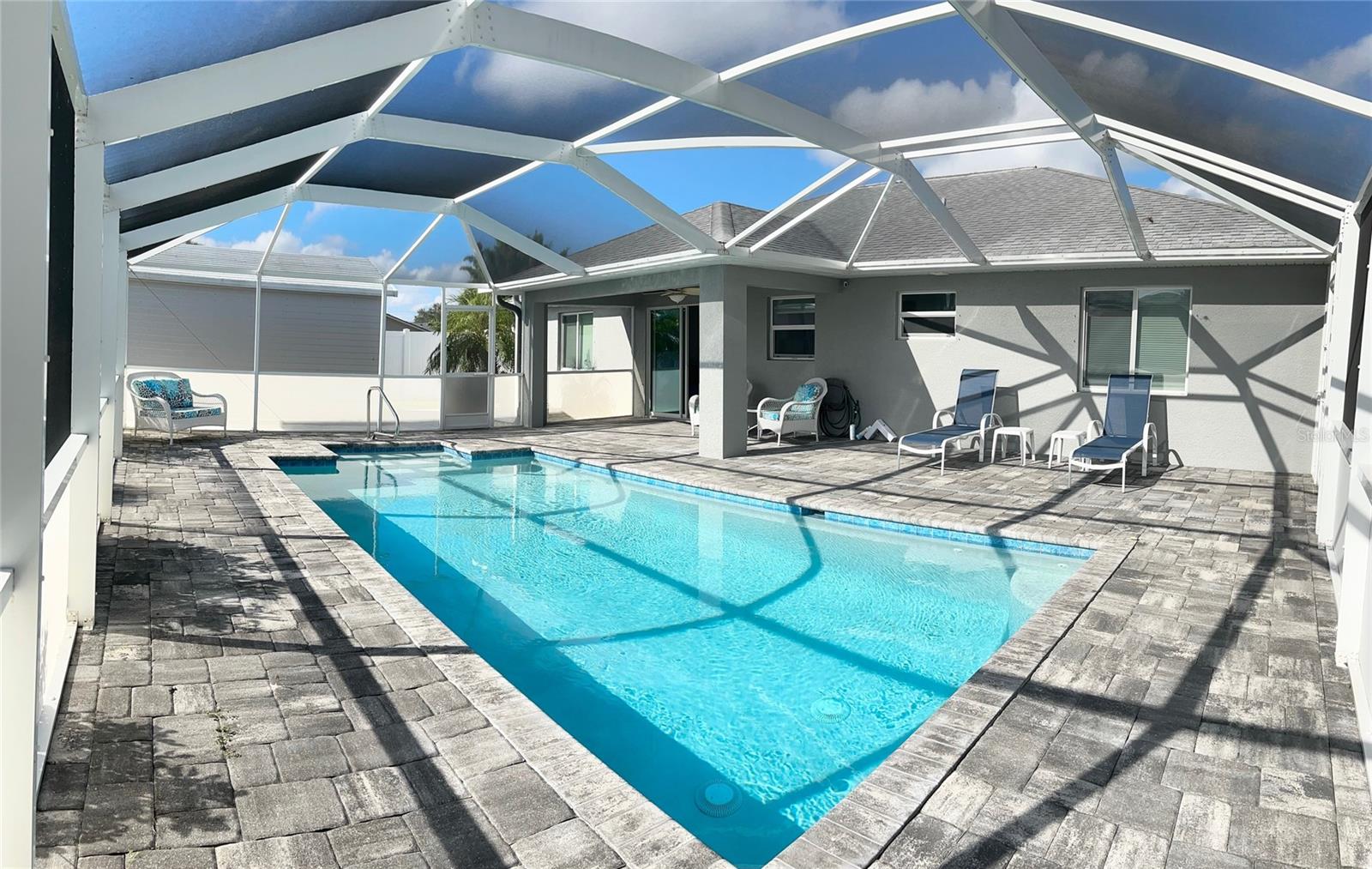 NEW Price!! WOW! Beautiful 2017 POOL HOME on a large corner lot ready for you! As you pull in your driveway, notice the large Extra parking pad, the Tropical Bismarck palm tree and landscape curbing. Come on in! Large screened, front entry porch with pebble tech flooring leads to your NEW home. Open floor plan, high ceilings, specialty lighting and fans. Plank ceramic tile thru all main areas. Living room opens to specialty kitchen with breakfast bar and dining area. Kitchen has closet pantry, wood, soft close cabinets, Granite countertops, tiled backsplash. The Dining area with sliders to the covered lanai area and Gorgeous saltwater, heated POOL! Split bedrooms, Master BR has a pool view. Lovely trey ceiling, Large walk-in closet w pocket door and Master bath. Wow, Gorgeous tiled shower with mosaic pebble floor. Comfort height vanity with granite top. Bedroom two and three on the other side with hall linen closet & full hall bath. The Large laundry room has shelving, cabinets & wash sink is located by the MBR. The 2 car garage has AC/heat mini split system, pebble-tech flooring. Side door goes out to the 20x10 parking pad. Additional 200 sq ft of paved parking. Large backyard, vinyl Fenced leads to Refreshing (25x12) SALTWATER Pool which was added in 2020. w electric heater. Pool cage, Screened-in lanai has a covered seated area. There is a Large shed & paver patio. Home has Coded front entry door. Security system in place. Nothing to do but ENJOY!!