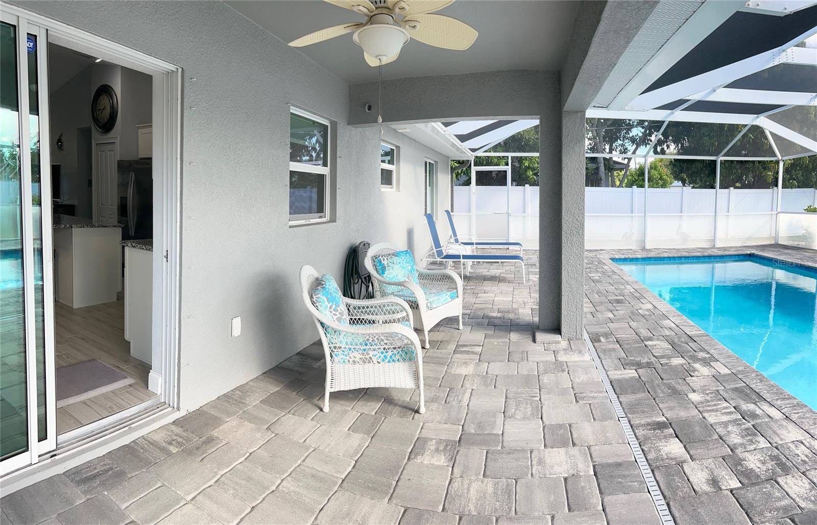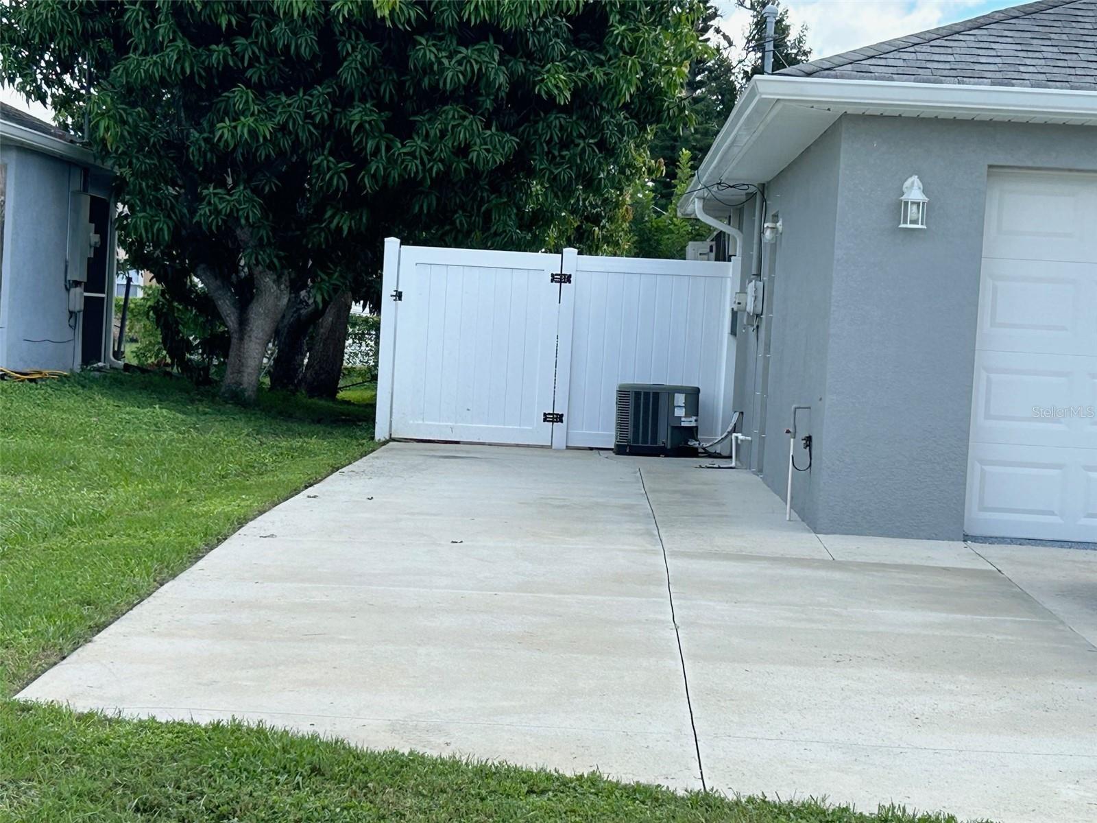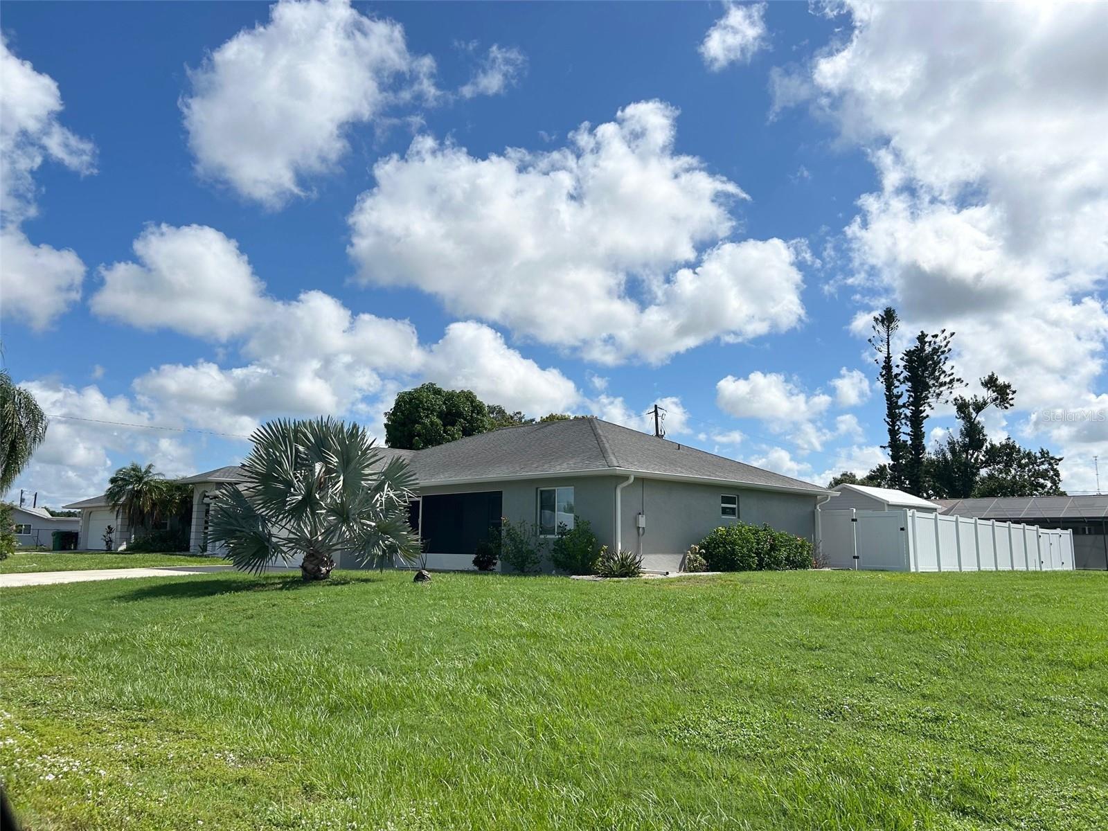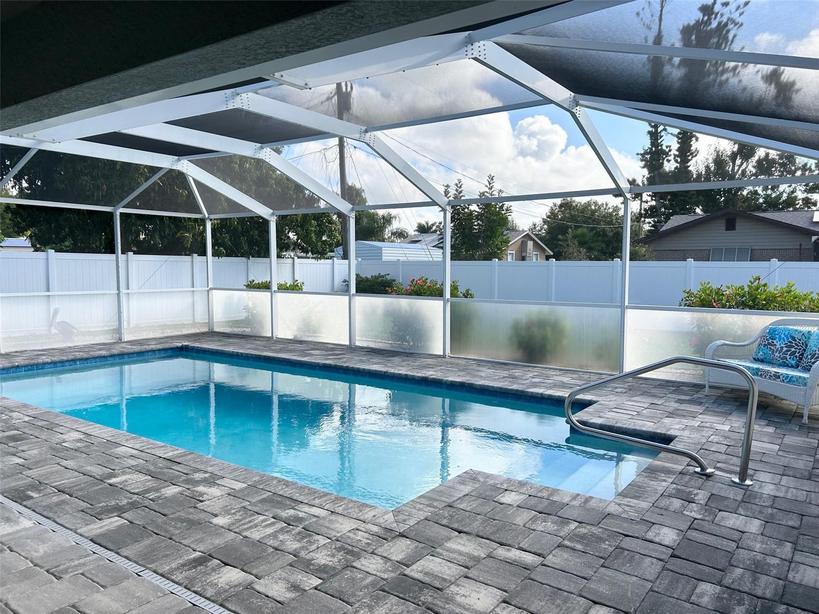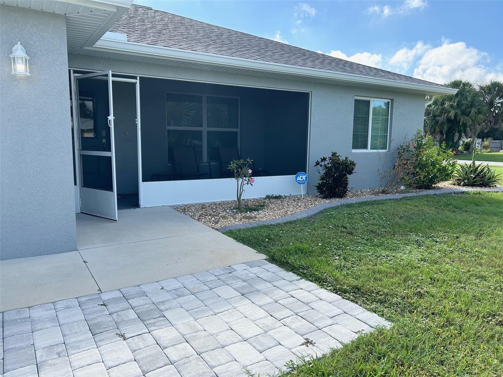 NEW Price!! WOW! Beautiful 2017 POOL HOME on a large corner lot ready for you! As you pull in your driveway, notice the large Extra parking pad, the Tropical Bismarck palm tree and landscape curbing. Come on in! Large screened, front entry porch with pebble tech flooring leads to your NEW home. Open floor plan, high ceilings, specialty lighting and fans. Plank ceramic tile thru all main areas. Living room opens to specialty kitchen with breakfast bar and dining area. Kitchen has closet pantry, wood, soft close cabinets, Granite countertops, tiled backsplash. The Dining area with sliders to the covered lanai area and Gorgeous saltwater, heated POOL! Split bedrooms, Master BR has a pool view. Lovely trey ceiling, Large walk-in closet w pocket door and Master bath. Wow, Gorgeous tiled shower with mosaic pebble floor. Comfort height vanity with granite top. Bedroom two and three on the other side with hall linen closet & full hall bath. The Large laundry room has shelving, cabinets & wash sink is located by the MBR. The 2 car garage has AC/heat mini split system, pebble-tech flooring. Side door goes out to the 20x10 parking pad. Additional 200 sq ft of paved parking. Large backyard, vinyl Fenced leads to Refreshing (25x12) SALTWATER Pool which was added in 2020. w electric heater. Pool cage, Screened-in lanai has a covered seated area. There is a Large shed & paver patio. Home has Coded front entry door. Security system in place. Nothing to do but ENJOY!!