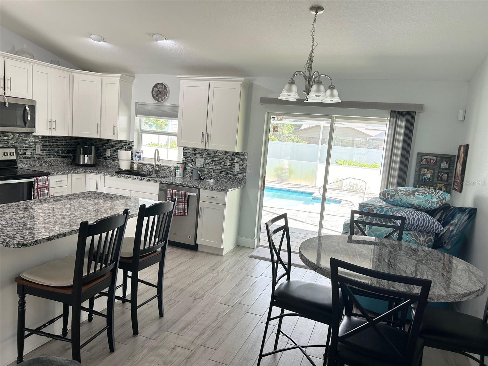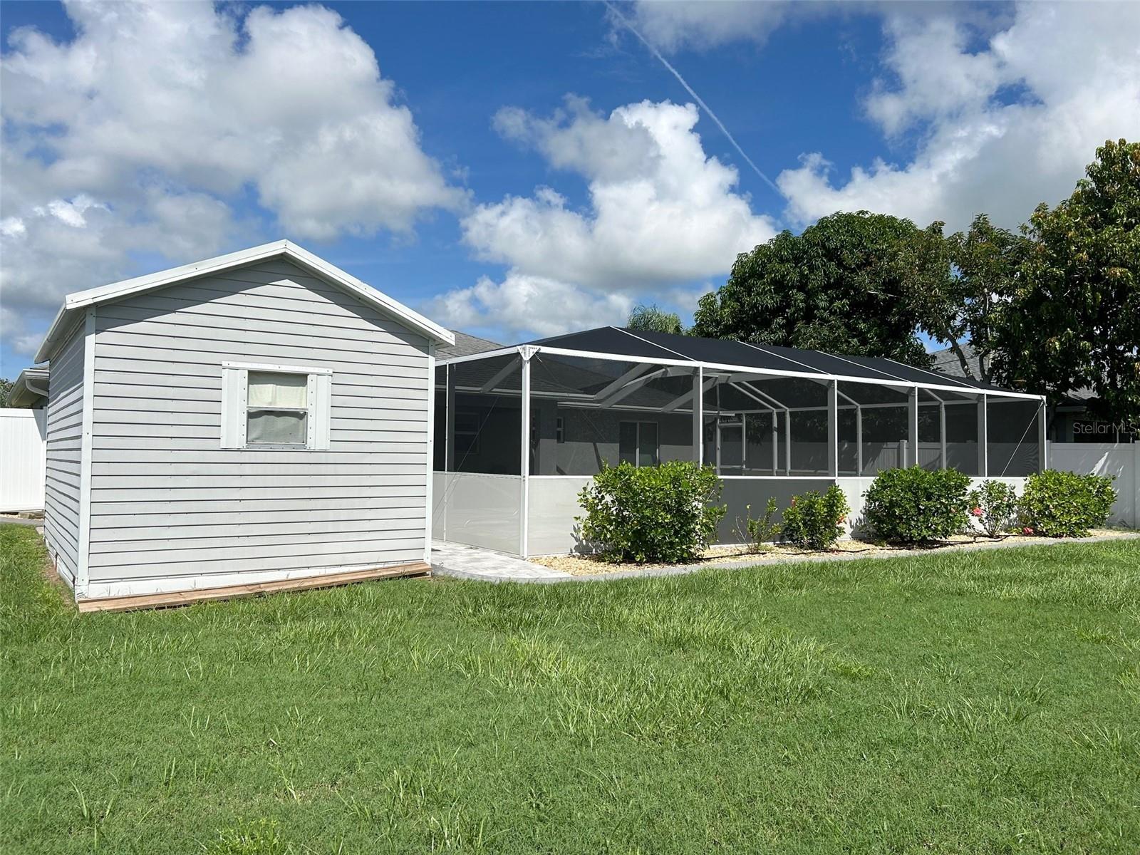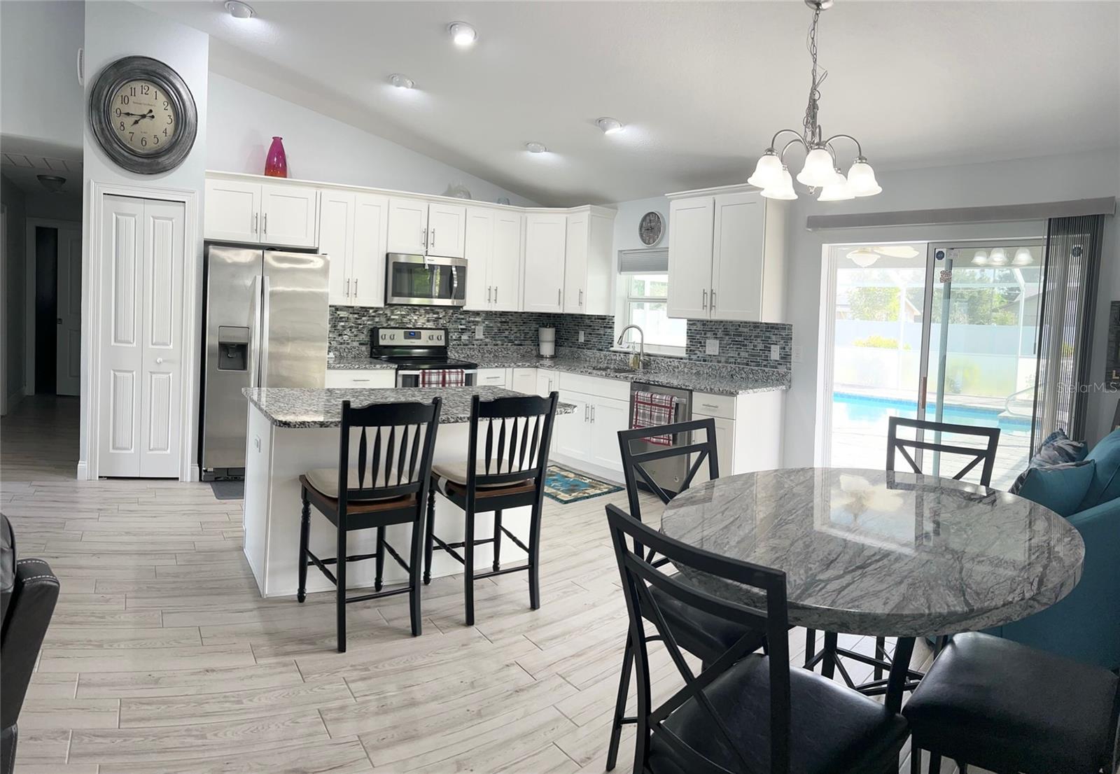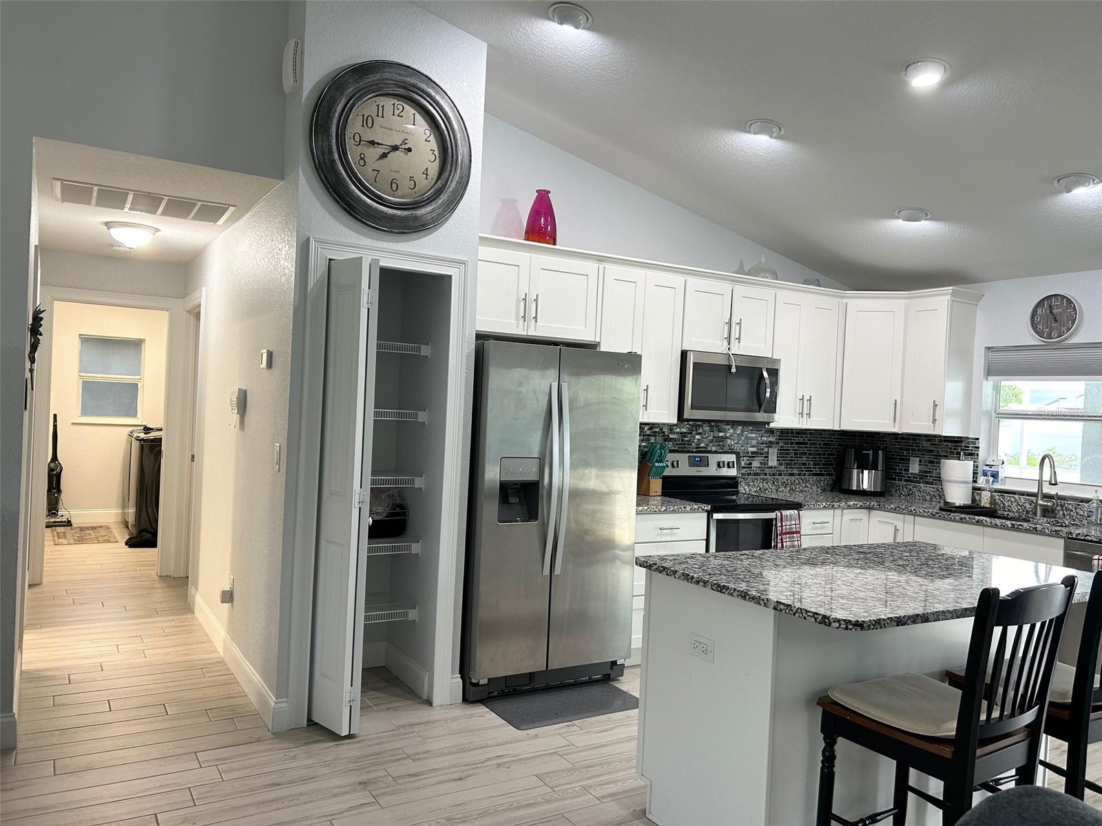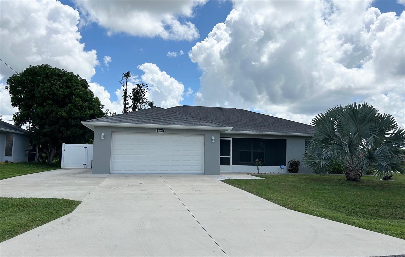 NEW Price!! WOW! Beautiful 2017 POOL HOME on a large corner lot ready for you! As you pull in your driveway, notice the large Extra parking pad, the Tropical Bismarck palm tree and landscape curbing. Come on in! Large screened, front entry porch with pebble tech flooring leads to your NEW home. Open floor plan, high ceilings, specialty lighting and fans. Plank ceramic tile thru all main areas. Living room opens to specialty kitchen with breakfast bar and dining area. Kitchen has closet pantry, wood, soft close cabinets, Granite countertops, tiled backsplash. The Dining area with sliders to the covered lanai area and Gorgeous saltwater, heated POOL! Split bedrooms, Master BR has a pool view. Lovely trey ceiling, Large walk-in closet w pocket door and Master bath. Wow, Gorgeous tiled shower with mosaic pebble floor. Comfort height vanity with granite top. Bedroom two and three on the other side with hall linen closet & full hall bath. The Large laundry room has shelving, cabinets & wash sink is located by the MBR. The 2 car garage has AC/heat mini split system, pebble-tech flooring. Side door goes out to the 20x10 parking pad. Additional 200 sq ft of paved parking. Large backyard, vinyl Fenced leads to Refreshing (25x12) SALTWATER Pool which was added in 2020. w electric heater. Pool cage, Screened-in lanai has a covered seated area. There is a Large shed & paver patio. Home has Coded front entry door. Security system in place. Nothing to do but ENJOY!!