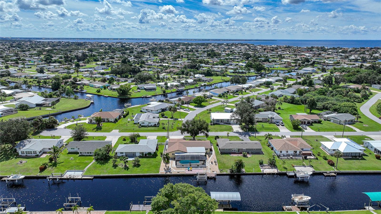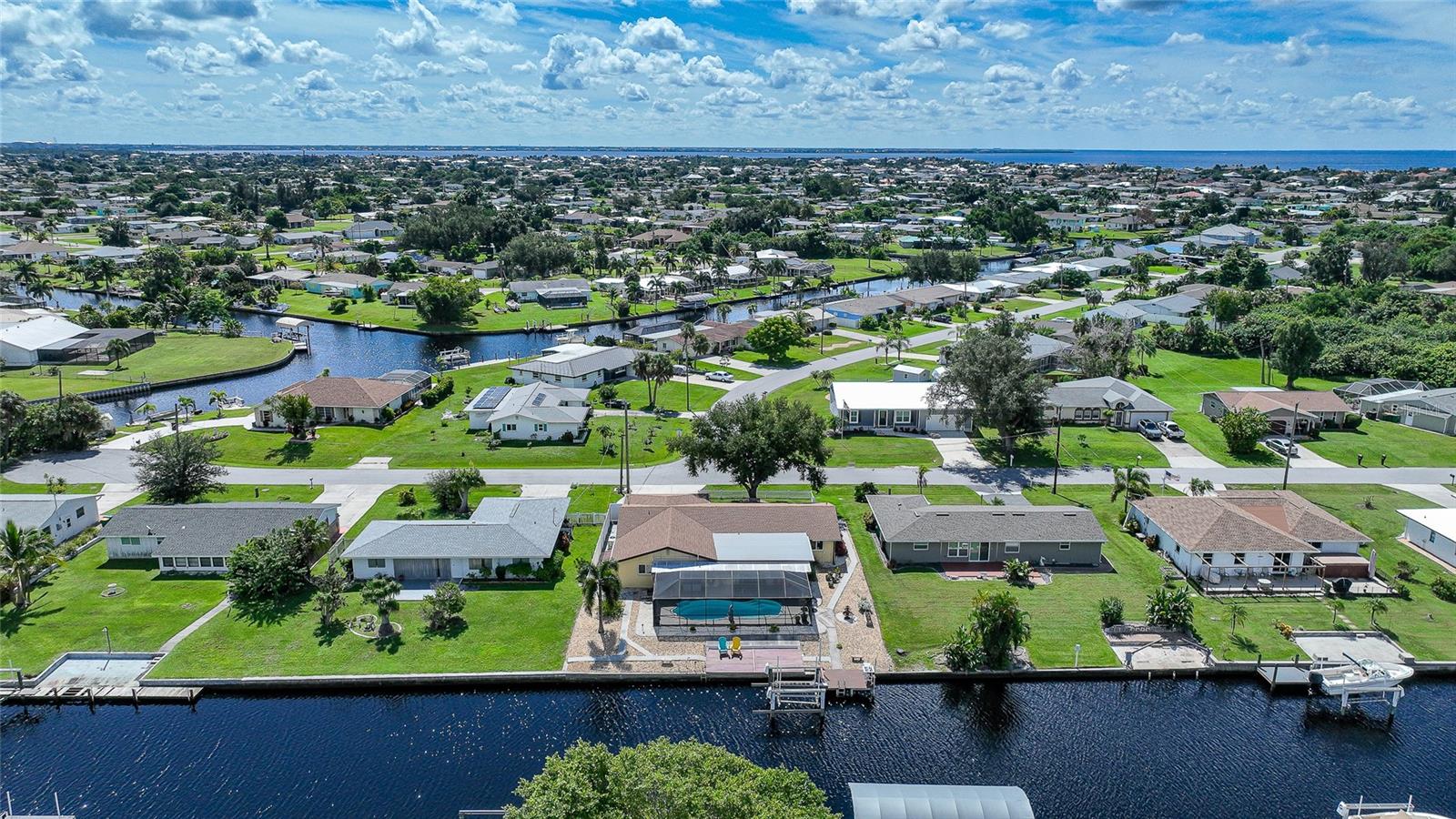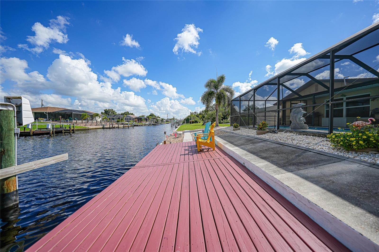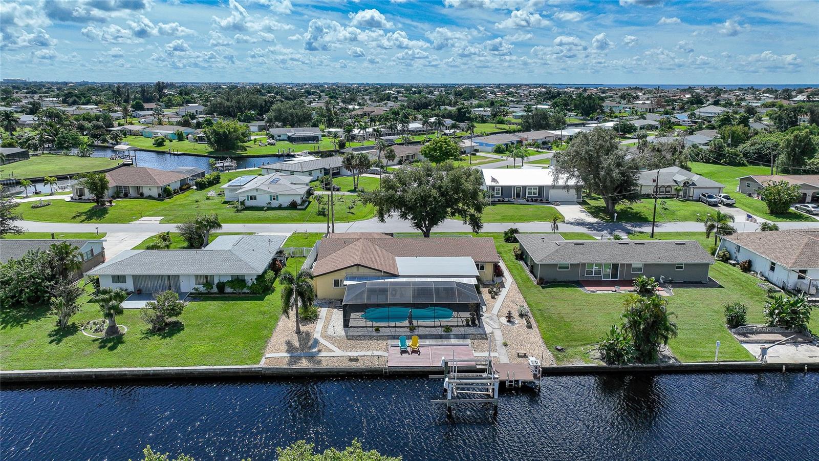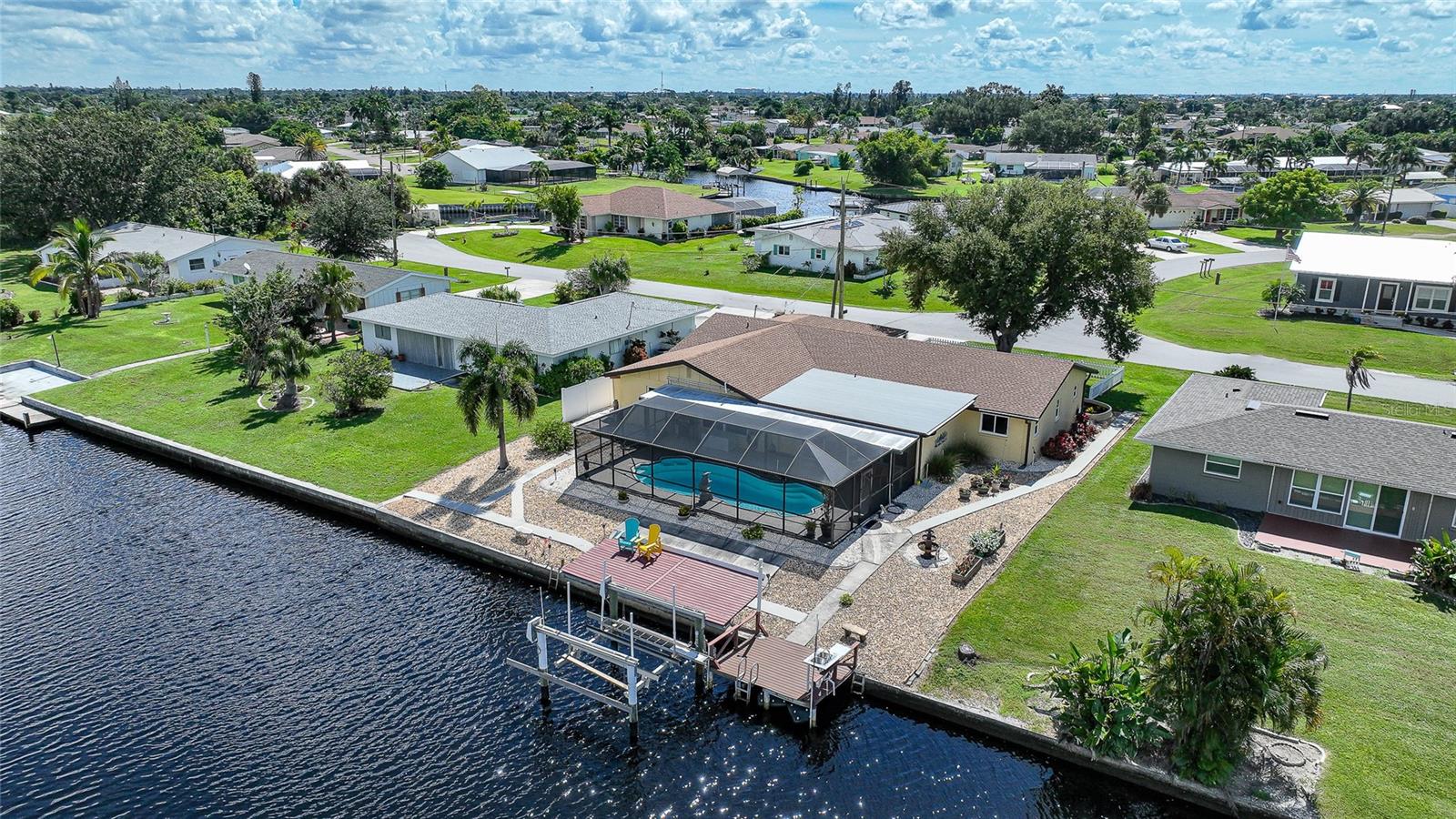 BOATERS DREAM - 5 MINUTES FROM CHARLOTTE HARBOR WITH ACCESS TO THE GULF OF MEXICO! This METICULOUSLY MAINTAINED 3/3/2 POOL home sprawls 2650+ square feet and features a LARGE suite that could easily serve as a 2ND PRIMARY BEDROOM OR HOME OFFICE. The inside of the property boasts a large galley kitchen RECENTLY UPDATED with stylish Corian countertops and custom-made roll-out soft close cabinetry, new backsplash + a pass-through window to the Living Room. NEW Vinyl and Tile flooring throughout the home + charming plantation shutters. The living room is very open featuring a decorative fireplace and built in shelving. Both secondary bedrooms are VERY spacious. HUGE LAUNDRY ROOM + EXTENDED 2 CAR GARAGE with built in storage. The OUTSIDE of the property features a LARGE POOL, 12x24 Composite dock outfitted with an 8000 POUND BOAT LIFT, Concrete walkway around the property, new rock landscaping that will need very little lawn maintenance, recently spray foamed concrete seawall (with approximately 9 years left on the warranty), NEWER FENCE, Irrigation system, Storage shed + MORE. RECENTLY PAINTED EXTERIOR - NEW ROOF (2022) - NEW SOFFIT & FASCIA (2022) - NEW GUTTERS (2022) - NEW DOWNSPOUTS (2022) - IMPACT WINDOWS (DEC. 2020). NO HOA, NO DEED RESTRICTIONS. CITY WATER + CITY SEWER. ASSUMABLE FLOOD INSURANCE POLICY AVAILABLE UPON REQUEST. TV's can stay with the property. This home is located in the heart of Port Charlotte close to lots of Shopping, restaurants, medical offices, hospitals and more. Downtown Punta Gorda and Sunseeker Resort are less than 10 minutes away. Call your agent today for a showing. Trust me, you need to see this one! Be sure to view the 3D VIRTUAL TOUR.