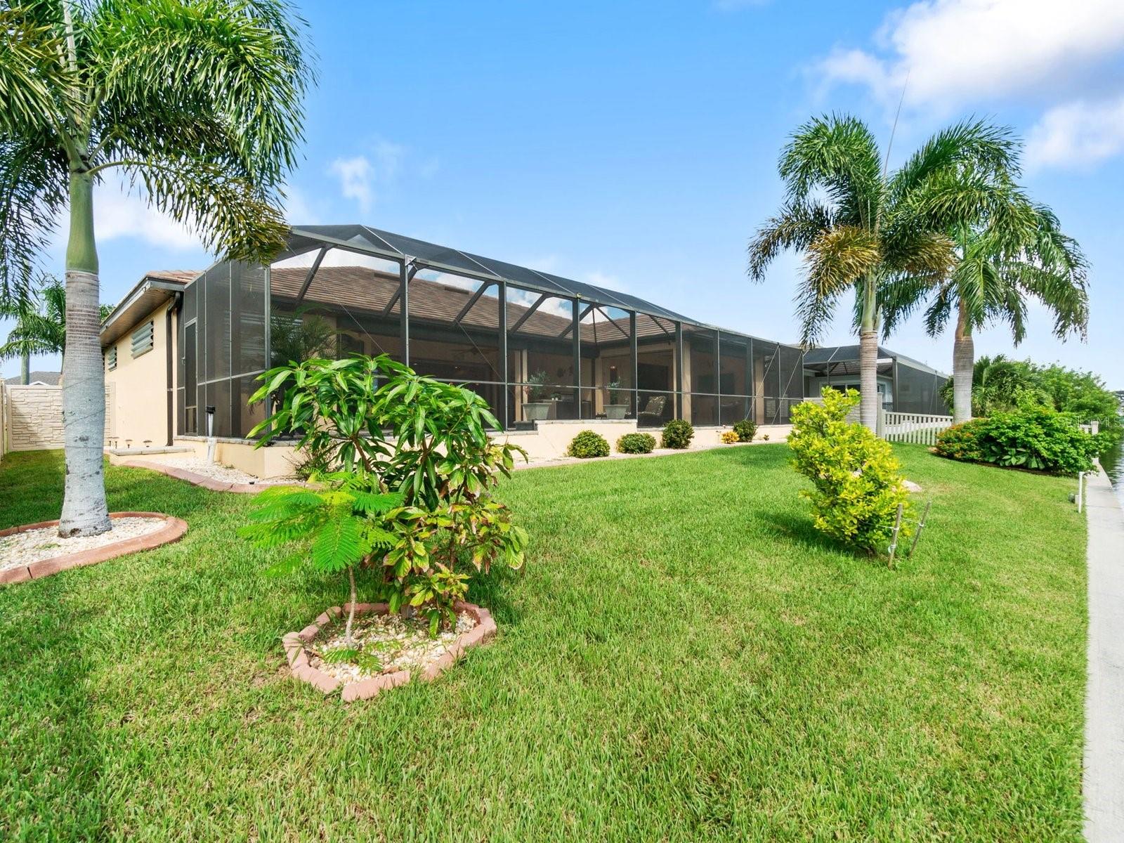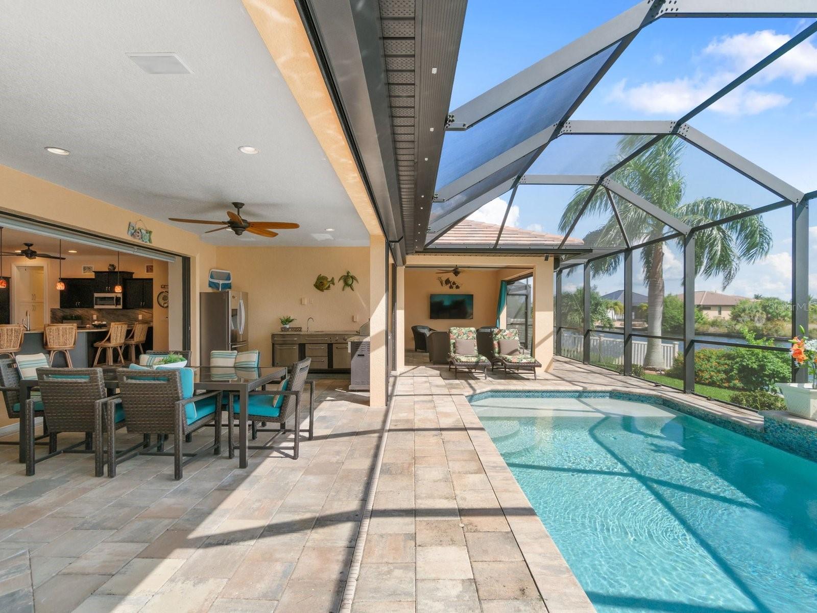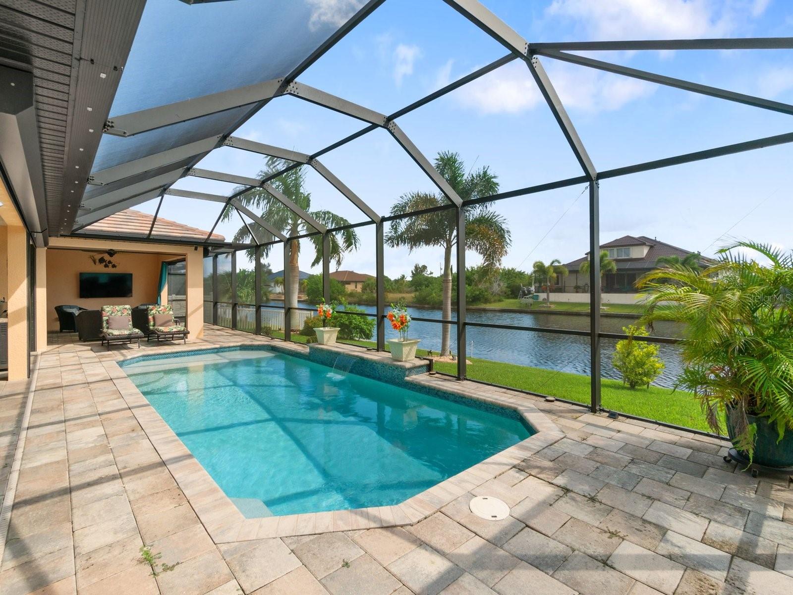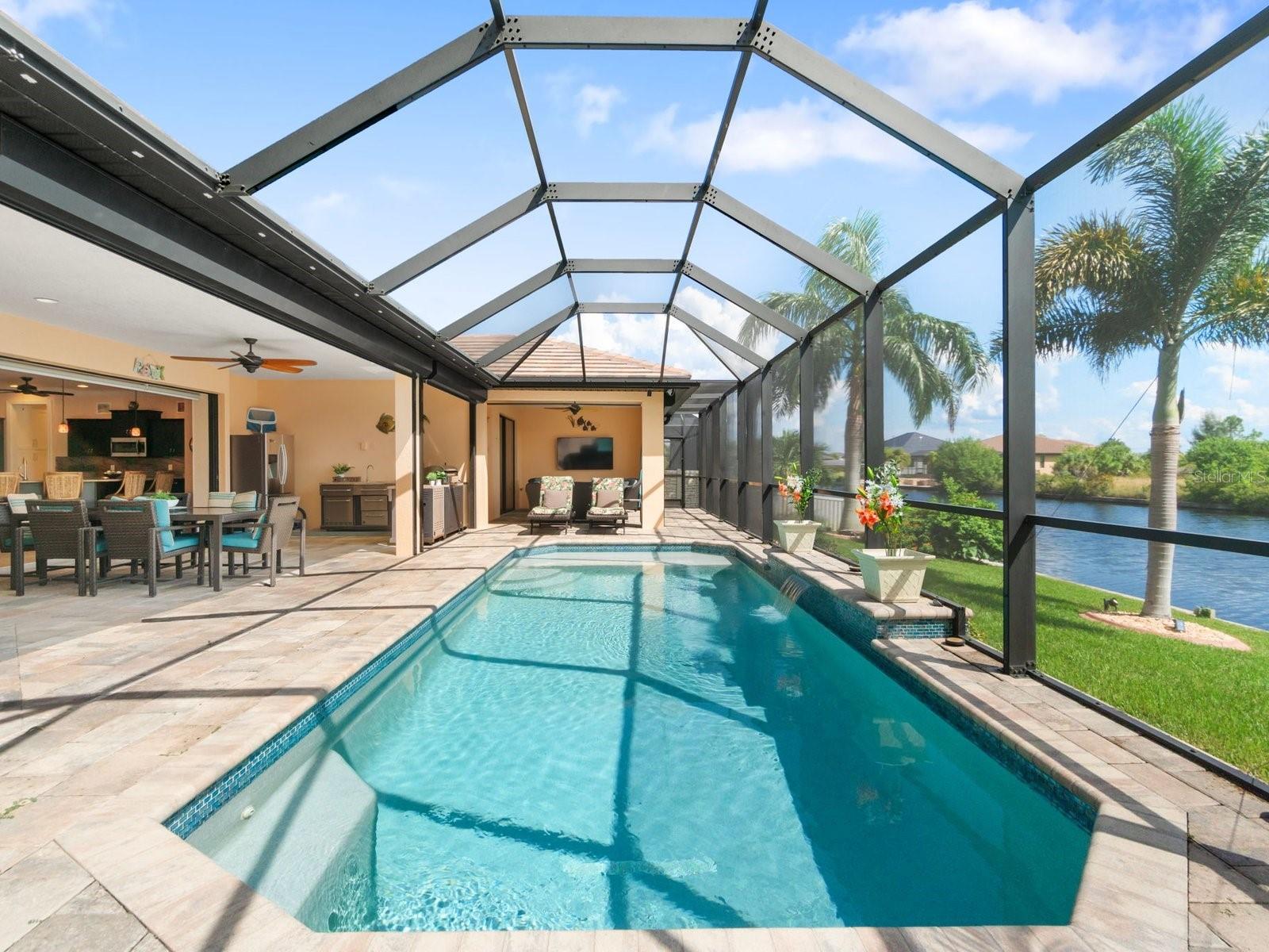 Experience luxury living in this stunning Gulf-access waterfront pool home, ideally situated with southern exposure in the highly sought-after South Gulf Cove community. This Custom-Built Harbor Home features 3 Bedrooms plus a Den, 3 Full Bathrooms, and a spacious 3-Car Garage. Designed for relaxation and entertainment, the expansive lanai offers multiple seating areas, a heated pool with a waterfall and sun shelf, an outdoor shower, and a fully equipped outdoor kitchen—all set against breathtaking water views with easy boating access to the lagoon, Charlotte Harbor, and the pristine beaches of the Gulf of Mexico. Offered partially furnished, this home allows you to start living your dream immediately. The kitchen is a chef’s delight, boasting newer Samsung stainless steel appliances and a massive, angled island with seating for six. The well-appointed pantry includes a coffee bar, ample storage, a copper prep sink, and custom cabinets with Rev-A-Shelf swingouts. The oversized primary suite is a sanctuary of comfort, featuring a tray ceiling, sliding doors to the lanai and pool, and space for a sitting area. The luxurious ensuite bathroom offers dual sinks, abundant cabinetry and storage, a walk-through porcelain tile shower with a bench, and an expansive walk-in closet with custom shelving and drawers. The attached laundry area includes upgraded washer and dryer units. For ultimate relaxation, unwind in the 6-foot light therapy spa tub, complete with Bluetooth, jets, bubbles, and a thermostat to keep the water temp perfect. Sellers have a Transferable Flood Policy at $1,529 per year. This home is packed with upgrades, including a tile roof with solar vent fans (installed in 2023), fresh interior and exterior paint, a newer water heater, and a 6-foot rock-faced privacy fence. It surpasses new construction with custom features like Low-Emissivity windows, electric roll-down shutters, a generator transfer switch, a water treatment system with reverse osmosis, an I-Wave C air purifier, central vacuum, remote control privacy blinds, custom window treatments, a Taexx pest control system, and a Rainbird irrigation system. South Gulf Cove offers a voluntary HOA with ultra-low dues of just $120 per year, providing access to an air-conditioned clubhouse, WiFi, games, tiki huts, and discounted clubhouse reservations. Several community parks feature a boat ramp, kayak launch, walking paths, fishing docks, picnic shelters, BBQ grills, a playground, and a basketball court. Don’t miss this incredible opportunity to own a one-of-a-kind waterfront home in a vibrant and welcoming community!