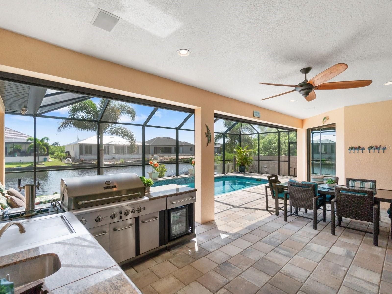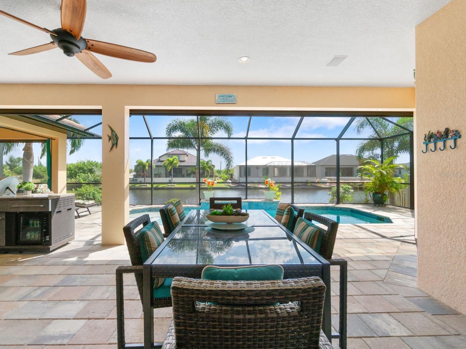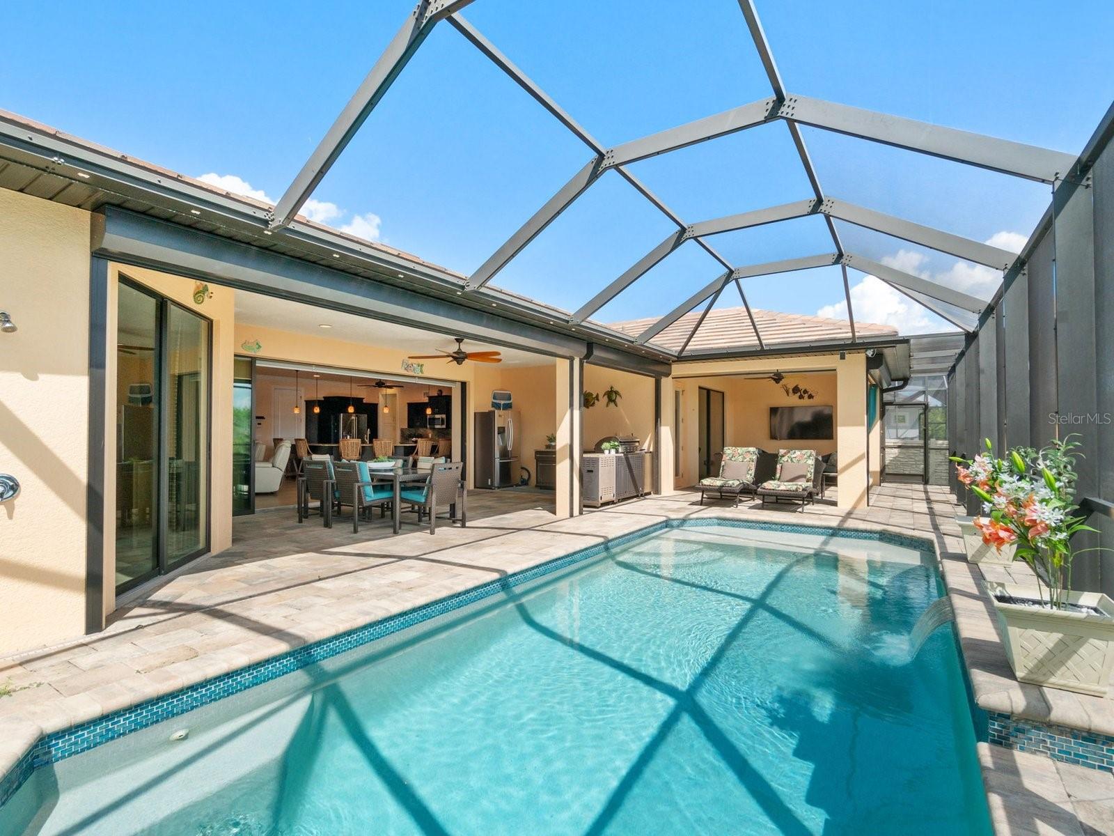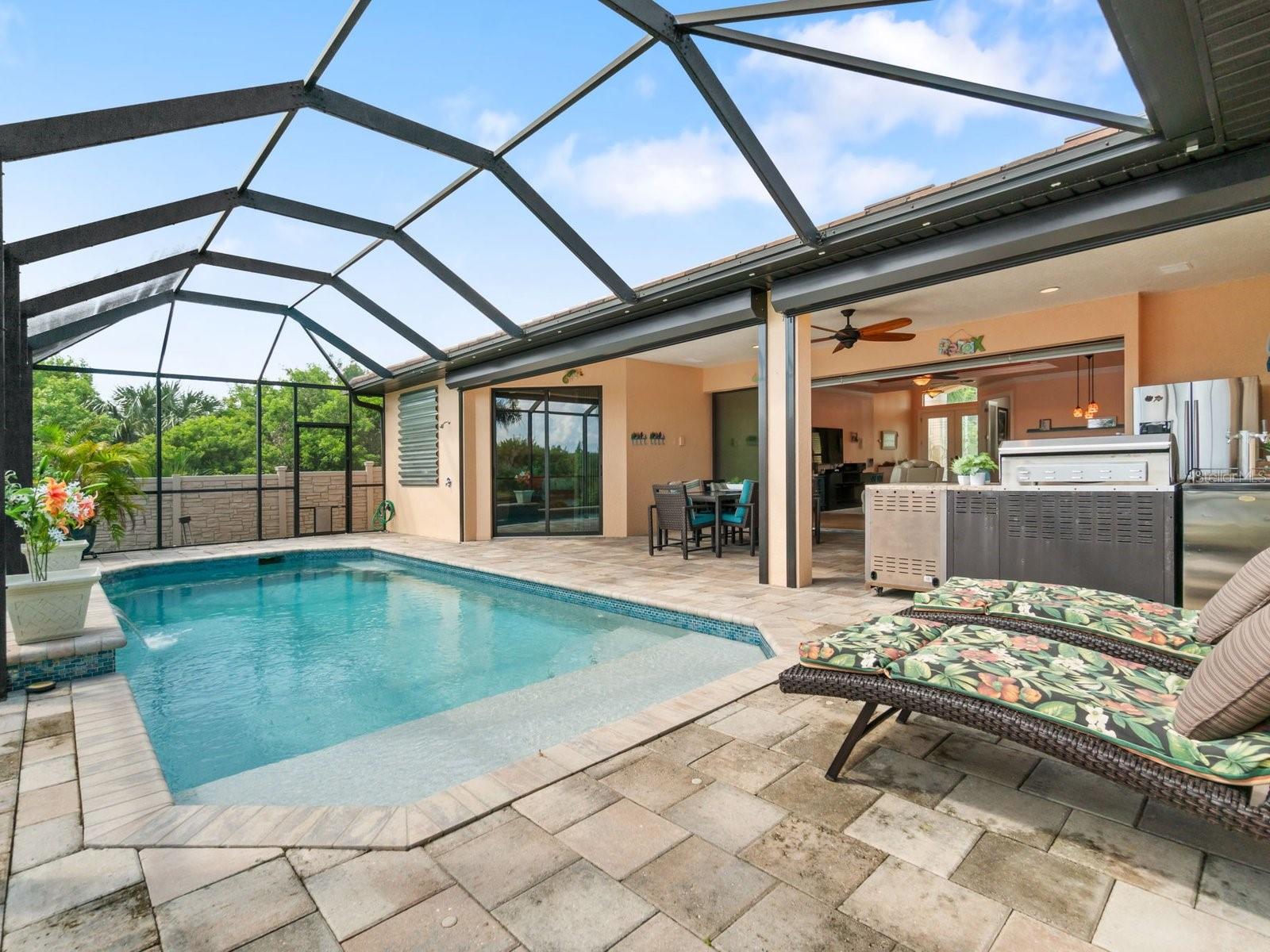 Experience luxury living in this stunning Gulf-access waterfront pool home, ideally situated with southern exposure in the highly sought-after South Gulf Cove community. This Custom-Built Harbor Home features 3 Bedrooms plus a Den, 3 Full Bathrooms, and a spacious 3-Car Garage. Designed for relaxation and entertainment, the expansive lanai offers multiple seating areas, a heated pool with a waterfall and sun shelf, an outdoor shower, and a fully equipped outdoor kitchen—all set against breathtaking water views with easy boating access to the lagoon, Charlotte Harbor, and the pristine beaches of the Gulf of Mexico. Offered partially furnished, this home allows you to start living your dream immediately. The kitchen is a chef’s delight, boasting newer Samsung stainless steel appliances and a massive, angled island with seating for six. The well-appointed pantry includes a coffee bar, ample storage, a copper prep sink, and custom cabinets with Rev-A-Shelf swingouts. The oversized primary suite is a sanctuary of comfort, featuring a tray ceiling, sliding doors to the lanai and pool, and space for a sitting area. The luxurious ensuite bathroom offers dual sinks, abundant cabinetry and storage, a walk-through porcelain tile shower with a bench, and an expansive walk-in closet with custom shelving and drawers. The attached laundry area includes upgraded washer and dryer units. For ultimate relaxation, unwind in the 6-foot light therapy spa tub, complete with Bluetooth, jets, bubbles, and a thermostat to keep the water temp perfect. Sellers have a Transferable Flood Policy at $1,529 per year. This home is packed with upgrades, including a tile roof with solar vent fans (installed in 2023), fresh interior and exterior paint, a newer water heater, and a 6-foot rock-faced privacy fence. It surpasses new construction with custom features like Low-Emissivity windows, electric roll-down shutters, a generator transfer switch, a water treatment system with reverse osmosis, an I-Wave C air purifier, central vacuum, remote control privacy blinds, custom window treatments, a Taexx pest control system, and a Rainbird irrigation system. South Gulf Cove offers a voluntary HOA with ultra-low dues of just $120 per year, providing access to an air-conditioned clubhouse, WiFi, games, tiki huts, and discounted clubhouse reservations. Several community parks feature a boat ramp, kayak launch, walking paths, fishing docks, picnic shelters, BBQ grills, a playground, and a basketball court. Don’t miss this incredible opportunity to own a one-of-a-kind waterfront home in a vibrant and welcoming community!
