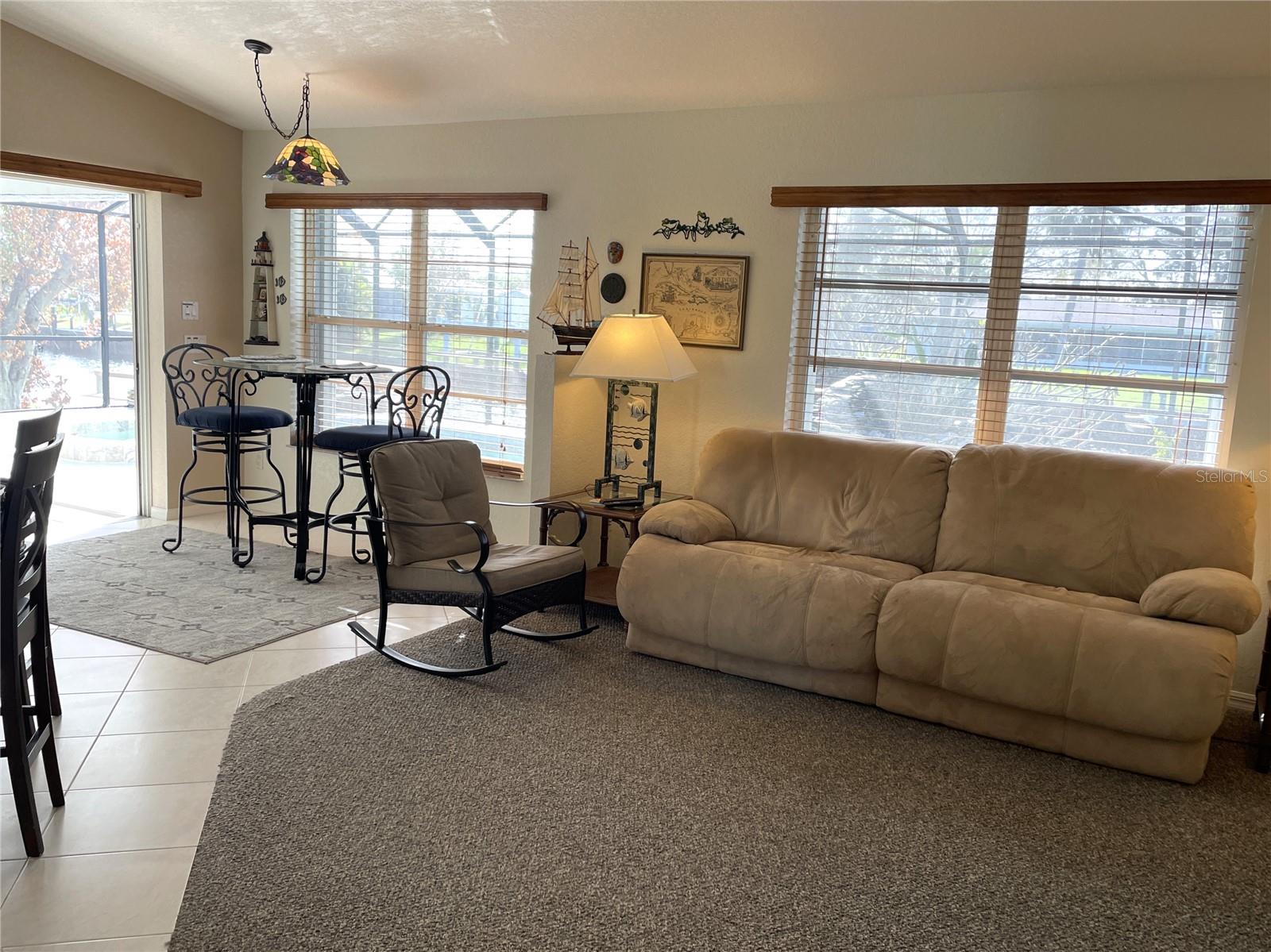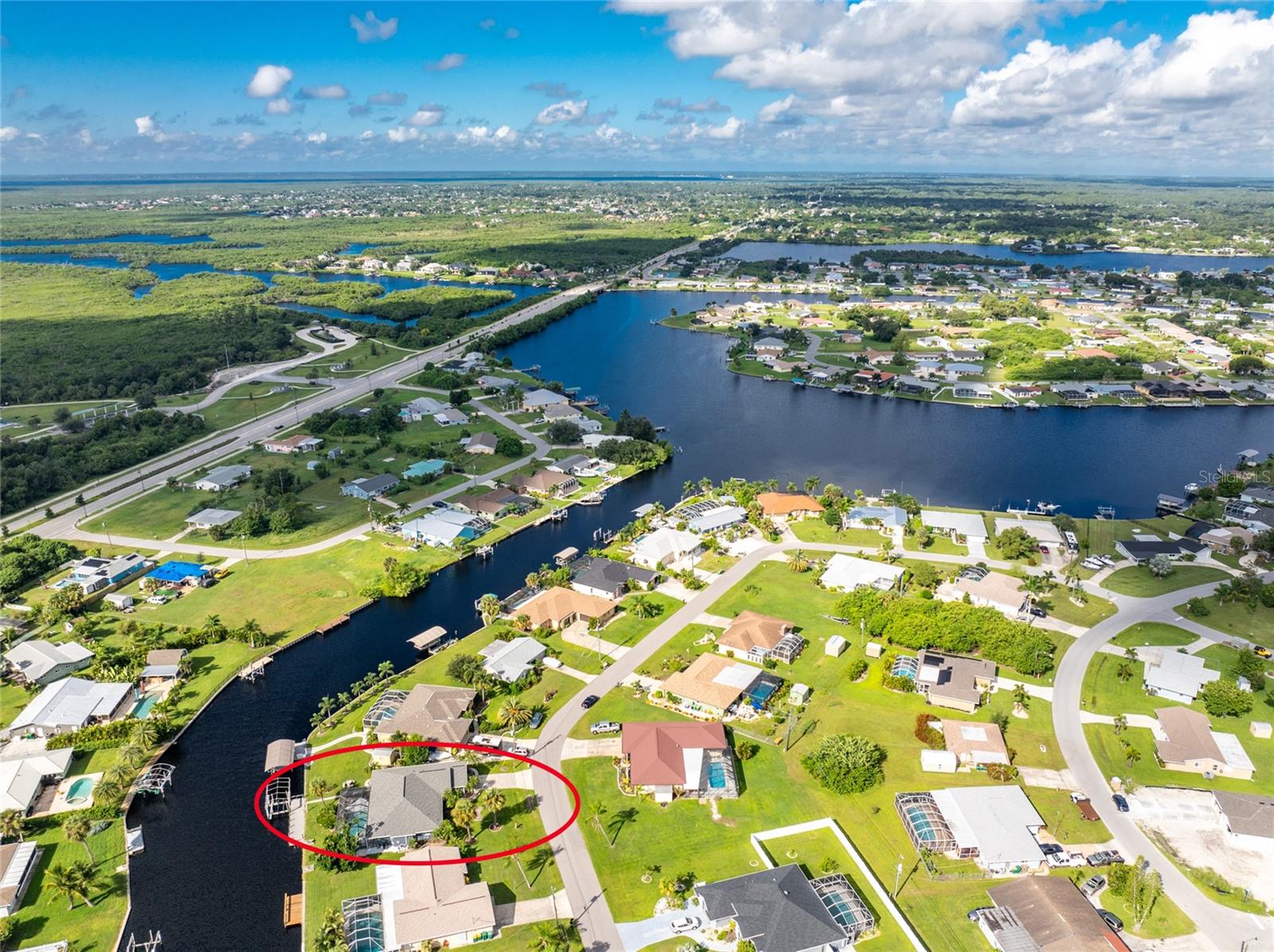 Waterfront home in Lovely Port Charlotte on the Spring Lake Waterway. There is one bridge out, approx. 10-15 min. to Charlotte Harbor that takes you to the Peace and Myakka Rivers and the Gulf of Mexico. This 1889sf under air, 3/2/2, split floor plan home is connected to county water and sewer. This pool home is well maintained and has fabulous updates. This home boasts high ceilings, the front window in the Living Room is hurricane impact with electronic blinds. The 82" wall mounted TV conveys with the home. The Dining Room has a plant shelf with up lighting, and sliders to the outdoor living space. The Master Bedroom is off off the Dining Room. It has 2 walk-in closets and an updated bathroom with 2 sinks and a walk-in shower. There is also a window to allow in natural light. There are sliders out to the pool. The Guest bedrooms, 2nd bathroom, and Laundry Room are on the opposite side of the home. The Guest Bathroom is located between the 2 bedrooms. It has a tub/shower and large vanity for additional storage. The 2nd and 3rd bedrooms are spacious and private. The Laundry Room has a very large closet, cabinets, shelves, and a wash tub. The washer and dryer convey with the home. There is a screen door out to the oversized garage. The Kitchen, Dinette and Family share a space in the back of the home. The dishwasher was replaced 2024 and microwave 2022, The Kitchen has white cabinets and Corian counter tops. There is a large island with plenty of seating. Beyond the island is the Dinette area that overlooks the pool and canal. There are sliders out to the huge under roof/ screened outdoor living space. The Family Room also has a great view of the water. Most of the rooms have ceiling fans. Additional is seating in the backyard near the canal makes a great place to hang out. There is a seawall along the canal with access to water and electric near the dock. the seawall was re-enforced (pumped behind the seawall) with Polyurethane in 2024. The 8x40 composite dock was replaced in 2017. There is a lift that has framing for a cover. The owner doesn't know the lift size. I am guessing the lift to be 10K. I am trying to verify. The large pool/spa has a pretty waterfall feature that also offers some privacy on the Lanai, a pool heater, and expansive cool deck finish. A sidewalk is around the home. The security system is owned. There are accordion shutters across the back of the home. Come see this beautiful home and fall in love! Some furnishings can convey at the right price. Roof was replaced 2022, A/C 2021, Hot Water heater 2021, Front Window 2020, Garage door 2004.
