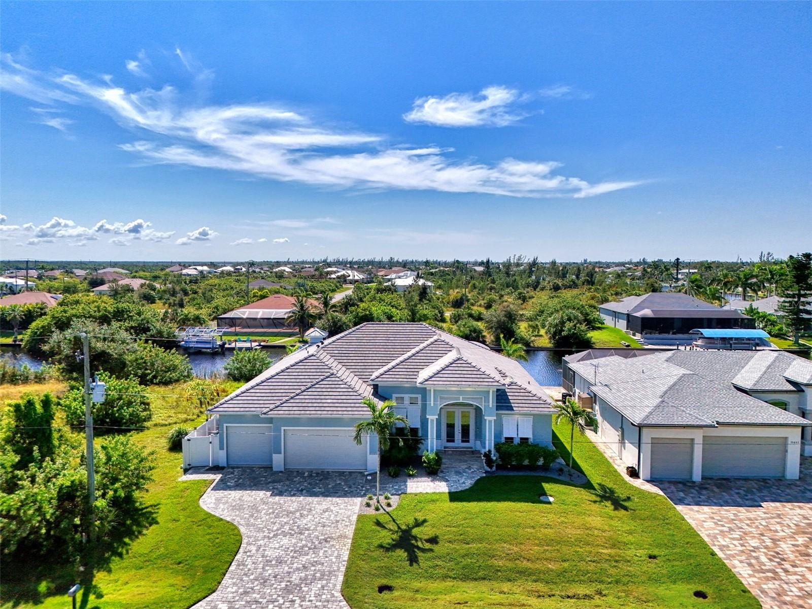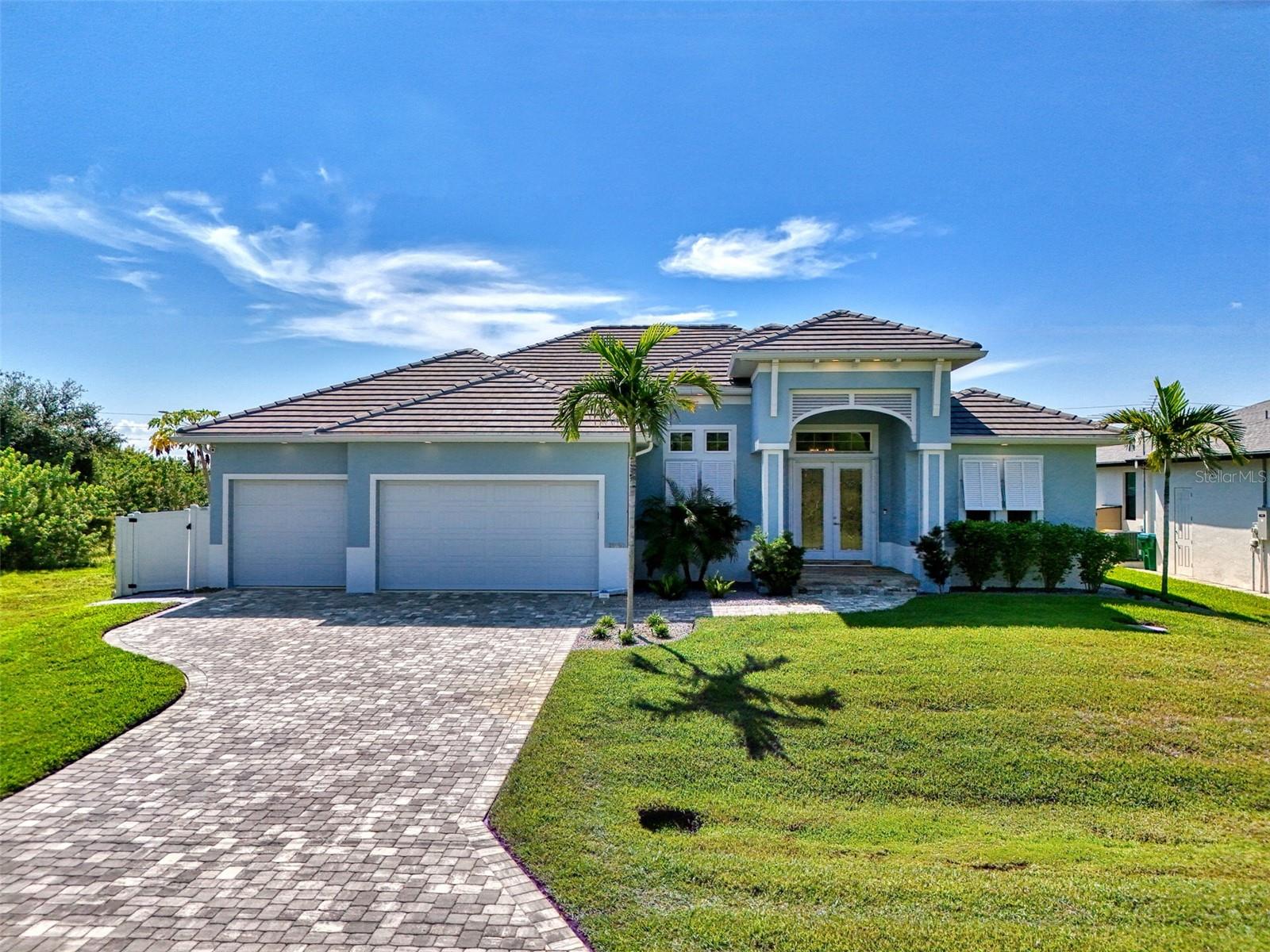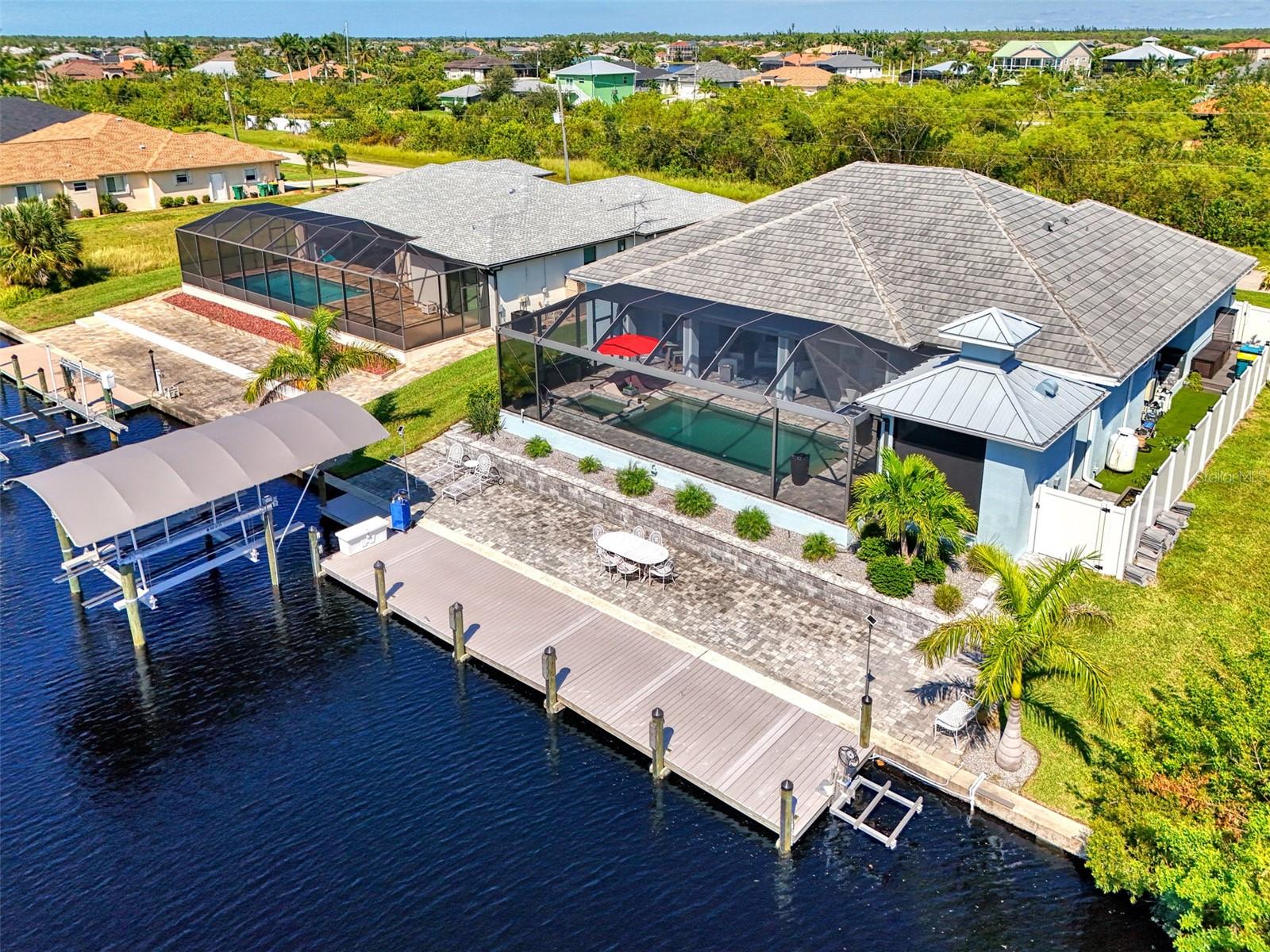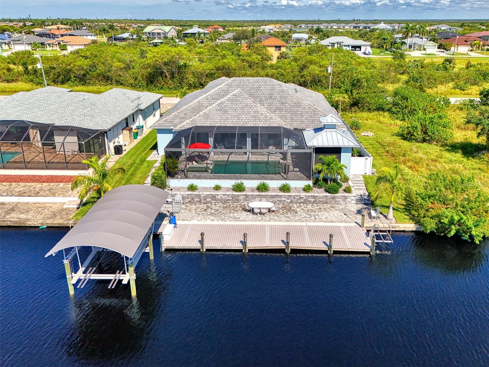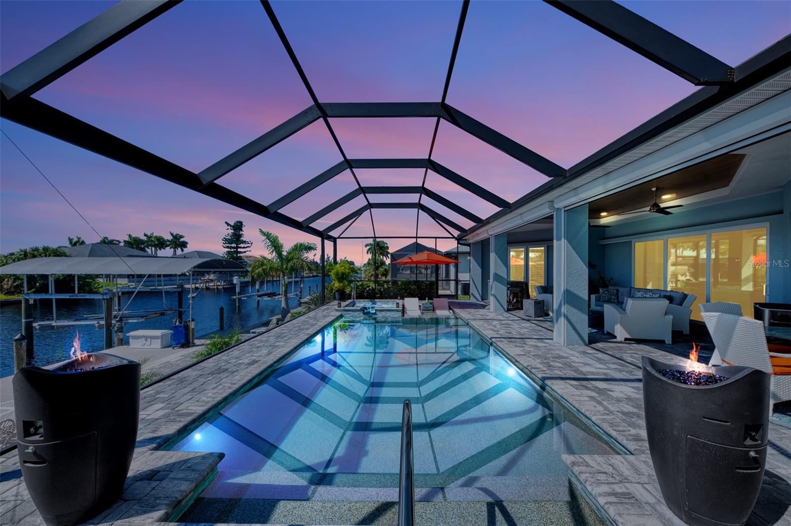 One or more photos has been digitally staged. Location! Location! Location! Don’t miss this 2020-built CUSTOM MINI ESTATE WATERFRONT POOL HOME WITH SAILBOAT ACCESS offering quick boating access to Charlotte Harbor and the Gulf of Mexico! (no bridges to go under!) This stunning 3-bedroom, 3-bathroom 3 car spacious garage pool home with Tile roof and a private Office (which can serve as a 4th bedroom) was built by the prestigious Luke Brothers Custom Homes. It's packed with luxury features, and every detail has been thoughtfully crafted for the ultimate Florida lifestyle. As you step onto the paver driveway and walkway, you’ll be captivated by the impressive entryway. Double leaded glass doors lead you into a grand foyer, where your eyes will immediately be drawn to the sparkling saltwater pool and canal views. The pool area features paver decking, a state-of-the-art saltwater heated pool and spa, and a paver walkway that takes you to the incredible 60' composite dock. This dock is fully equipped with 240 electric, a 10,000 lb covered boat lift, a jet ski lift, and an 80' concrete seawall, all set in one of the most desirable locations in South Gulf Cove. Inside the home, the craftsmanship shines with 15' coffered ceilings adorned with Poplar wood, crown molding, and beautiful light fixtures. The grand living space showcases lighted built-in shelving, custom gray Spanish tile flooring, and plantation shutters throughout. The gourmet kitchen is a showstopper, boasting a Cambria Quartz center island, high-end Electrolux stainless steel appliances, convection cooktop, built-in oven, microwave, dishwasher and custom soft-close wood cabinetry with crown molding. A glass tile backsplash and lighted display cabinets add to the kitchen's charm. The master suite is an oasis, with coffered tray ceilings, pool access, and two spacious walk-in closets with built-in shelving. The luxurious master bath offers a large walk-in shower, separate tub, dual sinks, and upgraded granite countertops. Step outside to the cabana with metal roof, where entertaining is a breeze! This outdoor kitchen includes a stainless steel built-in grill, double burner, bar refrigerator, and granite countertops. The pool area is equally stunning with a waterfall, fiber optic color wheel, and fire columns that create a true resort vibe. Additional features include impact windows, Kevlar automatic shutter for the back lanai area, Ring doorbell, a 3-car garage with epoxy floors, smart garage door opener, central vacuum, and an on-demand hot water heater and so much more! The yard is fenced on one side with AstroTurf and a brick paver walkway to the cabana. If you’re into boating, fishing, or just love the water, this home is minutes from Boca Grande with easy access to Charlotte Harbor and the Gulf. Call us today for a private showing—you’ll be glad you did!