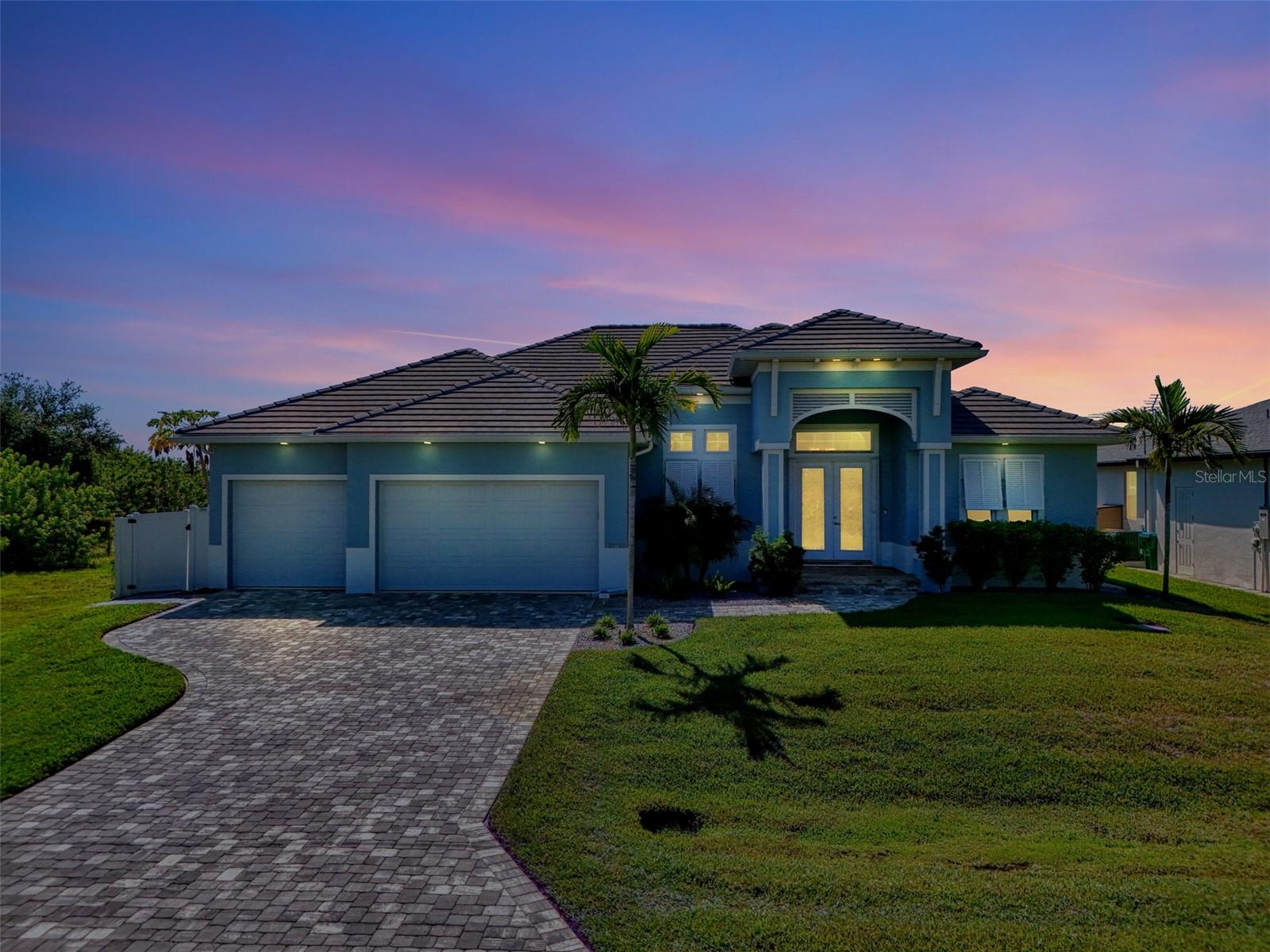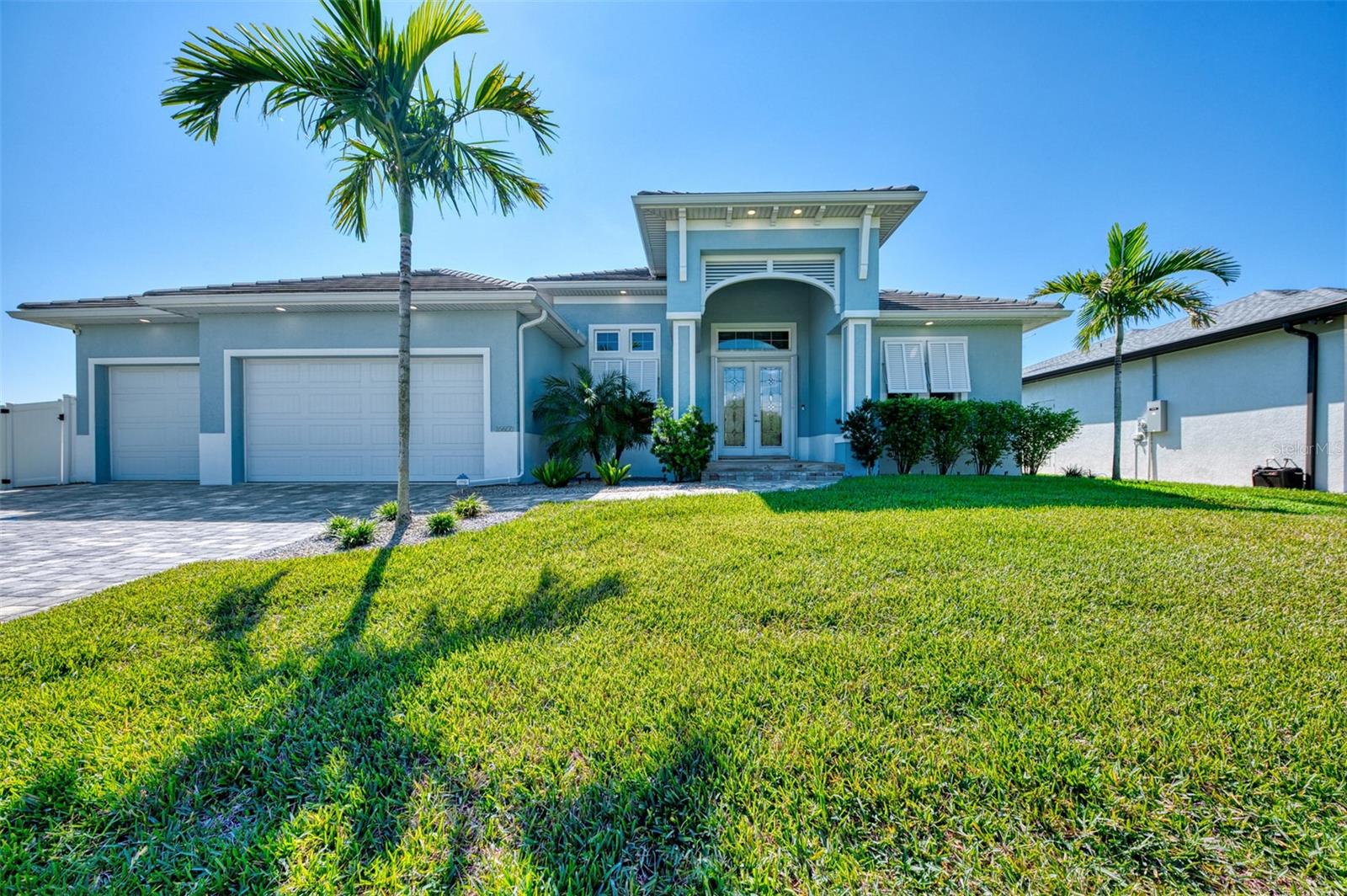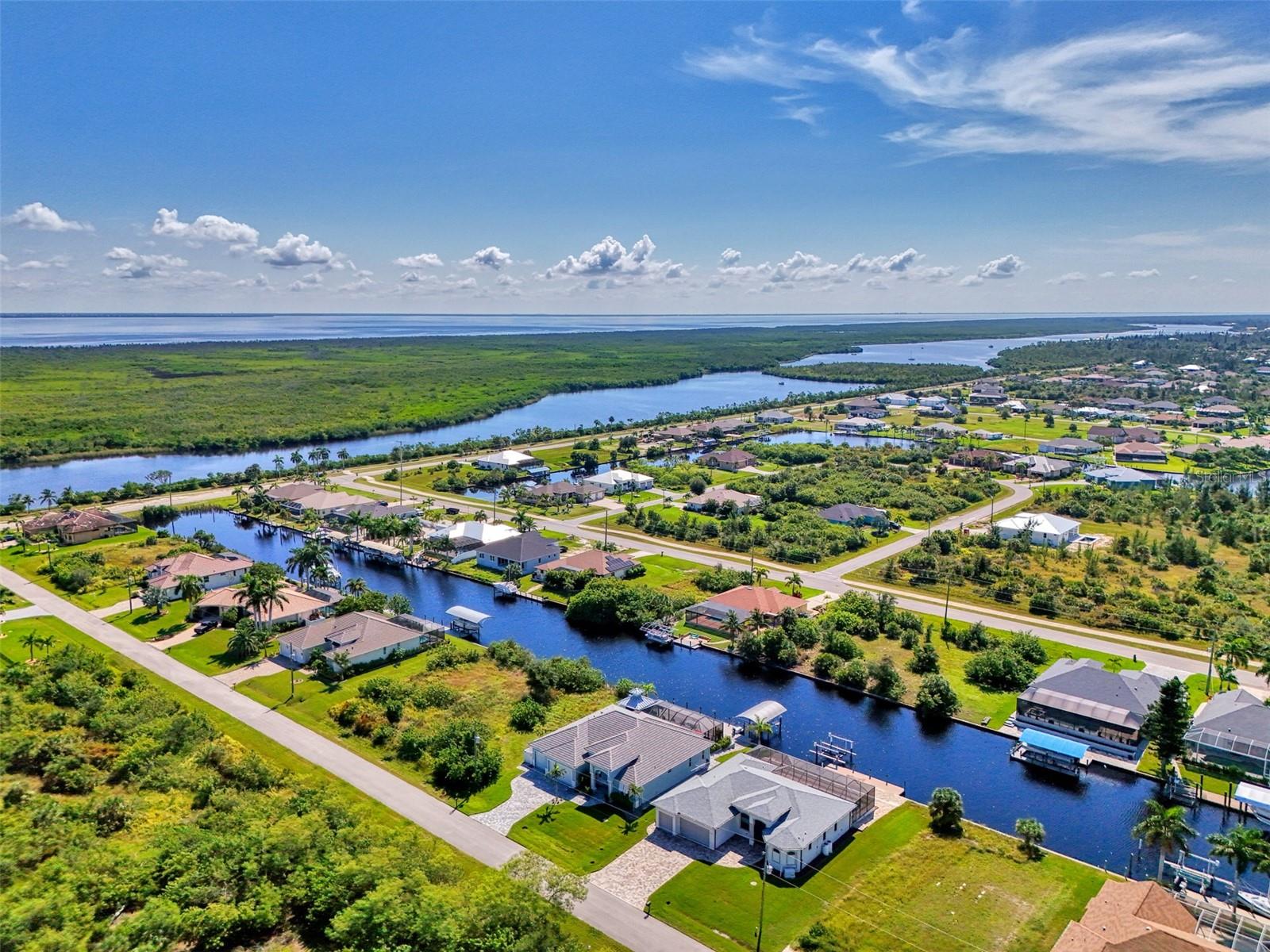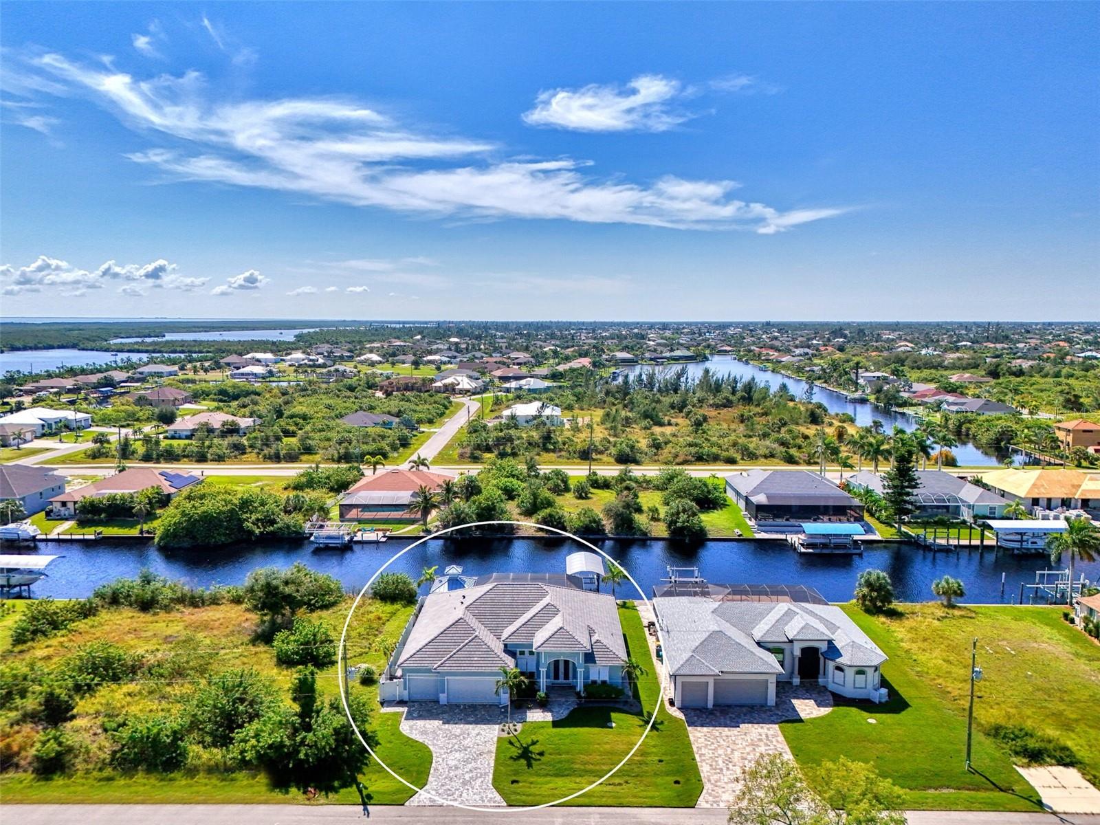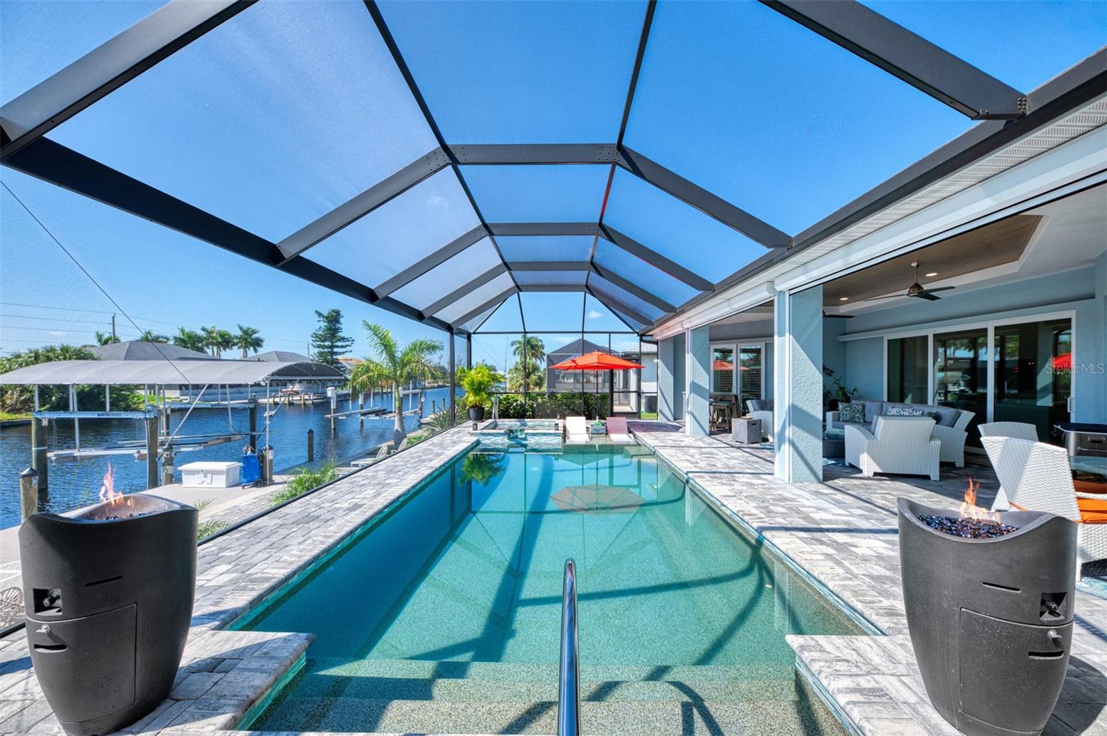 One or more photos has been digitally staged. Location! Location! Location! Don’t miss this 2020-built CUSTOM MINI ESTATE WATERFRONT POOL HOME WITH SAILBOAT ACCESS offering quick boating access to Charlotte Harbor and the Gulf of Mexico! (no bridges to go under!) This stunning 3-bedroom, 3-bathroom 3 car spacious garage pool home with Tile roof and a private Office (which can serve as a 4th bedroom) was built by the prestigious Luke Brothers Custom Homes. It's packed with luxury features, and every detail has been thoughtfully crafted for the ultimate Florida lifestyle. As you step onto the paver driveway and walkway, you’ll be captivated by the impressive entryway. Double leaded glass doors lead you into a grand foyer, where your eyes will immediately be drawn to the sparkling saltwater pool and canal views. The pool area features paver decking, a state-of-the-art saltwater heated pool and spa, and a paver walkway that takes you to the incredible 60' composite dock. This dock is fully equipped with 240 electric, a 10,000 lb covered boat lift, a jet ski lift, and an 80' concrete seawall, all set in one of the most desirable locations in South Gulf Cove. Inside the home, the craftsmanship shines with 15' coffered ceilings adorned with Poplar wood, crown molding, and beautiful light fixtures. The grand living space showcases lighted built-in shelving, custom gray Spanish tile flooring, and plantation shutters throughout. The gourmet kitchen is a showstopper, boasting a Cambria Quartz center island, high-end Electrolux stainless steel appliances, convection cooktop, built-in oven, microwave, dishwasher and custom soft-close wood cabinetry with crown molding. A glass tile backsplash and lighted display cabinets add to the kitchen's charm. The master suite is an oasis, with coffered tray ceilings, pool access, and two spacious walk-in closets with built-in shelving. The luxurious master bath offers a large walk-in shower, separate tub, dual sinks, and upgraded granite countertops. Step outside to the cabana with metal roof, where entertaining is a breeze! This outdoor kitchen includes a stainless steel built-in grill, double burner, bar refrigerator, and granite countertops. The pool area is equally stunning with a waterfall, fiber optic color wheel, and fire columns that create a true resort vibe. Additional features include impact windows, Kevlar automatic shutter for the back lanai area, Ring doorbell, a 3-car garage with epoxy floors, smart garage door opener, central vacuum, and an on-demand hot water heater and so much more! The yard is fenced on one side with AstroTurf and a brick paver walkway to the cabana. If you’re into boating, fishing, or just love the water, this home is minutes from Boca Grande with easy access to Charlotte Harbor and the Gulf. Call us today for a private showing—you’ll be glad you did!