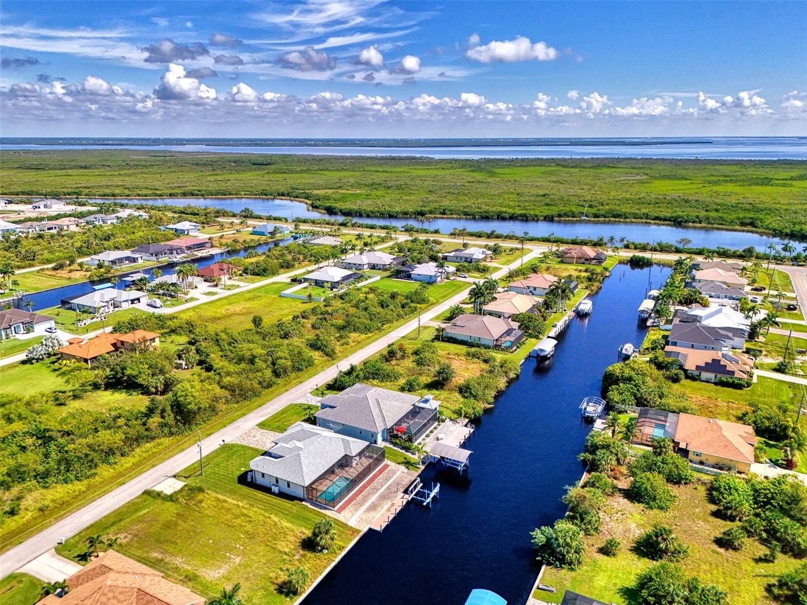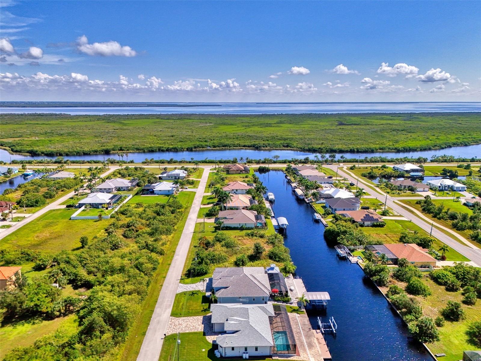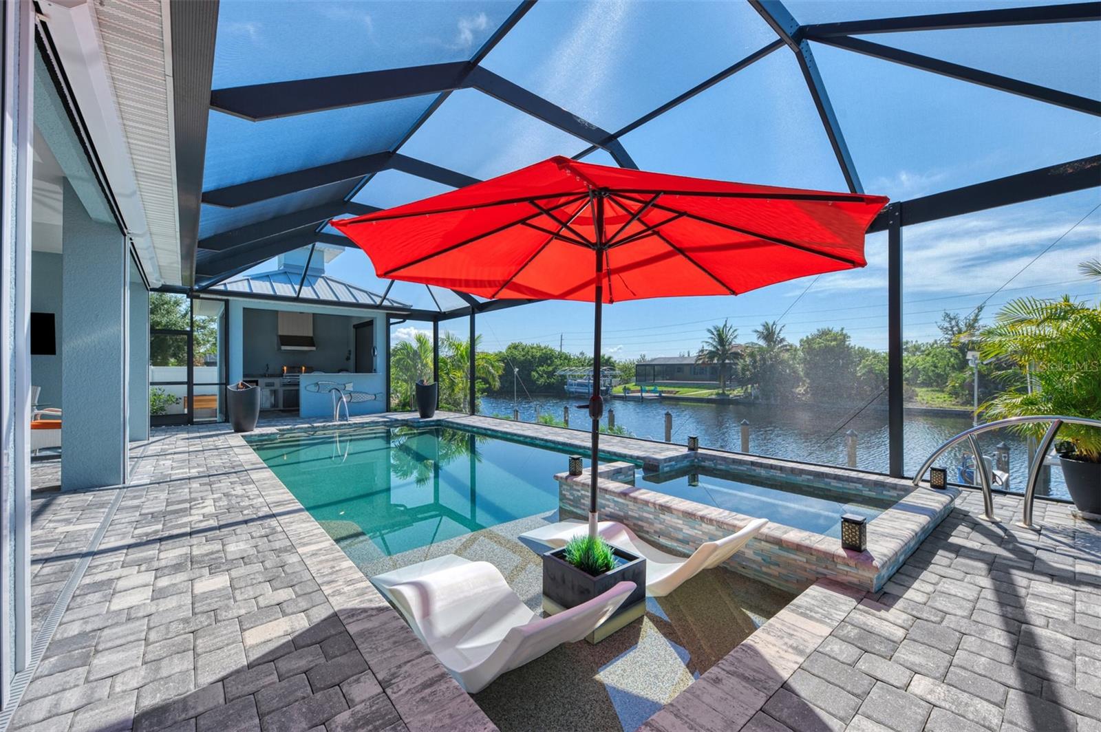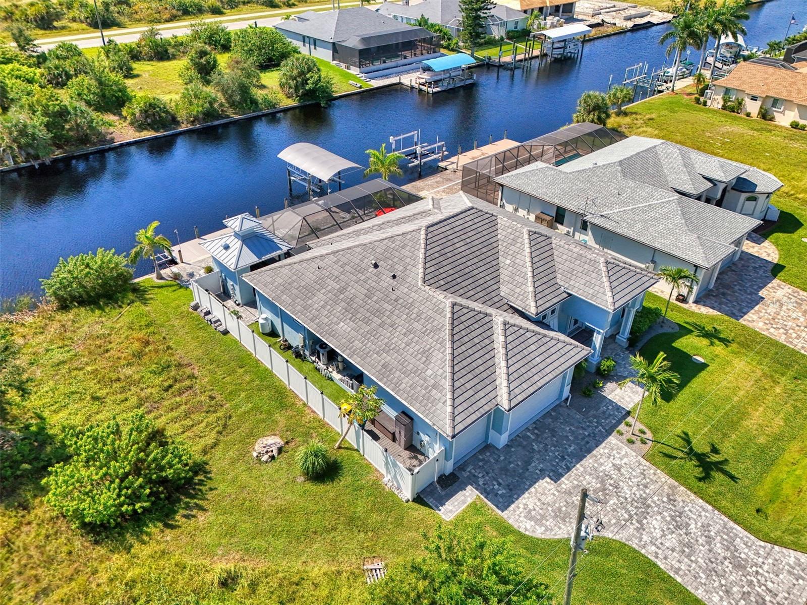 One or more photos has been digitally staged. Location! Location! Location! Don’t miss this 2020-built CUSTOM MINI ESTATE WATERFRONT POOL HOME WITH SAILBOAT ACCESS offering quick boating access to Charlotte Harbor and the Gulf of Mexico! (no bridges to go under!) This stunning 3-bedroom, 3-bathroom 3 car spacious garage pool home with Tile roof and a private Office (which can serve as a 4th bedroom) was built by the prestigious Luke Brothers Custom Homes. It's packed with luxury features, and every detail has been thoughtfully crafted for the ultimate Florida lifestyle. As you step onto the paver driveway and walkway, you’ll be captivated by the impressive entryway. Double leaded glass doors lead you into a grand foyer, where your eyes will immediately be drawn to the sparkling saltwater pool and canal views. The pool area features paver decking, a state-of-the-art saltwater heated pool and spa, and a paver walkway that takes you to the incredible 60' composite dock. This dock is fully equipped with 240 electric, a 10,000 lb covered boat lift, a jet ski lift, and an 80' concrete seawall, all set in one of the most desirable locations in South Gulf Cove. Inside the home, the craftsmanship shines with 15' coffered ceilings adorned with Poplar wood, crown molding, and beautiful light fixtures. The grand living space showcases lighted built-in shelving, custom gray Spanish tile flooring, and plantation shutters throughout. The gourmet kitchen is a showstopper, boasting a Cambria Quartz center island, high-end Electrolux stainless steel appliances, convection cooktop, built-in oven, microwave, dishwasher and custom soft-close wood cabinetry with crown molding. A glass tile backsplash and lighted display cabinets add to the kitchen's charm. The master suite is an oasis, with coffered tray ceilings, pool access, and two spacious walk-in closets with built-in shelving. The luxurious master bath offers a large walk-in shower, separate tub, dual sinks, and upgraded granite countertops. Step outside to the cabana with metal roof, where entertaining is a breeze! This outdoor kitchen includes a stainless steel built-in grill, double burner, bar refrigerator, and granite countertops. The pool area is equally stunning with a waterfall, fiber optic color wheel, and fire columns that create a true resort vibe. Additional features include impact windows, Kevlar automatic shutter for the back lanai area, Ring doorbell, a 3-car garage with epoxy floors, smart garage door opener, central vacuum, and an on-demand hot water heater and so much more! The yard is fenced on one side with AstroTurf and a brick paver walkway to the cabana. If you’re into boating, fishing, or just love the water, this home is minutes from Boca Grande with easy access to Charlotte Harbor and the Gulf. Call us today for a private showing—you’ll be glad you did!