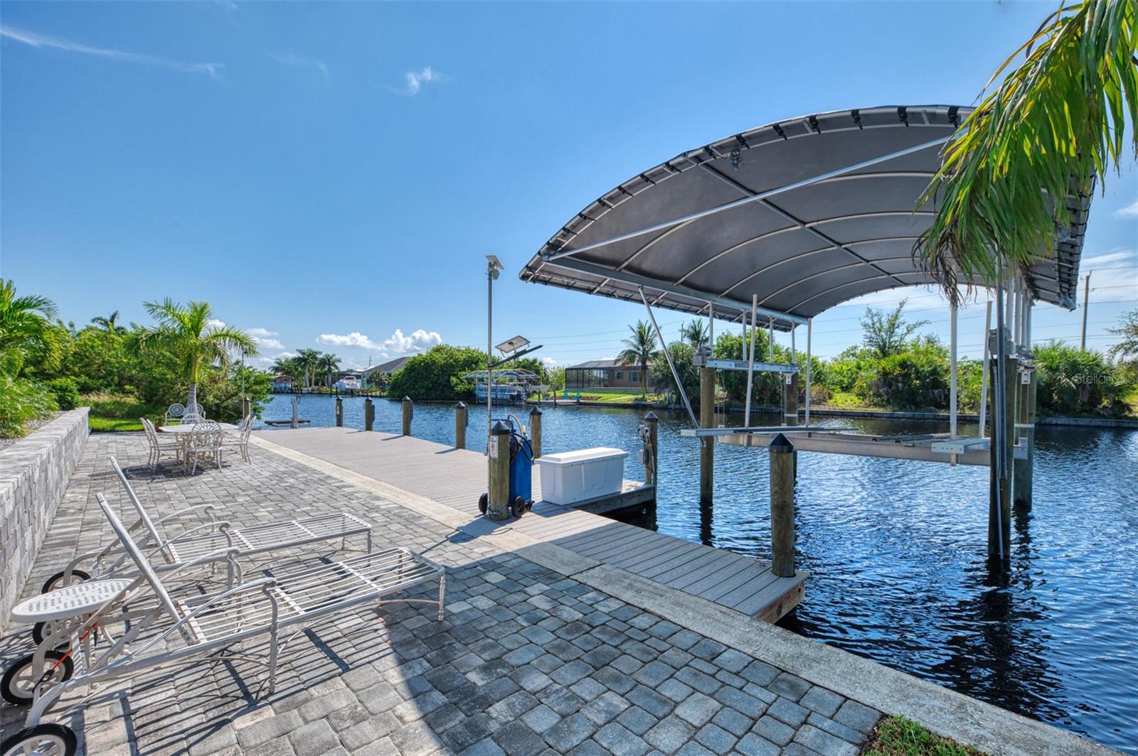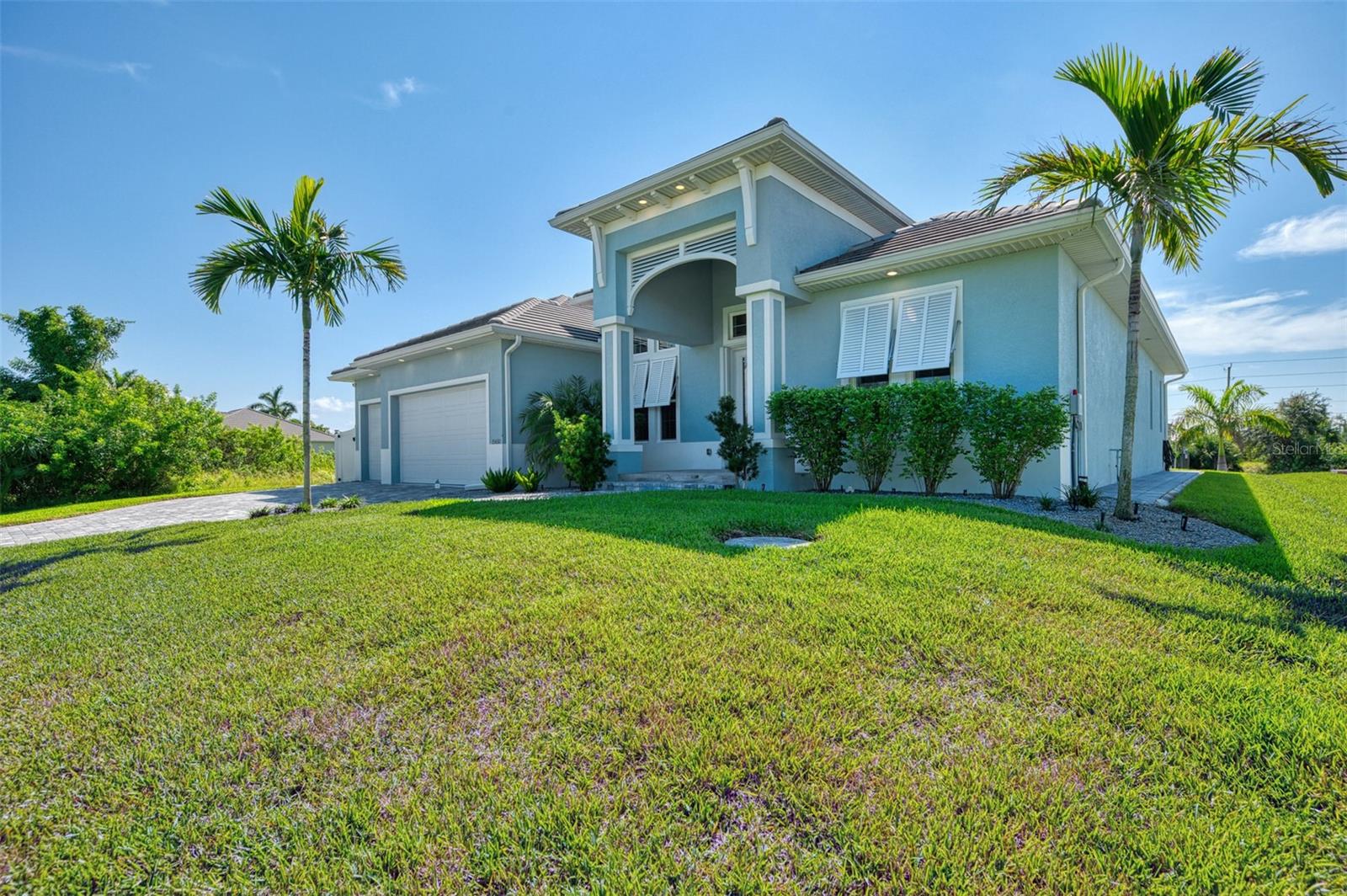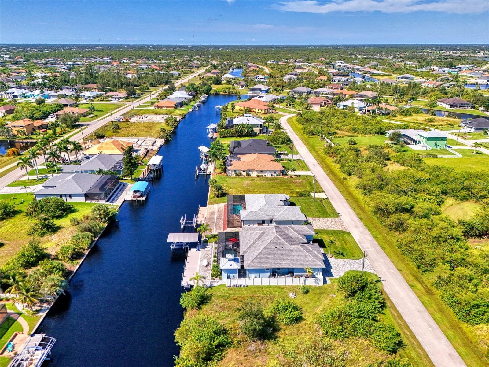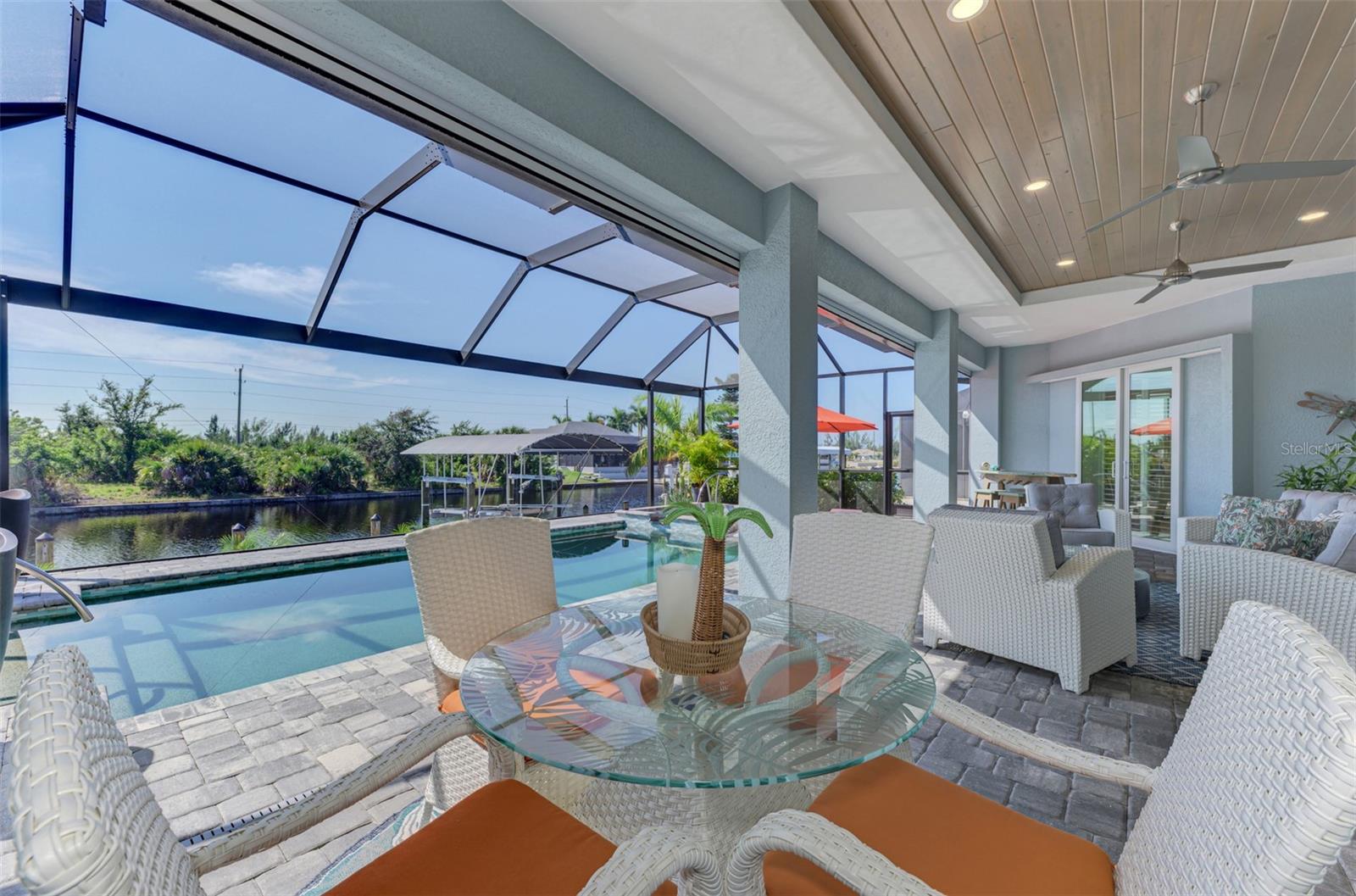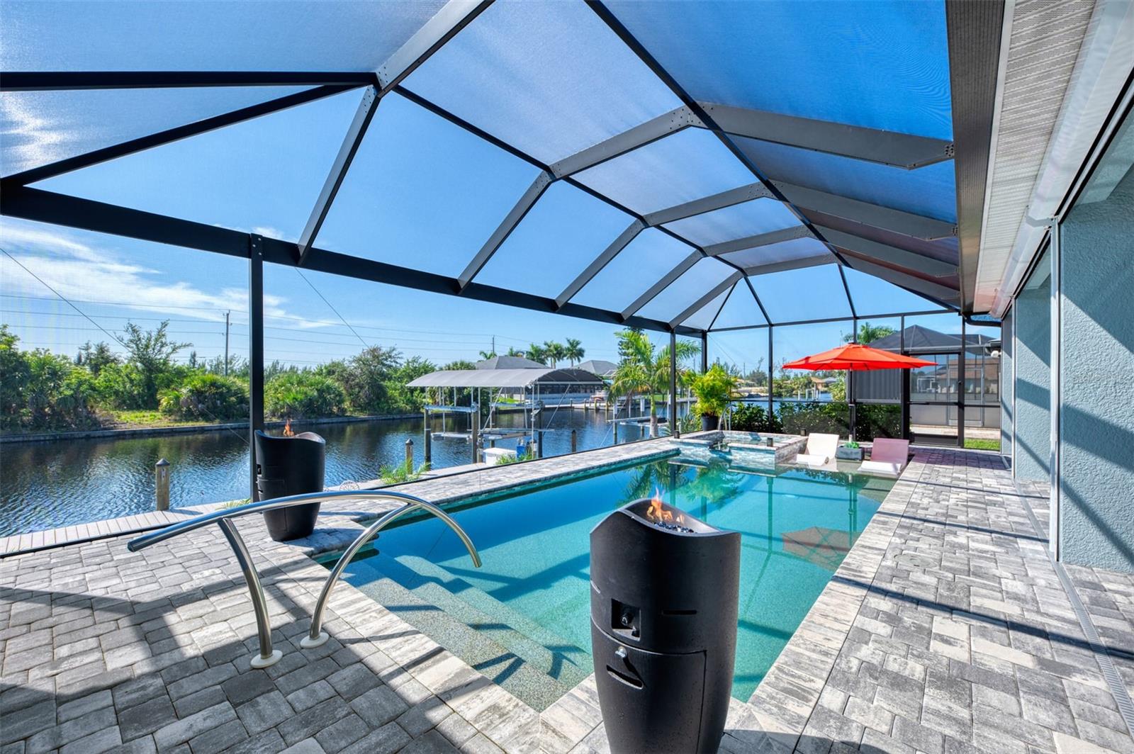 One or more photos has been digitally staged. Location! Location! Location! Don’t miss this 2020-built CUSTOM MINI ESTATE WATERFRONT POOL HOME WITH SAILBOAT ACCESS offering quick boating access to Charlotte Harbor and the Gulf of Mexico! (no bridges to go under!) This stunning 3-bedroom, 3-bathroom 3 car spacious garage pool home with Tile roof and a private Office (which can serve as a 4th bedroom) was built by the prestigious Luke Brothers Custom Homes. It's packed with luxury features, and every detail has been thoughtfully crafted for the ultimate Florida lifestyle. As you step onto the paver driveway and walkway, you’ll be captivated by the impressive entryway. Double leaded glass doors lead you into a grand foyer, where your eyes will immediately be drawn to the sparkling saltwater pool and canal views. The pool area features paver decking, a state-of-the-art saltwater heated pool and spa, and a paver walkway that takes you to the incredible 60' composite dock. This dock is fully equipped with 240 electric, a 10,000 lb covered boat lift, a jet ski lift, and an 80' concrete seawall, all set in one of the most desirable locations in South Gulf Cove. Inside the home, the craftsmanship shines with 15' coffered ceilings adorned with Poplar wood, crown molding, and beautiful light fixtures. The grand living space showcases lighted built-in shelving, custom gray Spanish tile flooring, and plantation shutters throughout. The gourmet kitchen is a showstopper, boasting a Cambria Quartz center island, high-end Electrolux stainless steel appliances, convection cooktop, built-in oven, microwave, dishwasher and custom soft-close wood cabinetry with crown molding. A glass tile backsplash and lighted display cabinets add to the kitchen's charm. The master suite is an oasis, with coffered tray ceilings, pool access, and two spacious walk-in closets with built-in shelving. The luxurious master bath offers a large walk-in shower, separate tub, dual sinks, and upgraded granite countertops. Step outside to the cabana with metal roof, where entertaining is a breeze! This outdoor kitchen includes a stainless steel built-in grill, double burner, bar refrigerator, and granite countertops. The pool area is equally stunning with a waterfall, fiber optic color wheel, and fire columns that create a true resort vibe. Additional features include impact windows, Kevlar automatic shutter for the back lanai area, Ring doorbell, a 3-car garage with epoxy floors, smart garage door opener, central vacuum, and an on-demand hot water heater and so much more! The yard is fenced on one side with AstroTurf and a brick paver walkway to the cabana. If you’re into boating, fishing, or just love the water, this home is minutes from Boca Grande with easy access to Charlotte Harbor and the Gulf. Call us today for a private showing—you’ll be glad you did!