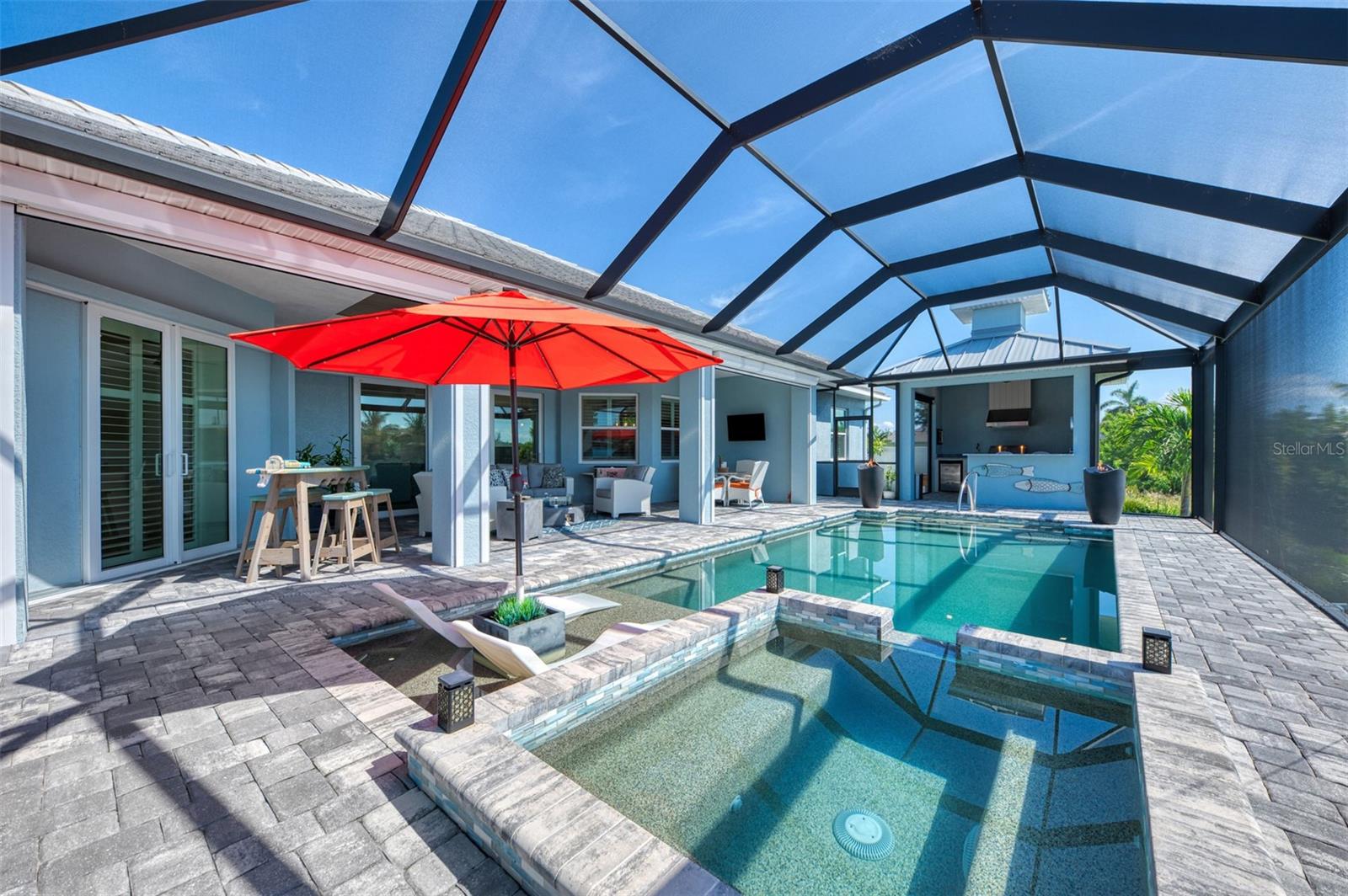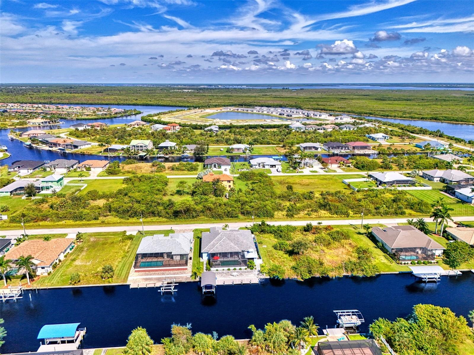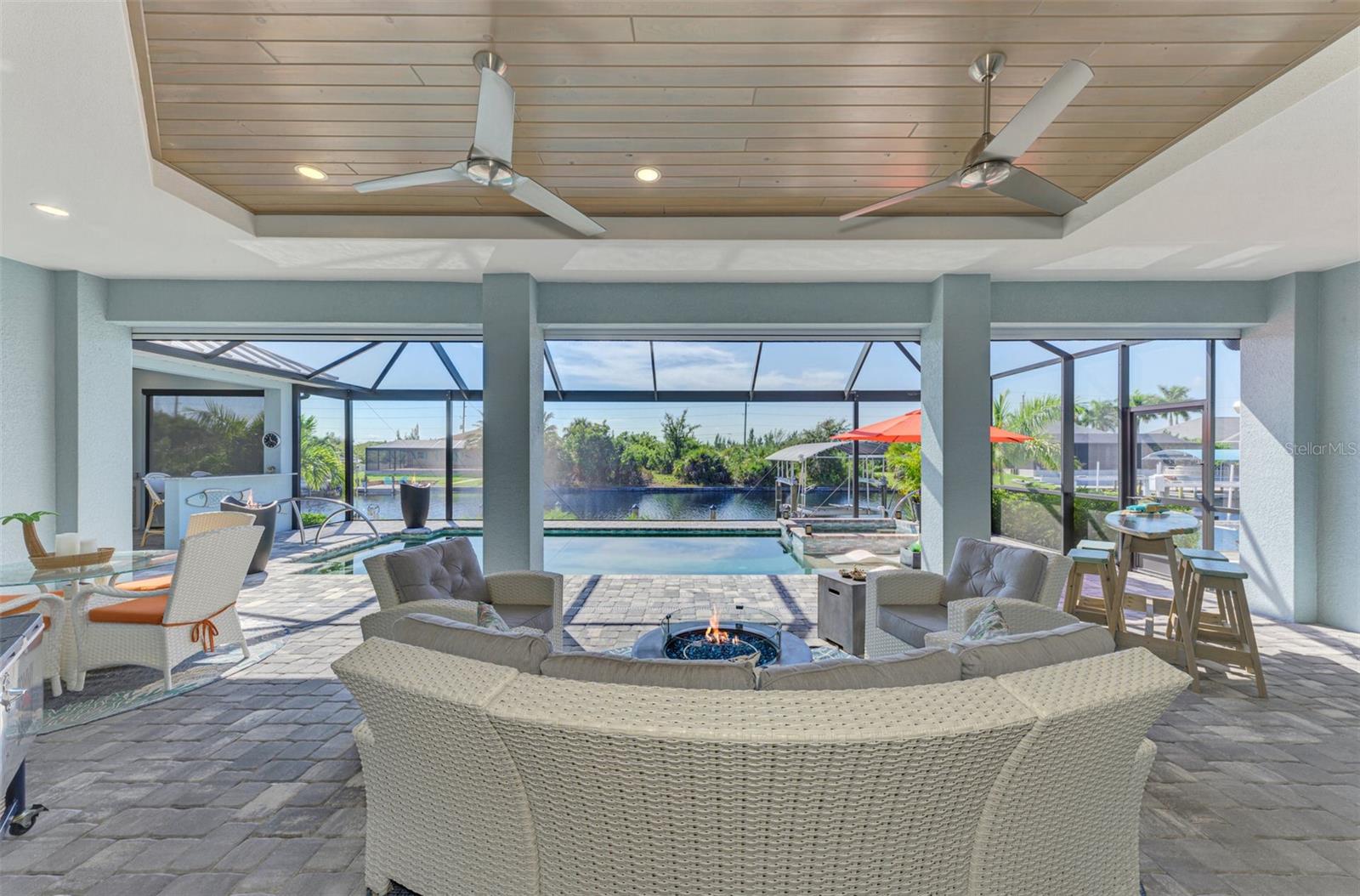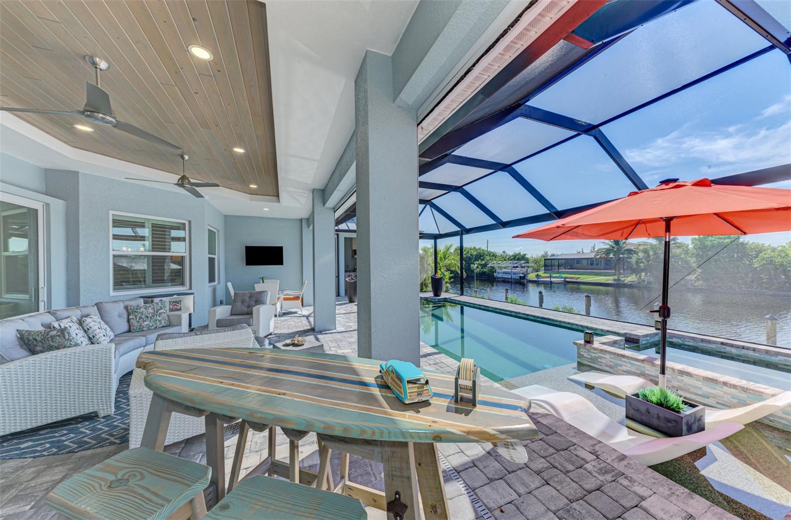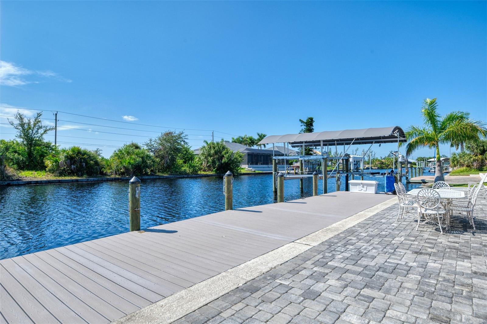 One or more photos has been digitally staged. Location! Location! Location! Don’t miss this 2020-built CUSTOM MINI ESTATE WATERFRONT POOL HOME WITH SAILBOAT ACCESS offering quick boating access to Charlotte Harbor and the Gulf of Mexico! (no bridges to go under!) This stunning 3-bedroom, 3-bathroom 3 car spacious garage pool home with Tile roof and a private Office (which can serve as a 4th bedroom) was built by the prestigious Luke Brothers Custom Homes. It's packed with luxury features, and every detail has been thoughtfully crafted for the ultimate Florida lifestyle. As you step onto the paver driveway and walkway, you’ll be captivated by the impressive entryway. Double leaded glass doors lead you into a grand foyer, where your eyes will immediately be drawn to the sparkling saltwater pool and canal views. The pool area features paver decking, a state-of-the-art saltwater heated pool and spa, and a paver walkway that takes you to the incredible 60' composite dock. This dock is fully equipped with 240 electric, a 10,000 lb covered boat lift, a jet ski lift, and an 80' concrete seawall, all set in one of the most desirable locations in South Gulf Cove. Inside the home, the craftsmanship shines with 15' coffered ceilings adorned with Poplar wood, crown molding, and beautiful light fixtures. The grand living space showcases lighted built-in shelving, custom gray Spanish tile flooring, and plantation shutters throughout. The gourmet kitchen is a showstopper, boasting a Cambria Quartz center island, high-end Electrolux stainless steel appliances, convection cooktop, built-in oven, microwave, dishwasher and custom soft-close wood cabinetry with crown molding. A glass tile backsplash and lighted display cabinets add to the kitchen's charm. The master suite is an oasis, with coffered tray ceilings, pool access, and two spacious walk-in closets with built-in shelving. The luxurious master bath offers a large walk-in shower, separate tub, dual sinks, and upgraded granite countertops. Step outside to the cabana with metal roof, where entertaining is a breeze! This outdoor kitchen includes a stainless steel built-in grill, double burner, bar refrigerator, and granite countertops. The pool area is equally stunning with a waterfall, fiber optic color wheel, and fire columns that create a true resort vibe. Additional features include impact windows, Kevlar automatic shutter for the back lanai area, Ring doorbell, a 3-car garage with epoxy floors, smart garage door opener, central vacuum, and an on-demand hot water heater and so much more! The yard is fenced on one side with AstroTurf and a brick paver walkway to the cabana. If you’re into boating, fishing, or just love the water, this home is minutes from Boca Grande with easy access to Charlotte Harbor and the Gulf. Call us today for a private showing—you’ll be glad you did!