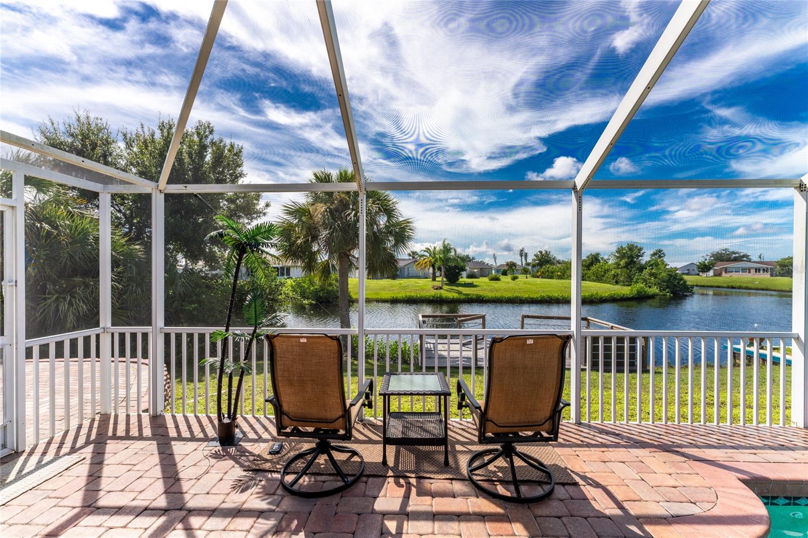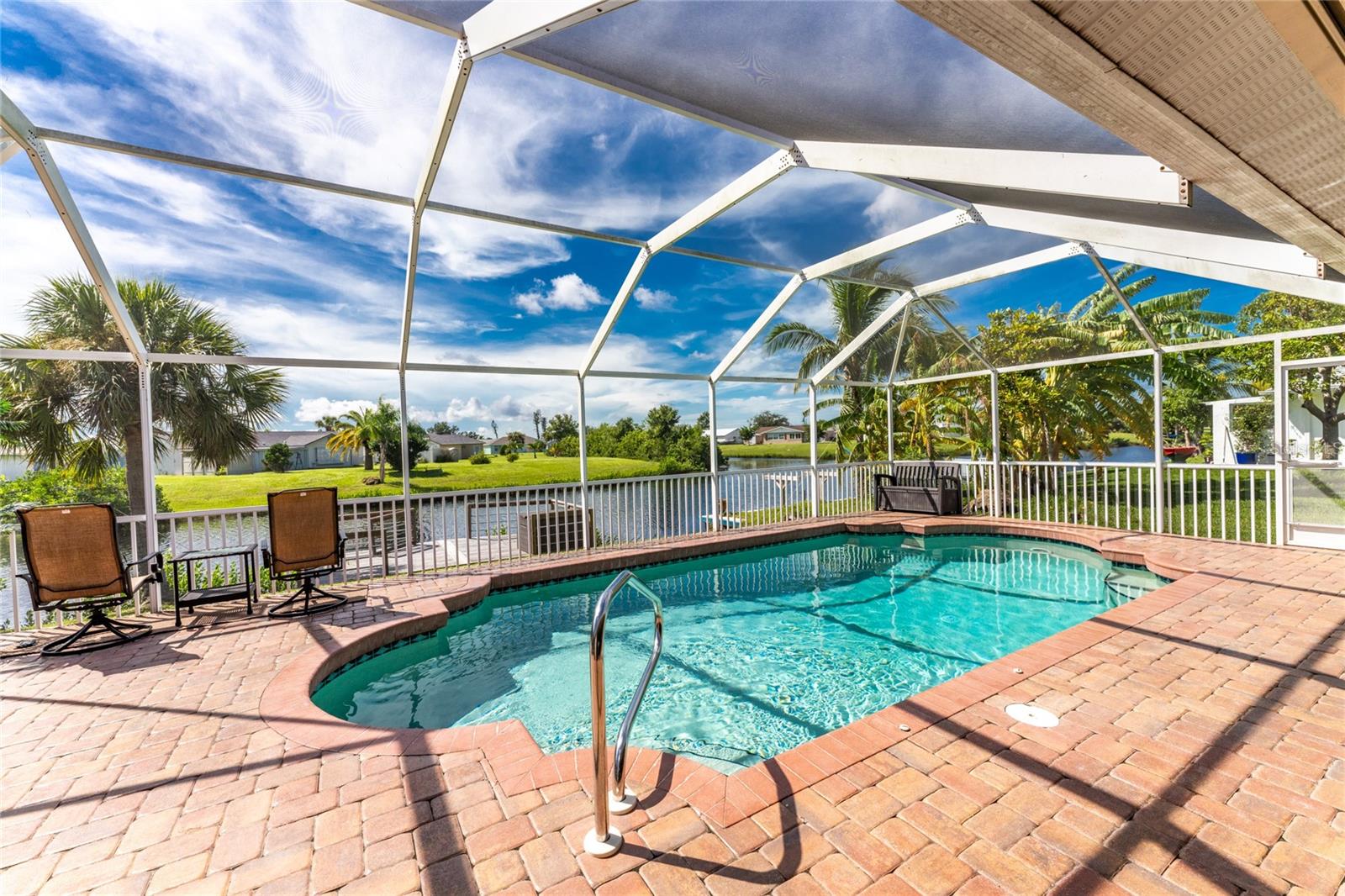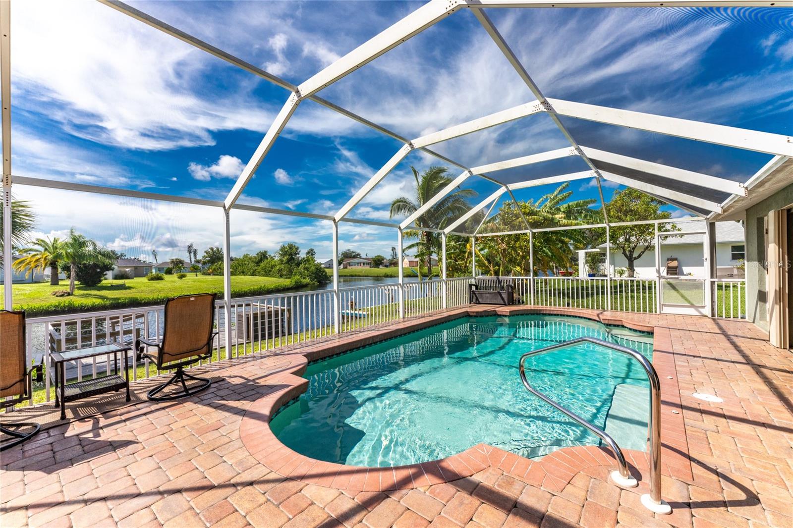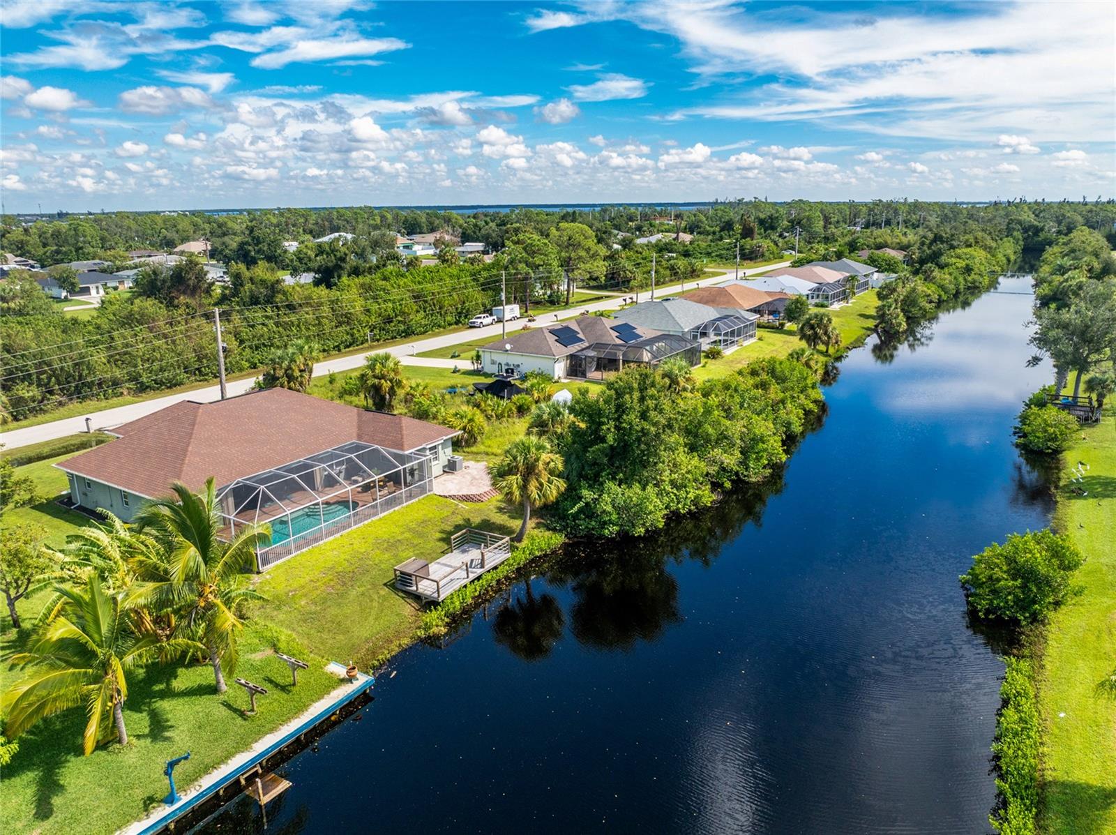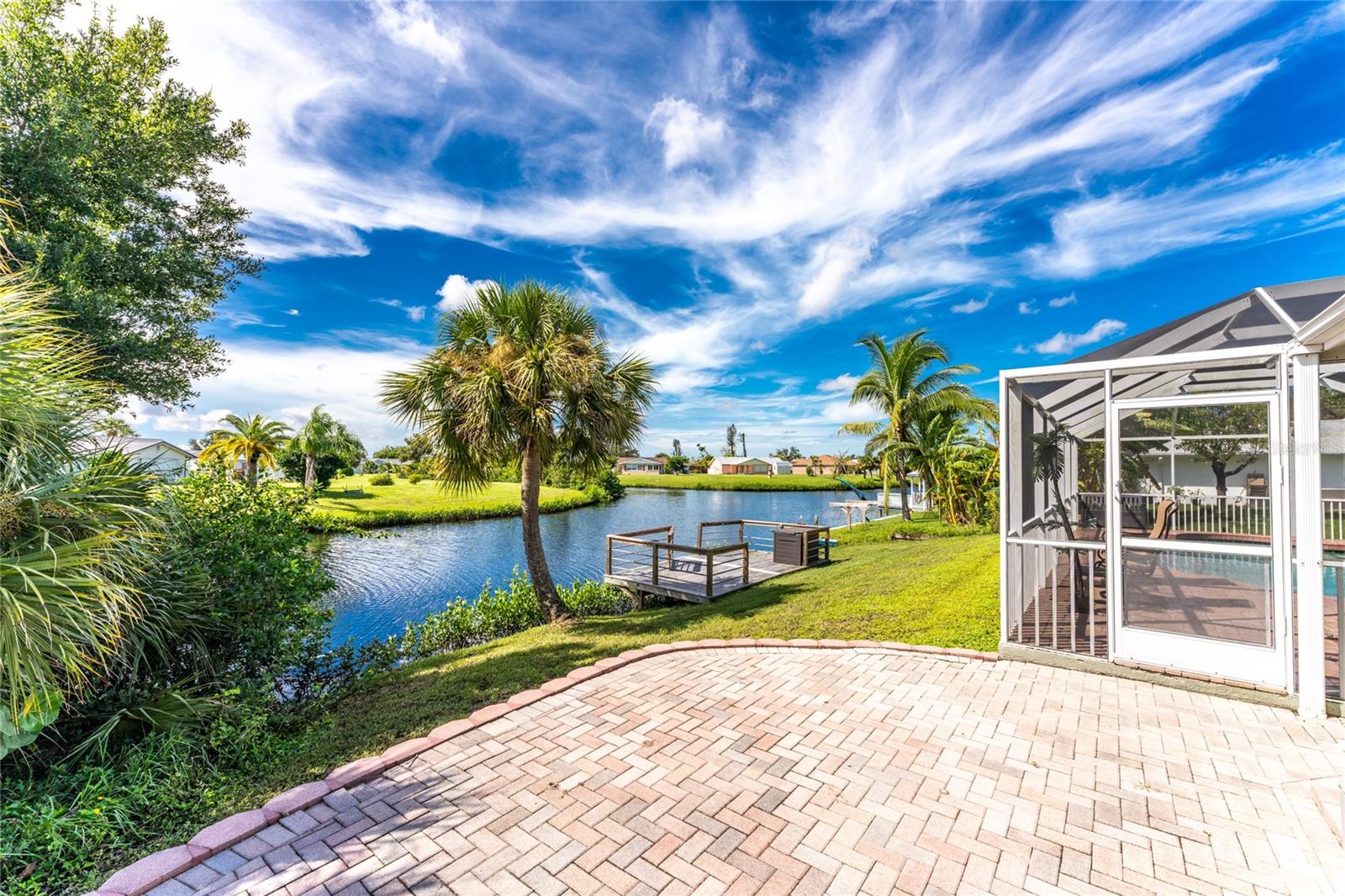 Welcome home to your waterfront dream with this three bedroom two bathroom canal front pool home in the sought-after community of Gulf Cove! As you walk into this home you will be greeted by soaring ceilings in an abundance of natural light coming through the massive pocket sliders leading to Lanai. Offering 2123 sq ft of living space under air, this home features an open floor plan with a family room, dining room, kitchen, bonus room / office as well as a split floor plan with a pocket door for privacy. The centrally located kitchen offers ample cabinet space with soft close drawers, newer stainless-steel appliances, and granite countertops. The large primary bedroom has sliding door access to the Lanai, boasts his and hers walk-in closets and an ensuite bathroom with dual sinks, walk-in shower and plenty of counterspace, including a vanity. Enjoy the screened in Lanai with accordion style hurricane doors, swimming pool with jetted seats and views of the gorgeous canal with many different species of wildlife There is a separate laundry room with sink, additional cupboard space and washer and dryer. In addition, there is a two-car garage for covered parking or extra storage space. Additional features of this home NEW roof (2021), NEW electrical panel (2021), NEW hot water tank (2021), NEW refrigerator (2022) and a paved brick patio. The Gulf Cove community has a waterfront park and a boat ramp that are available for a fee ($75 annually in 2024). This community is a short drive to local beaches golf courses, shopping, dining, public parks, and public boat ramp that provides access to the Peace and Myakka Rivers, and the Charlotte Harbor. The furniture, furnishings and decor are negotiable. This home is an ideal retreat, offering both charm and functionality. Don't miss your chance to own this move-in ready haven that seamlessly blends modern living with a touch of tranquility. Schedule your private showing today! Seller is including a one-year home warranty for buyers' peace of mind. This home had no hurricane damage. Seller is a licensed real estate agent in the state of Florida.