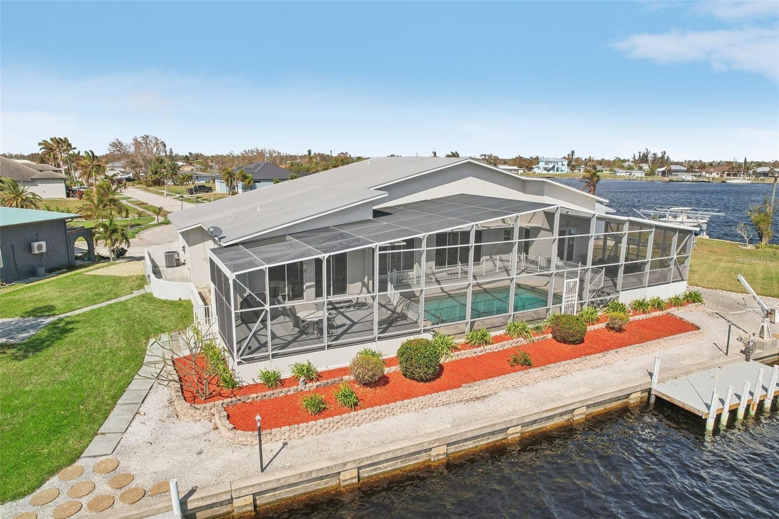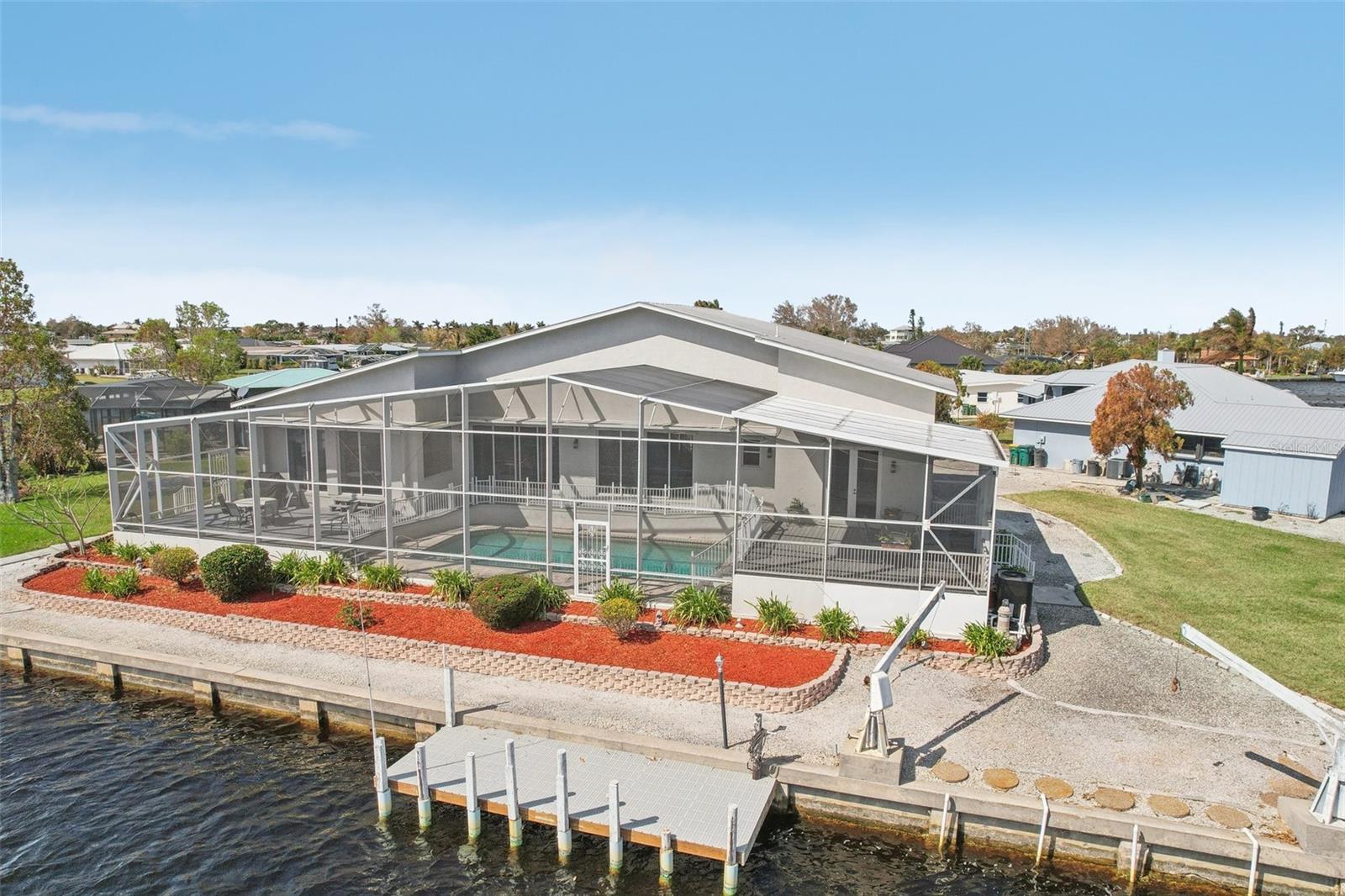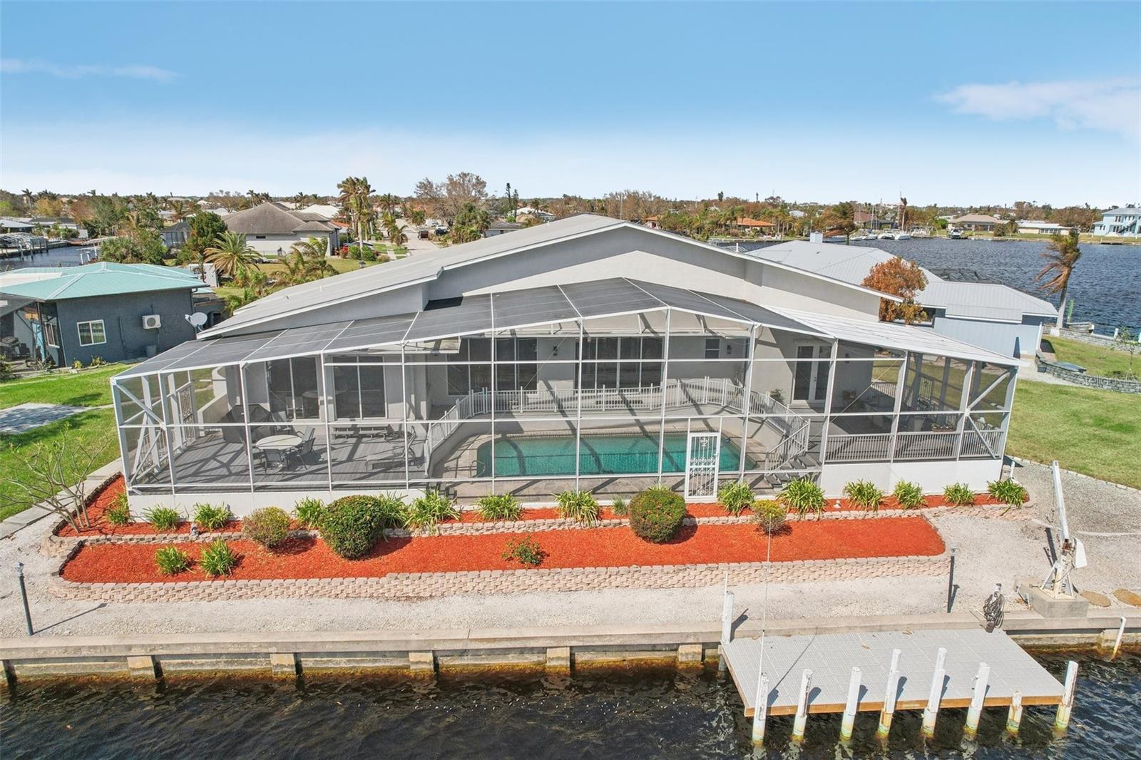 Luxury Living at a New Lower Price! Don’t Miss This Opportunity!" Bring an Offer!" Welcome to Your Dream Waterfront Retreat! This stunning 4-bedroom, 3-bathroom home offers over 2,700 sq. ft. of living space on an oversized, high-and-dry lot with 260 feet of seawall, providing direct sailboat access to Charlotte Harbor— and out to the Gulf no bridges in your way! Key Features: Two Private Docks – Perfect for accommodating multiple watercraft. Heated Pool – Ideal for soaking up the sun and enjoying the Florida lifestyle year-round. Open Floor Plan – Expansive great room, gourmet kitchen, and separate breakfast area with sliding glass doors leading to the lanai's and pool Chef’s Kitchen – Featuring granite countertops, wood cabinetry, a breakfast bar, and ample storage and prep space. Owner’s Suite – Enjoy waterfront views, wood laminate flooring, and direct access to the covered and screened lanai. Versatile Guest Room – Located near the kitchen, perfect for an office, den, or craft room. Expansive Screened Lanai – Wake up to breathtaking sunrises, entertain guests, or simply relax while enjoying the serene waterfront ambiance. Sailboat Water Access – Private dock with extra steps for easy access and boat cleaning, providing effortless navigation to the Gulf of Mexico. Additional Upgrades & Amenities: New Dual-Zone A/C System (2024) – Ensures year-round comfort. Hurricane Protection – Peace of mind in all weather conditions. Oversized lot offering privacy and ample space for outdoor activities. Storm Resilience – High and dry location with no damage from recent storms. Prime Location: This home is just minutes from Fisherman’s Village, the charming historic downtown area, and the luxurious Sunseeker Resort. Experience the best of waterfront living with easy access to pristine waterways, world-class fishing, and endless boating adventures. Home elevation certificate is available This exceptional property offers relaxation, recreation, and convenience—a true boater’s paradise! Don’t miss out on this rare opportunity. Schedule your private showing today and start living the waterfront lifestyle you've always dreamed of!
