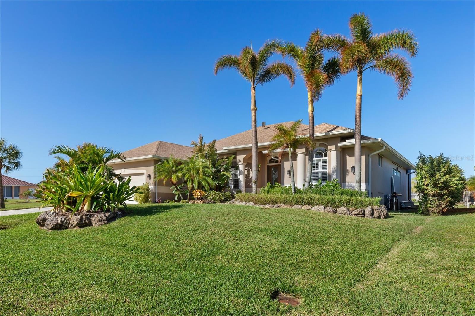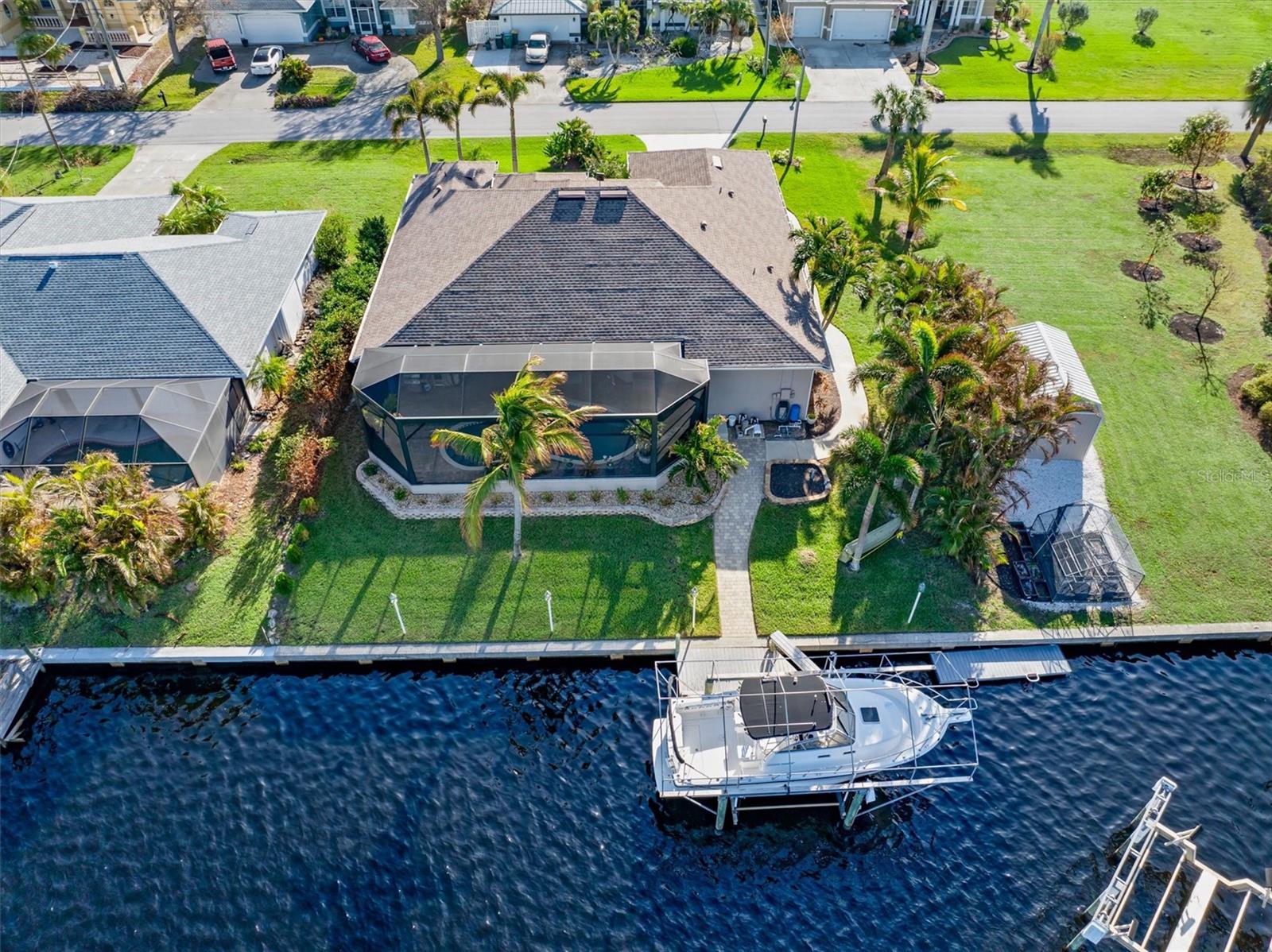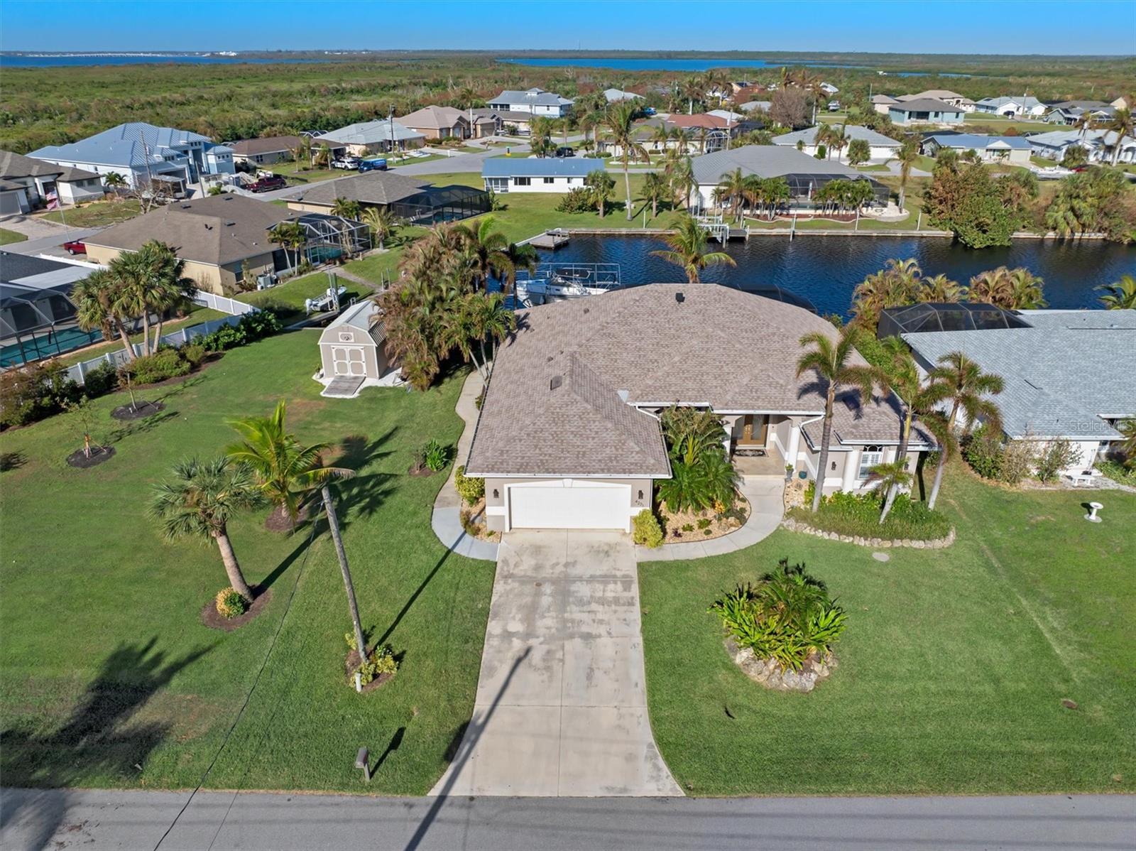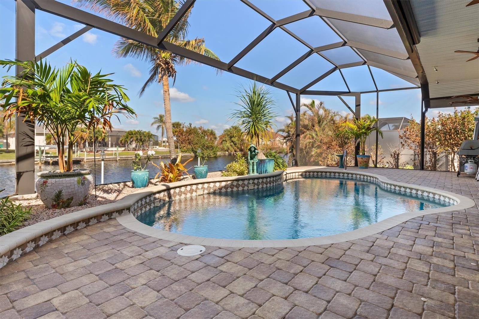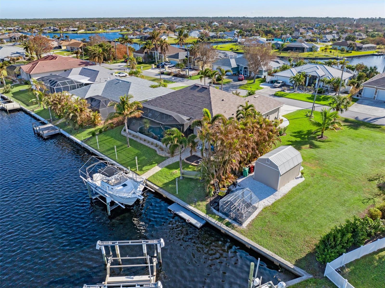 Check out the 3-D virtual walk through above! Stunning SAILBOAT ACCESS home with additional buildable lot to keep or sell! Original owners spared no expense to maintain this meticulous home with custom details throughout. As you enter this spacious, open floor plan home from the beautiful double doors (with retractable double screen), you view the Eastlake Waterway and a custom designed pool area with new Clearview screen. Specially designed Travertine flooring along with Hickory Wood flooring make this home a unique find. Custom remote controlled linen shades adorn the massive sliding glass doors and plantation shutters that are in other windows. High-end interior design includes several “art niches,” crown molding, tray ceilings, banana leaf inset in tray ceiling in Primary Bedroom, glass block shower, walk-in custom designed closets, and a Murphy bed for easy transition from a bedroom to an office/den! The split floor plan includes both a HUGE Primary Suite and two HUGE bedrooms to make this home perfect for entertaining guests. The kitchen has too many unique features to mention them all…wine cooler, Induction GE Café stove with pull out hood, solid Cherry Wood cabinets, pull out trash bins, top of the line refrigerator, and gorgeous granite countertop. The kitchen nook features a large Aquarium Window that is the focal point of the home. While sitting in the nook, you can view your beautiful custom pool with a unique garden of in-ground and potted plants. Go out the side lanai door and follow the paver walkway to your own lighted private boat dock. And, if you are interested, the 30 foot Twin Yanmar Diesel 630 horsepower boat is negotiable. Add in a totally new laundry room with stainless steel sink, granite countertop, new 30” stainless steel refrigerator, new washer/dryer “all-in-one” appliance and built-in cabinets, and you have the perfectly designed space! Both the lush landscaping surrounding the home and the lawn have been well maintained. The oversized garage has a lighted workspace and many types of shelving. The custom-built 12 x 16 shed is a great place for storage and has electricity. The location of the home is close to all shopping, doctors, and restaurants yet is situated in a secluded area with dead-end streets. The Eastlake Waterway will take your sailboat to Charlotte Harbor. And there is no HOA in this community. This property will “sell itself” with its unique mixture of traditional and Florida style. Make an appointment to see it today!
