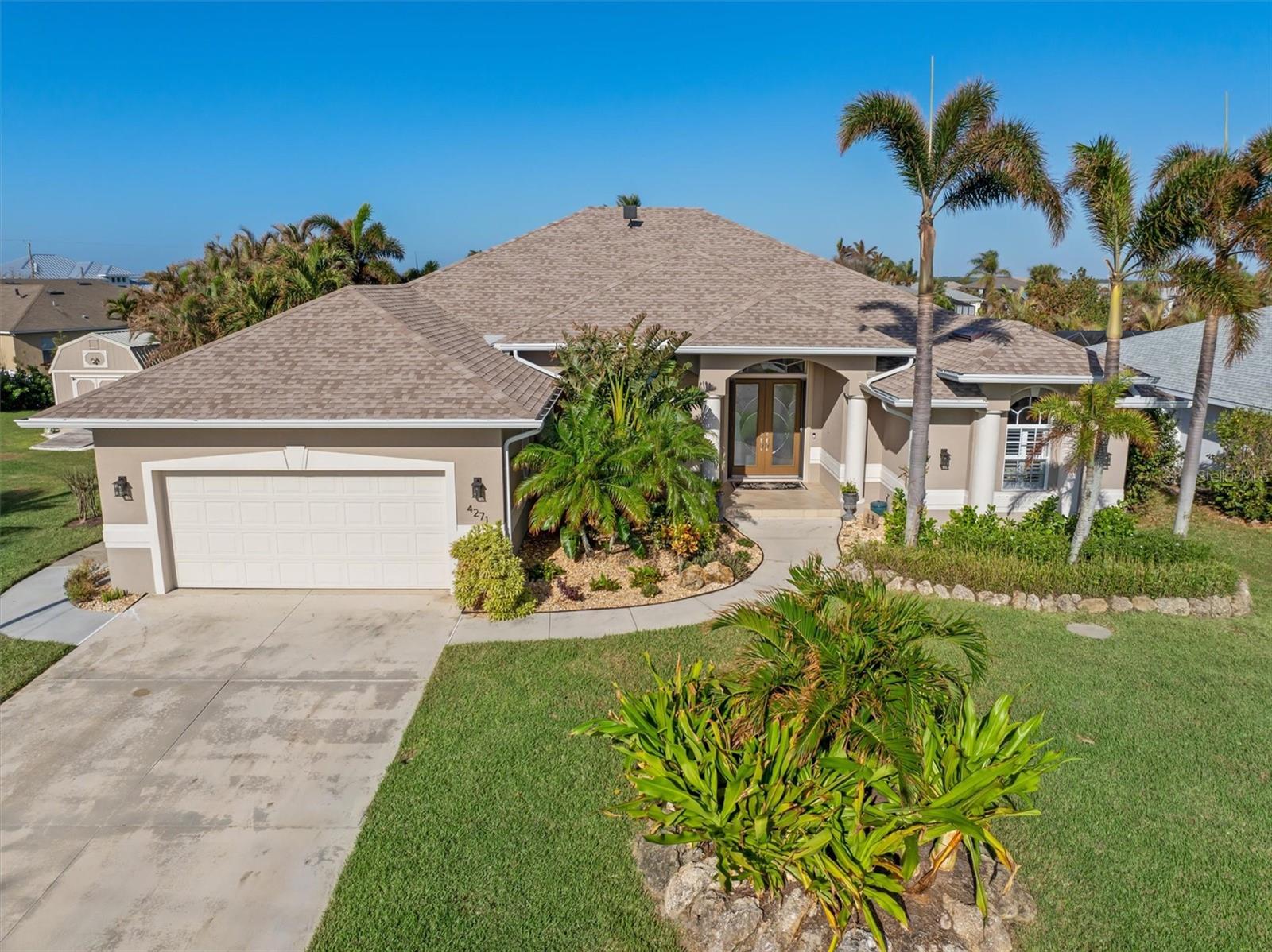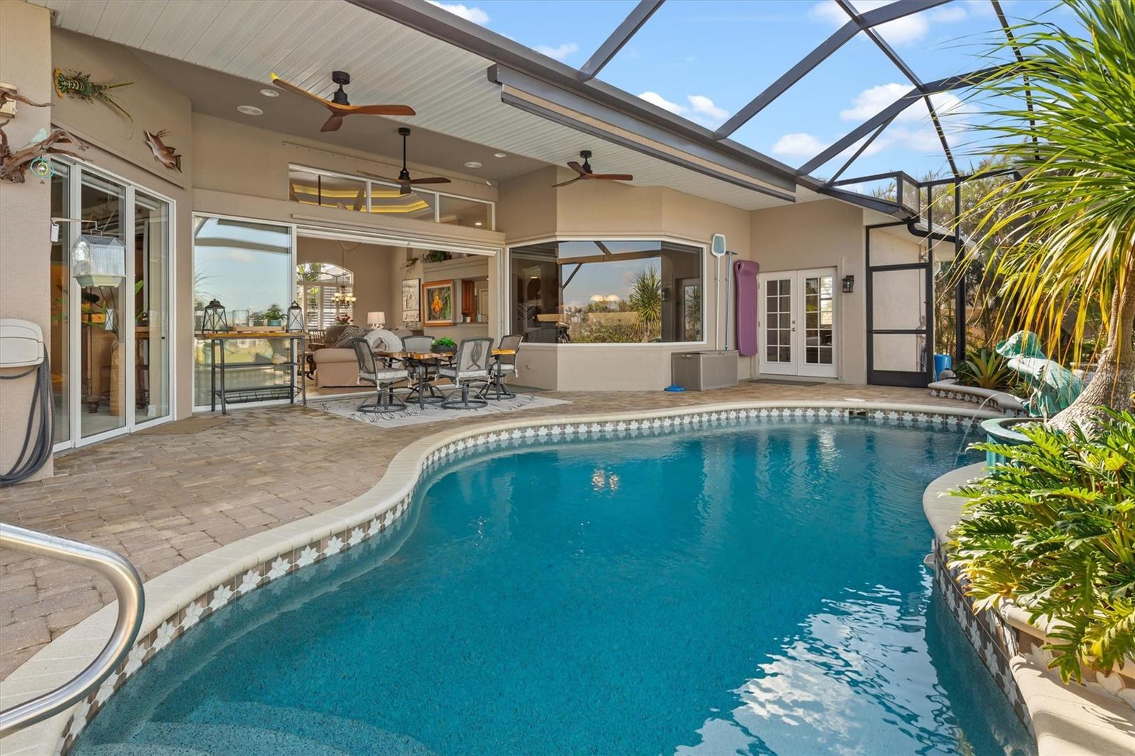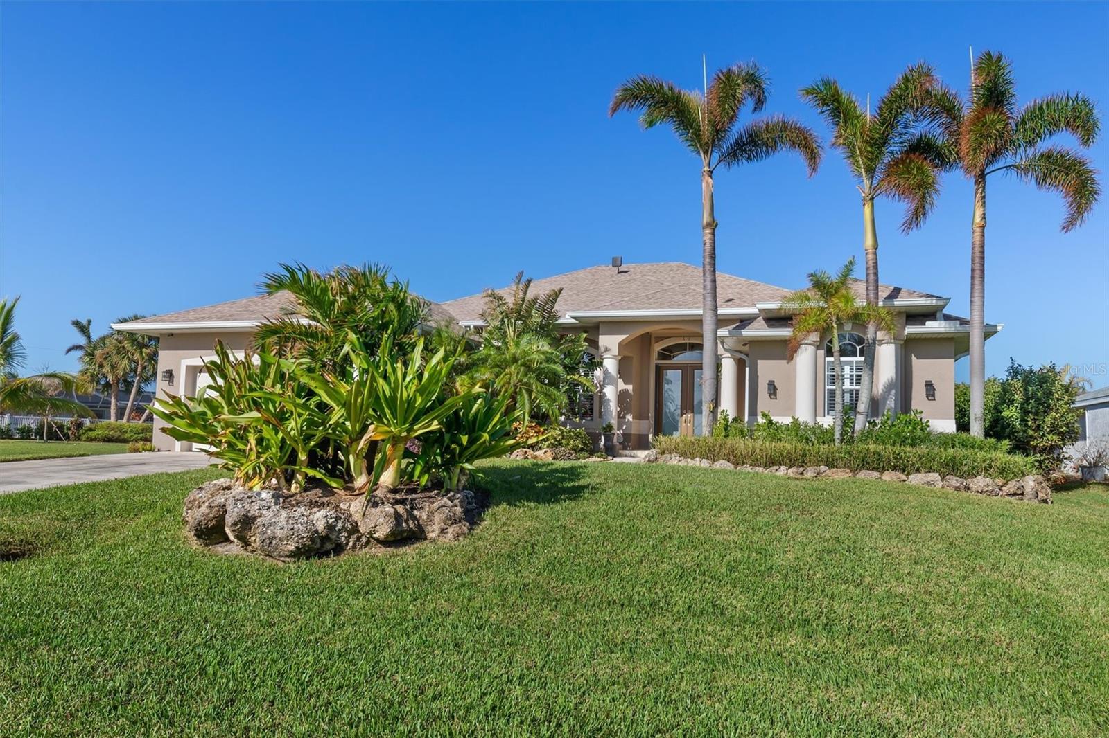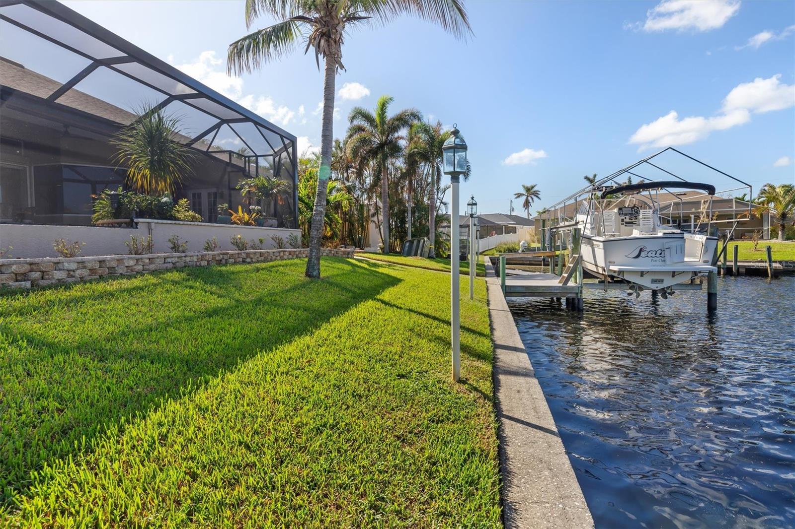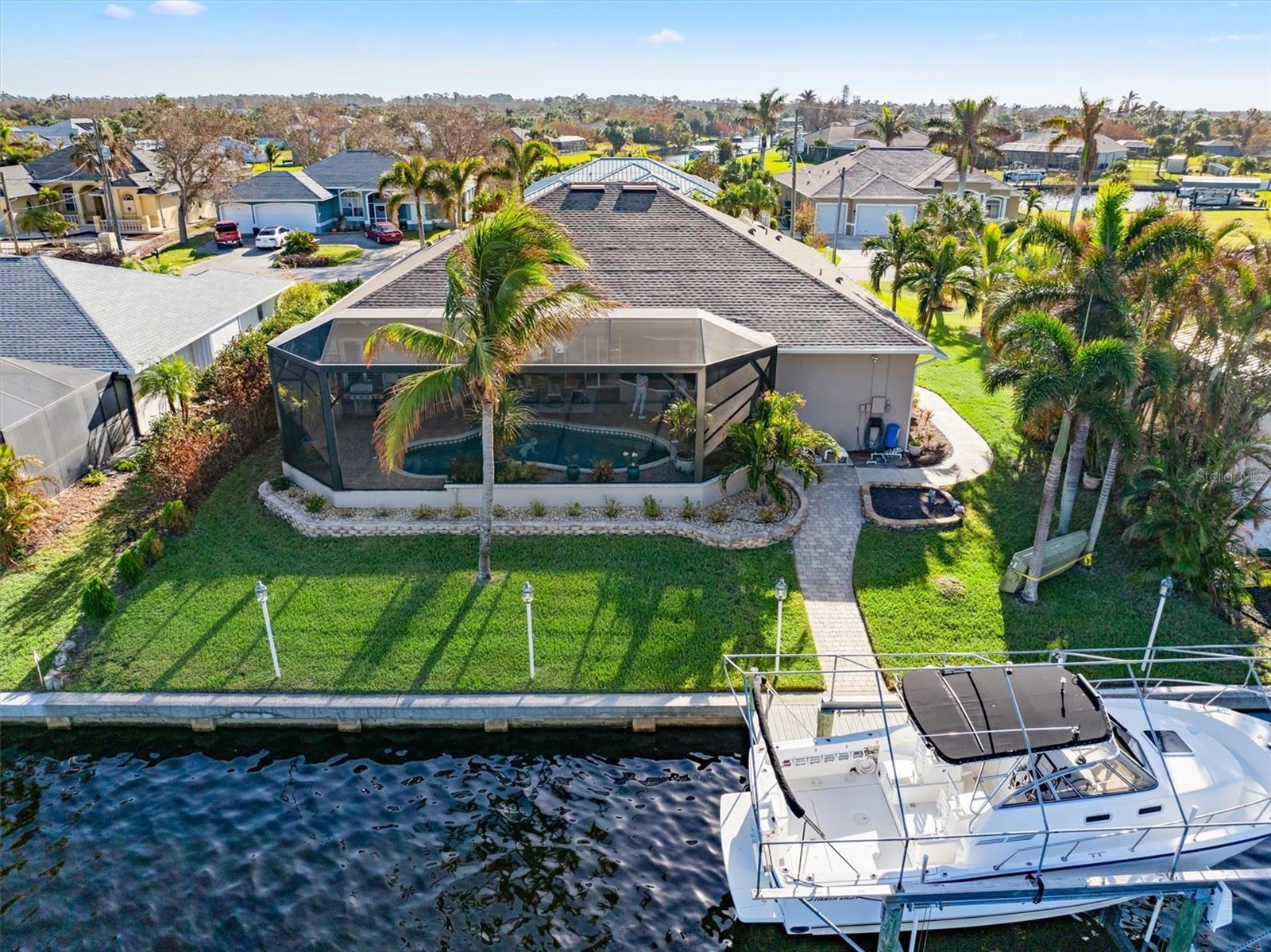 Check out the 3-D virtual walk through above! Stunning SAILBOAT ACCESS home with additional buildable lot to keep or sell! Original owners spared no expense to maintain this meticulous home with custom details throughout. As you enter this spacious, open floor plan home from the beautiful double doors (with retractable double screen), you view the Eastlake Waterway and a custom designed pool area with new Clearview screen. Specially designed Travertine flooring along with Hickory Wood flooring make this home a unique find. Custom remote controlled linen shades adorn the massive sliding glass doors and plantation shutters that are in other windows. High-end interior design includes several “art niches,” crown molding, tray ceilings, banana leaf inset in tray ceiling in Primary Bedroom, glass block shower, walk-in custom designed closets, and a Murphy bed for easy transition from a bedroom to an office/den! The split floor plan includes both a HUGE Primary Suite and two HUGE bedrooms to make this home perfect for entertaining guests. The kitchen has too many unique features to mention them all…wine cooler, Induction GE Café stove with pull out hood, solid Cherry Wood cabinets, pull out trash bins, top of the line refrigerator, and gorgeous granite countertop. The kitchen nook features a large Aquarium Window that is the focal point of the home. While sitting in the nook, you can view your beautiful custom pool with a unique garden of in-ground and potted plants. Go out the side lanai door and follow the paver walkway to your own lighted private boat dock. And, if you are interested, the 30 foot Twin Yanmar Diesel 630 horsepower boat is negotiable. Add in a totally new laundry room with stainless steel sink, granite countertop, new 30” stainless steel refrigerator, new washer/dryer “all-in-one” appliance and built-in cabinets, and you have the perfectly designed space! Both the lush landscaping surrounding the home and the lawn have been well maintained. The oversized garage has a lighted workspace and many types of shelving. The custom-built 12 x 16 shed is a great place for storage and has electricity. The location of the home is close to all shopping, doctors, and restaurants yet is situated in a secluded area with dead-end streets. The Eastlake Waterway will take your sailboat to Charlotte Harbor. And there is no HOA in this community. This property will “sell itself” with its unique mixture of traditional and Florida style. Make an appointment to see it today!