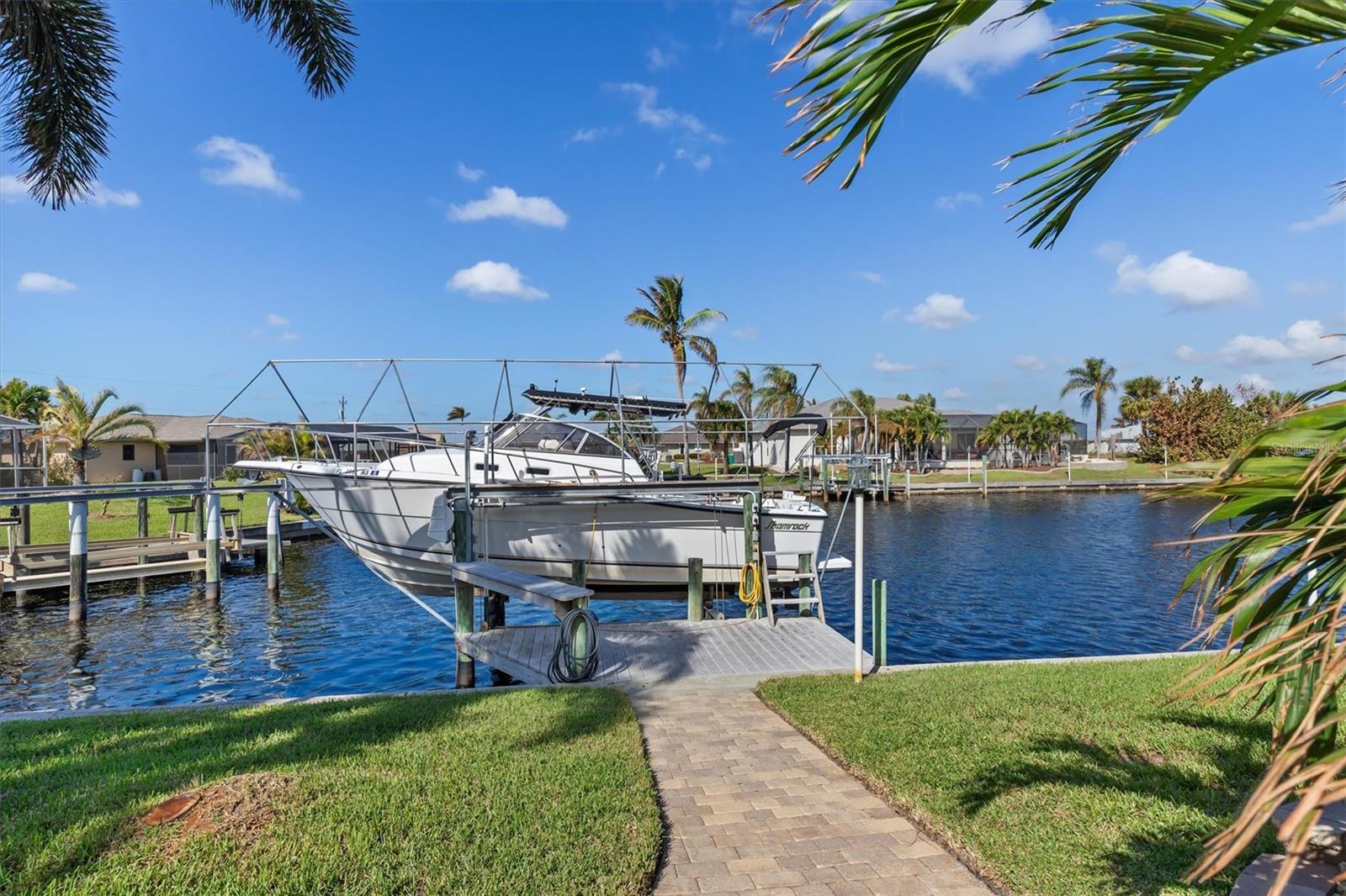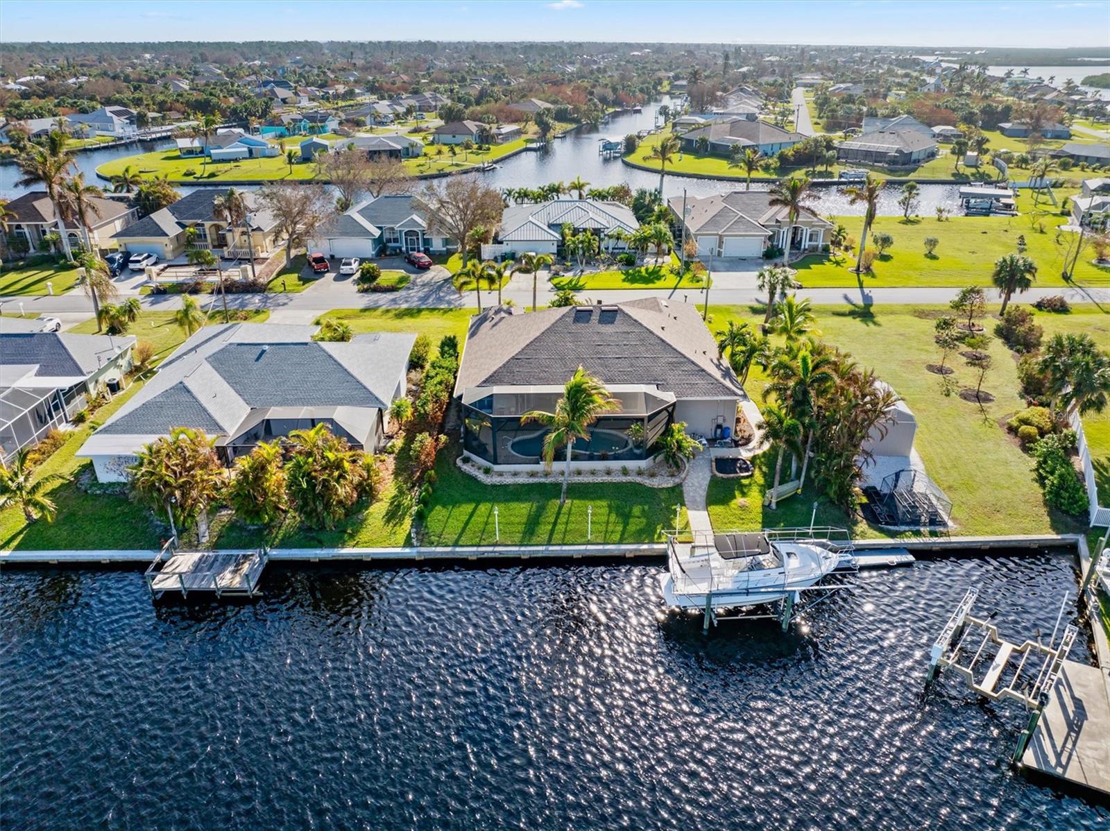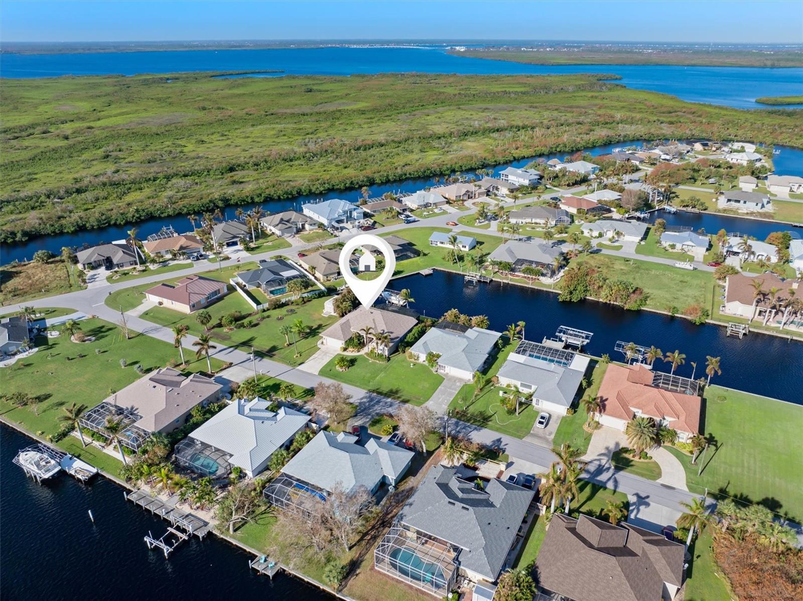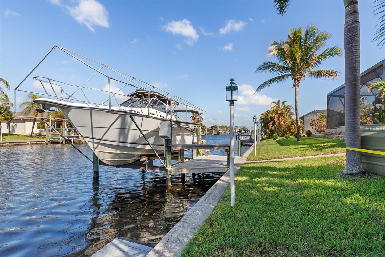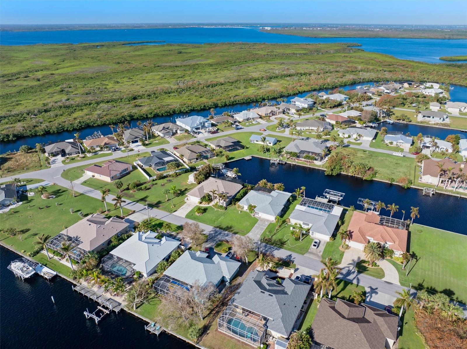 Check out the 3-D virtual walk through above! Stunning SAILBOAT ACCESS home with additional buildable lot to keep or sell! Original owners spared no expense to maintain this meticulous home with custom details throughout. As you enter this spacious, open floor plan home from the beautiful double doors (with retractable double screen), you view the Eastlake Waterway and a custom designed pool area with new Clearview screen. Specially designed Travertine flooring along with Hickory Wood flooring make this home a unique find. Custom remote controlled linen shades adorn the massive sliding glass doors and plantation shutters that are in other windows. High-end interior design includes several “art niches,” crown molding, tray ceilings, banana leaf inset in tray ceiling in Primary Bedroom, glass block shower, walk-in custom designed closets, and a Murphy bed for easy transition from a bedroom to an office/den! The split floor plan includes both a HUGE Primary Suite and two HUGE bedrooms to make this home perfect for entertaining guests. The kitchen has too many unique features to mention them all…wine cooler, Induction GE Café stove with pull out hood, solid Cherry Wood cabinets, pull out trash bins, top of the line refrigerator, and gorgeous granite countertop. The kitchen nook features a large Aquarium Window that is the focal point of the home. While sitting in the nook, you can view your beautiful custom pool with a unique garden of in-ground and potted plants. Go out the side lanai door and follow the paver walkway to your own lighted private boat dock. And, if you are interested, the 30 foot Twin Yanmar Diesel 630 horsepower boat is negotiable. Add in a totally new laundry room with stainless steel sink, granite countertop, new 30” stainless steel refrigerator, new washer/dryer “all-in-one” appliance and built-in cabinets, and you have the perfectly designed space! Both the lush landscaping surrounding the home and the lawn have been well maintained. The oversized garage has a lighted workspace and many types of shelving. The custom-built 12 x 16 shed is a great place for storage and has electricity. The location of the home is close to all shopping, doctors, and restaurants yet is situated in a secluded area with dead-end streets. The Eastlake Waterway will take your sailboat to Charlotte Harbor. And there is no HOA in this community. This property will “sell itself” with its unique mixture of traditional and Florida style. Make an appointment to see it today!