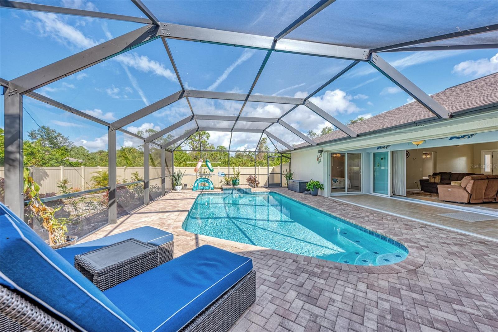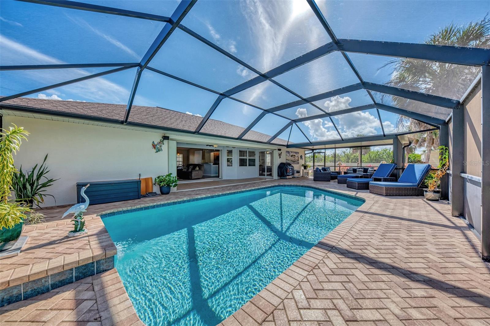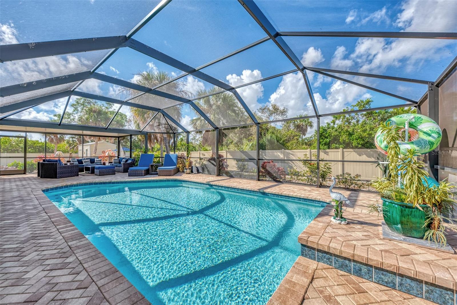 OUTSTANDING 3 bedroom, 2 bath, 2 car garage Heated POOL home with BRAND NEW ROOF JUST INSTALLED! Situated on 2 OVERSIZED LOTS (half acre!) beautifully landscaped, this home comes with loads of UPGRADES & EXTRAS including a separate 38X80 CONCRETE DRIVEWAY WITH RV HOOK UP (WATER & ELECTRIC) & gate. 3 gates in total. PUBLIC WATER UTILITY-NO HOA FEES! Compete new fencing around both lots (transferable to the new buyer) perfect for young children and all your pets! You'll fall in love with the 15x27 SALTWATER HEATED IN-GROUND POOL with WATERFALL and changing light program! The EXPANDED POOL DECK has an ADDITIONAL side covered roof area in addition to the covered lanai. Great entertaining patio! The full cage measures 30x44! The pool has a PAVER DECK patio in a herringbone pattern that has been recently sealed! Home is hurricane protected. ! More features include a detached hurricane rated , FIREPIT, STORAGE SHED, HAMMOCK, and a barbecue area. Inside, discover a remodeled kitchen with GRANITE COUNTERTOPS, WOOD CABINETS, and STAINLESS APPLIANCES ($10,000 value!). The master bedroom boasts engineered plank wood flooring recently added in 2021 and sliding doors that will lead you out to the pool deck! The master bathroom comes with a tiled walk-in shower with a glass door! The second bedroom also has access to the pool deck and the guest bath comes with a tub & shower combination and glass sliding doors! The back of the entire lanai and the front door area have ACCORDION SHUTTERS with HURRICANE SHUTTERS for the rest of the home! The exterior of the home has been freshly painted and comes with a 5-year warranty transferable to the new buyer! All furniture, decorations, and potted plants in the lanai are INCLUDED along with a John Deere riding mower, home generator, and more. This home is located in a quiet peaceful neighborhood with the Town Center mall, Twisted Fork restaurant, Harley dealership, shopping, schools and more all close by. Just minutes away from our beautiful Gulf beaches and public boat ramps! This is your chance to own your piece of Paradise. True pride in ownership. Home warranty for the new buyer! Call today for your private tour!